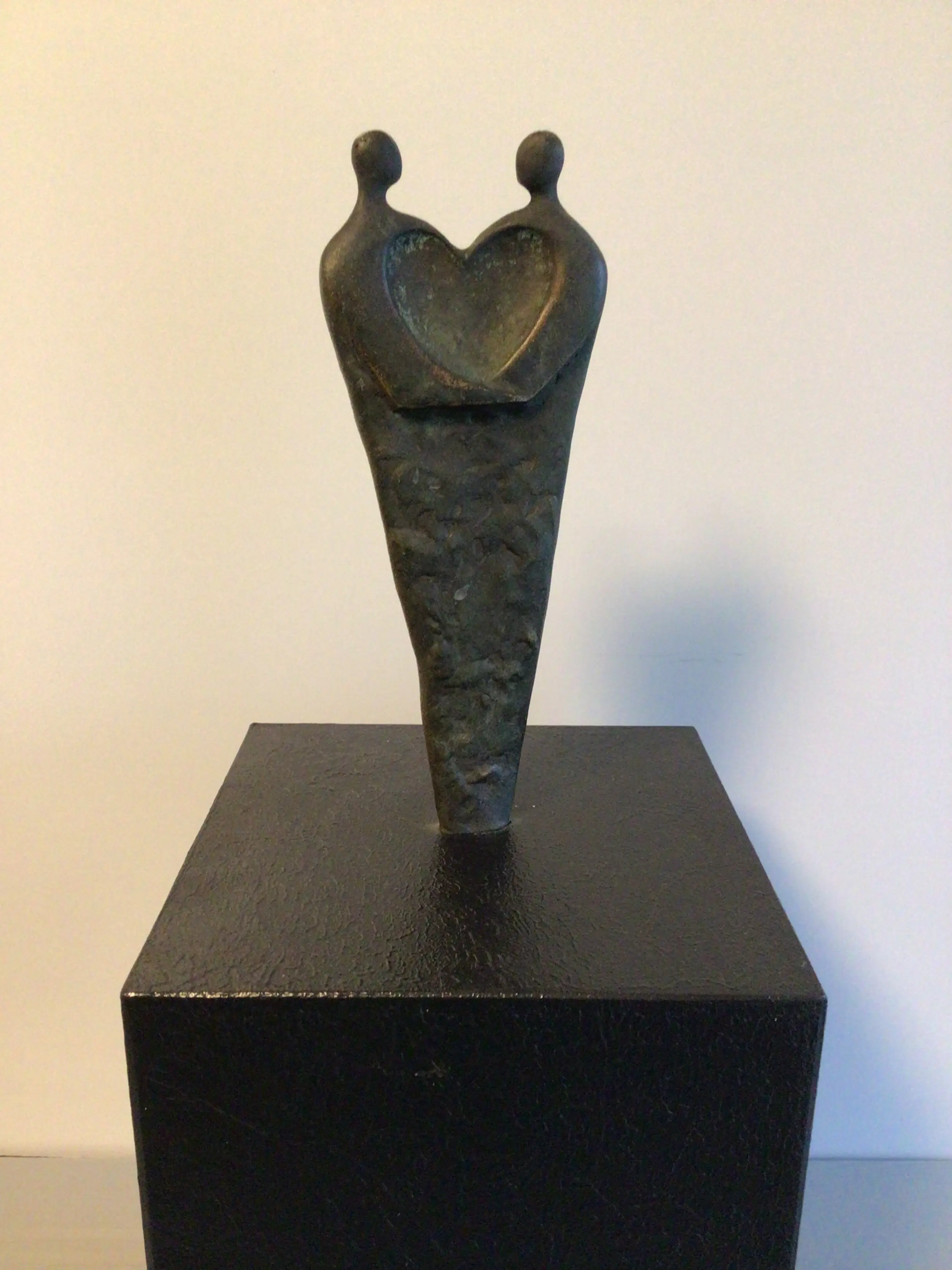 Mooi symbolisch en hoog sculptuur van twee mensfiguren met in hun midden een hartvorm dat hen verbindt staande op een hoge sokkel Titel “ Hart voor elkaar “ Hoogte : 38 cm ! Materiaal : legering op kunststof blok Kunstenares : Corry Ammerlaan Het sculptuur verkeert in nieuwstaat en wordt zorgvuldig verpakt verzonden