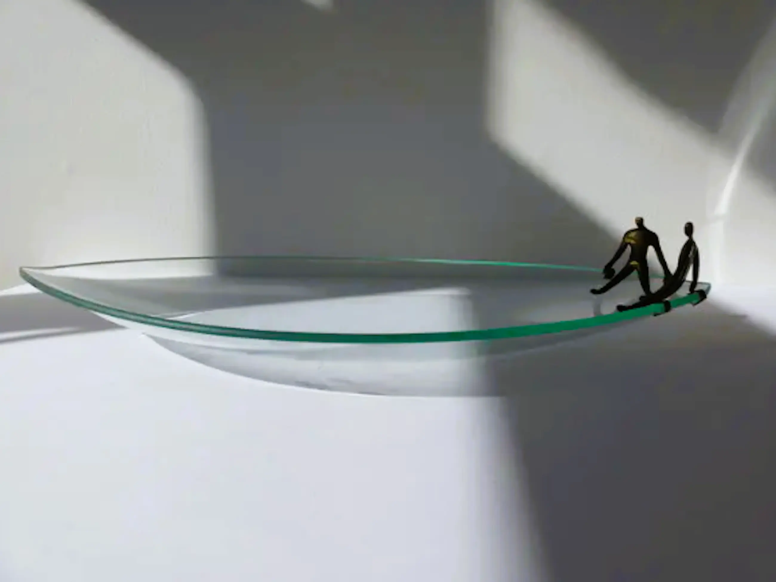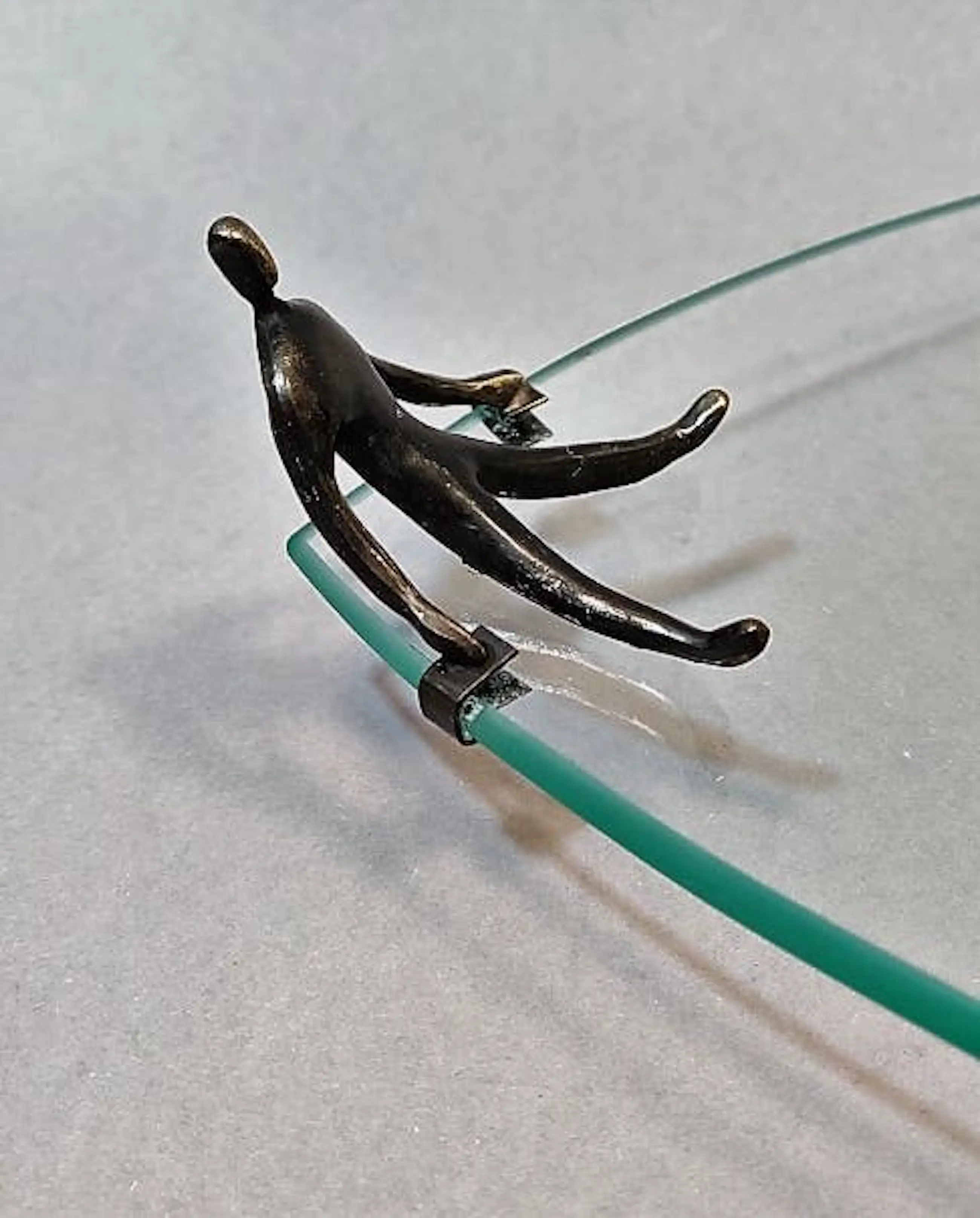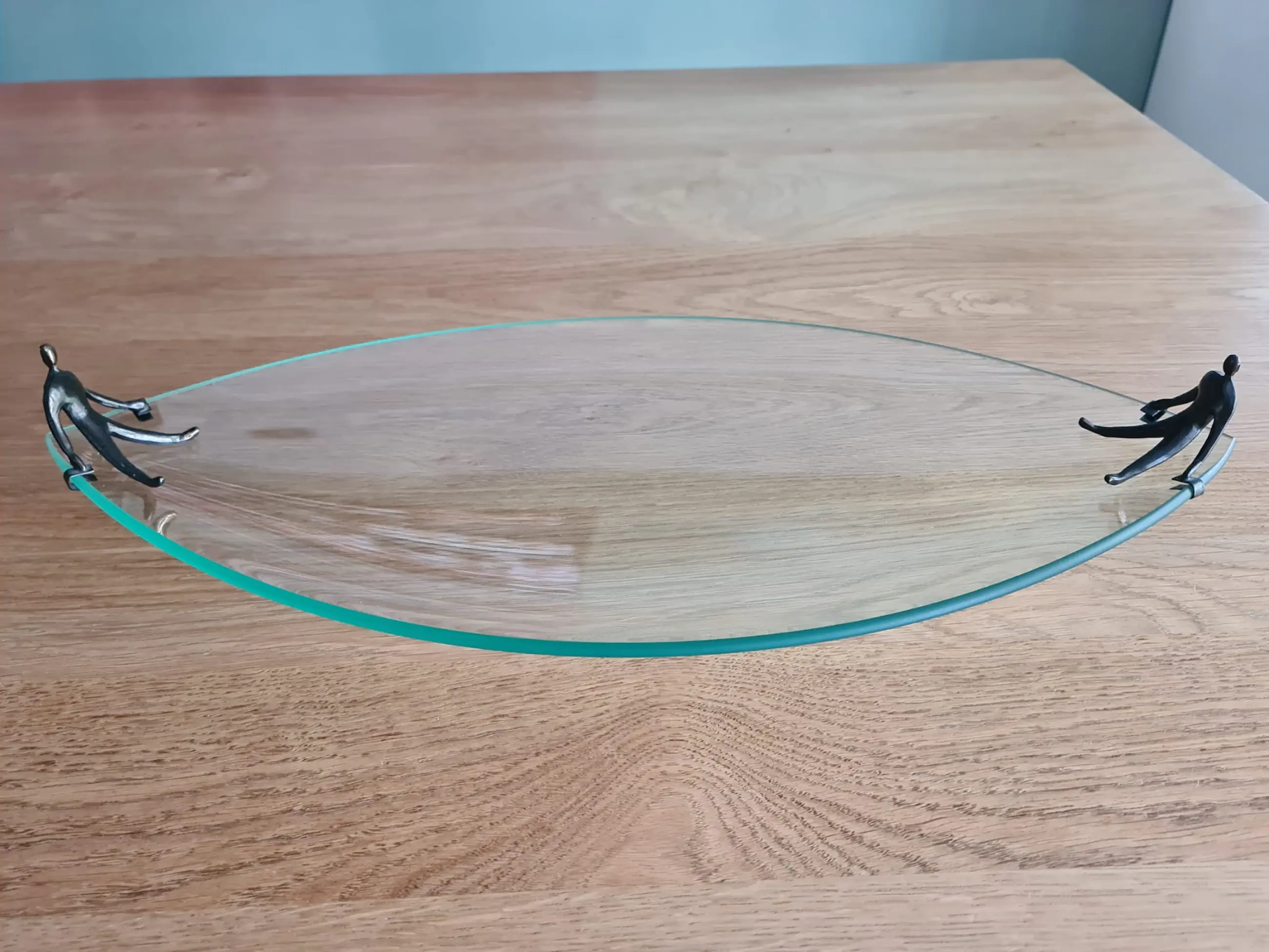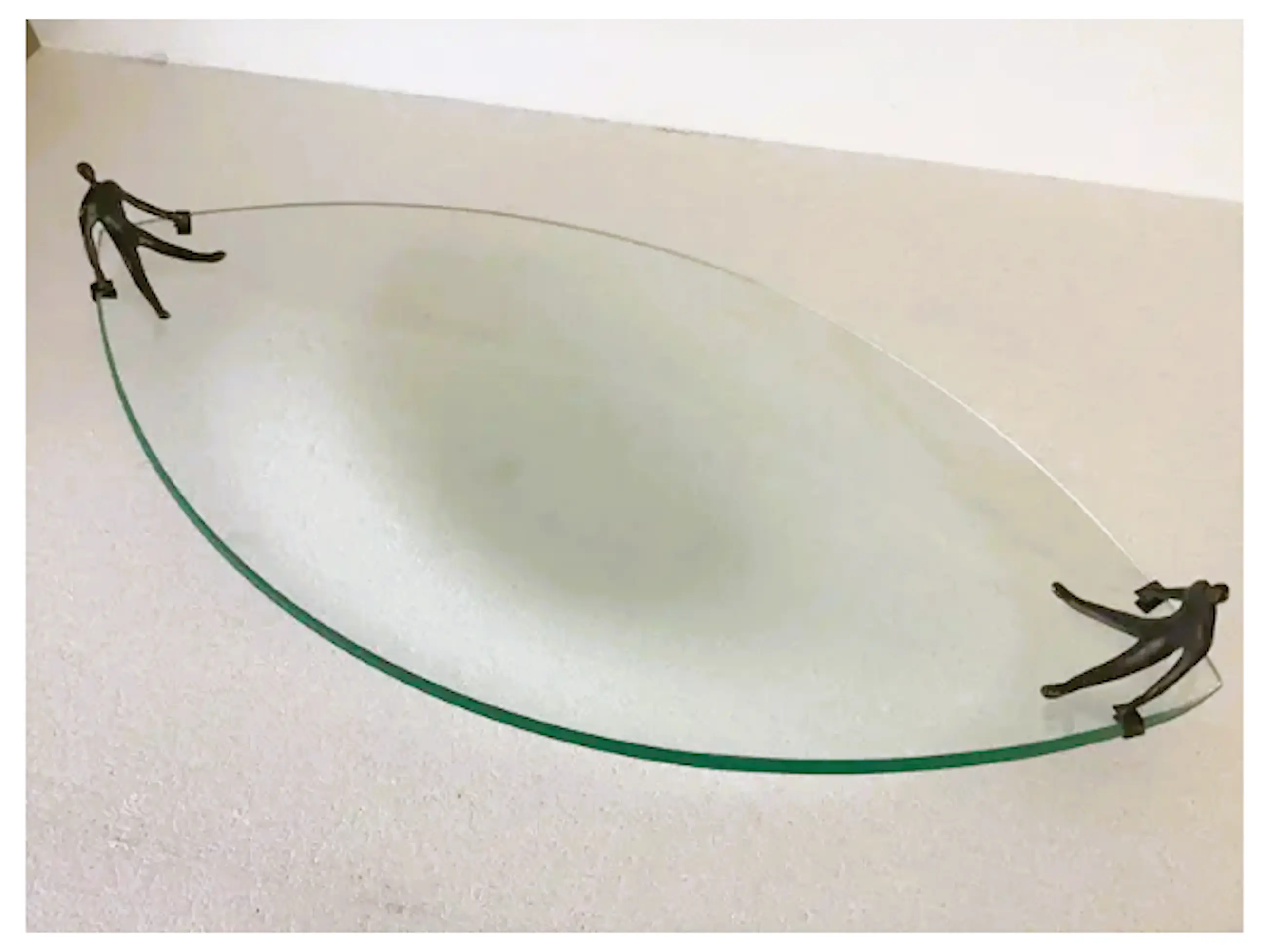 Fraaie glazen schaal met aan de uiteinden twee bronzen mensfiguren.