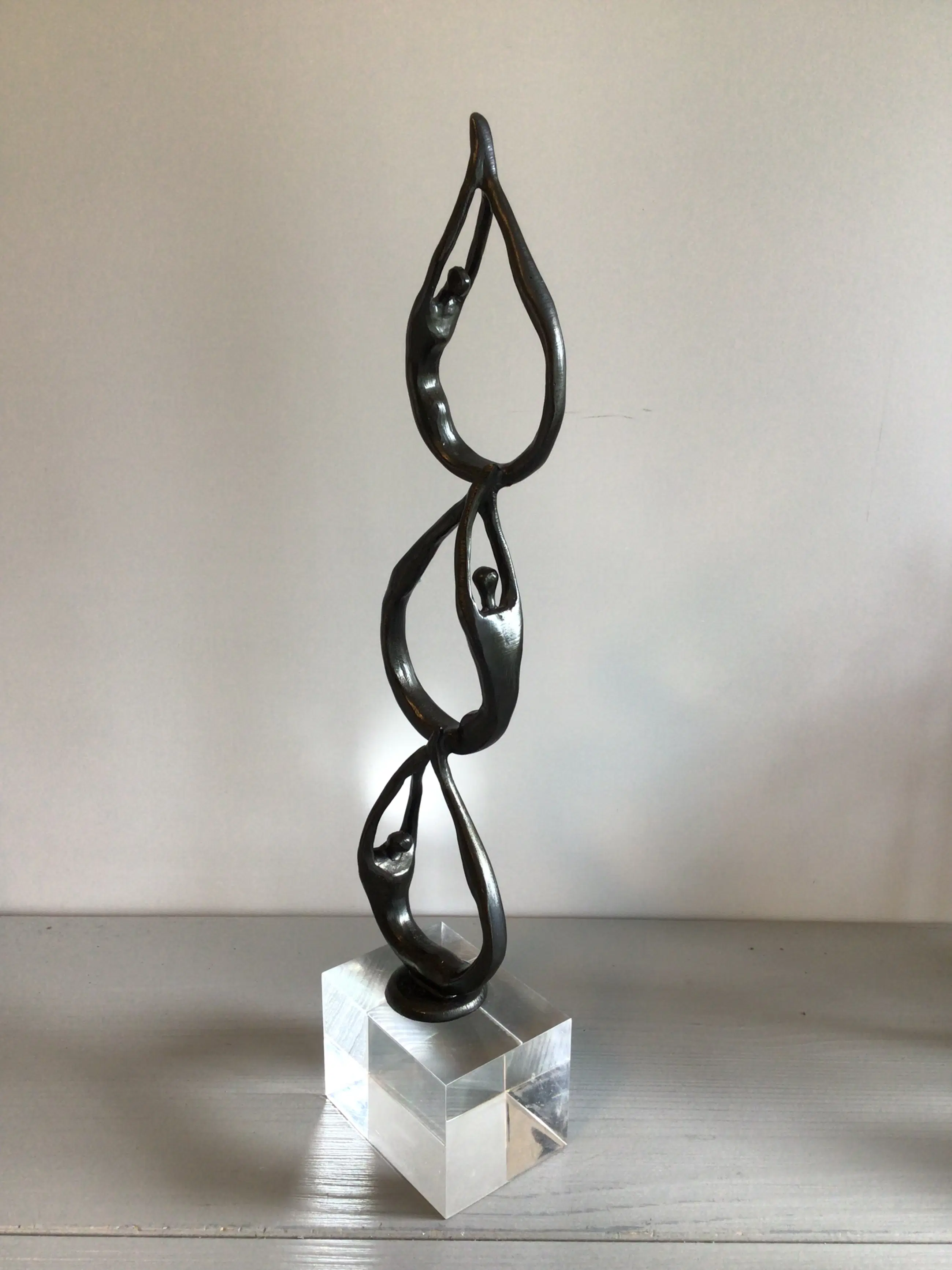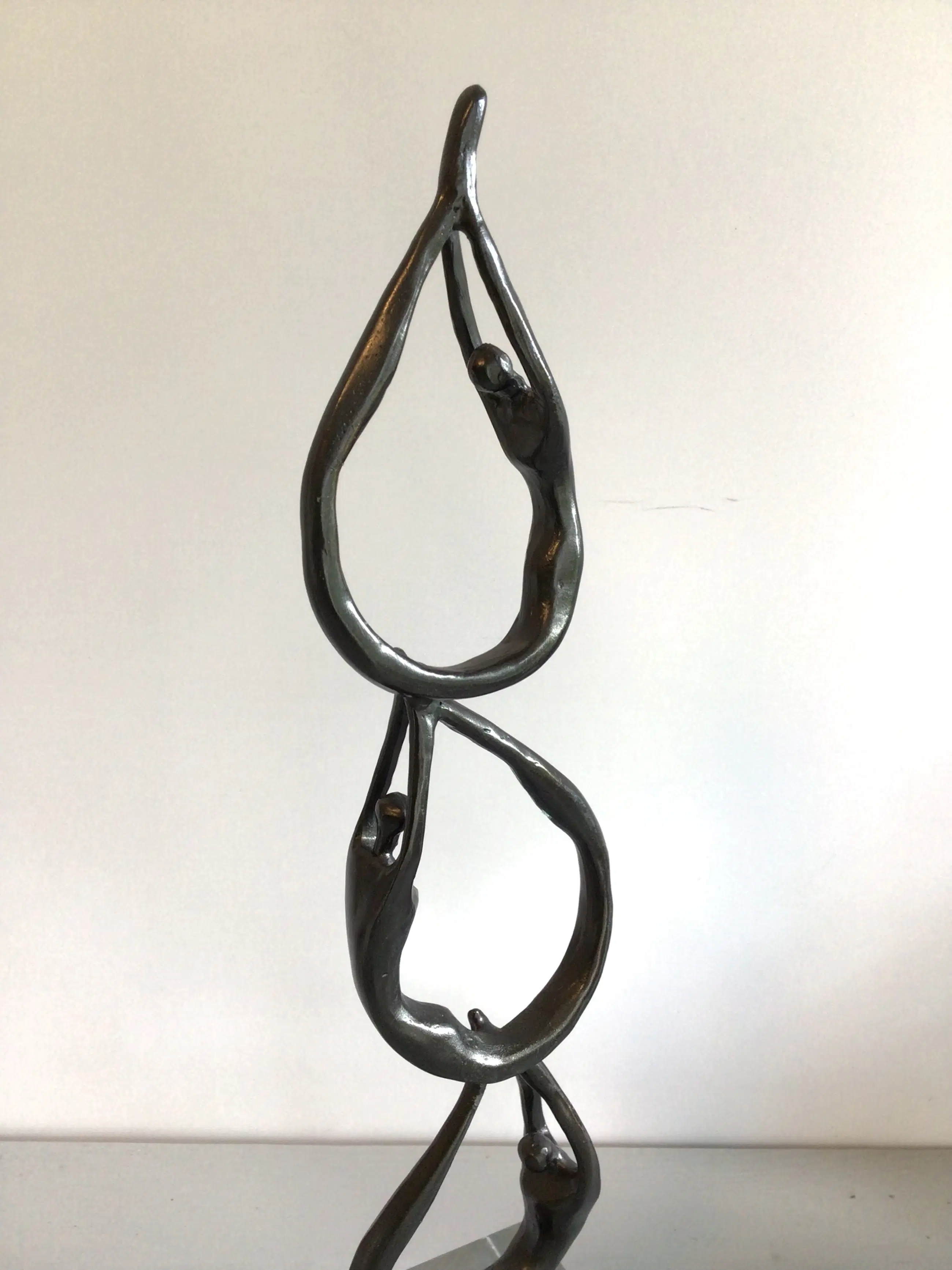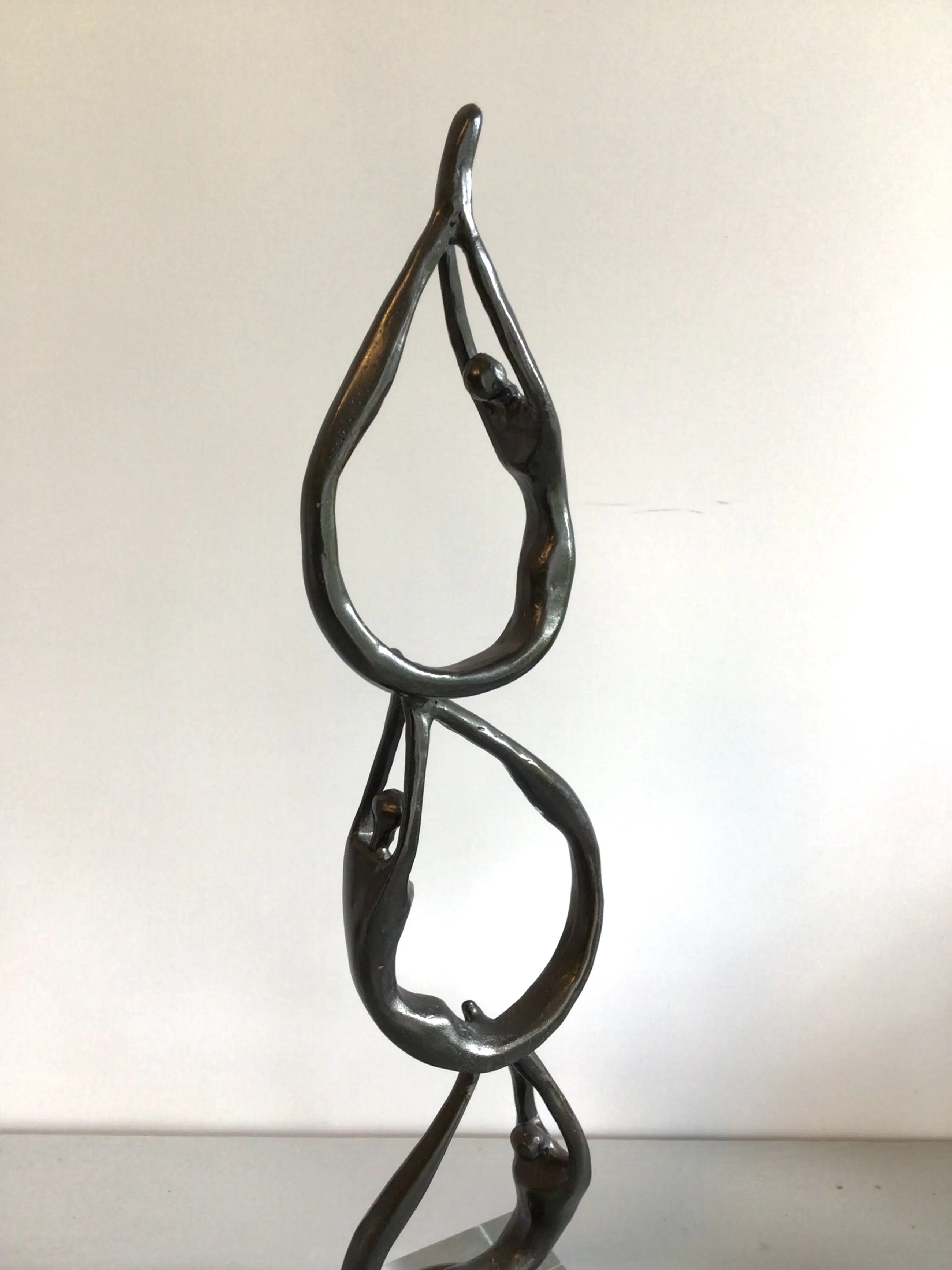 Zeer fraai vormgegeven en verfijnd sculptuur van een drietal mensfiguren die als een schakel aan elkaar zijn verbonden. Het betreft een vrij zeldzaam exemplaar, die niet meer te verkrijgen is in de vrije verkoop Kunstenares: Corry Ammerlaan Het beeld is op de voet gesigneerd: CAN Het beeld verkeert in zeer goede staat en wordt zorgvuldig verpakt verzonden.