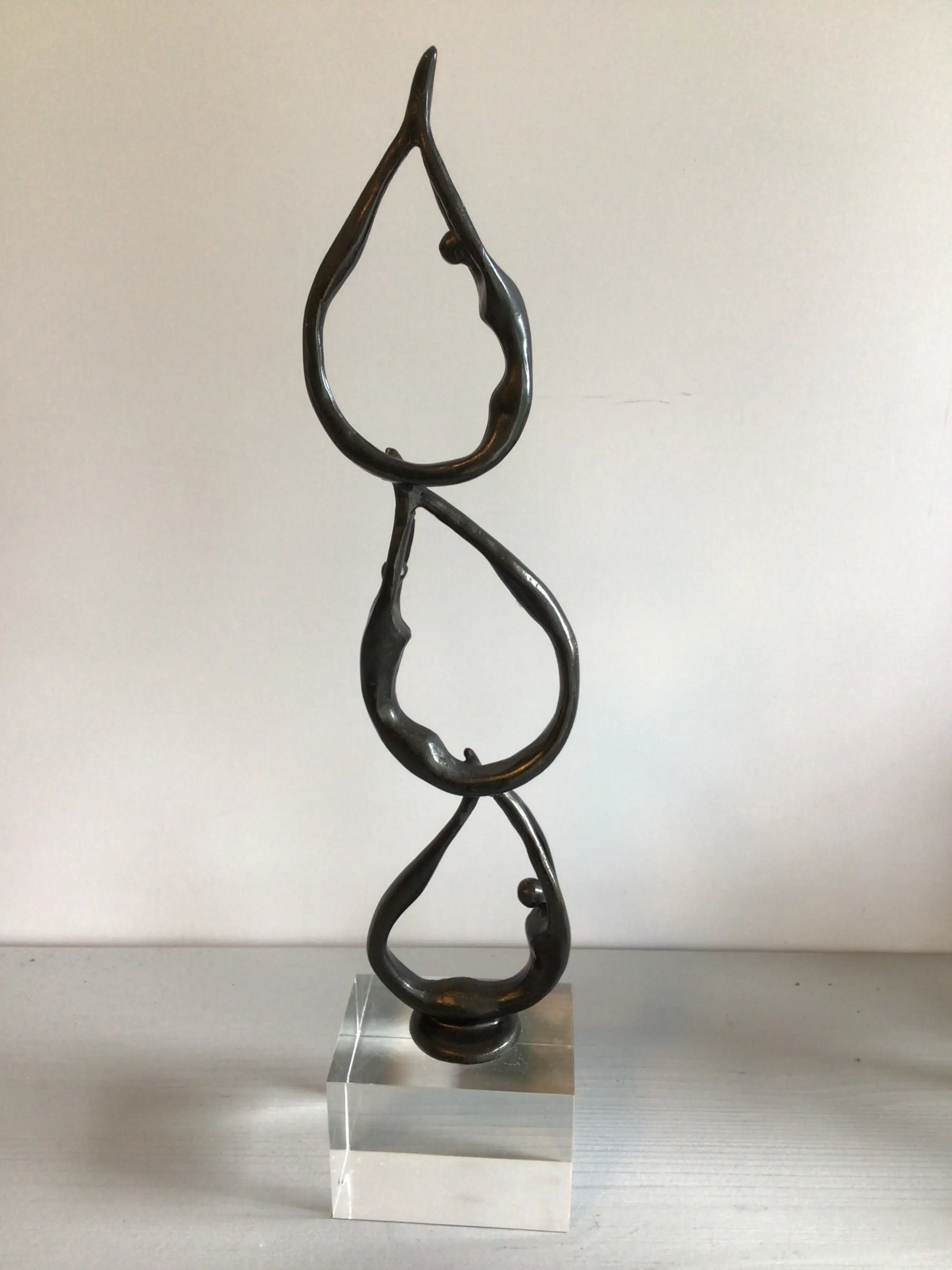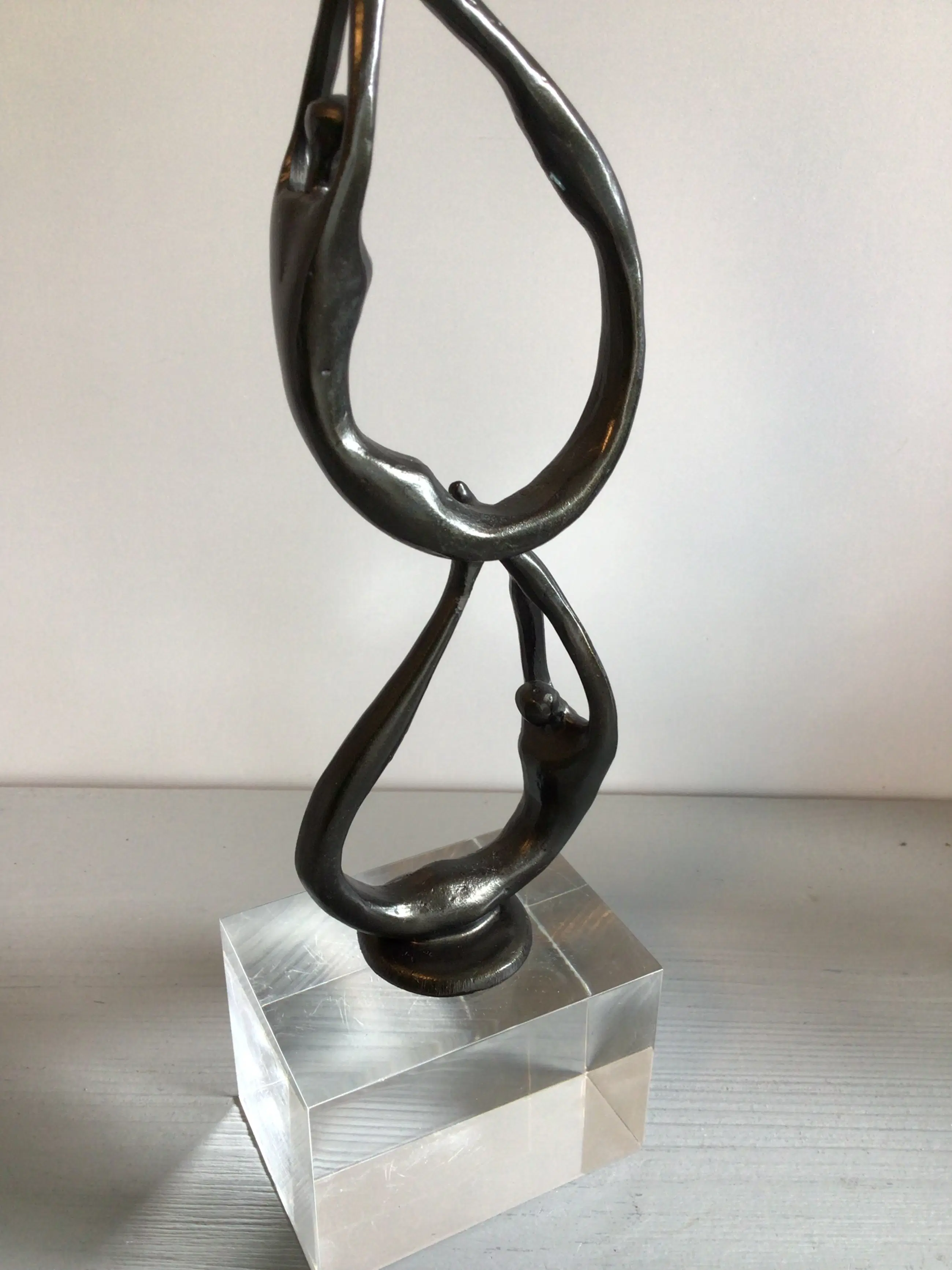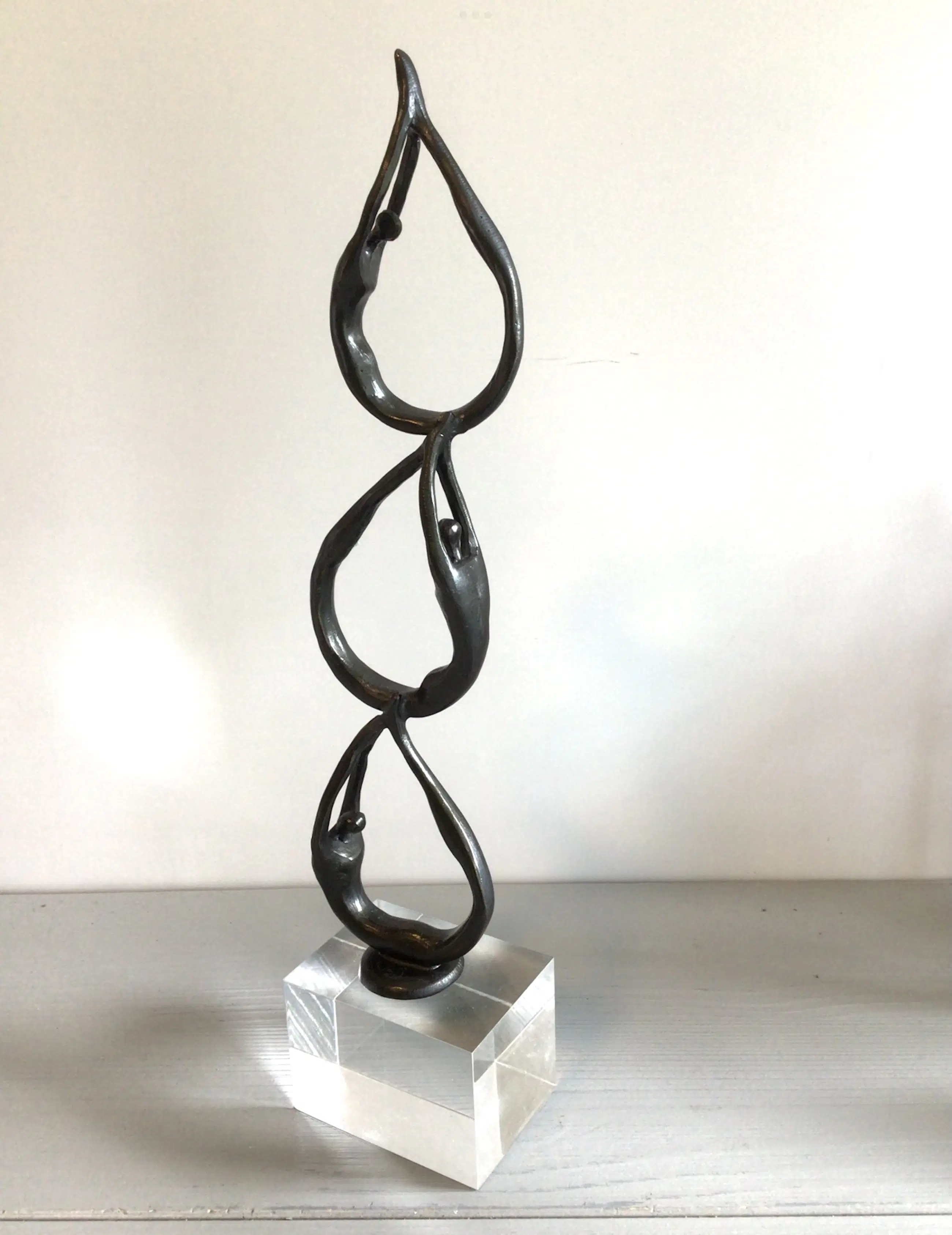 Zeer fraai vormgegeven en verfijnd sculptuur van een drietal mensfiguren die als een schakel aan elkaar zijn verbonden. Het betreft een vrij zeldzaam exemplaar, die niet meer te verkrijgen is in de vrije verkoop Kunstenares: Corry Ammerlaan Het beeld is op de voet gesigneerd: CAN Het beeld verkeert in zeer goede staat en wordt zorgvuldig verpakt verzonden.