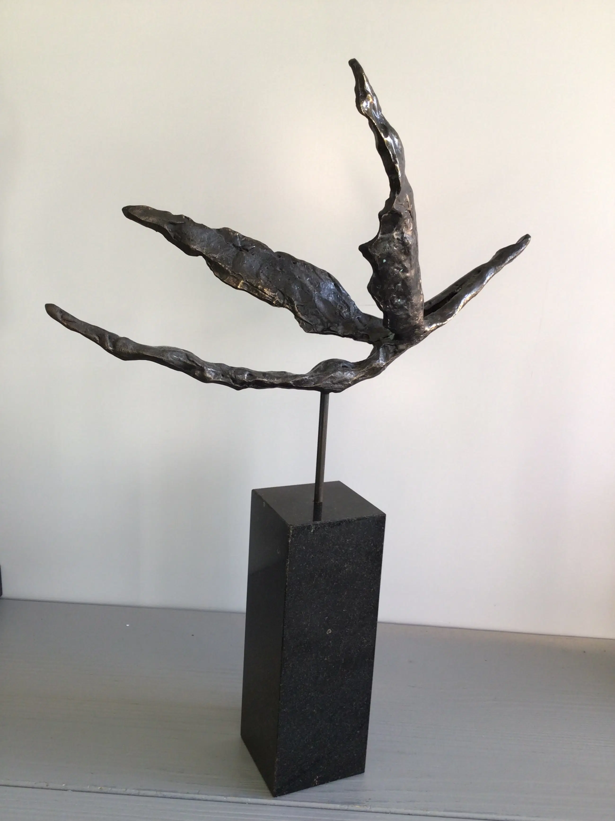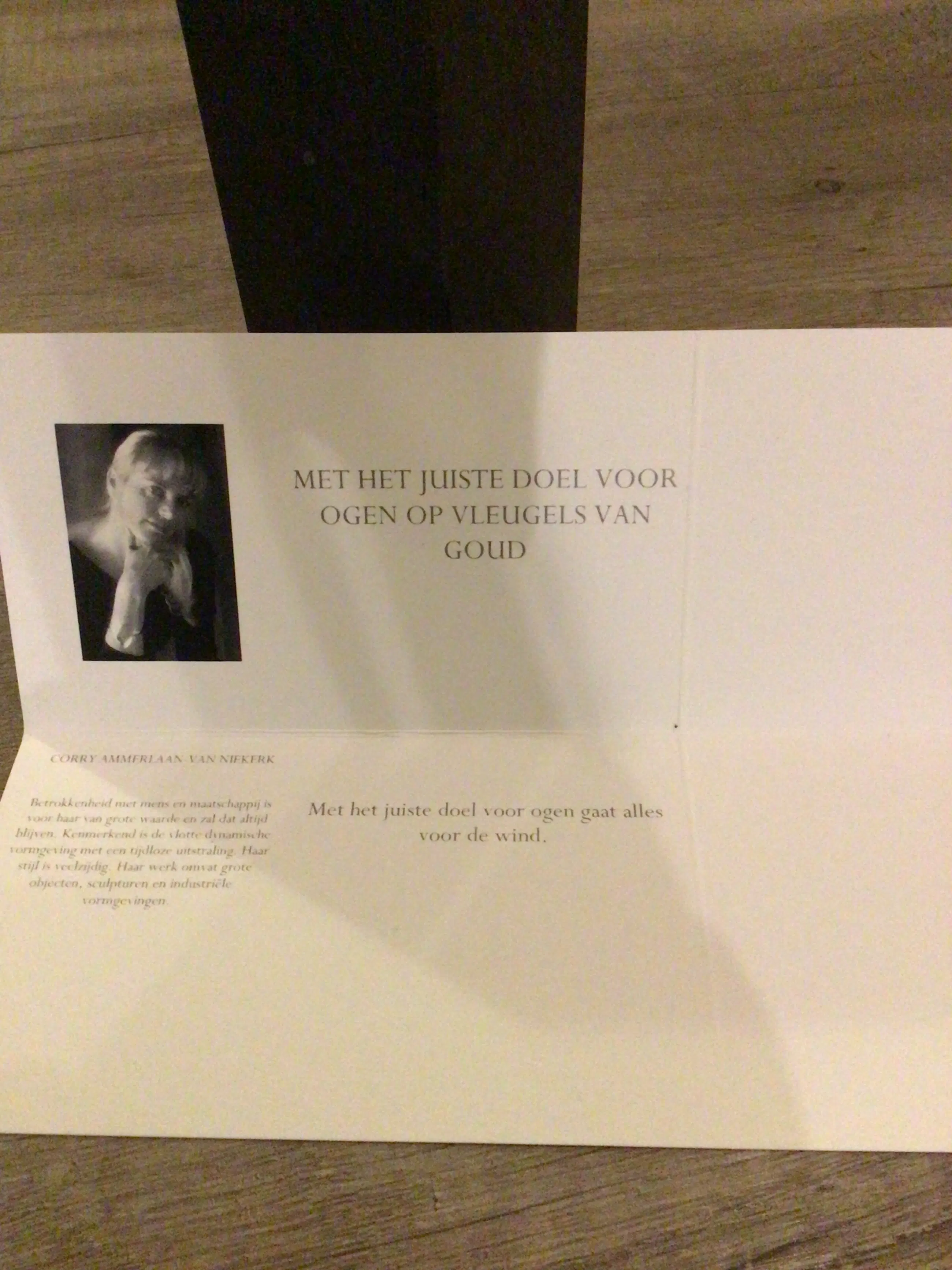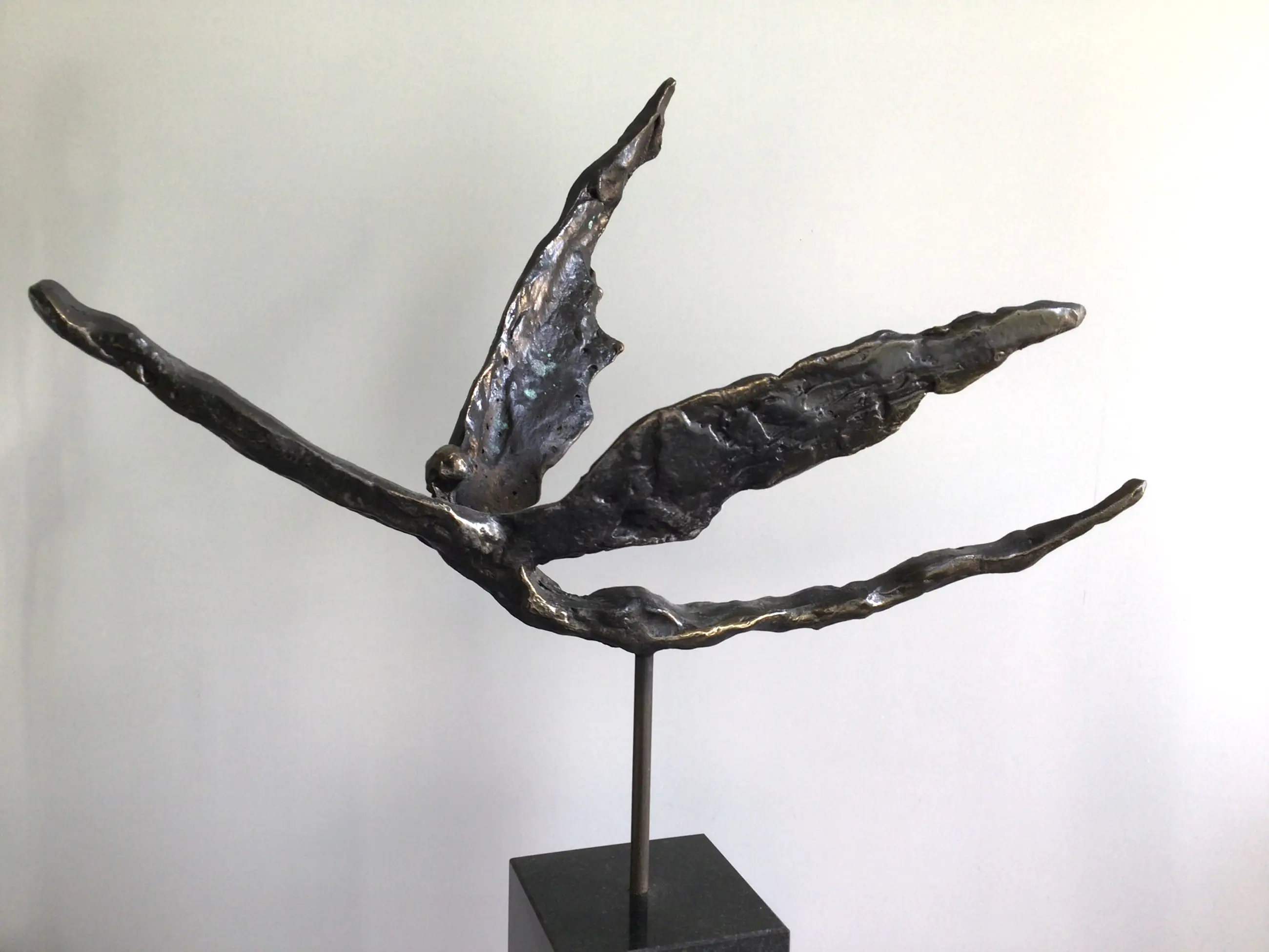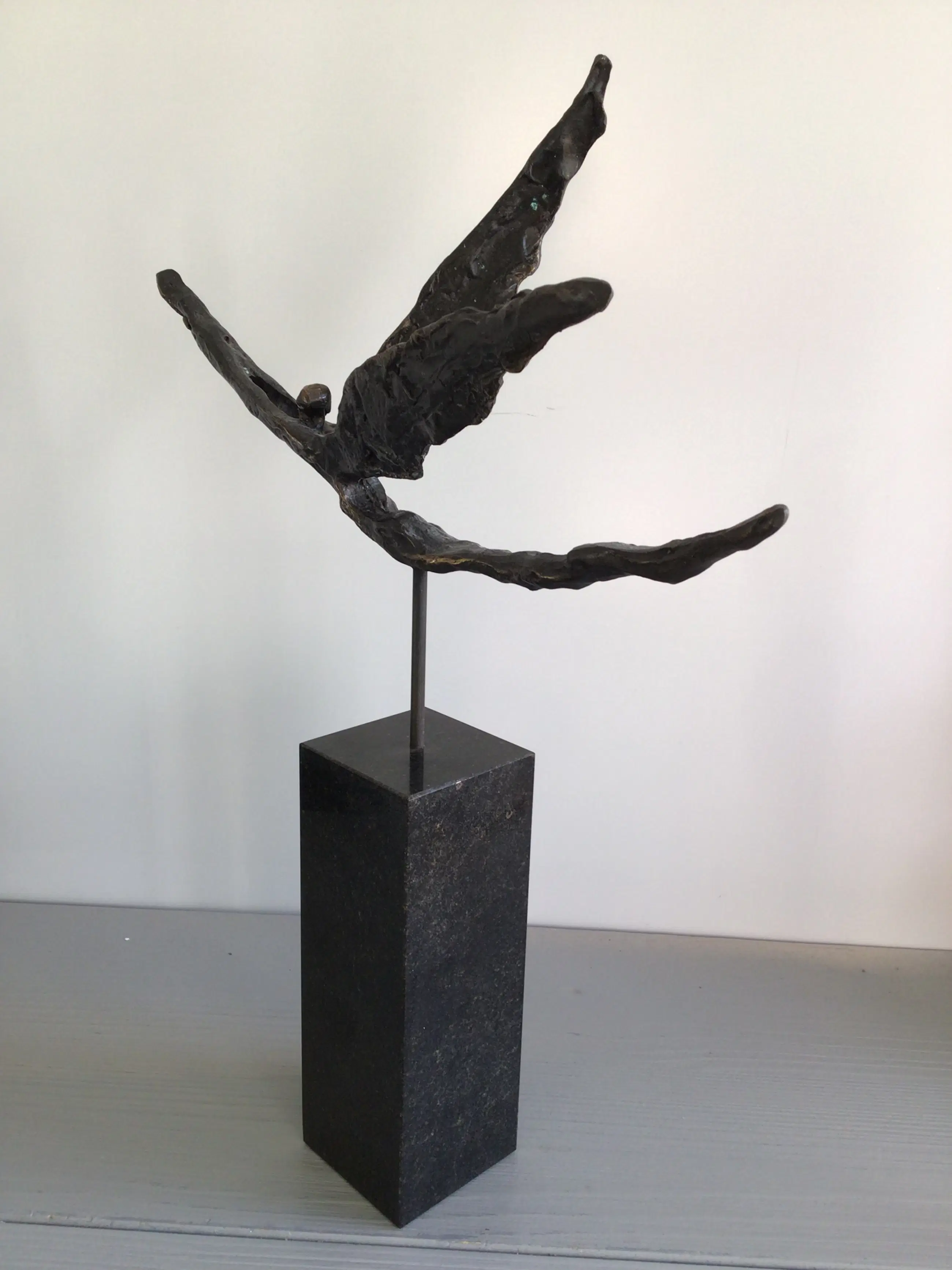 Zeer fraai vormgegeven en verfijnd sculptuur van een zwevend mensfiguur met vleugels, een prachtige metafoor. Titel “ Met het juiste doel voor ogen op vleugels van goud “ Materiaal: legering op fraaie zwart marmeren sokkel Kunstenares: Corry Ammerlaan Wordt geleverd inclusief originele verpakking en info kaartje van de kunstenares. Het beeld verkeert in zeer goede staat en wordt zorgvuldig verpakt verzonden.