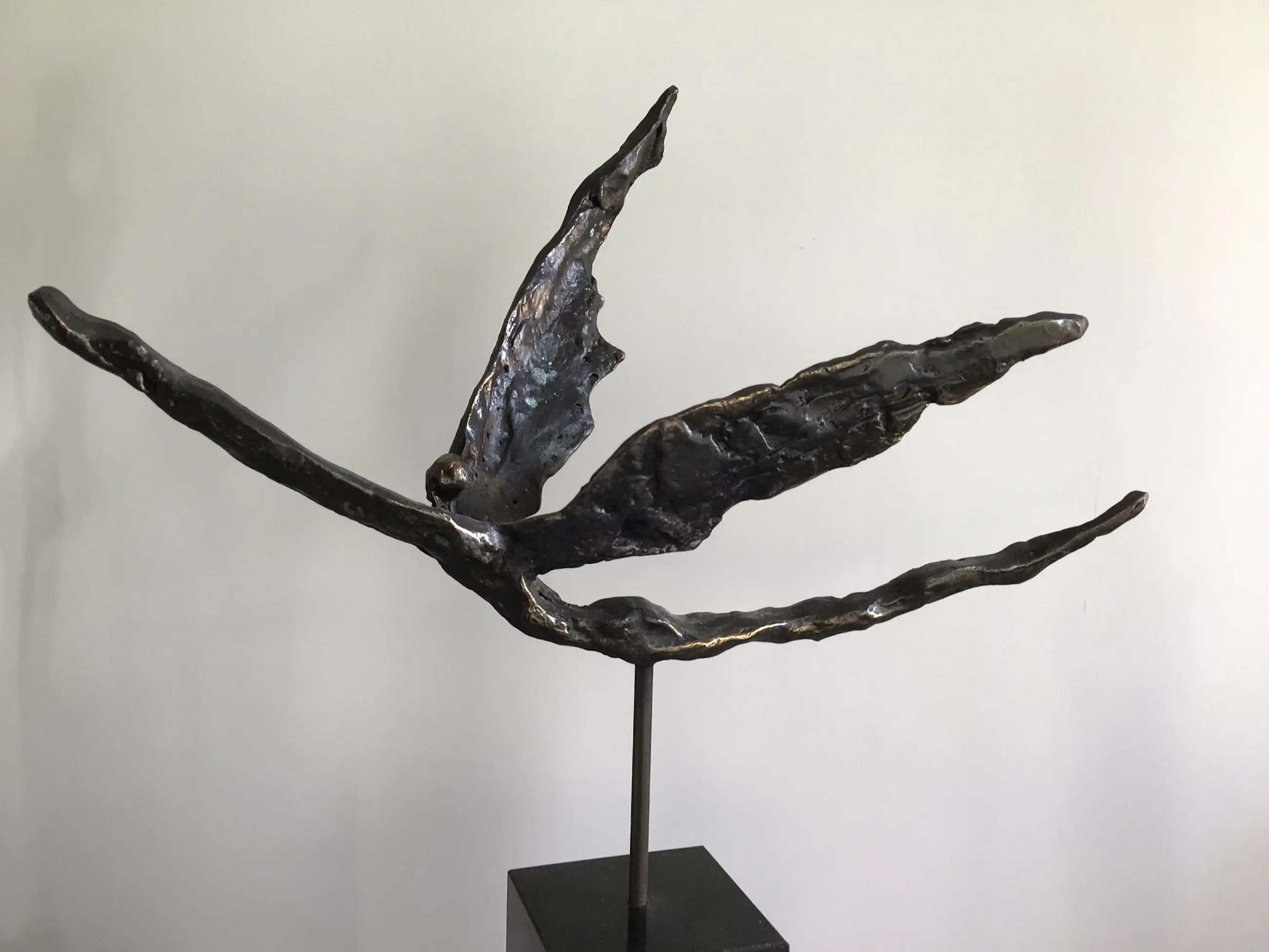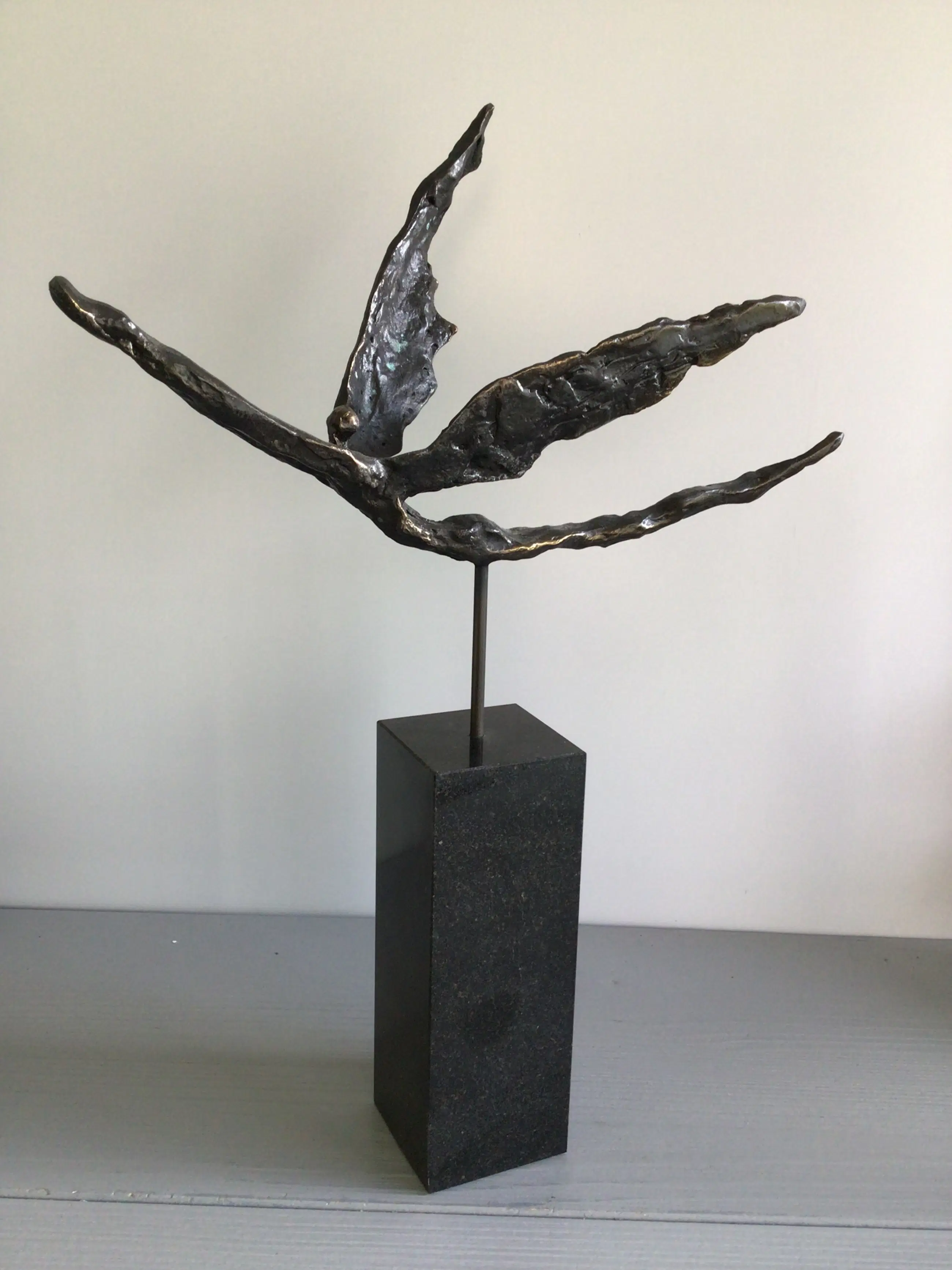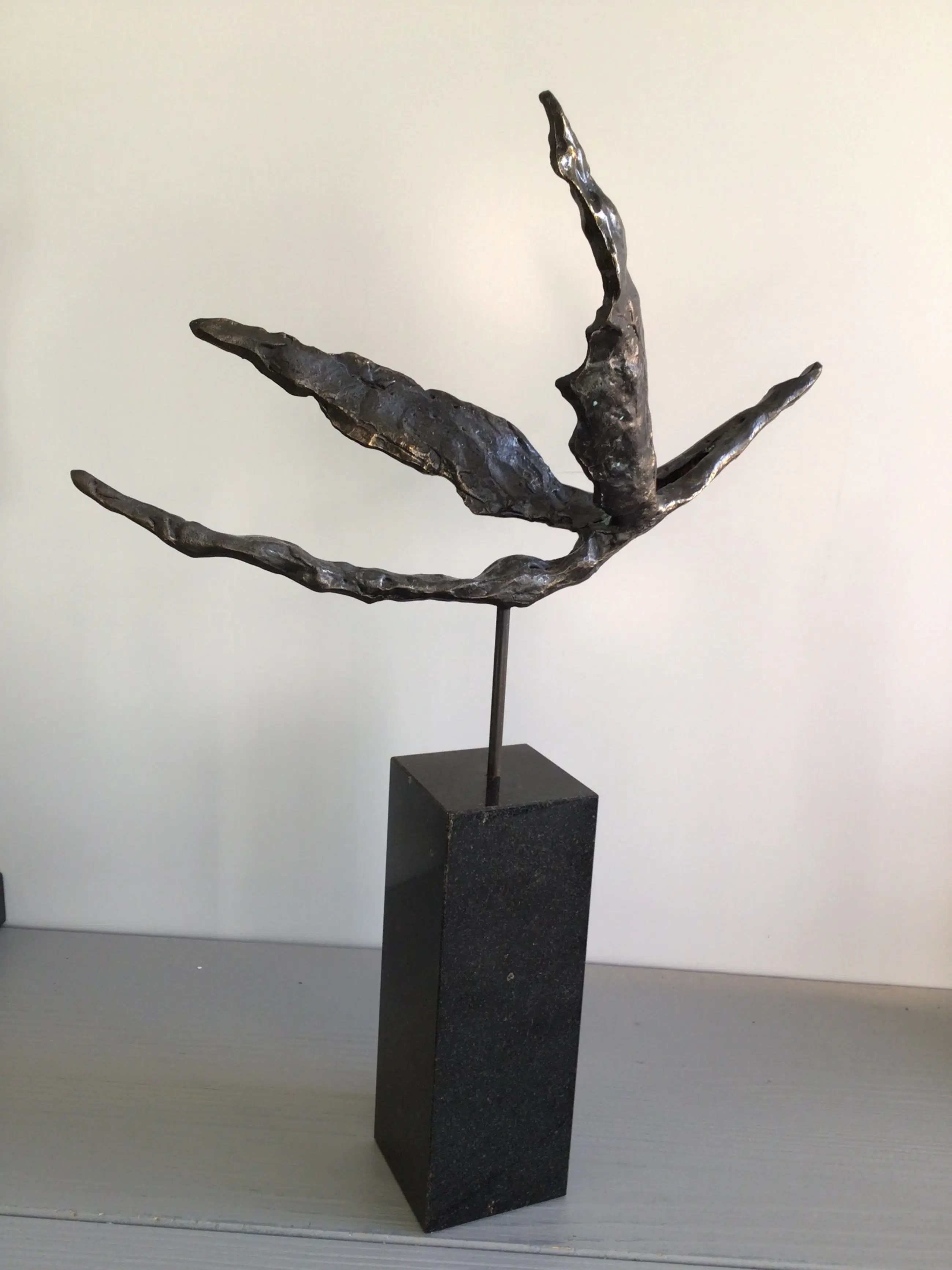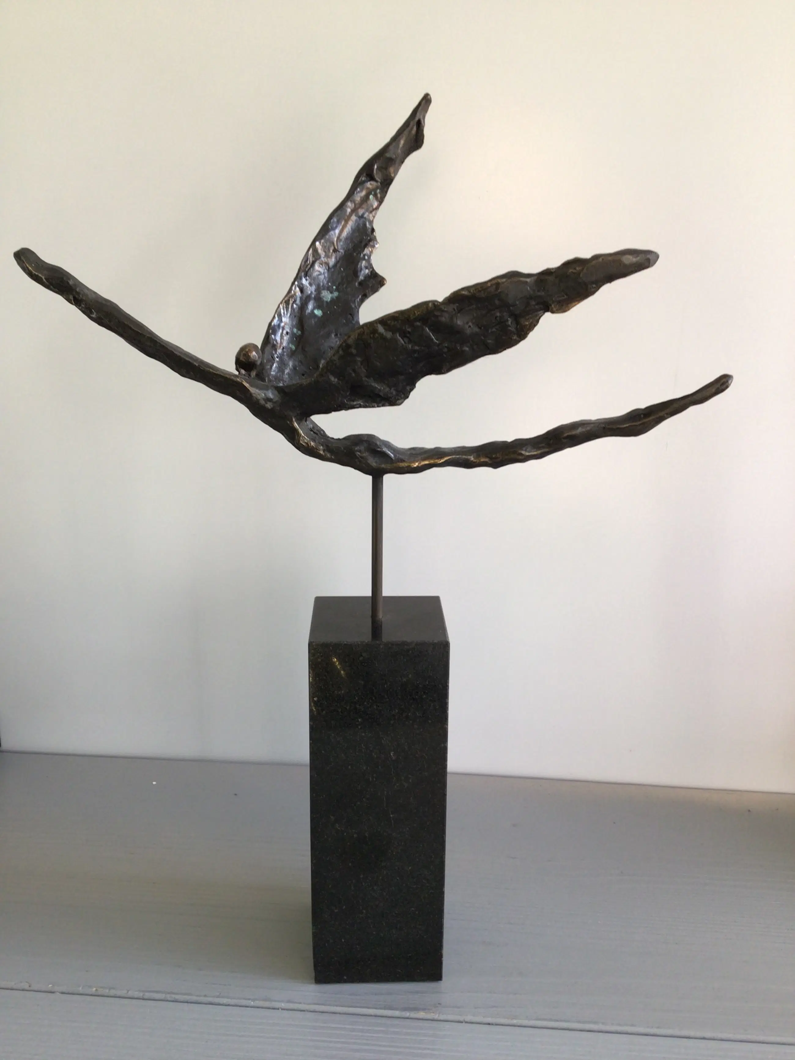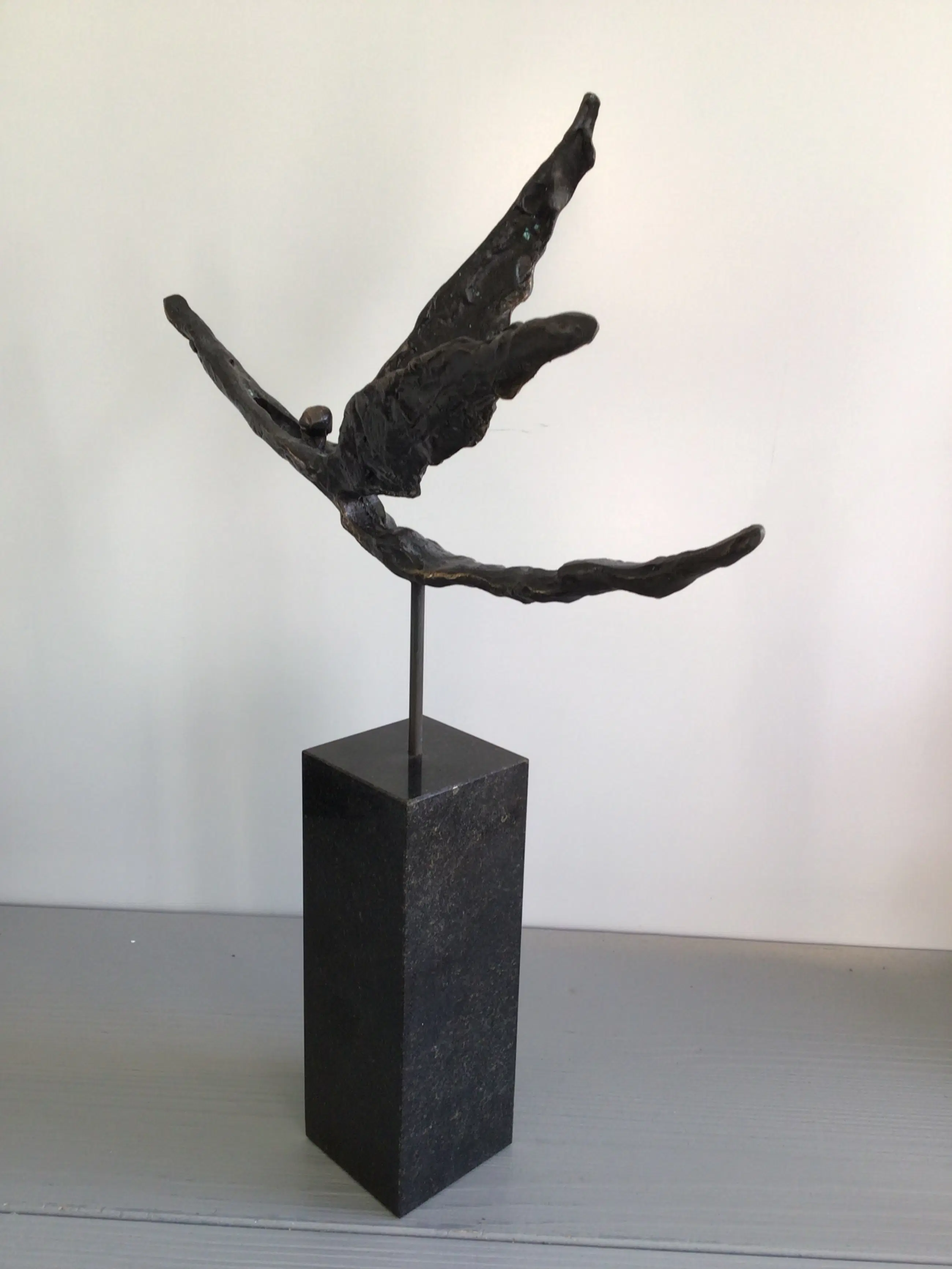 Zeer fraai vormgegeven en verfijnd sculptuur van een zwevend mensfiguur met vleugels, een prachtige metafoor. Titel “ Met het juiste doel voor ogen op vleugels van goud “ Materiaal: legering op fraaie zwart marmeren sokkel Kunstenares: Corry Ammerlaan Het beeld verkeert in zeer goede staat en wordt zorgvuldig verpakt verzonden.