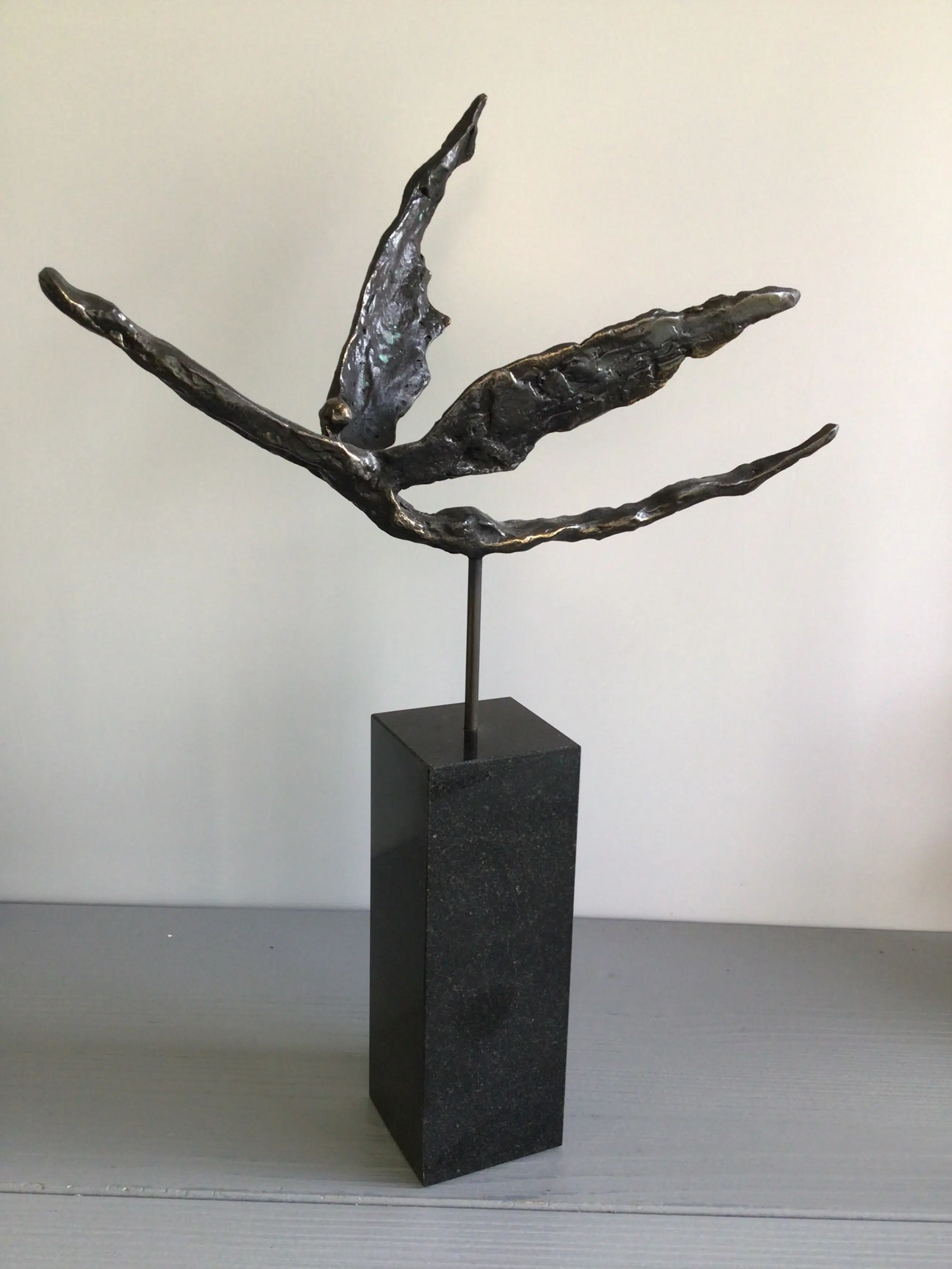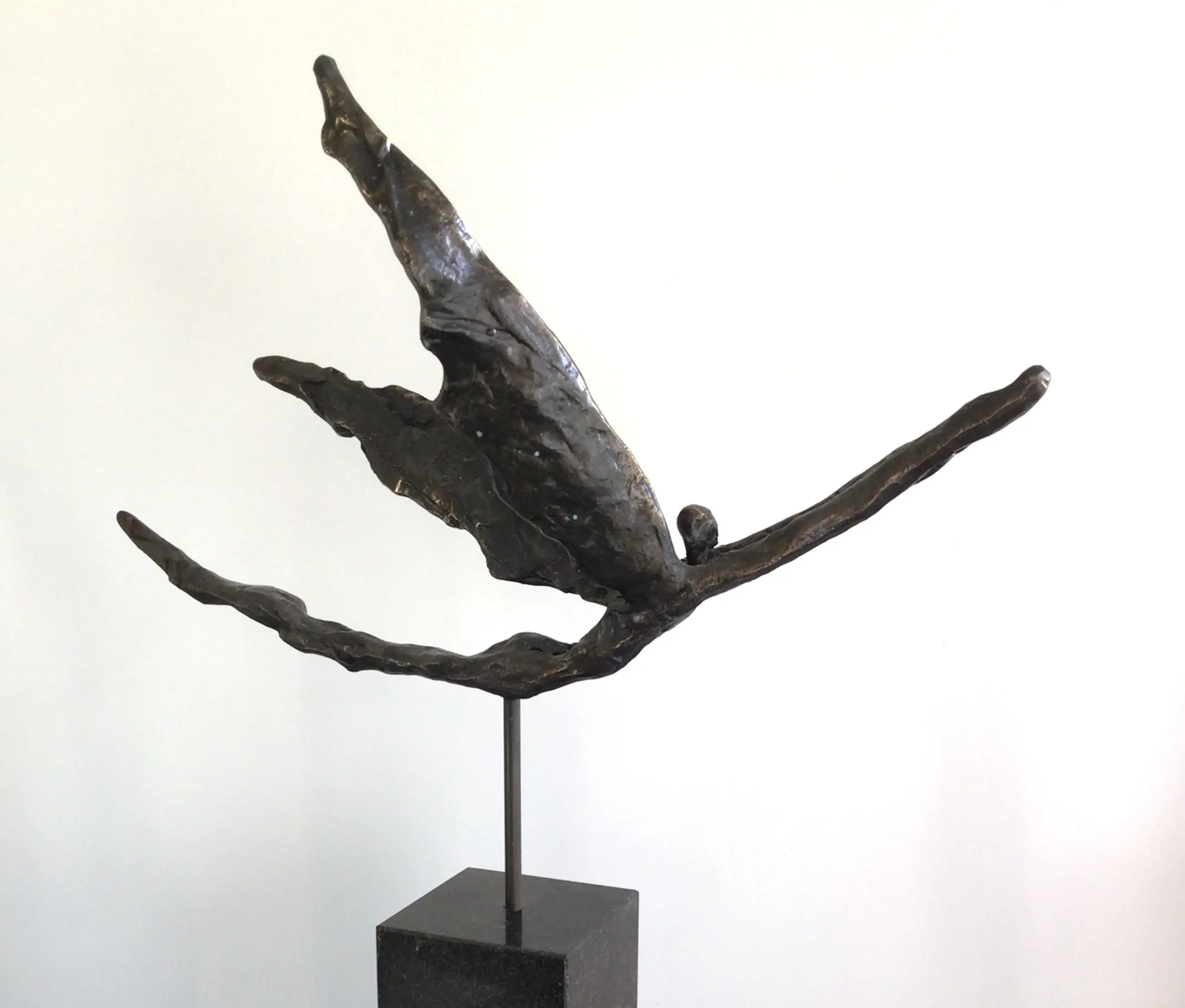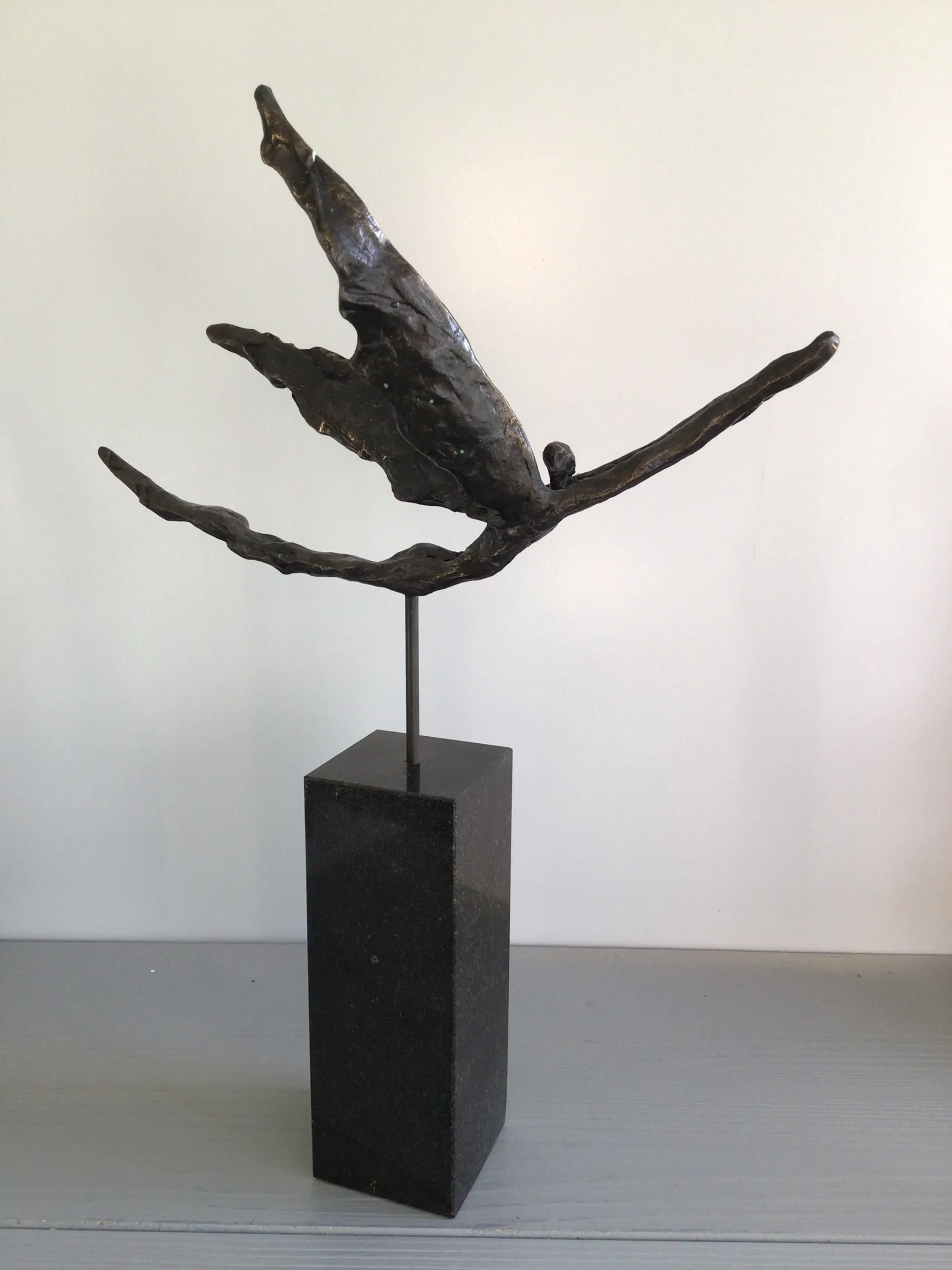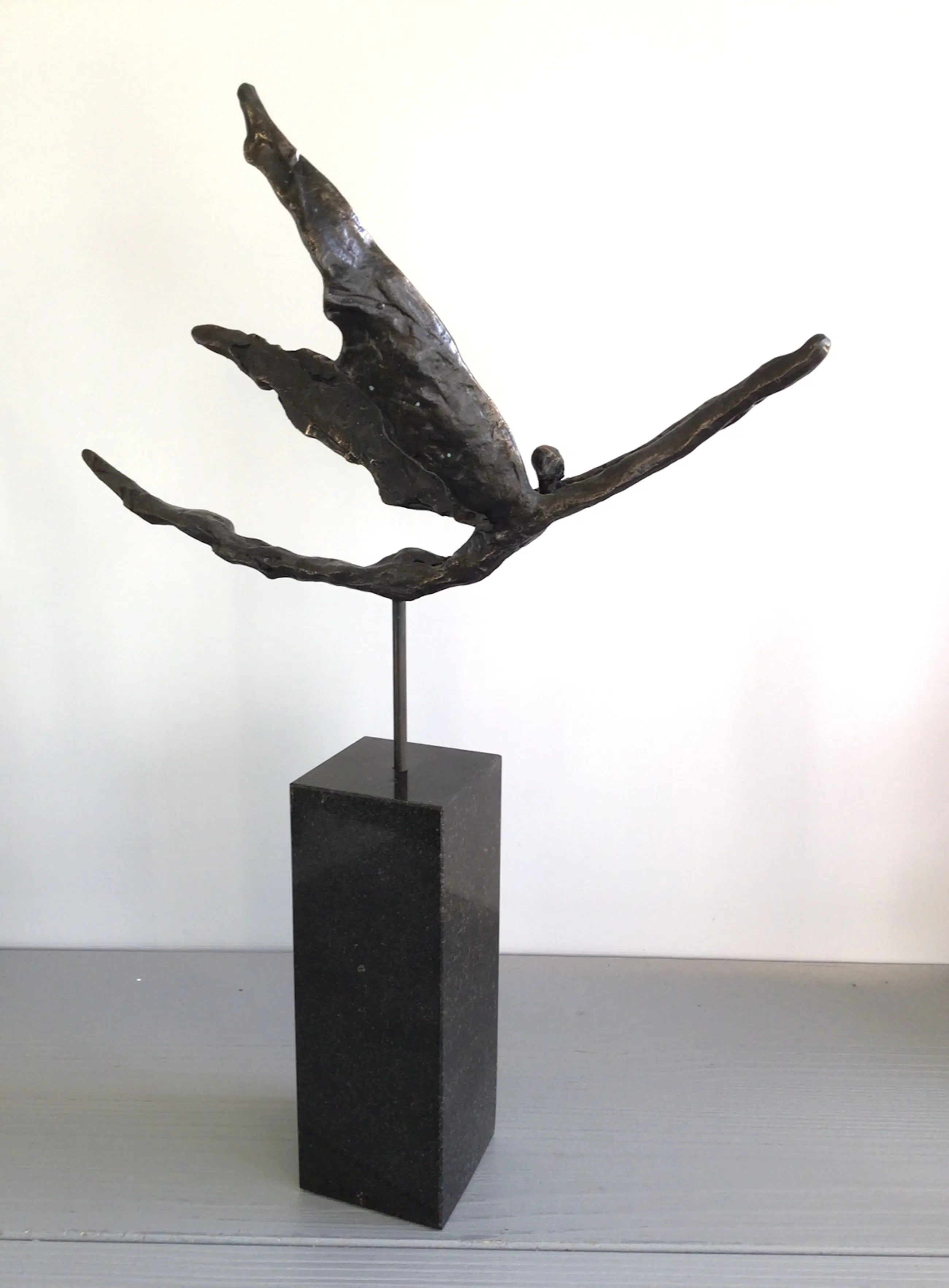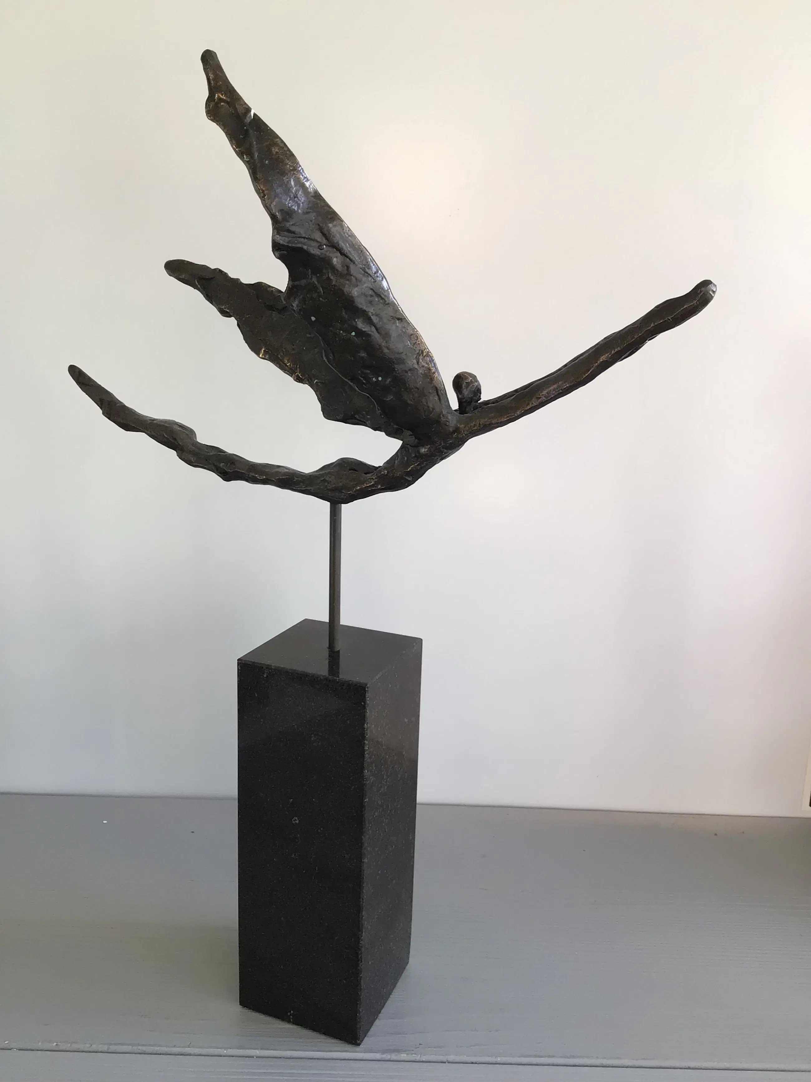 Zeer fraai vormgegeven en verfijnd sculptuur van een zwevend mensfiguur met vleugels, een prachtige metafoor. Titel “ Met het juiste doel voor ogen op vleugels van goud “ Materiaal: legering op fraaie zwart marmeren sokkel Kunstenares: Corry Ammerlaan Het beeld verkeert in zeer goede staat en wordt zorgvuldig verpakt verzonden.