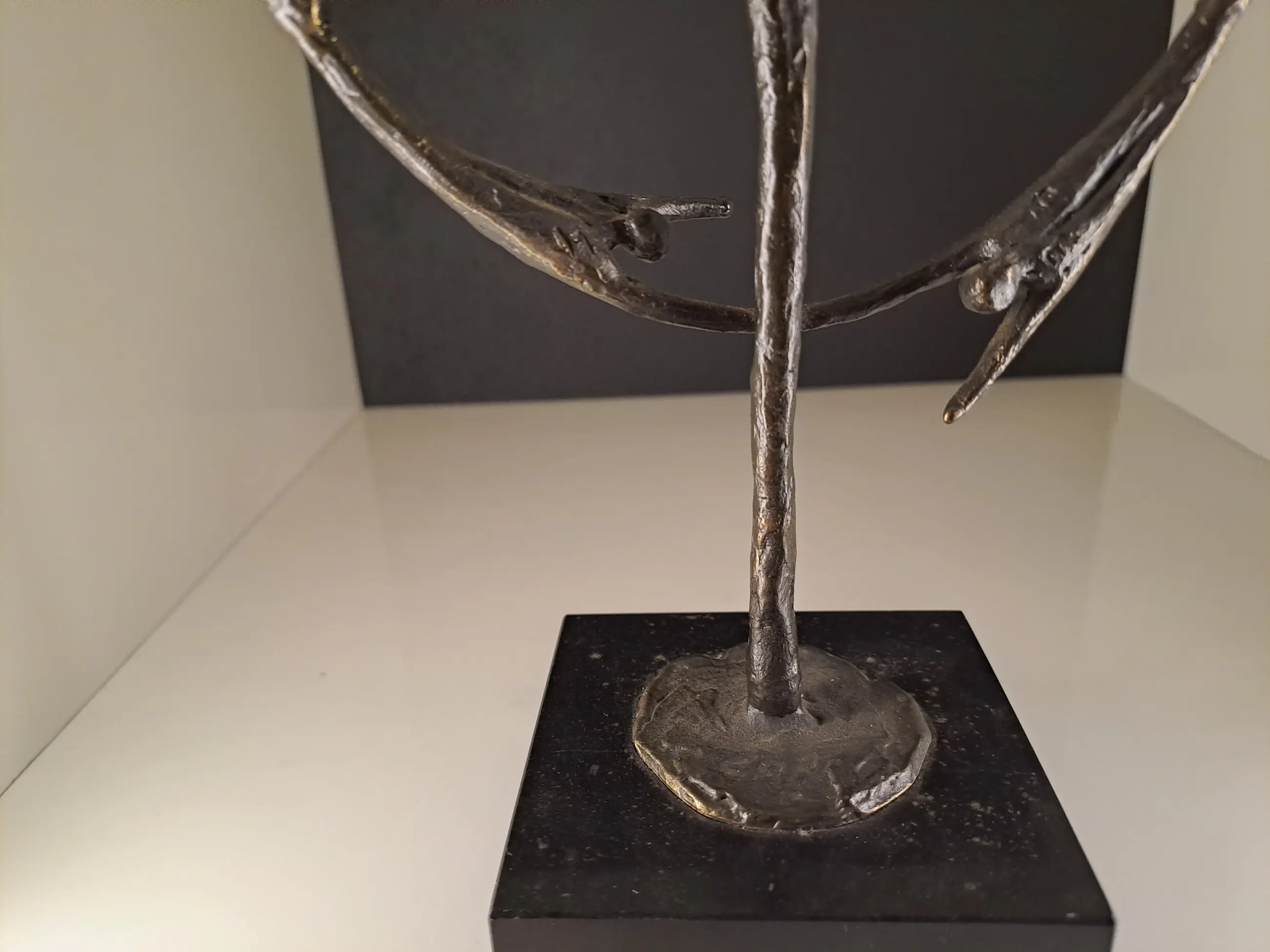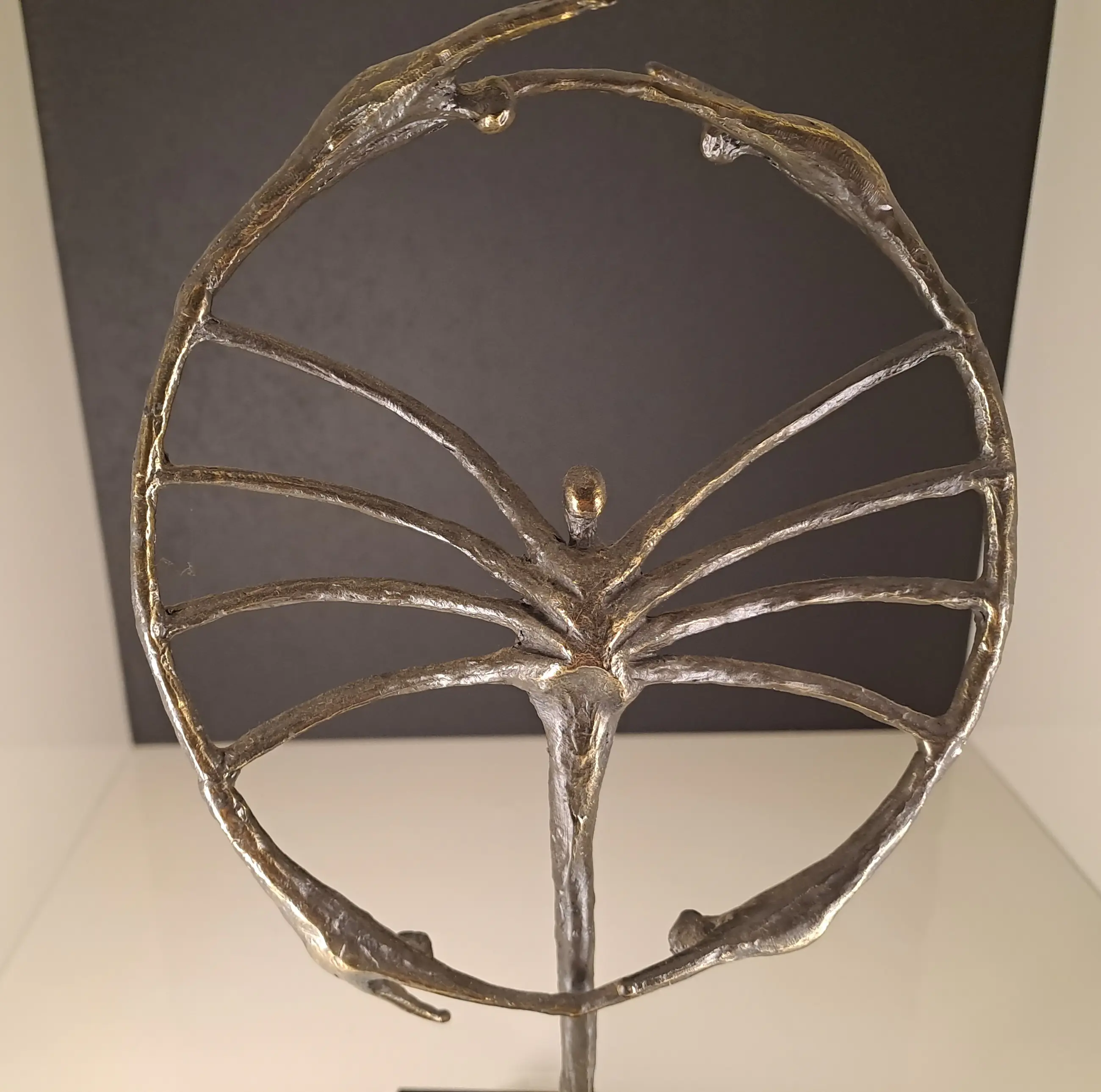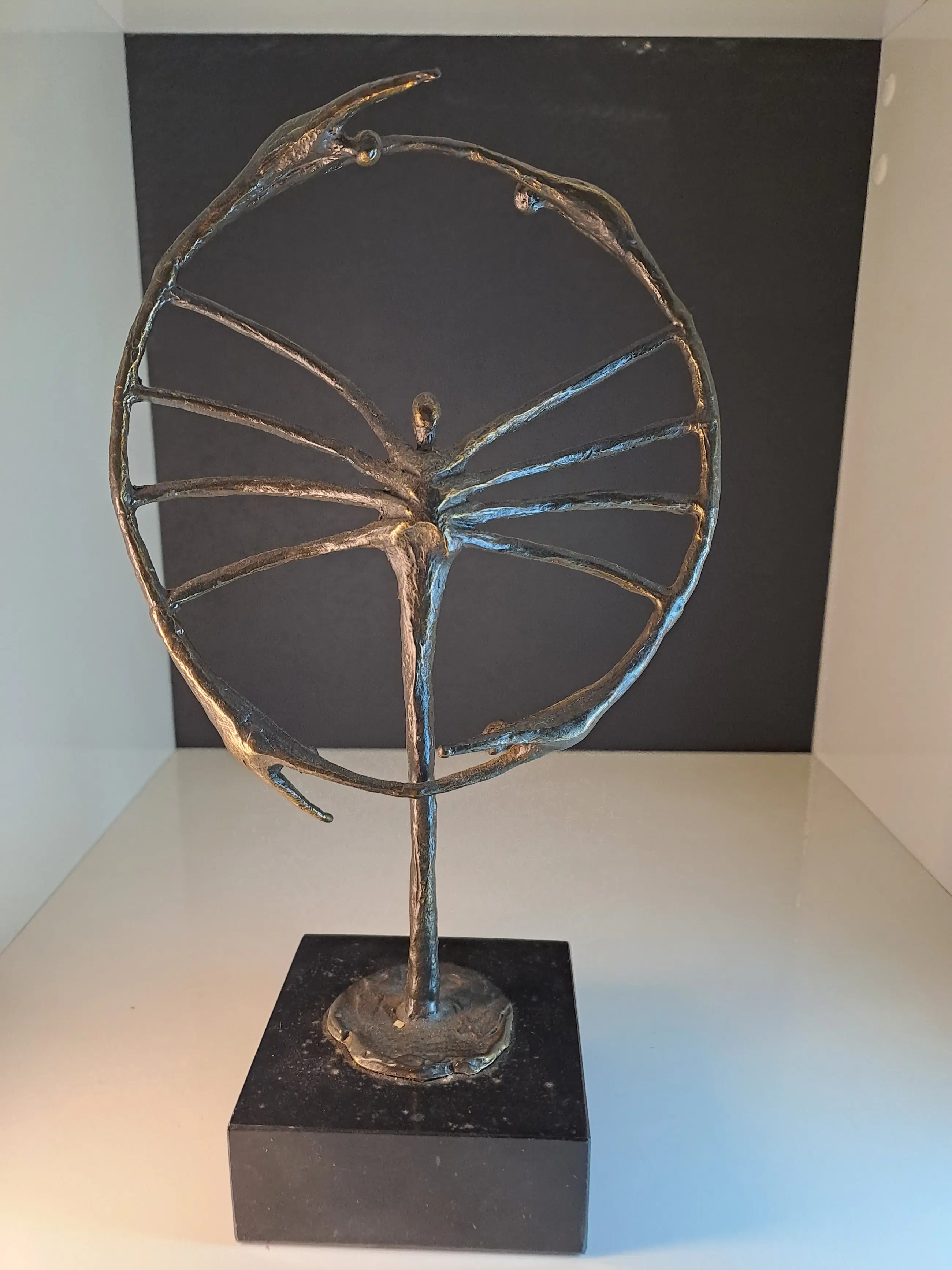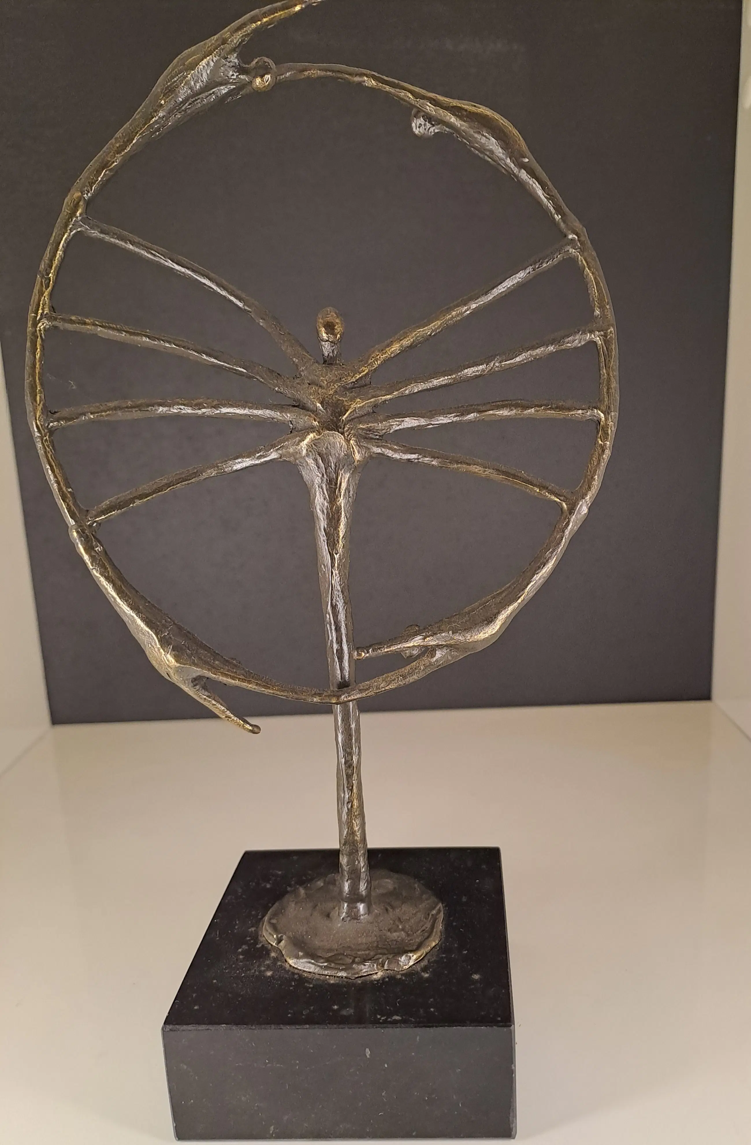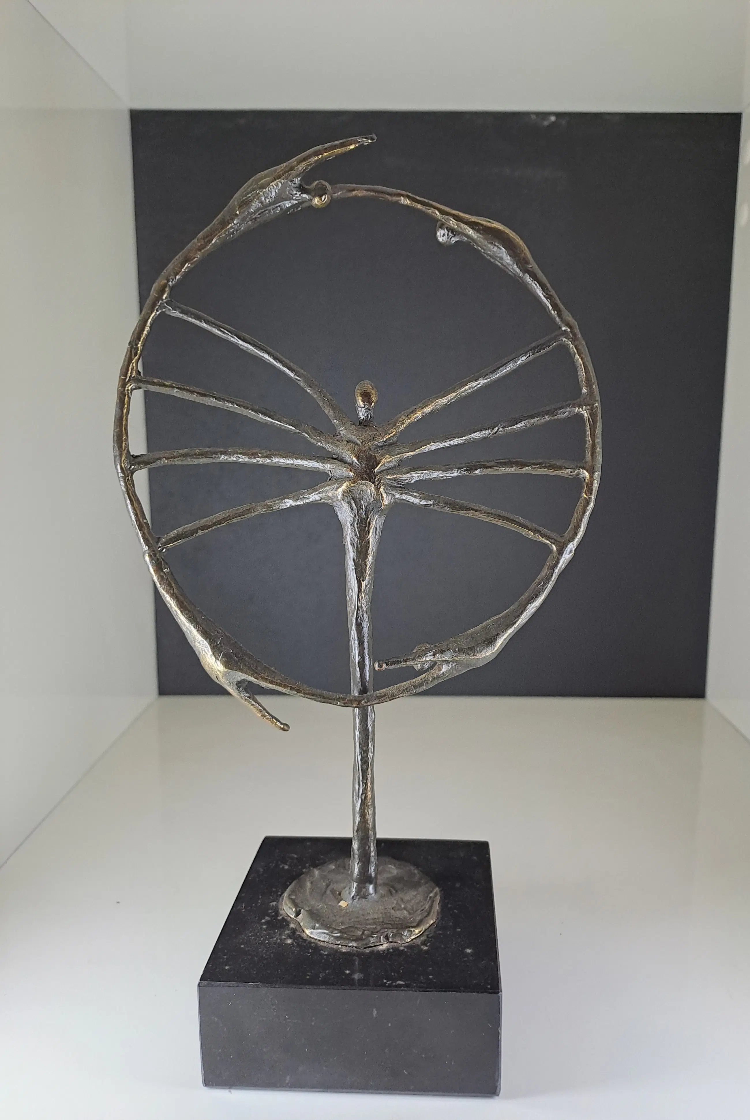 Dit beeldhouwwerk, zoals te zien is een zeer fraai symbolisch sculptuur van een mensfiguur dat centraal staat temidden van een cirkel waarin nog vier mensfiguren zijn verwerkt en zo een rond draaiende beweging maken.