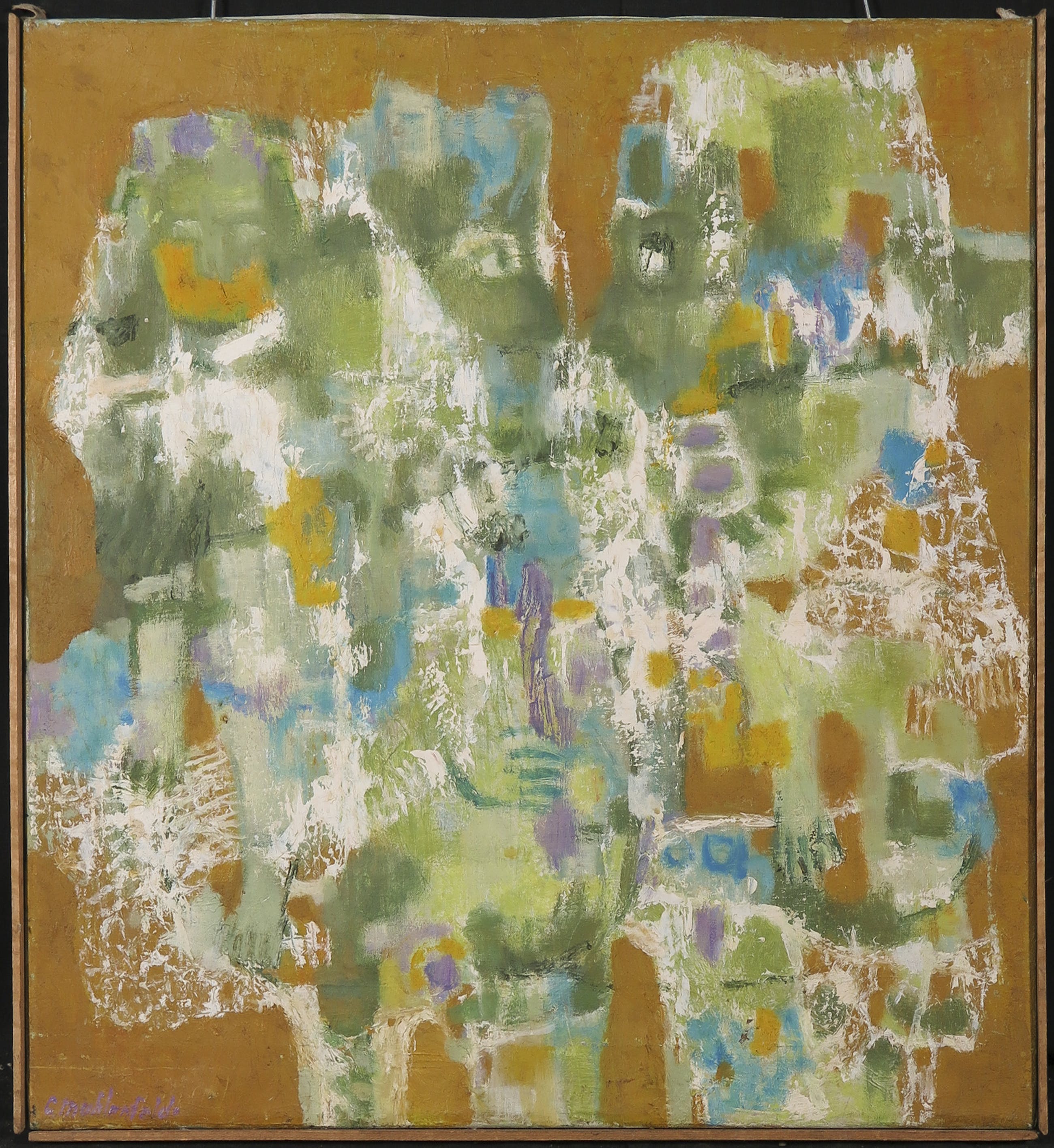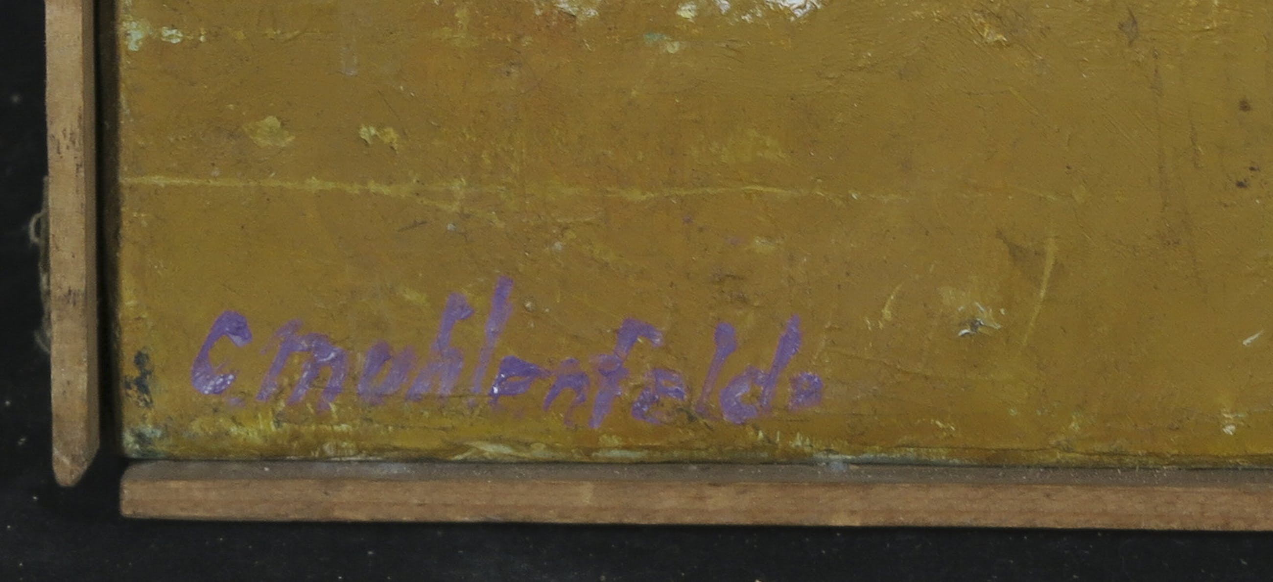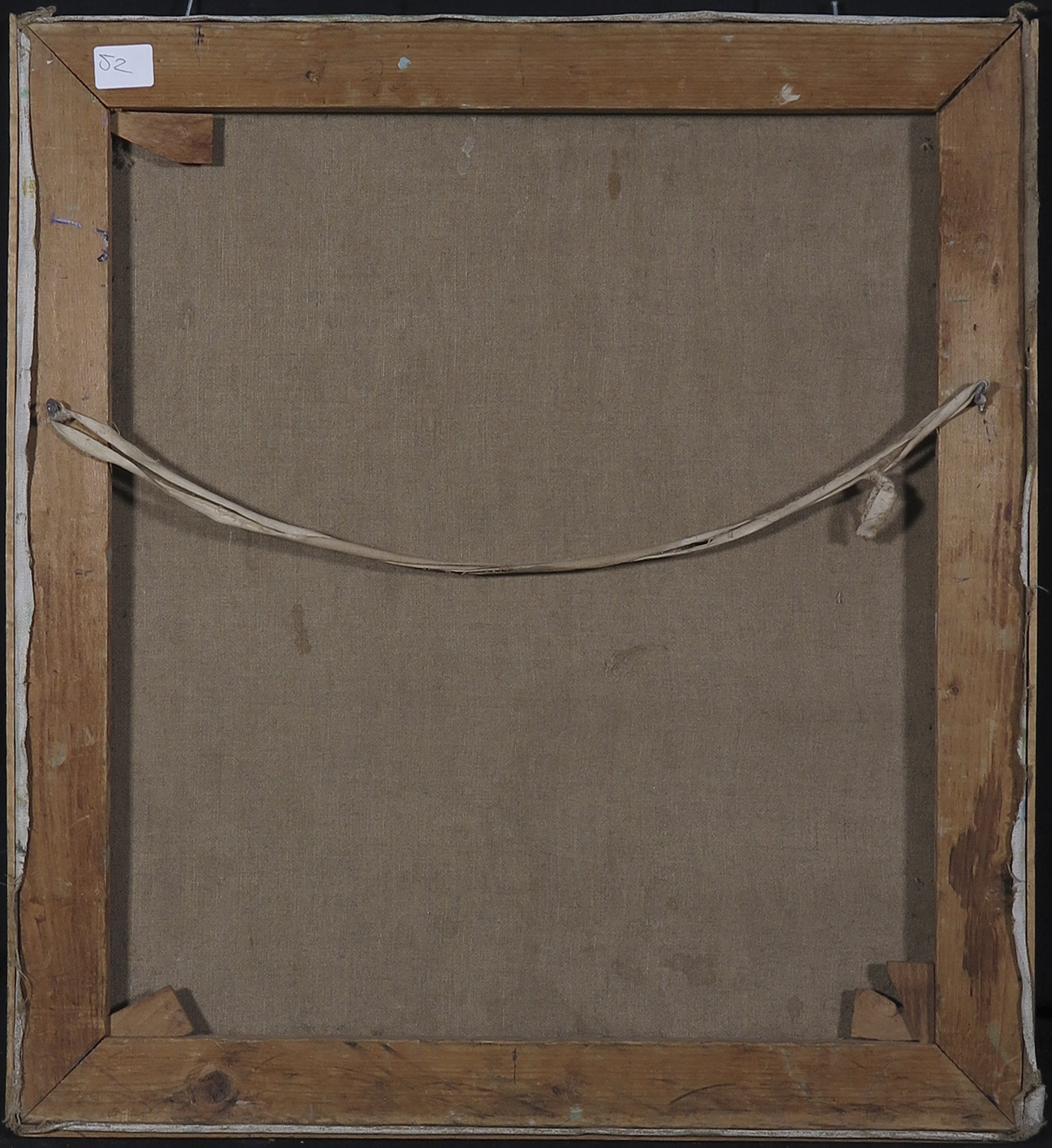 | Op een aantal plekken wat barstjes in de verflaag, op een enkele plek verfverlies. Verder wat verlies van spanning van het canvas. Bovenste lat van de lijst ontbreekt. | |