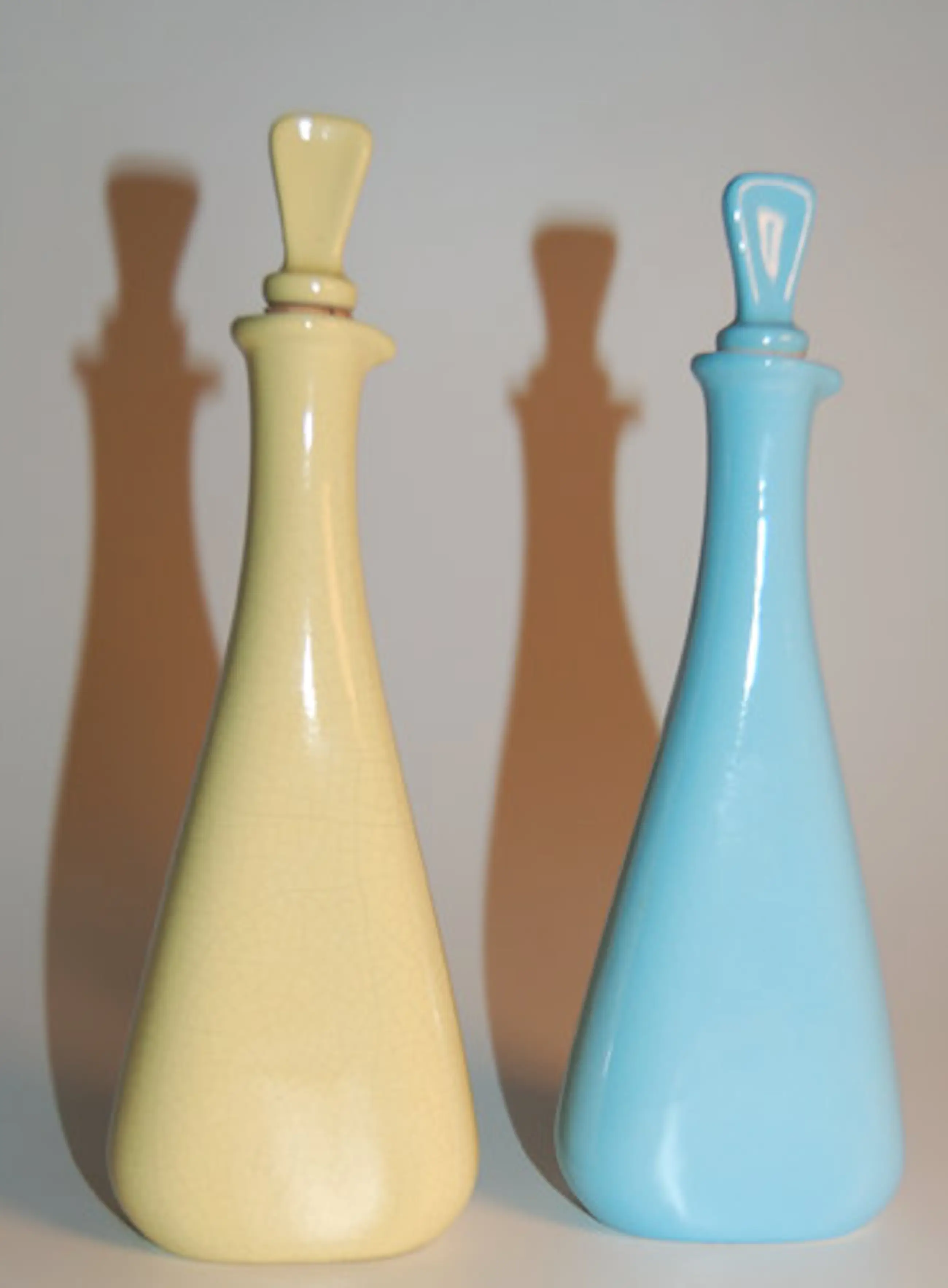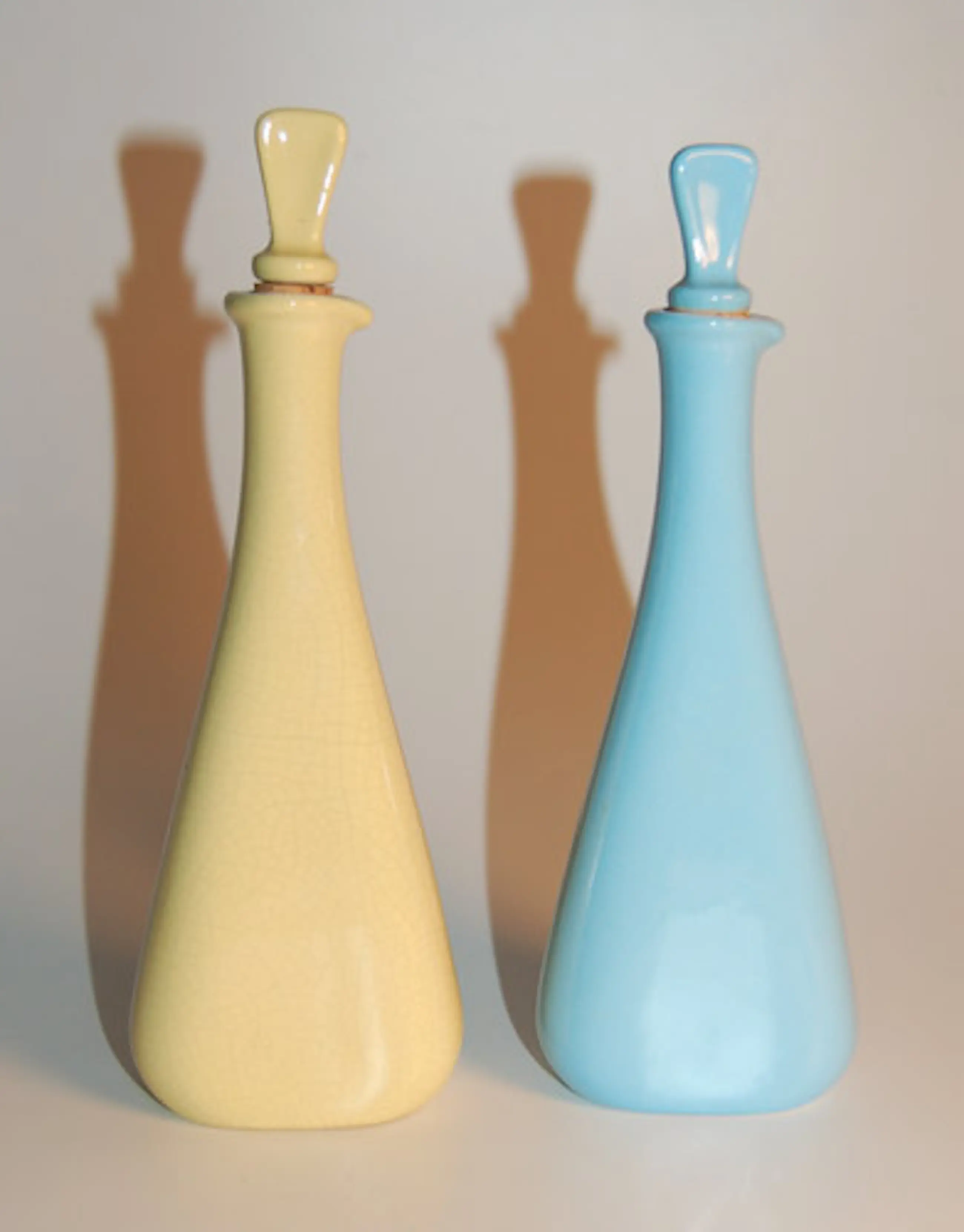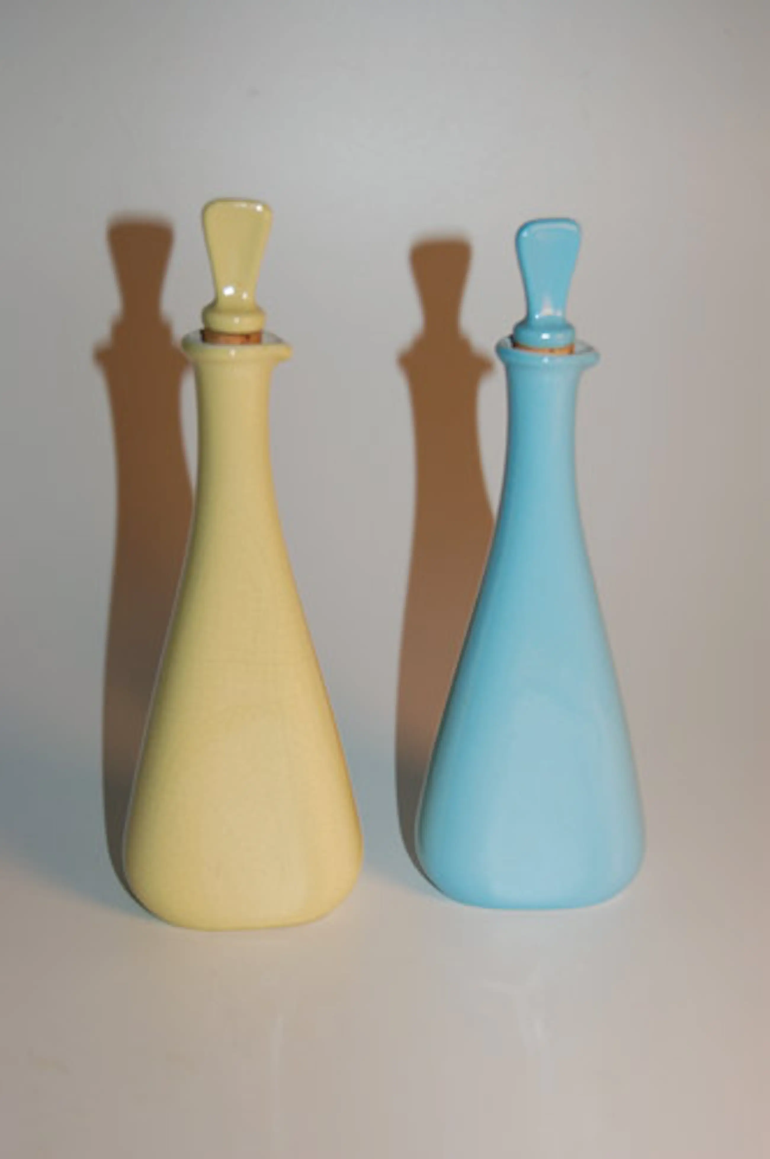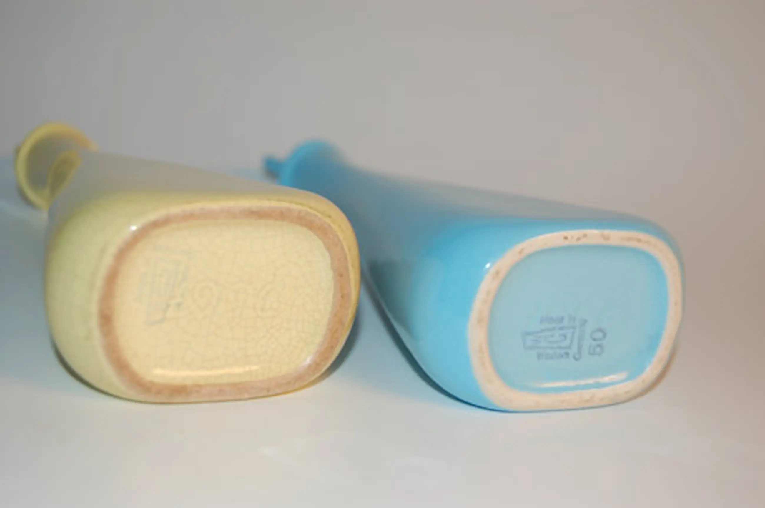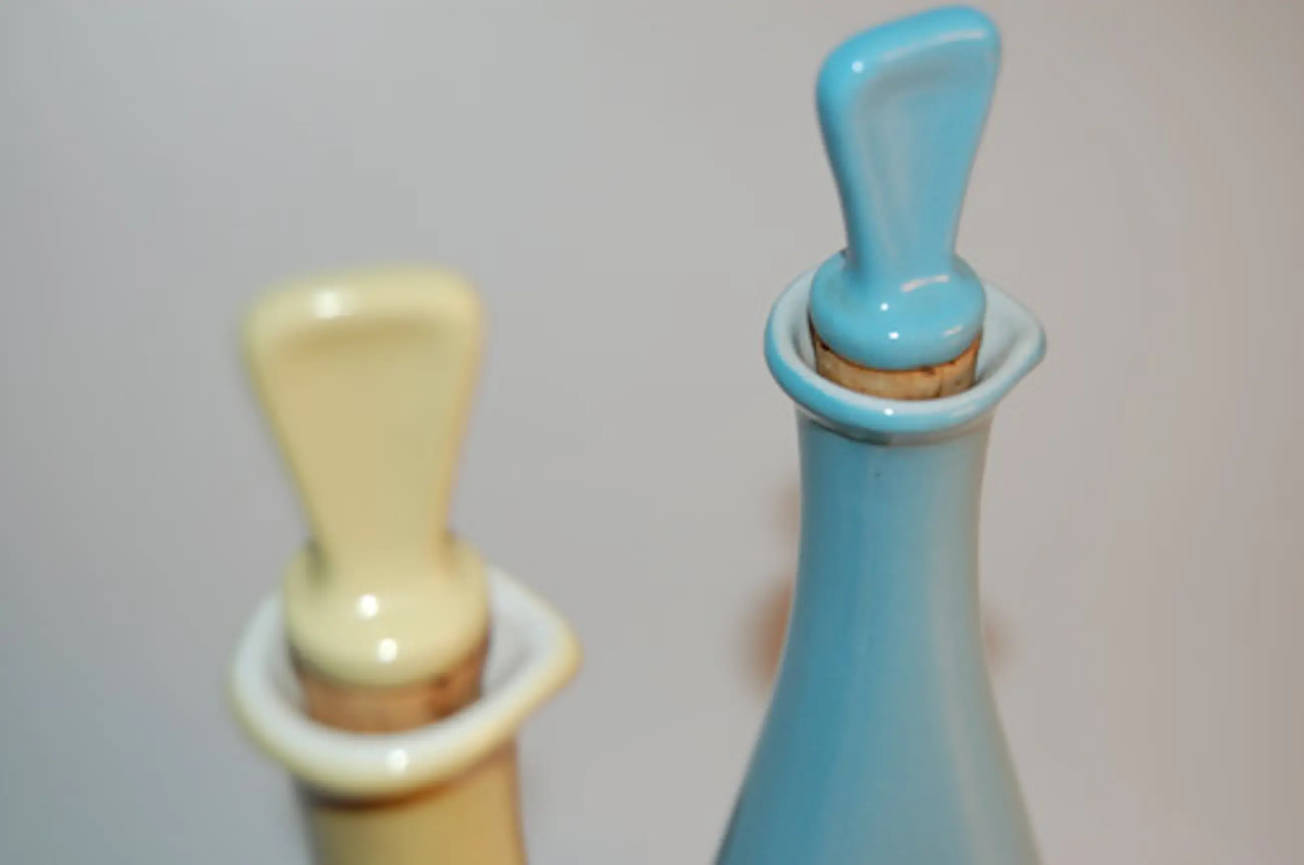 Zeldzaam olie en azijn flesjes/ karafjes met stop Fabriek: Cortendorf Kleur: zachtgeel en baby blauw Materiaal: aardewerk Hoogte: 20 cm ( + ca br 7 x d 3 cm) Stopjes met kurk in goede staat Nummer: 9567 blind stempel Merk stempel: WG 50, West Germany Inhoud: 100 ml (CC) Conditie: gaaf, met een kleine chip
