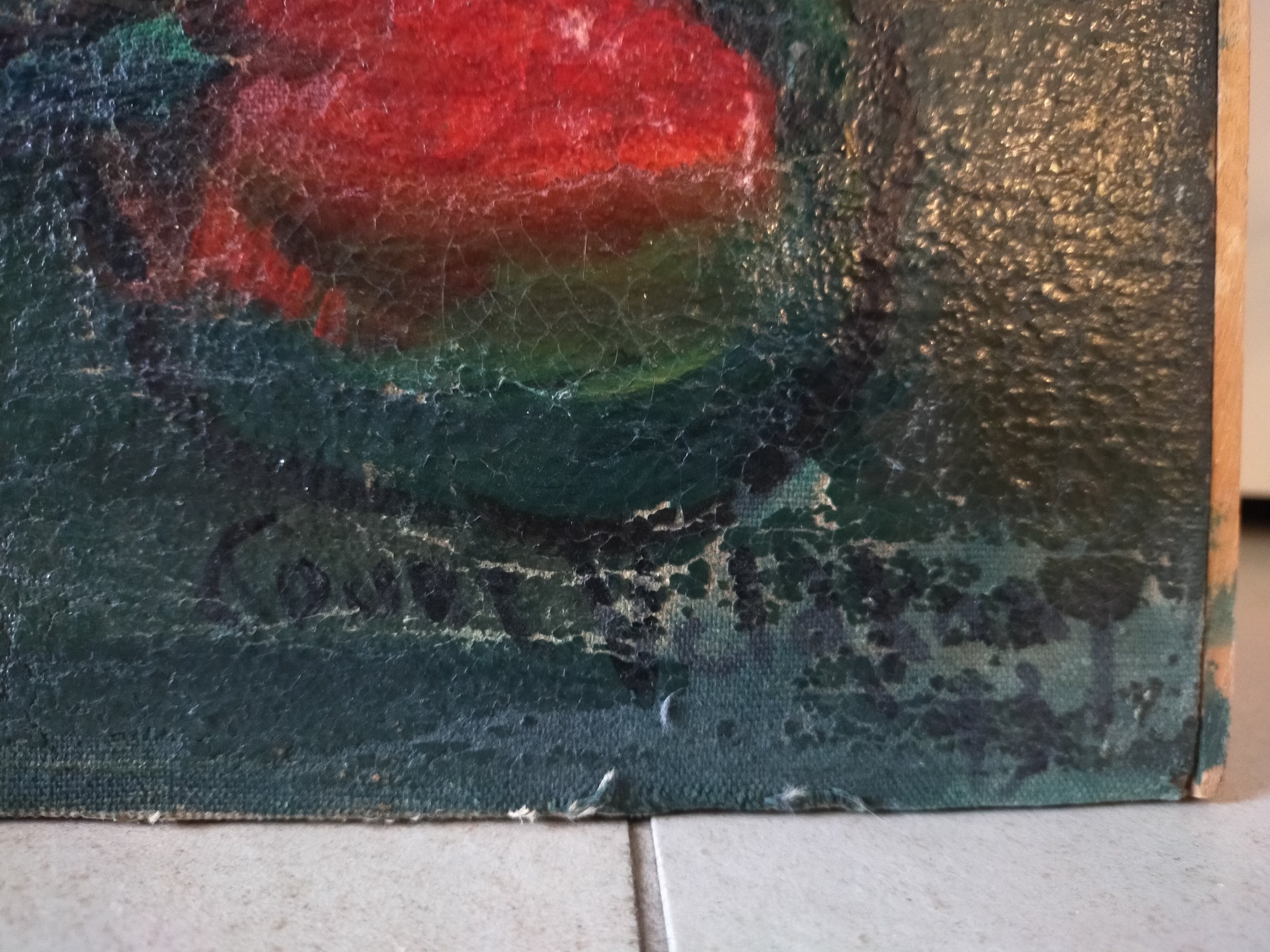 Er zit helaas een oppervlakkige horizontale kras over het werk. Ook zou het een opfrisbeurt kunnen gebruiken.