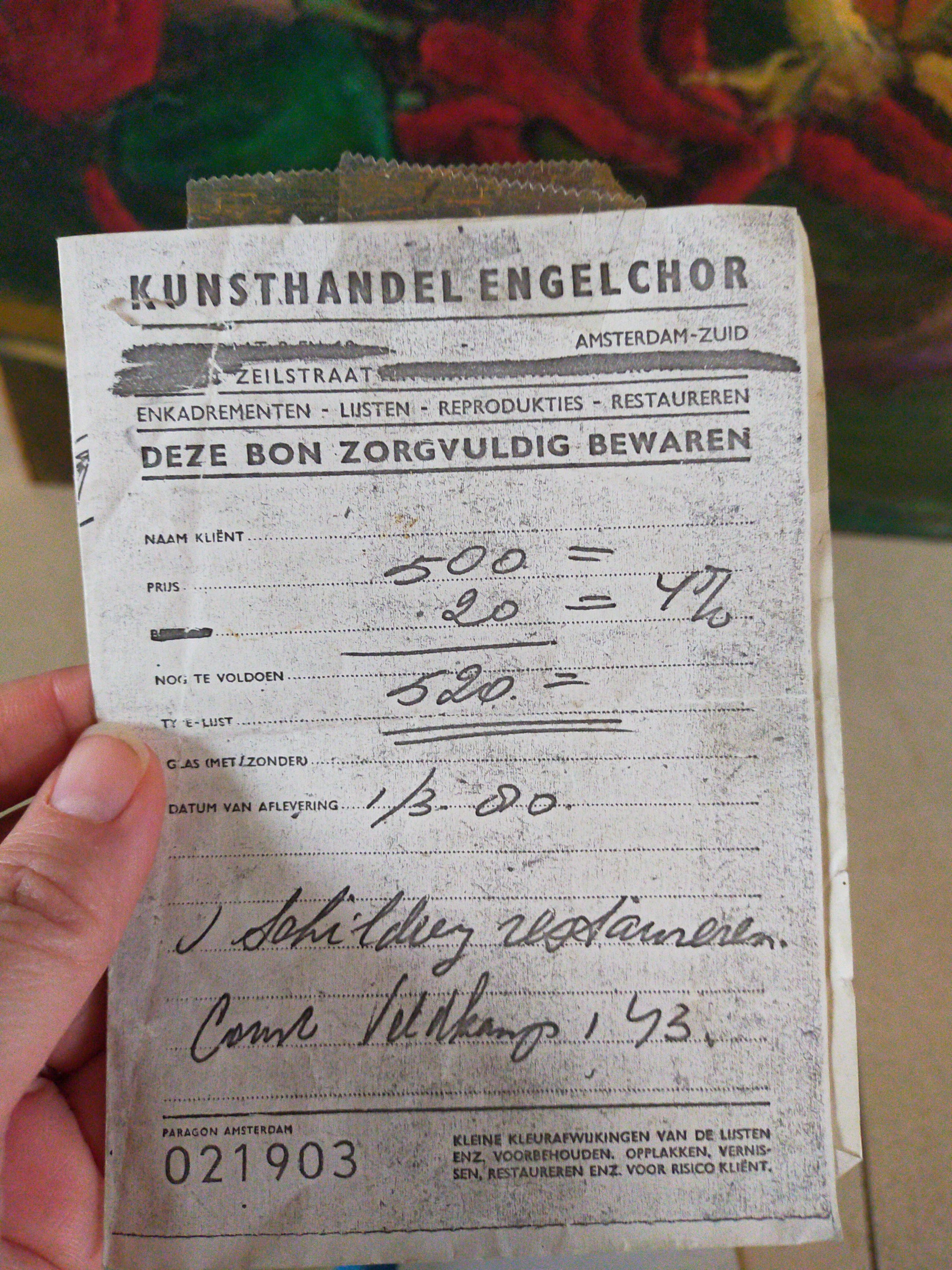 Mooi groot stilleven van de bekende schilder Court Cornelis Veldkamp. Bij het schilderij heb ik ook een verkoopbewijs van 520gulden van kunsthandel Engelchor Amsterdam waar het eind jaren '70 gekocht is.
