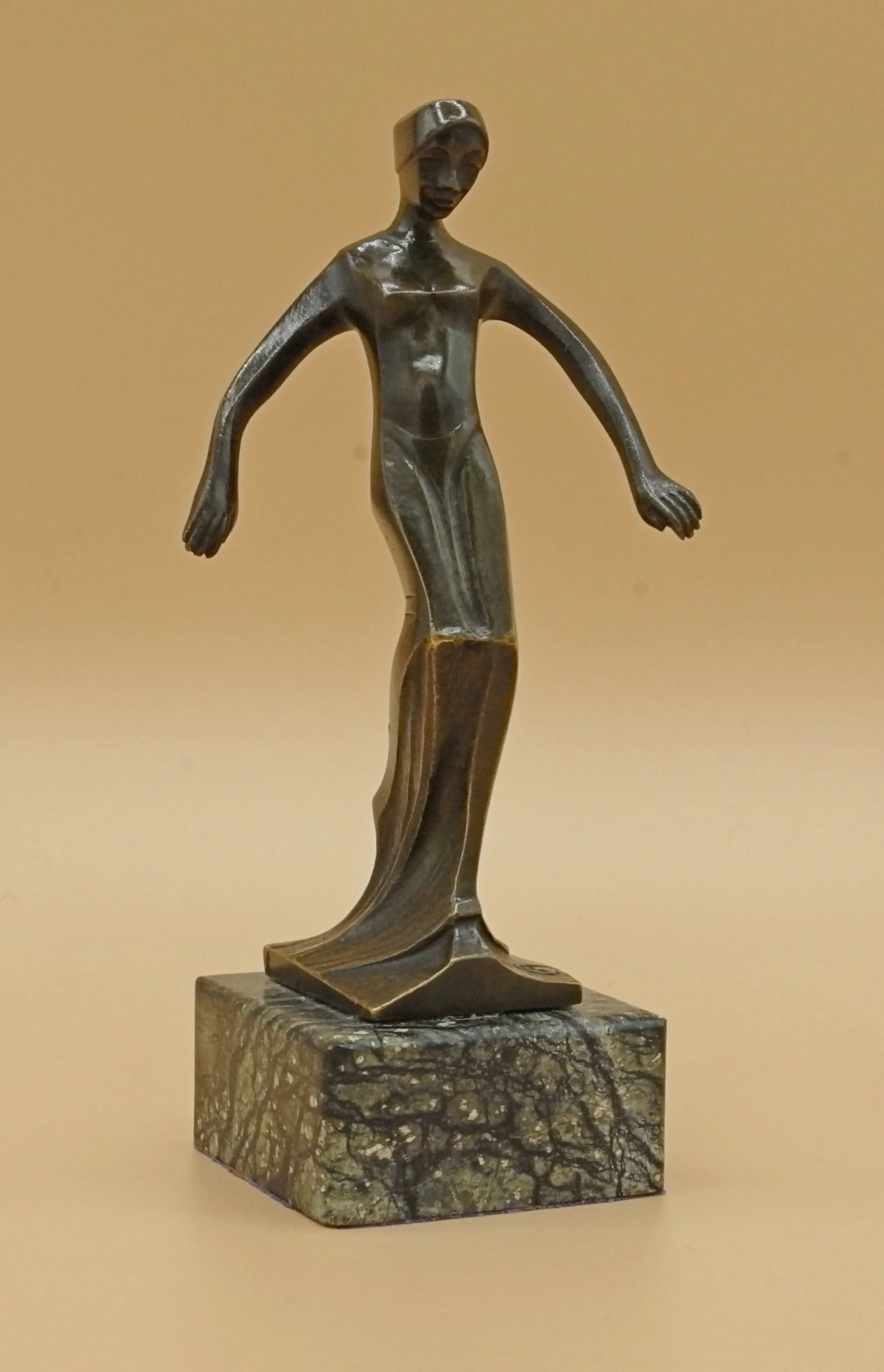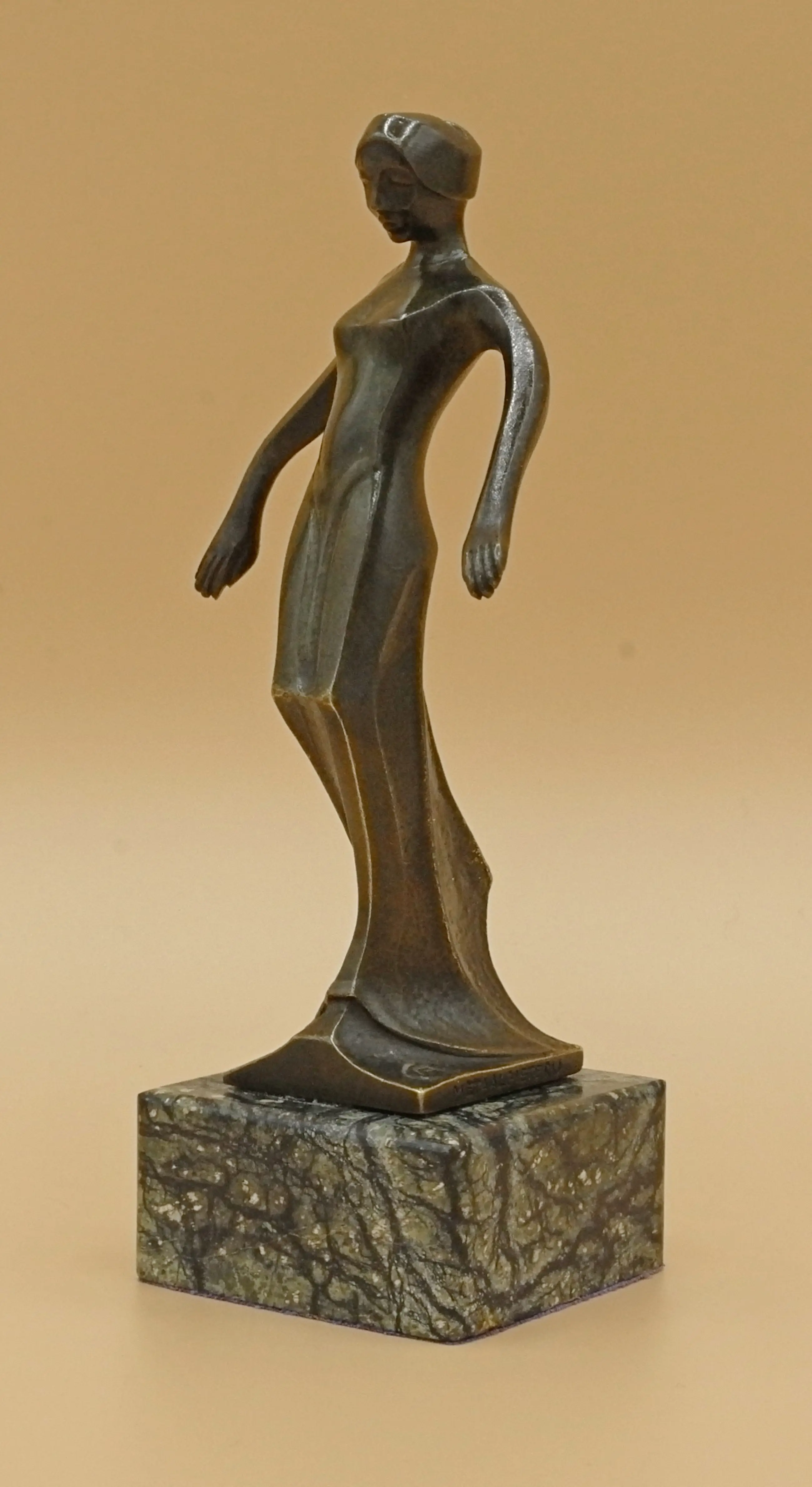 Bronzen beeldje van een staande vrouwenfiguur. Mooie warme patine.