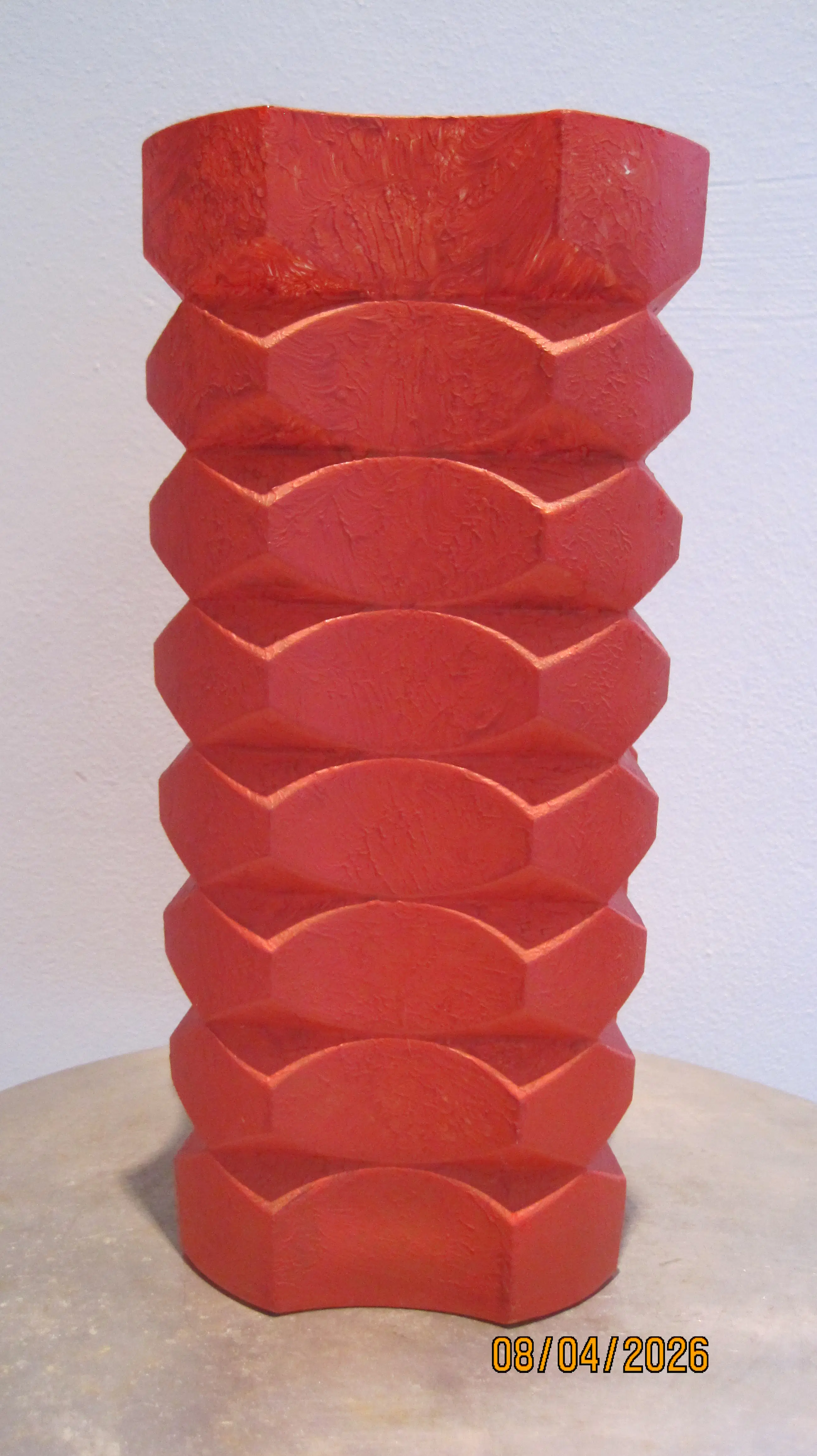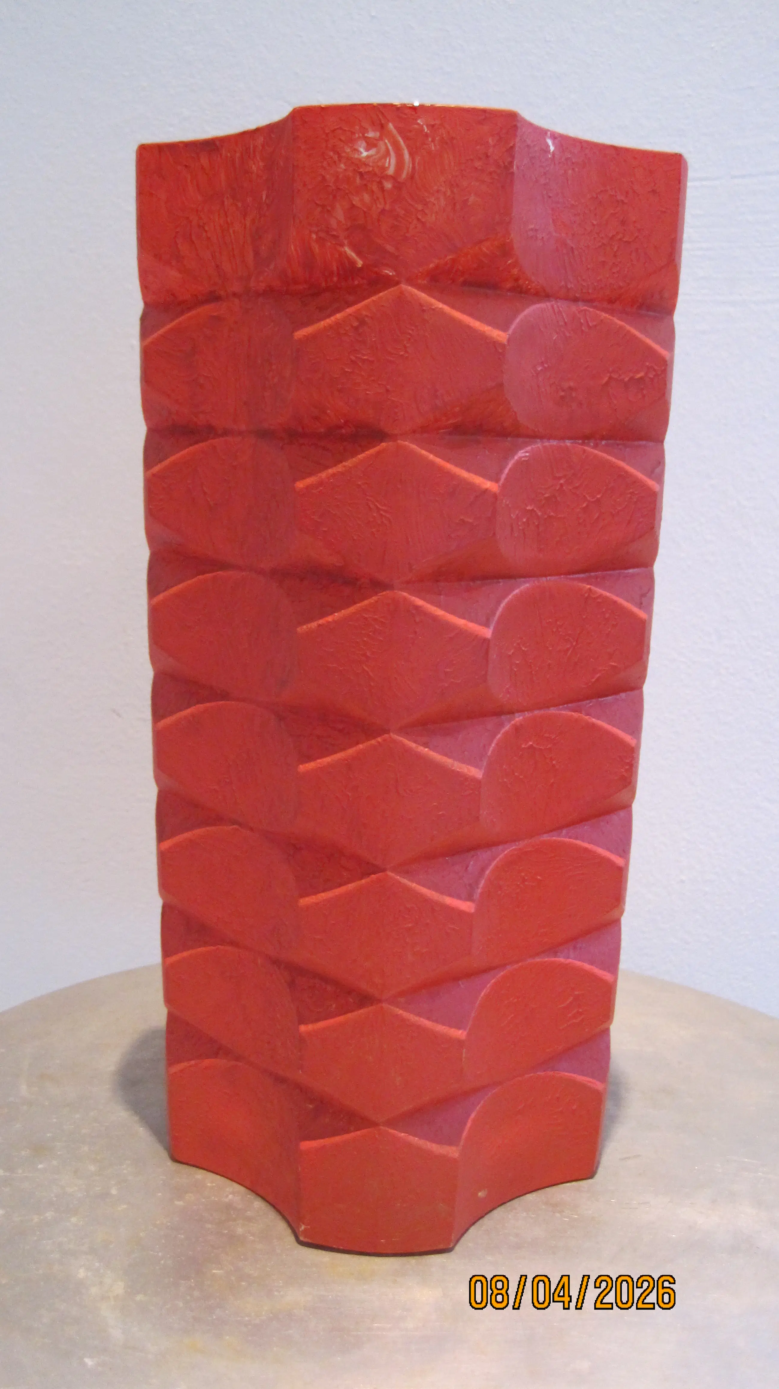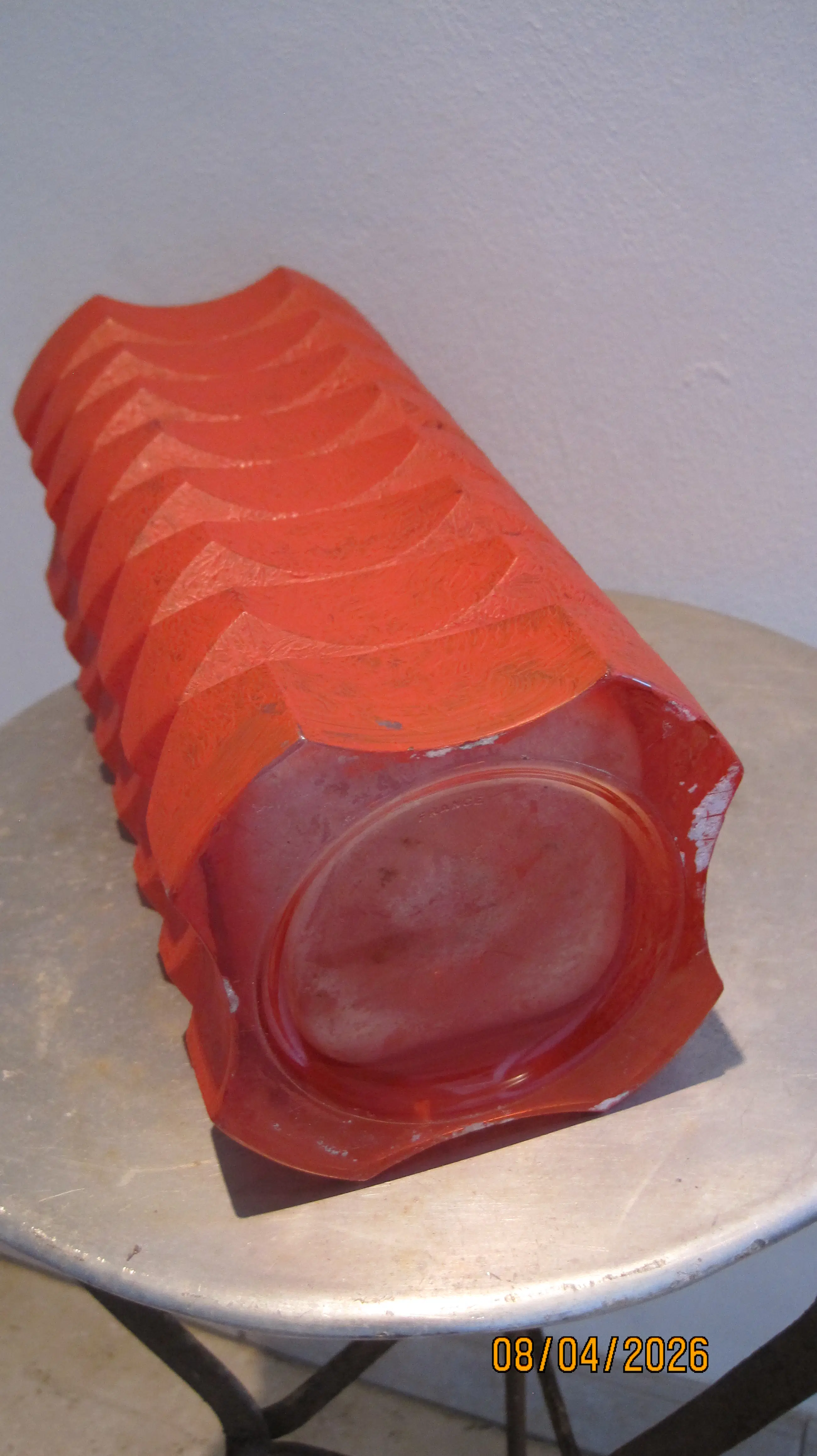 Deze fraaie vaas Windsor uit loodkristal gemaakt is een ontwerp uit de jaren 1960 door J.G. Durand. De staat van de vaas is "as found ", puntgaaf, maar rood beschilderd door een vorige eigenaar. Dit is gebeurd met acrylverf, dus makkelijk te verwijderen. Persoonlijk vind ik de rode kleur heel goed staan, het geeft diepte in het ontwerp. Gemerkt met FRANCE op de onderkant.