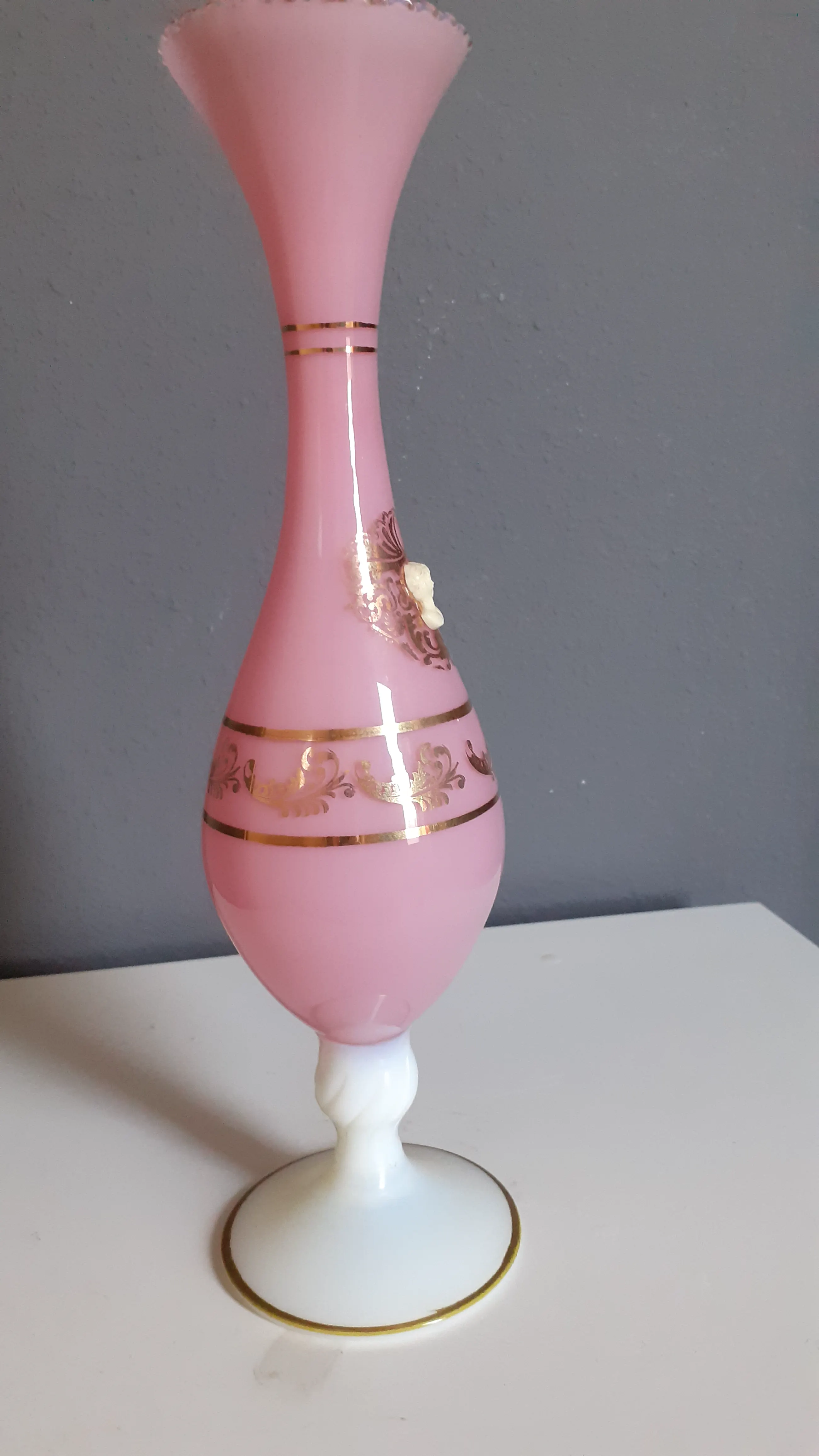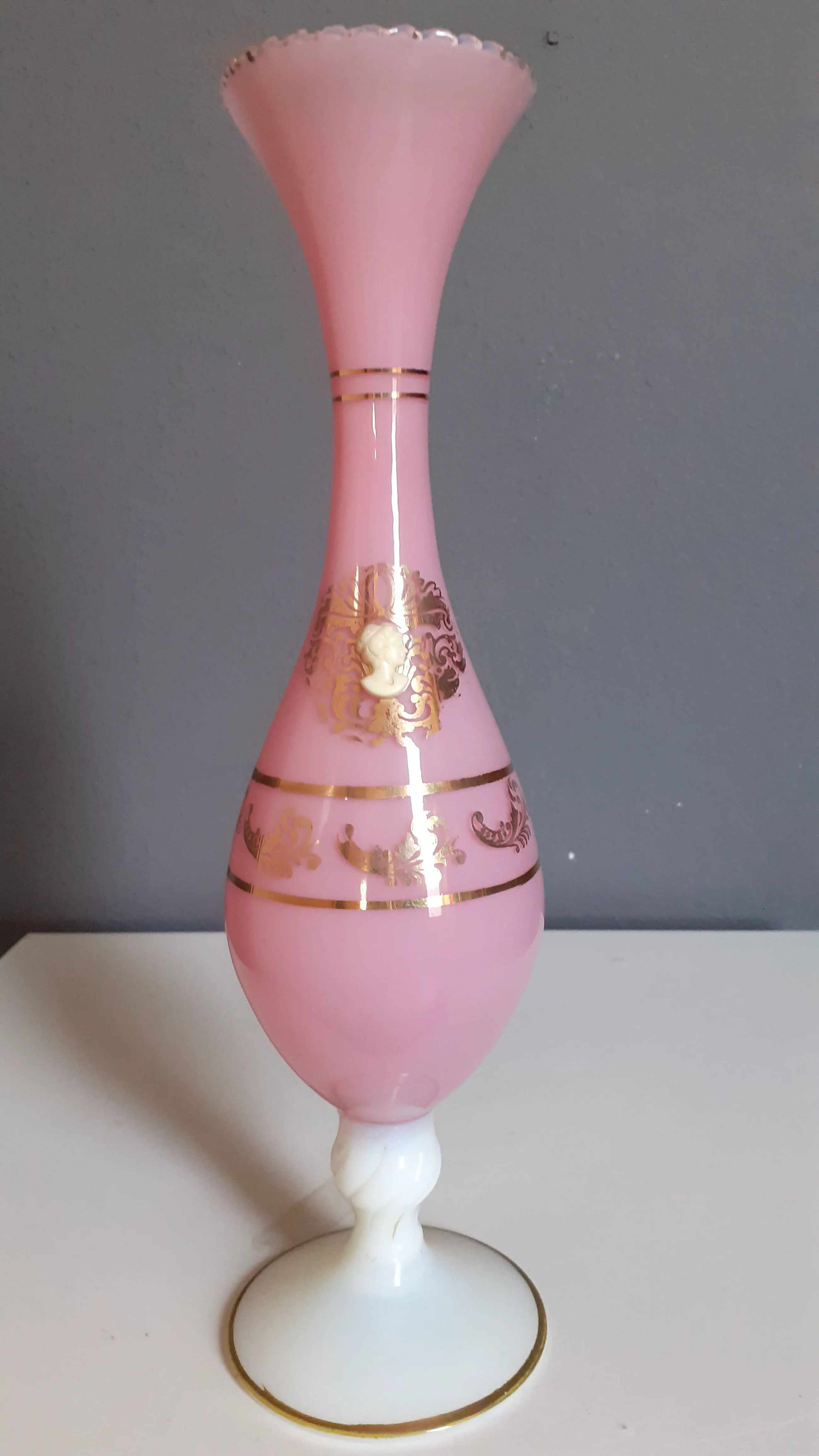 Portieux rond jaren 30 maakte dit soort vaasjes van melkglas. De gedraaide witte voet was een van hun kenmerken. Komende uit Frankrijk, beschilderd met bladgoud en de originele Camee van een Franse dame nog intact. Sierlijk vaasje gezien in de tijdsgeest van jaren 30. gemerkt door typisch Portieux wit gedraaid voetje.