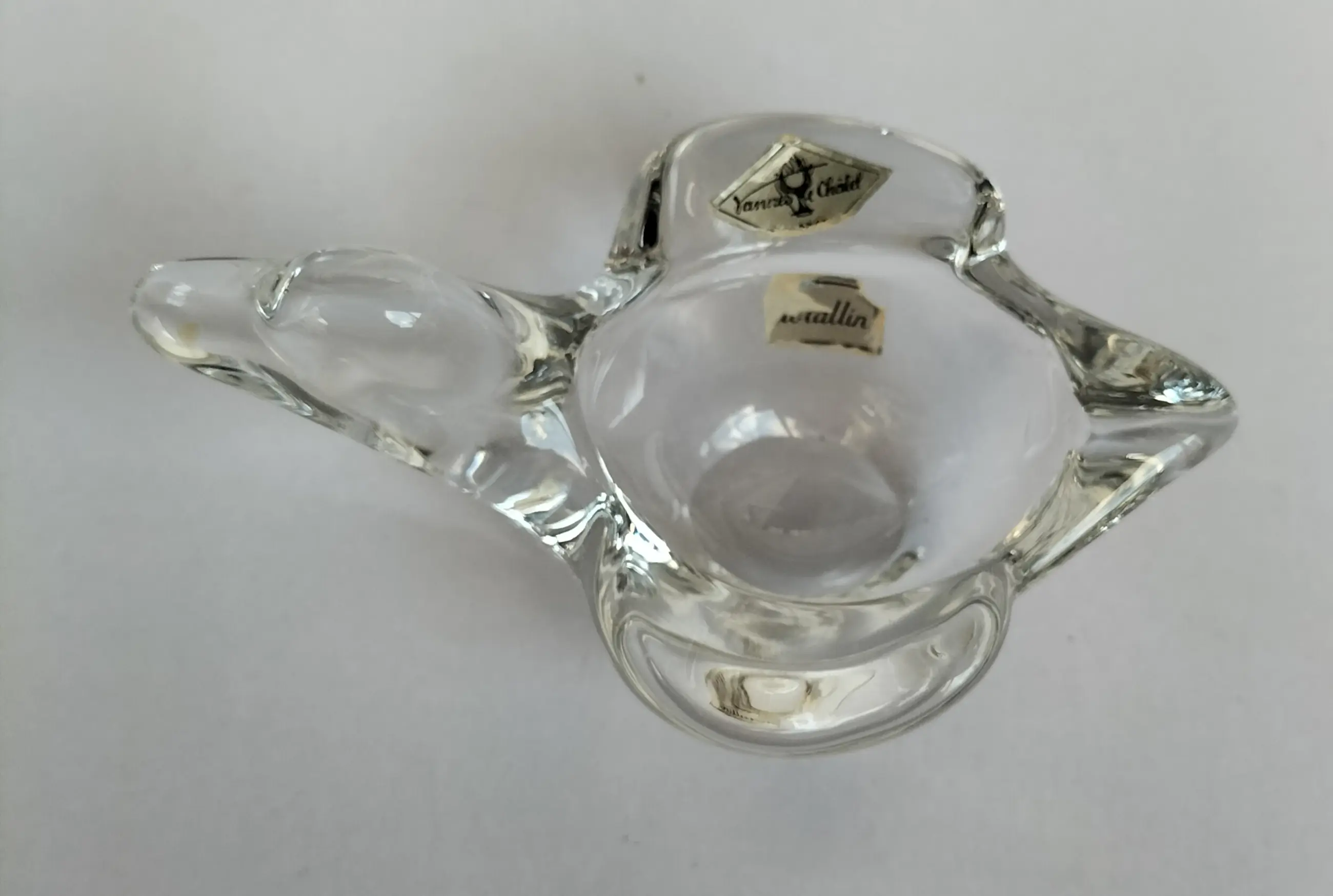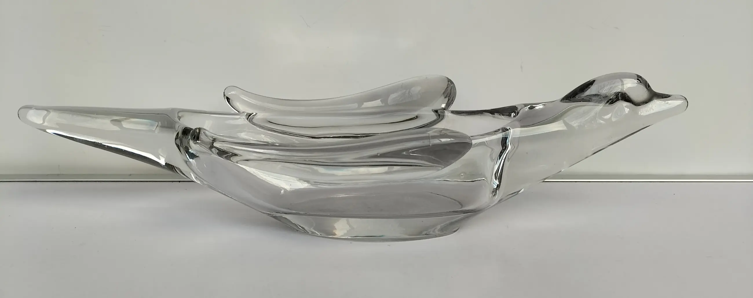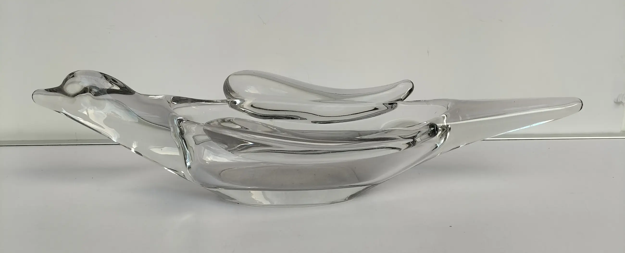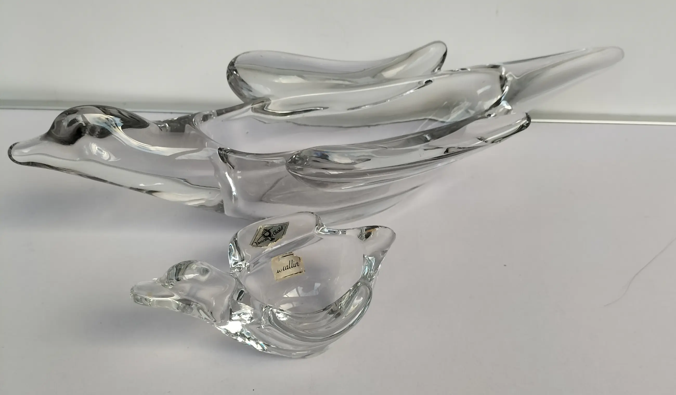 Een zeer mooie kristallen schaal in de vorm van een vogel, alsmede een schaaltje van dezelfde vogel maar dan kleiner van formaat, van Vannes France uit de jaren 60.