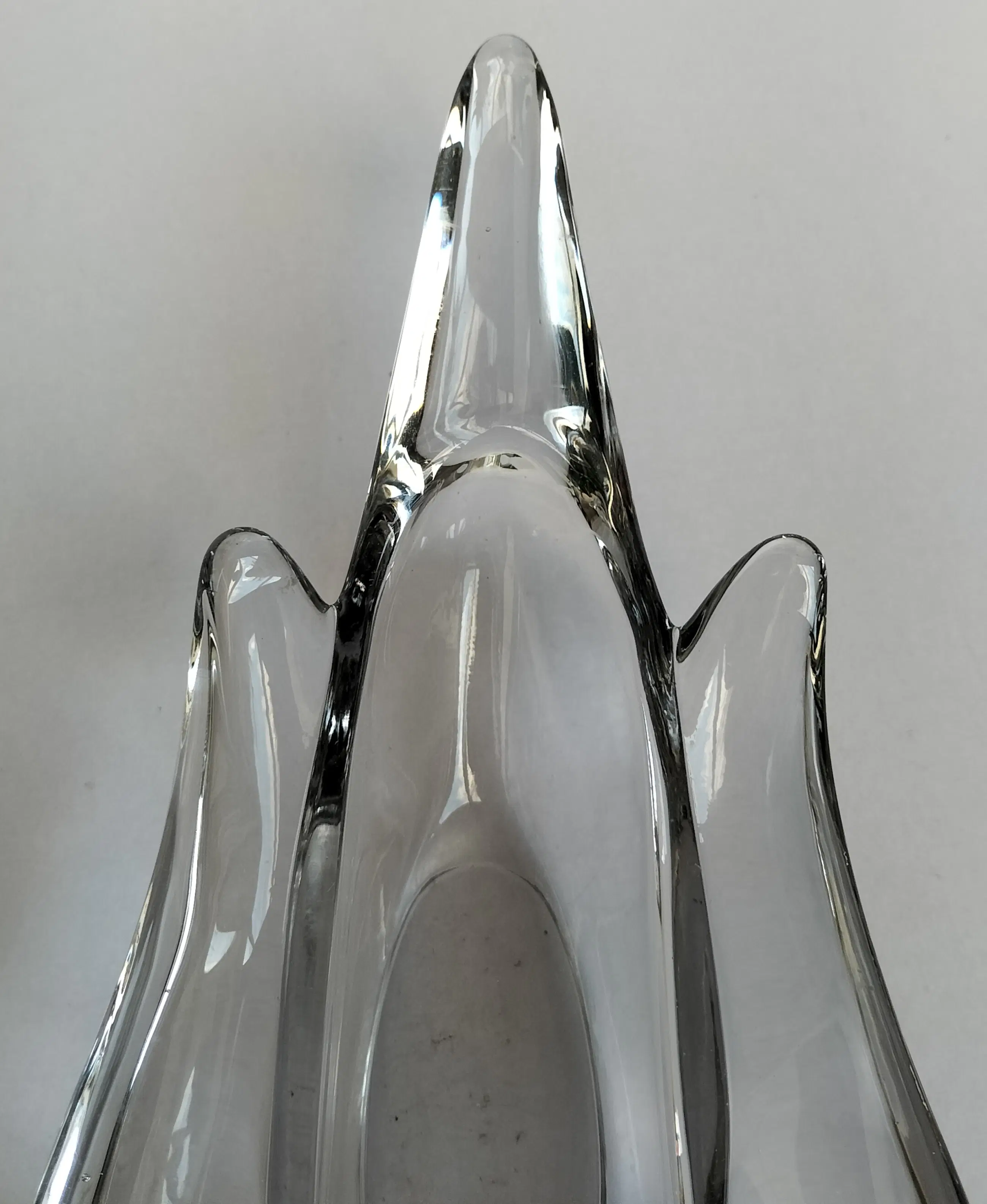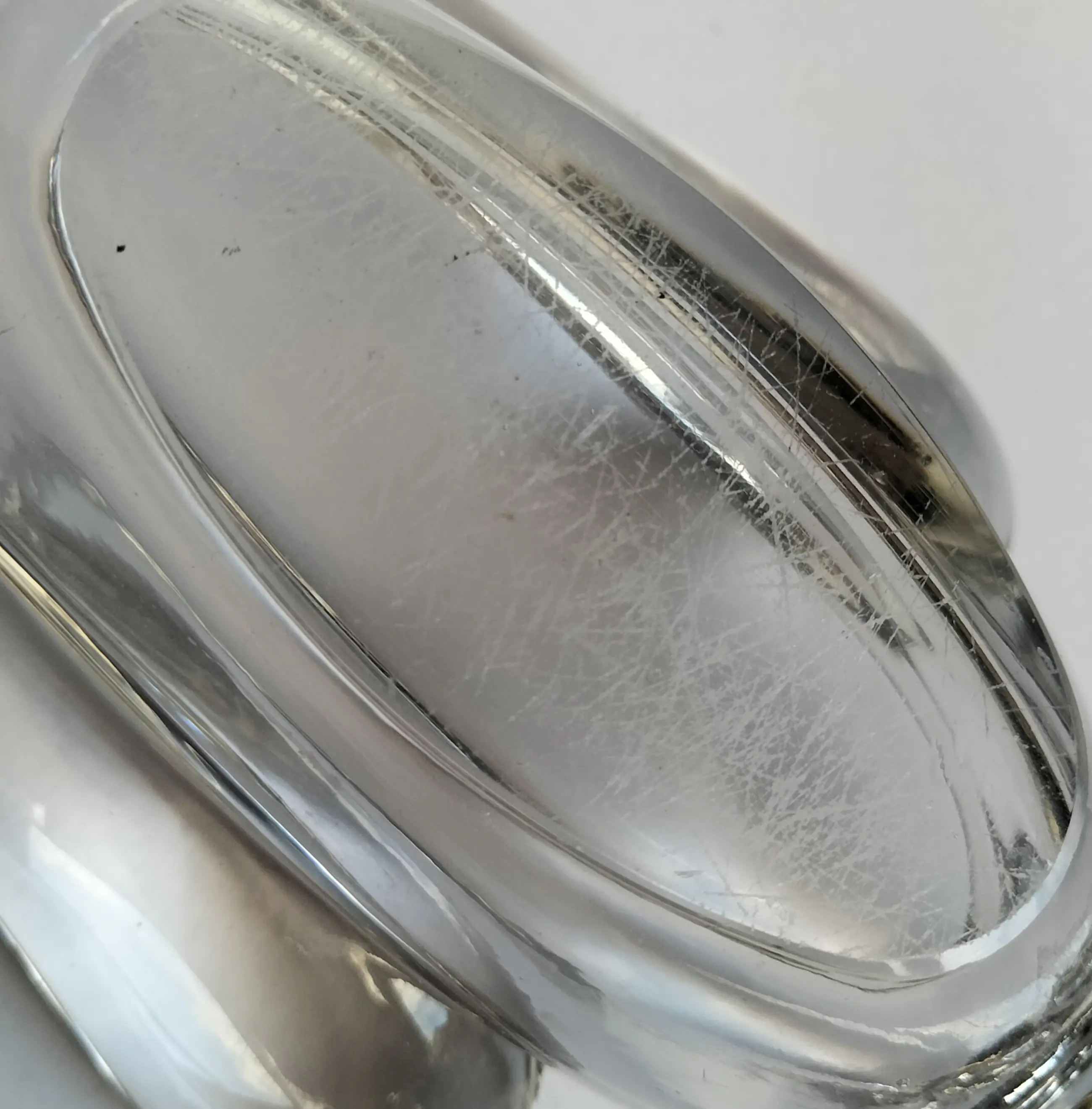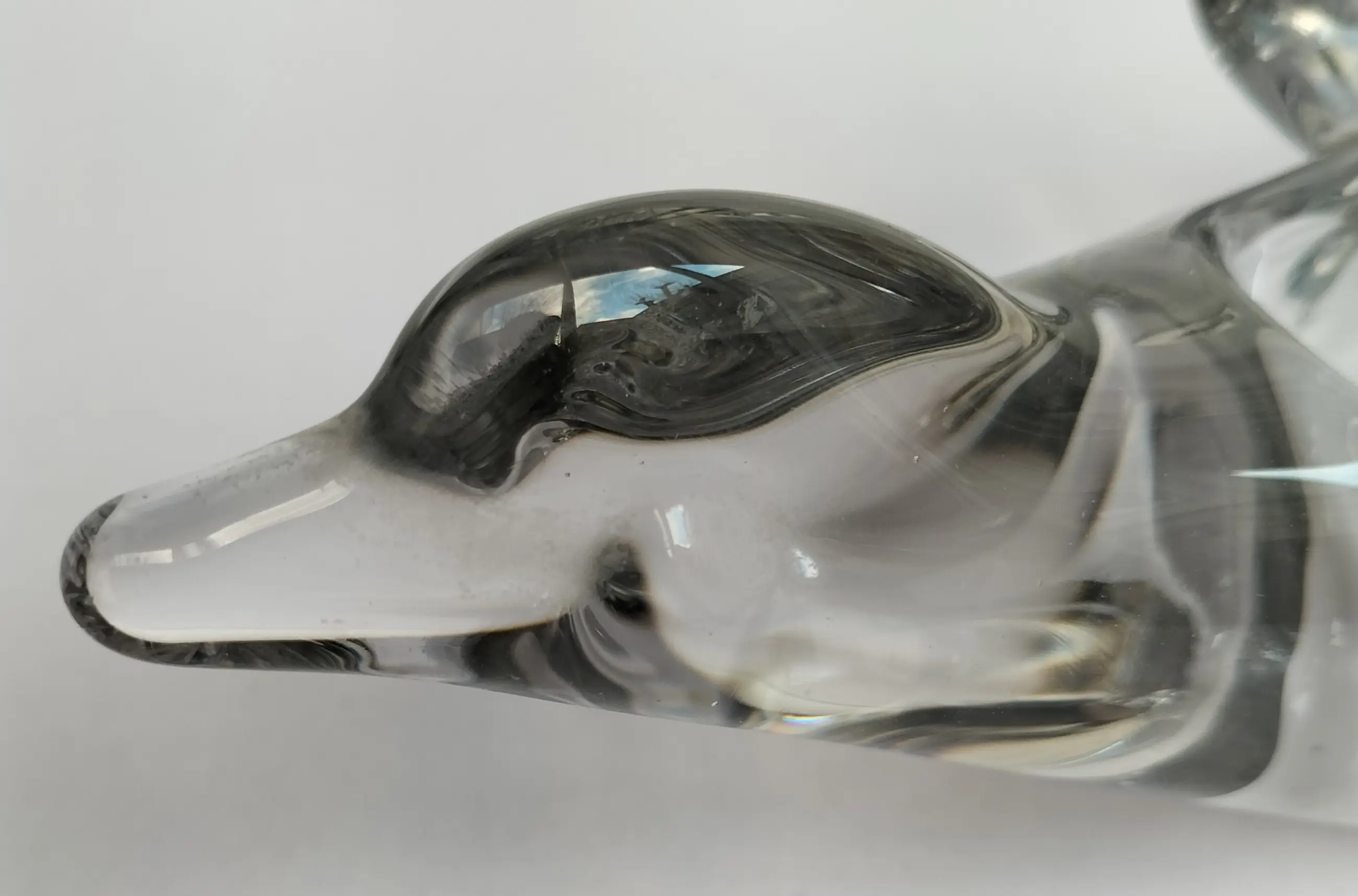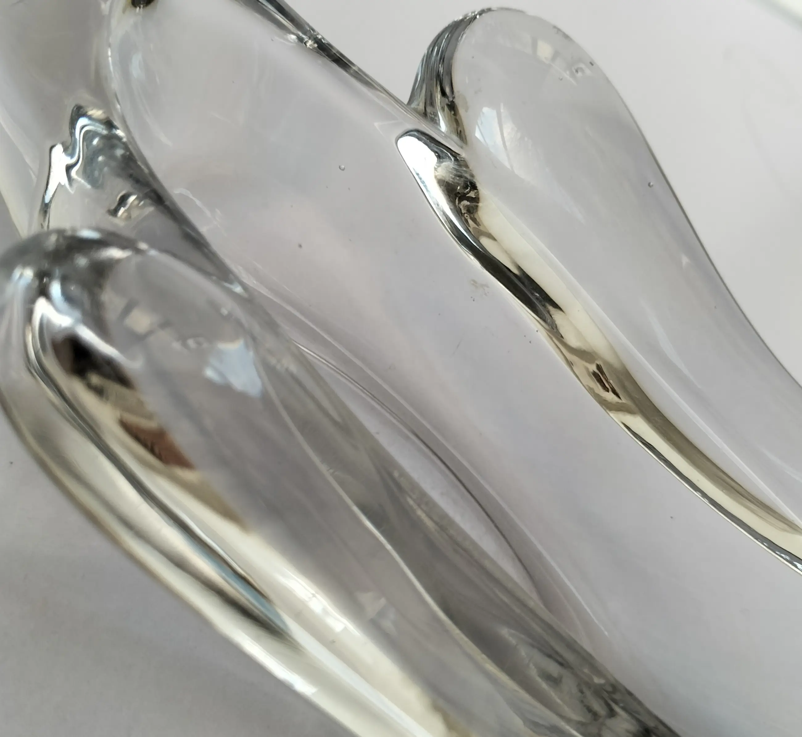 Prachtig glas met ronde, bijna golvende vormen vormen en in zeer goede staat! Geen beschadigingen of chips. Op de schalen zelf geen krassen, maar helaas heeft de onderzijde van de grote vogel wel veel krassen van het staan/schuiven. Toch valt dit niet echt op. De grotere versie van de twee is heeft geen sticker of merk, de kleinere heeft 2 merkstickers.