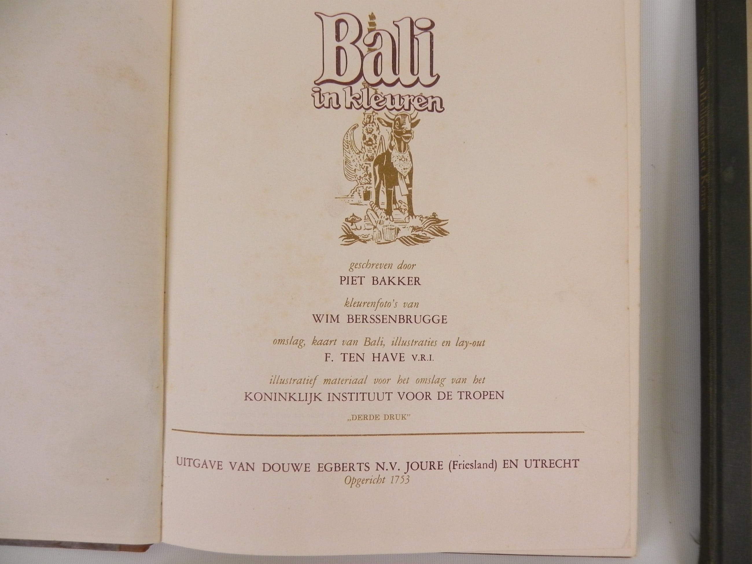 Bijzonderheden: 1951 gebonden linnen band , hardcover , Illustrator Berssenbrugge, Wim, Have, F. ten , Gedrukt verzamelalbum 71 pag. met 65 ingeplakte kleurenfoto's. Werd uitgegeven in omslagdoos met sticker: "Bali in kleuren / Uitgave van Douwe Egberts".