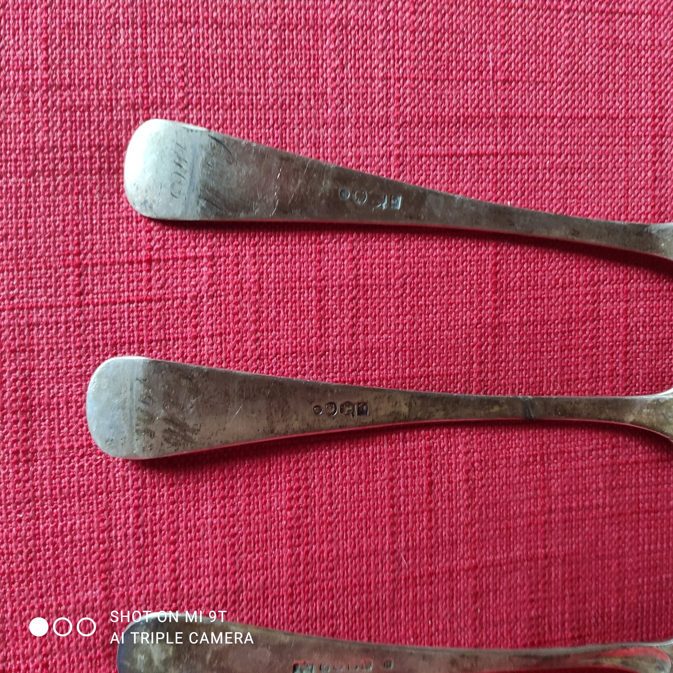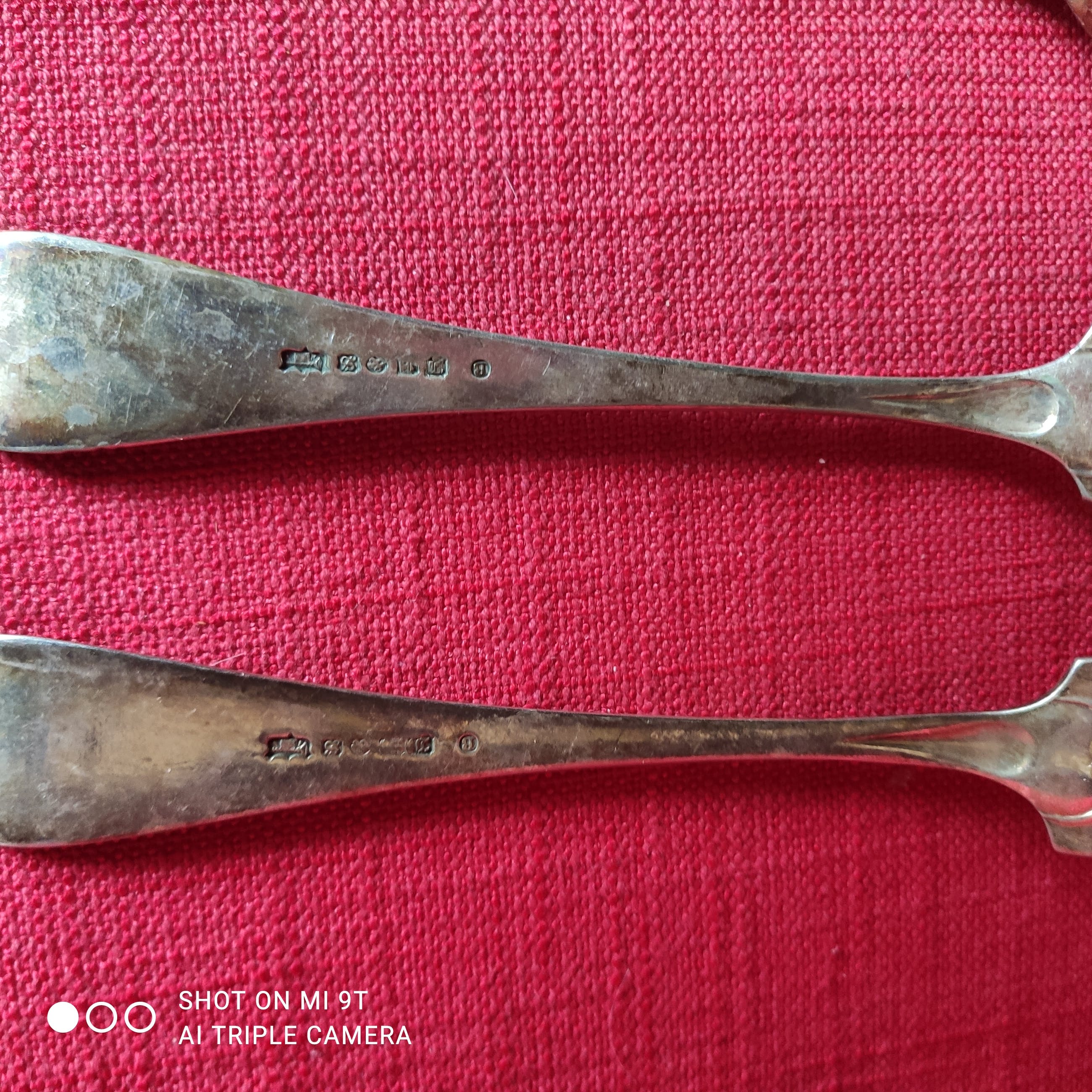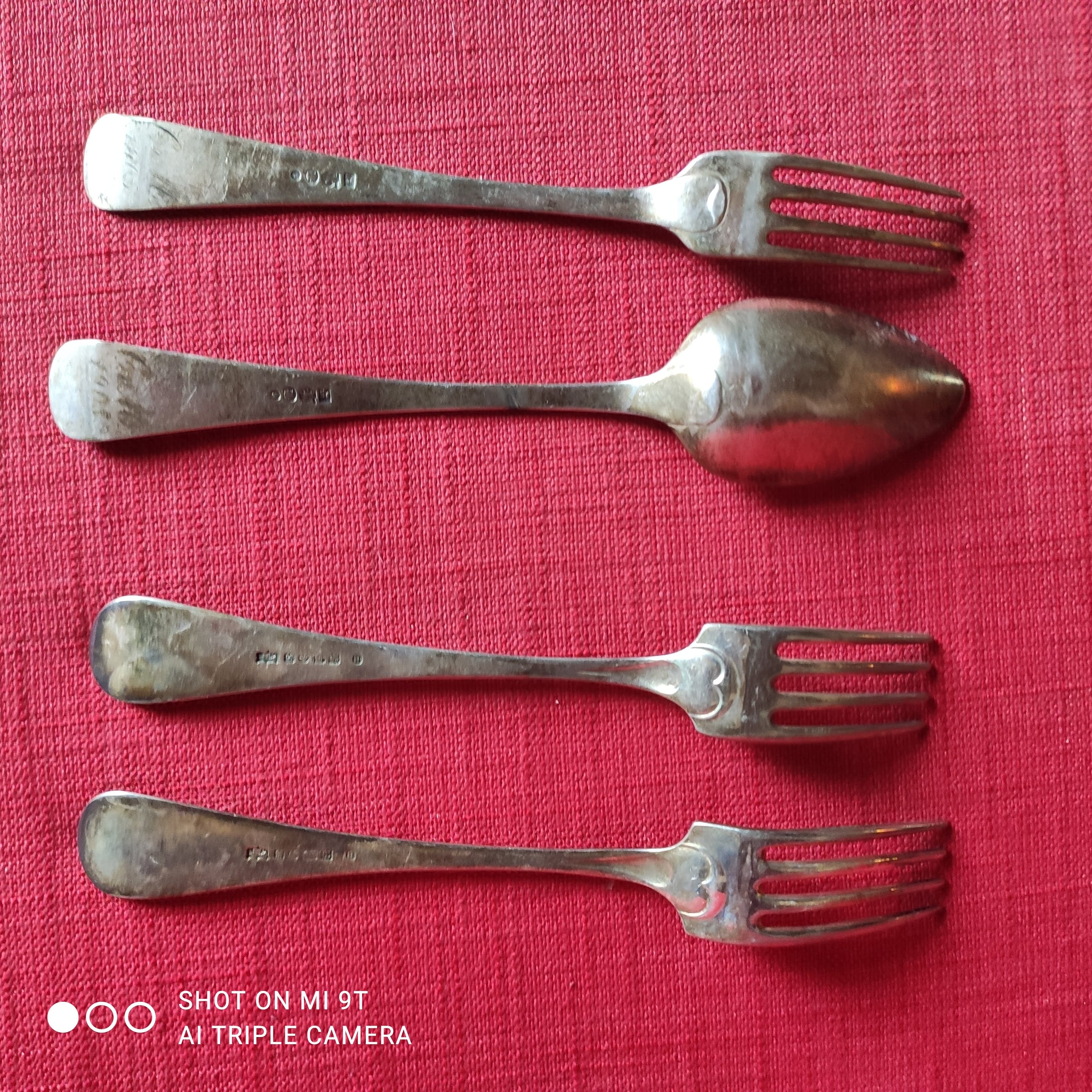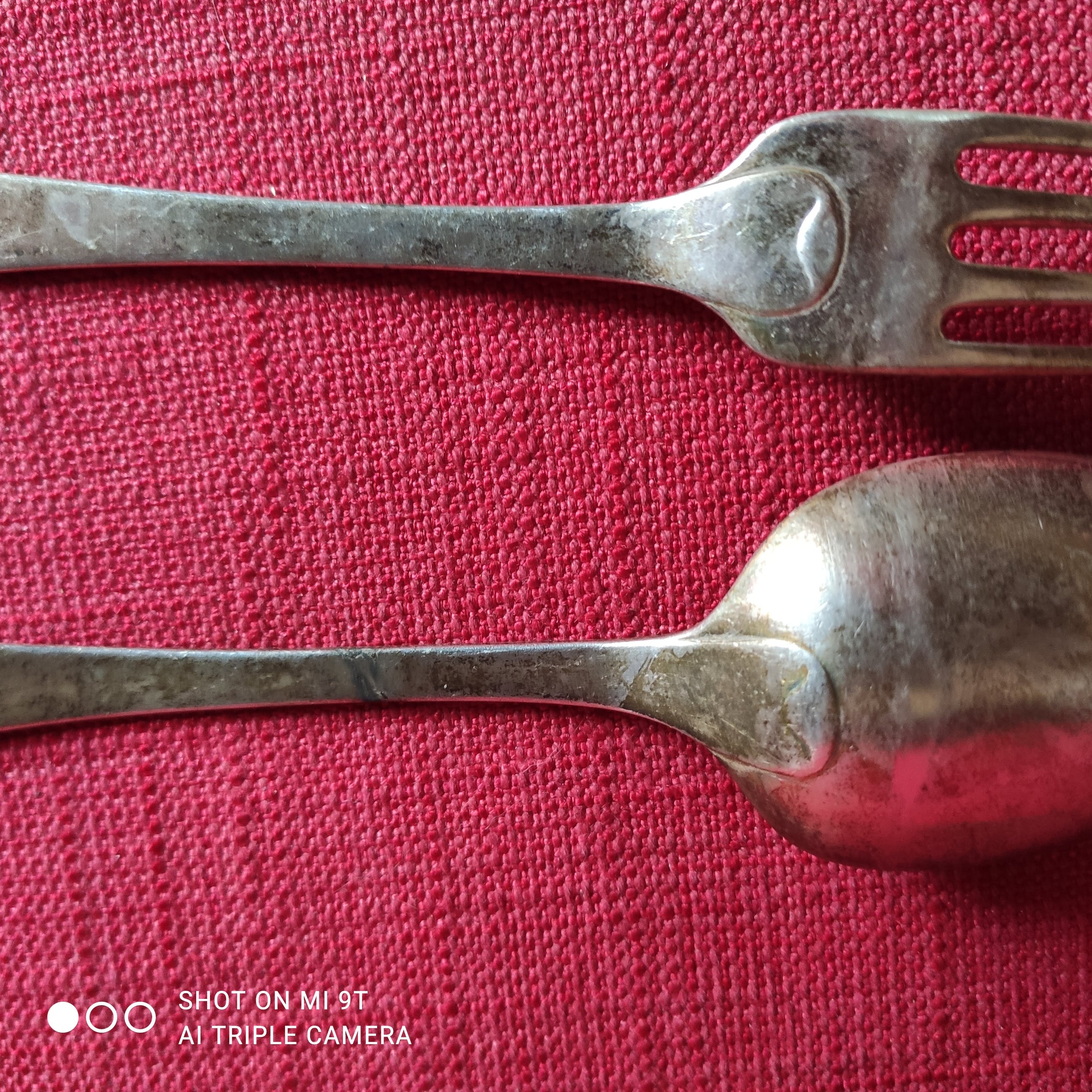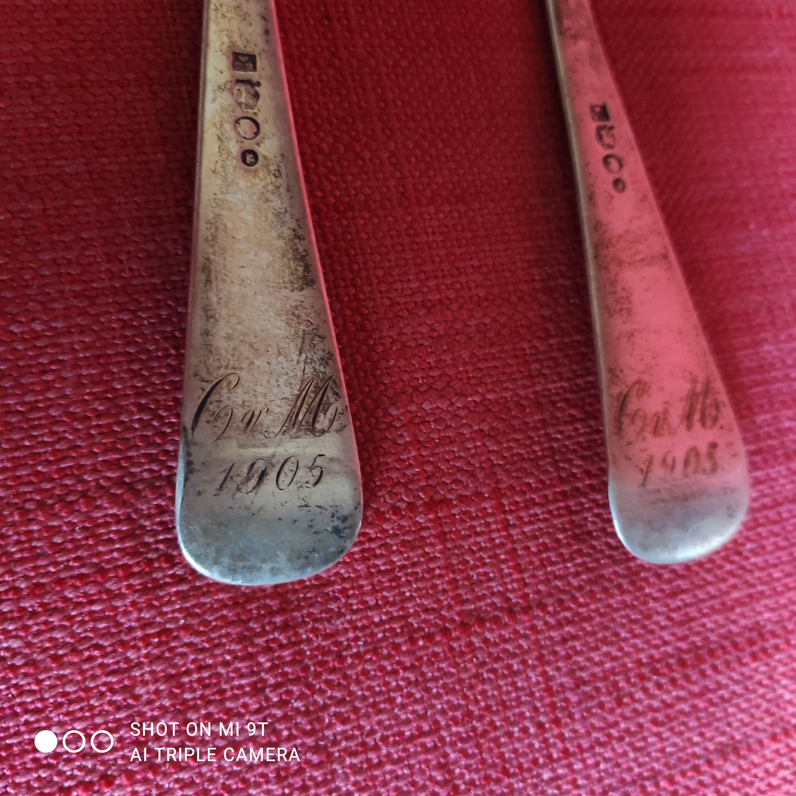 1 paar vork + lepel: resp. 20 en 21 cm lang, beide gegraveerd "C v M 1905"