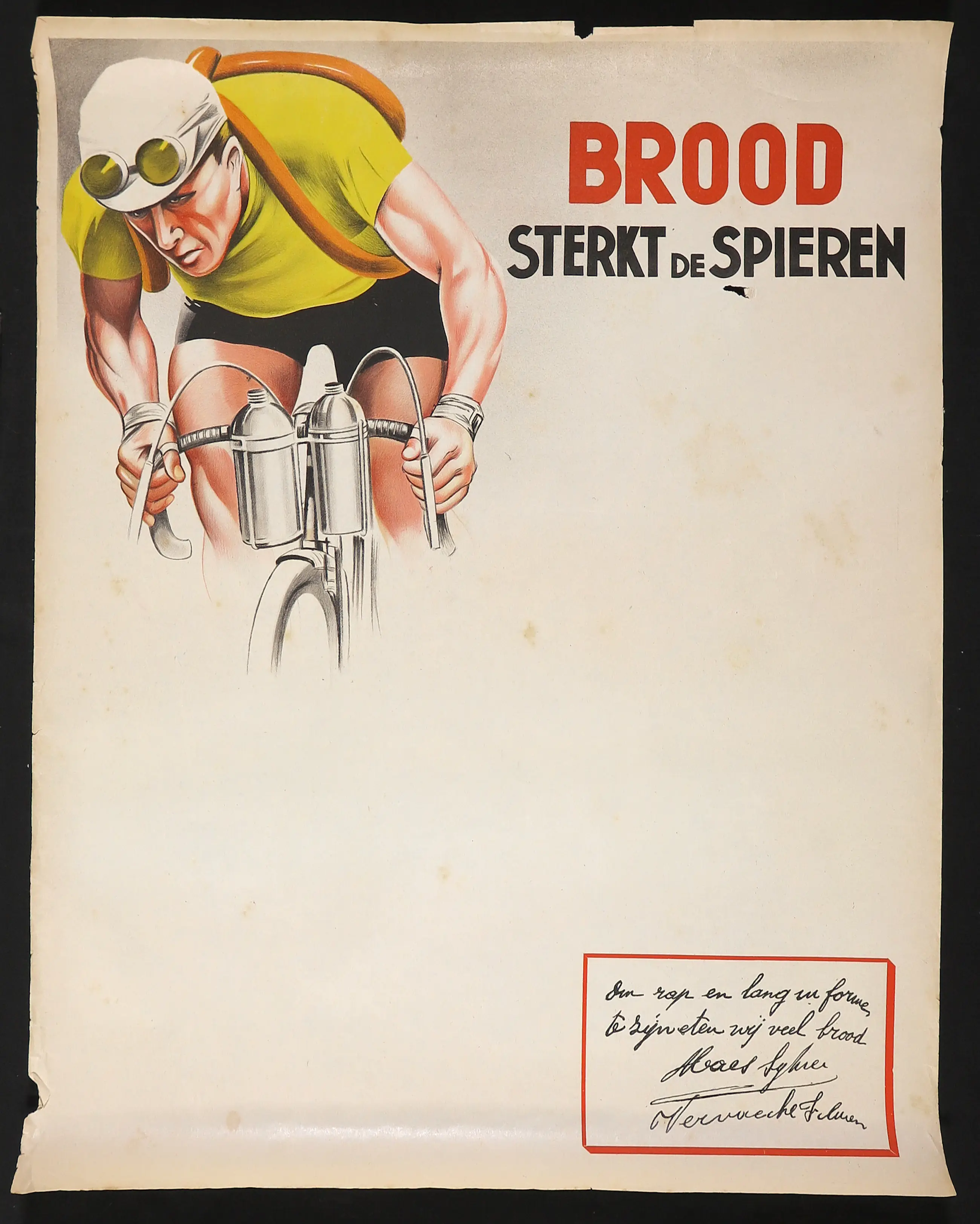 | Redelijk. Veel verzuring en vergeling in het blad. Meerdere kreukeltjes/beschadigingen langs de randen. Blad heeft opgerold gezeten en krult een beetje terug. Meerdere scheurtjes in/happen uit de randen. En een gaatje in het blad onder het woord 'Spieren'. | |||||||||||