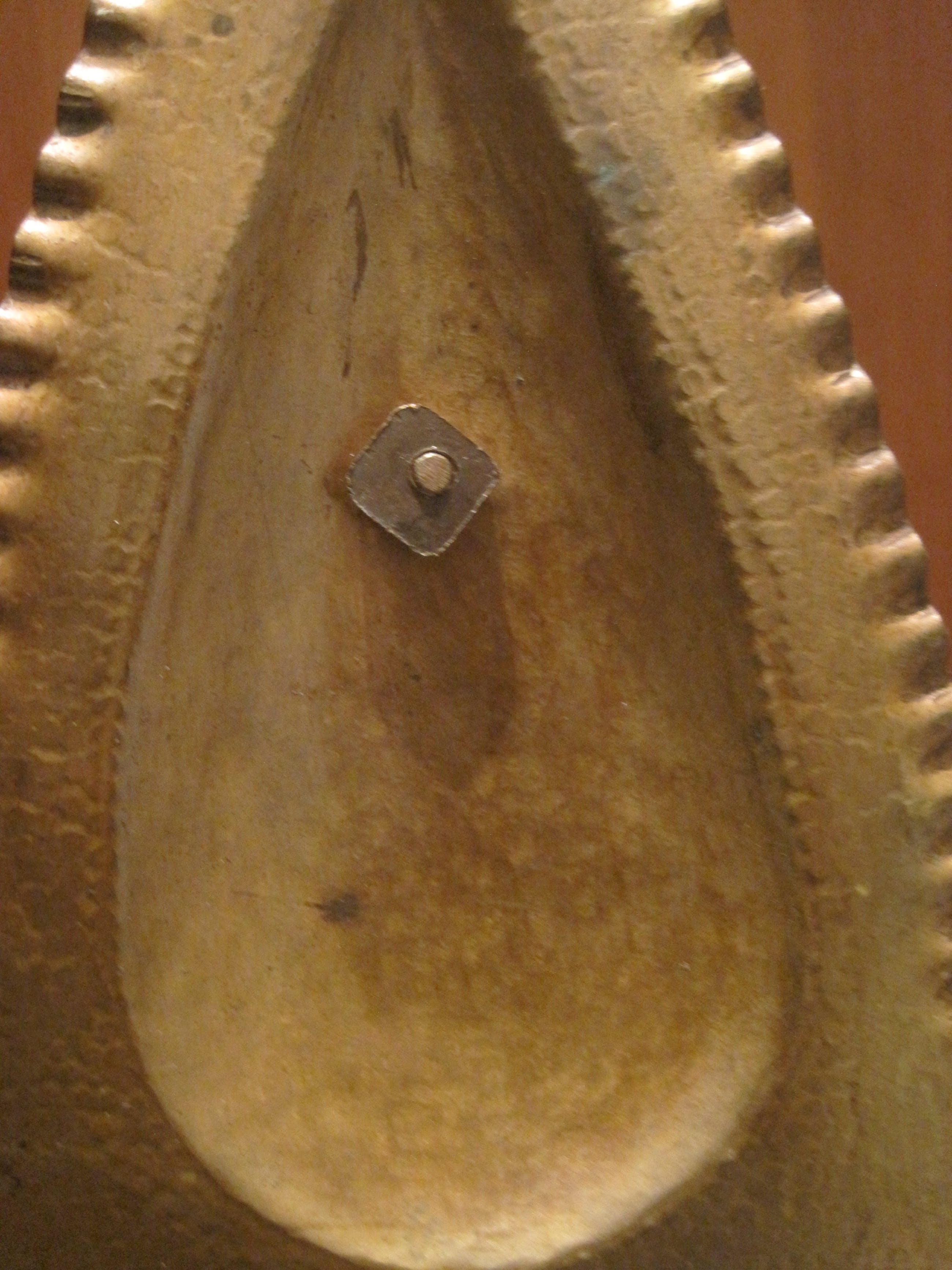 Een koperen kandelaar die geheel voldoet aan de kenmerken van de Amsterdamse School: De Amsterdamse School kenmerkt zich door gebruik van expressieve en fantastische vormen, verwant aan het expressionisme. Deze kandelaar heeft talloze bijzondere kenmerken in zijn constructie: het massieve gehamerde kruisvormige middenstuk, de opengewerkte en bewerkte achterwand, de handgemaakte moeren aan de achterkant. enz. Het is mogelijk dat er van het voorste plateau iets ontbreekt, mogelijk een bakje oid. Het is mij ook niet duidelijk of het hier een religieus item betreft. Graag ontvang ik daarover inlichtingen.
