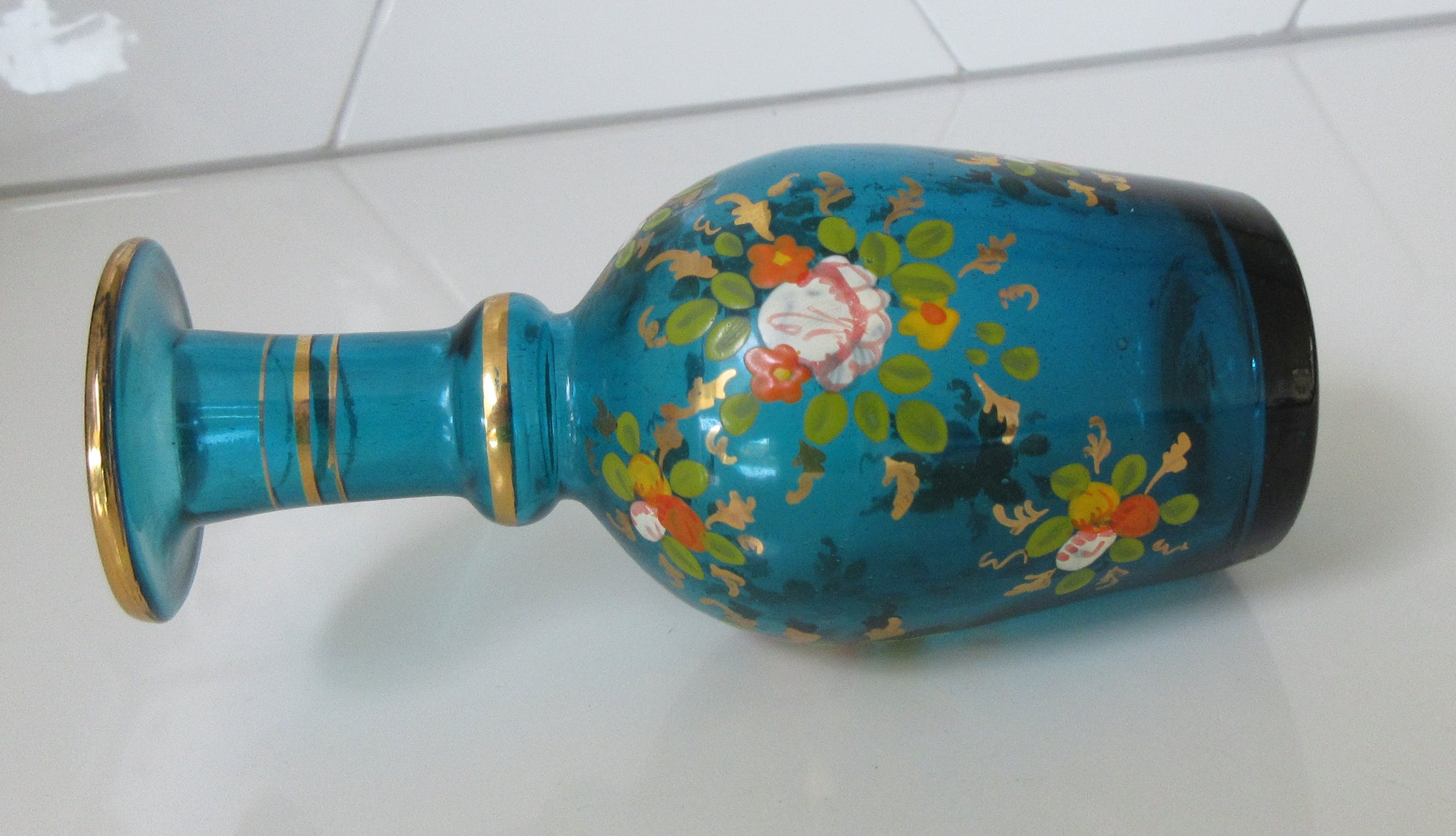 blauw glazen vaasje met emaille decor. 15,5 cm hoog en 6,5 cm diameter.