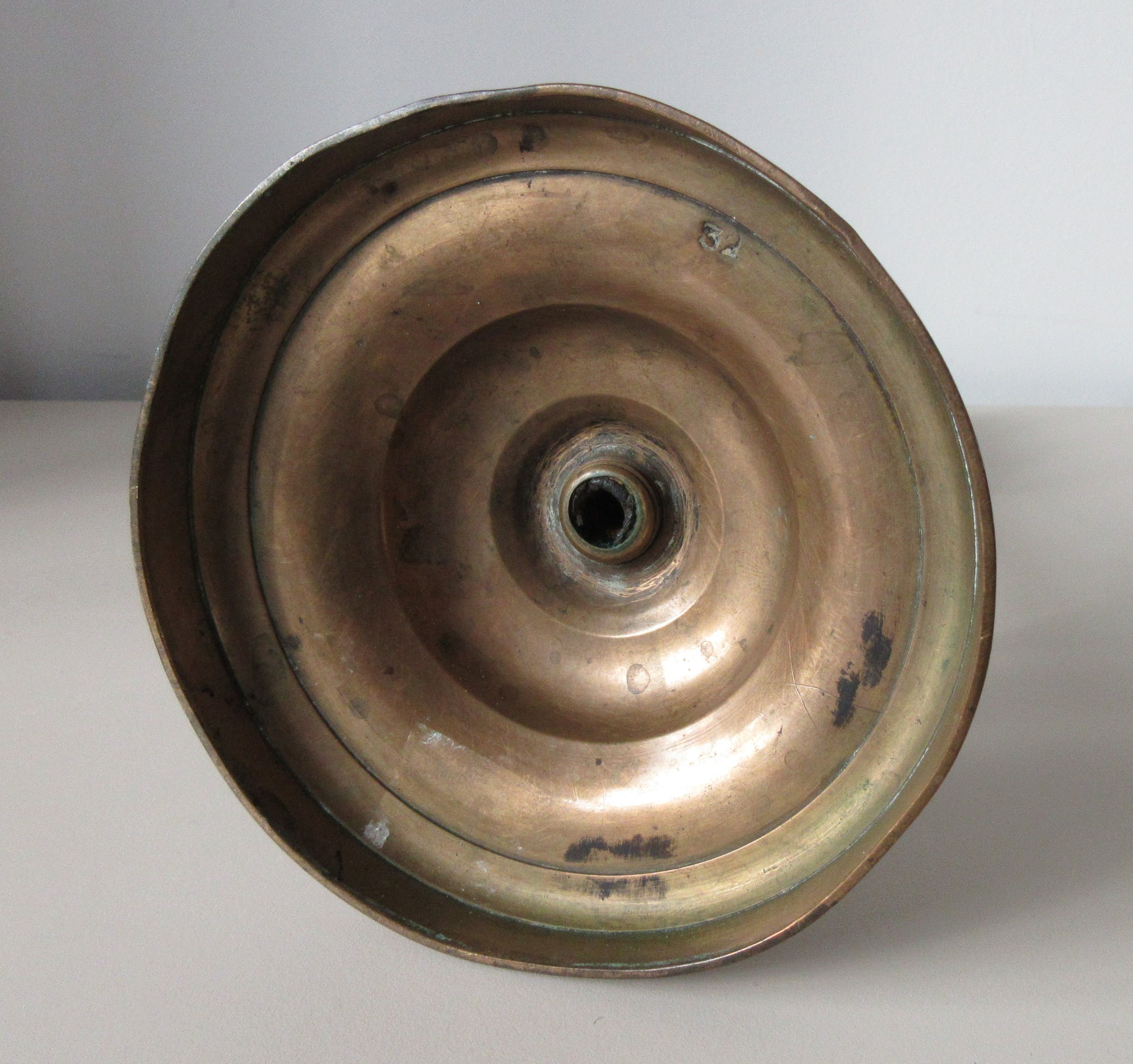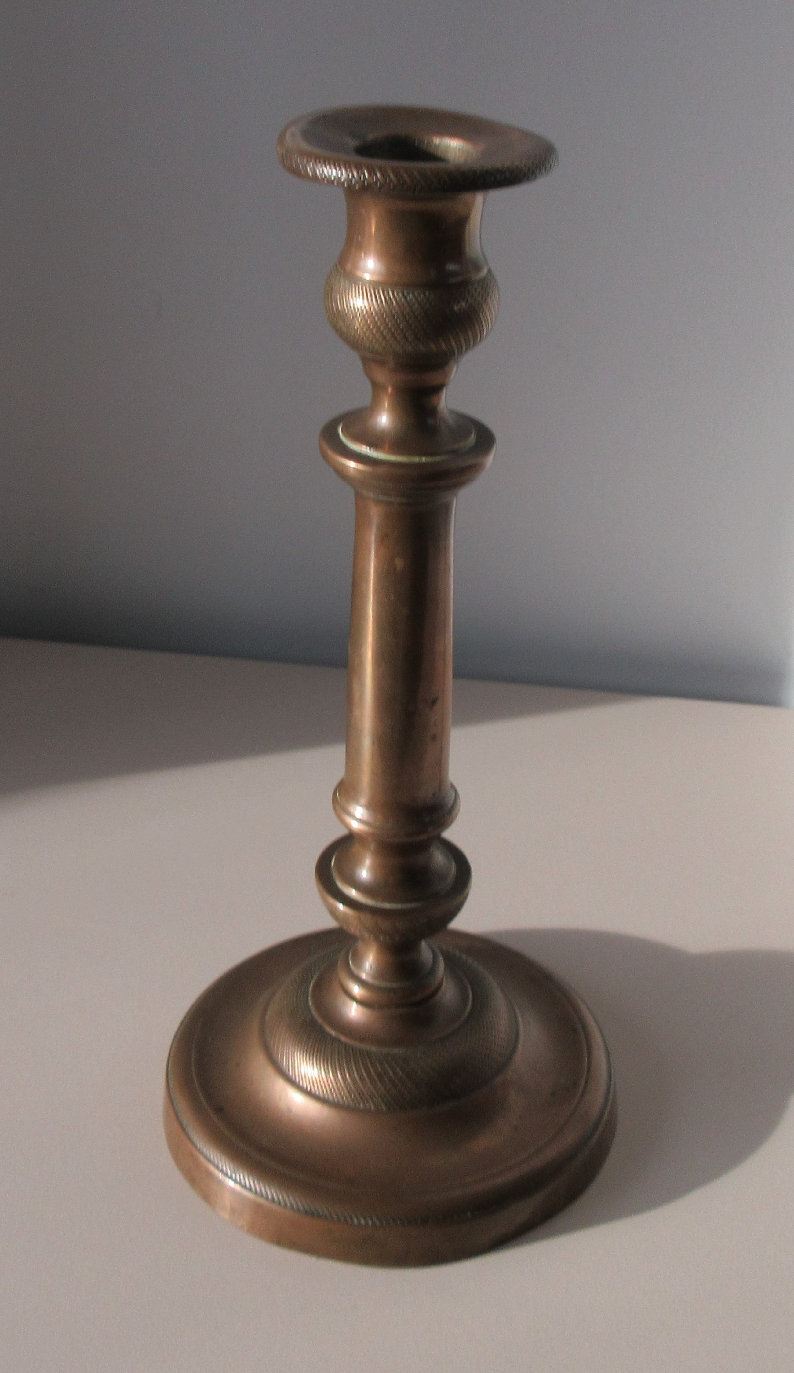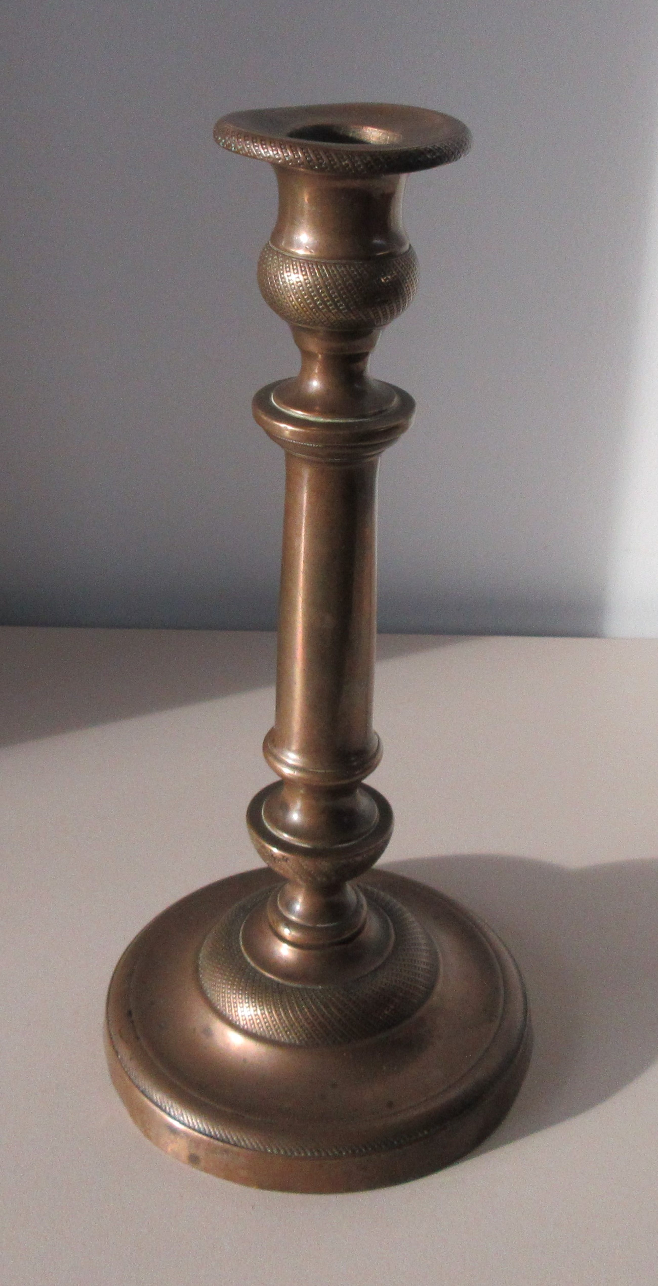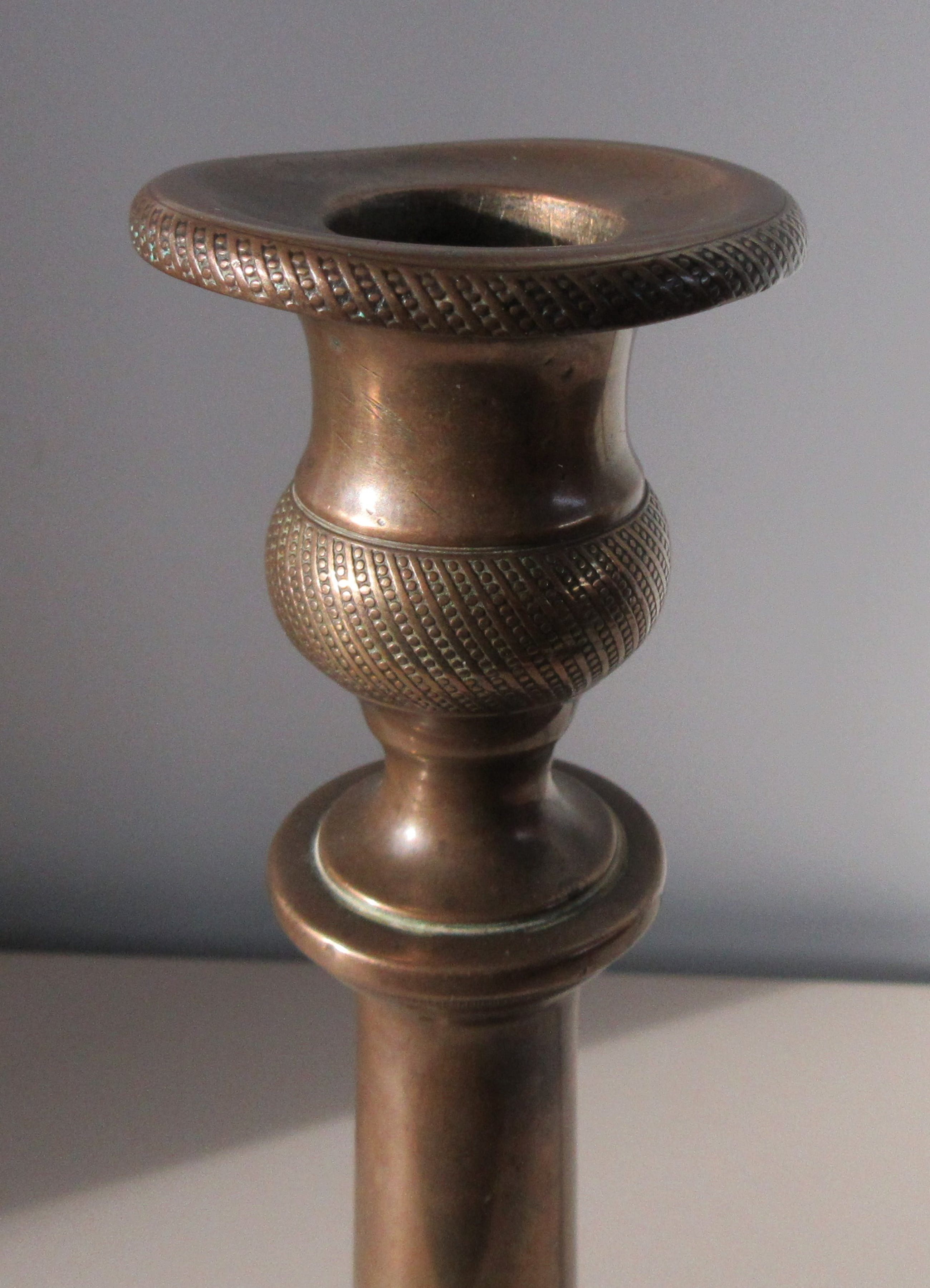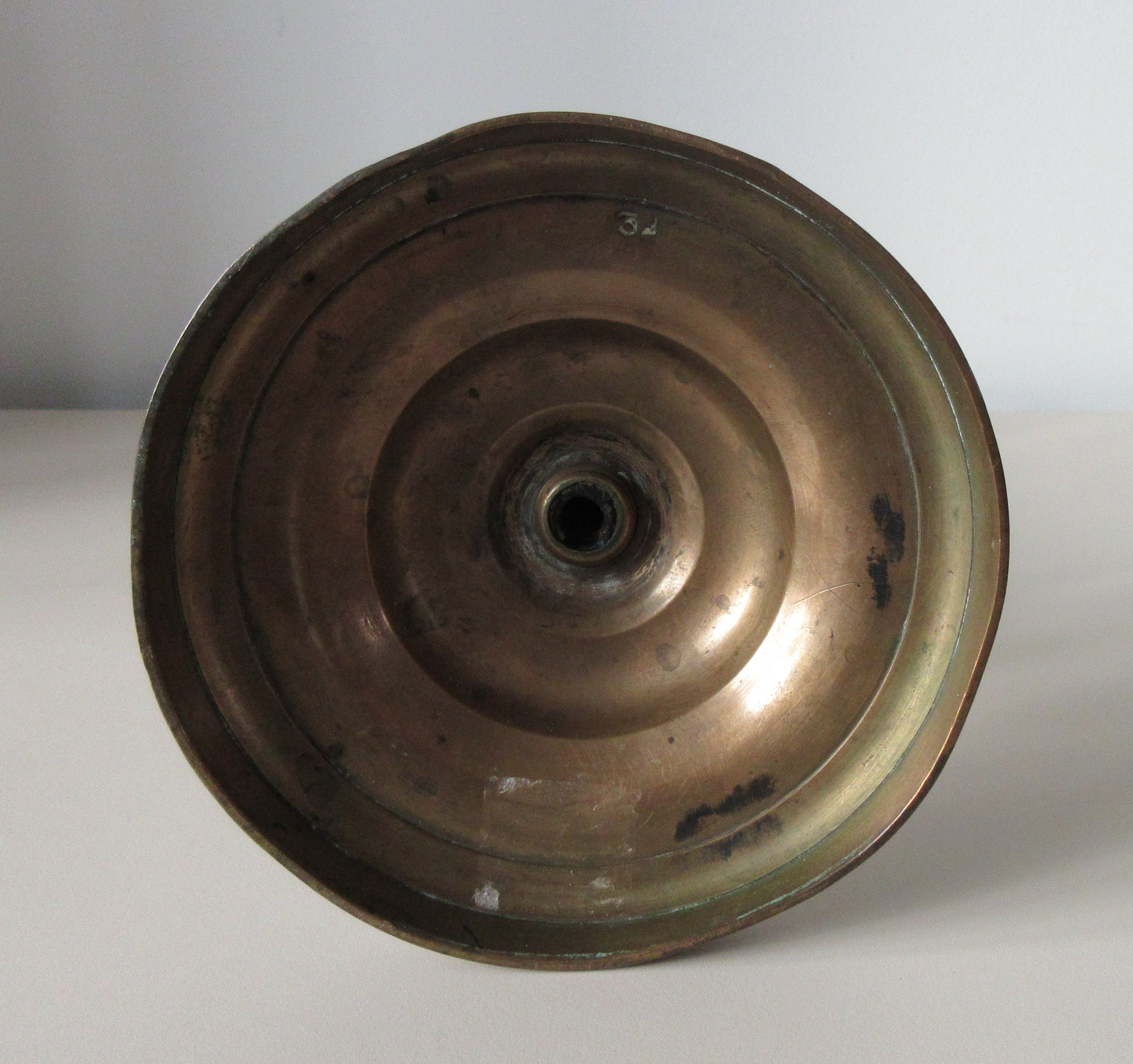 Antieke 19e eeuwse messing kandelaar met mooie getordeerde decoratie. Niet gemerkt, wel genummerd 32.