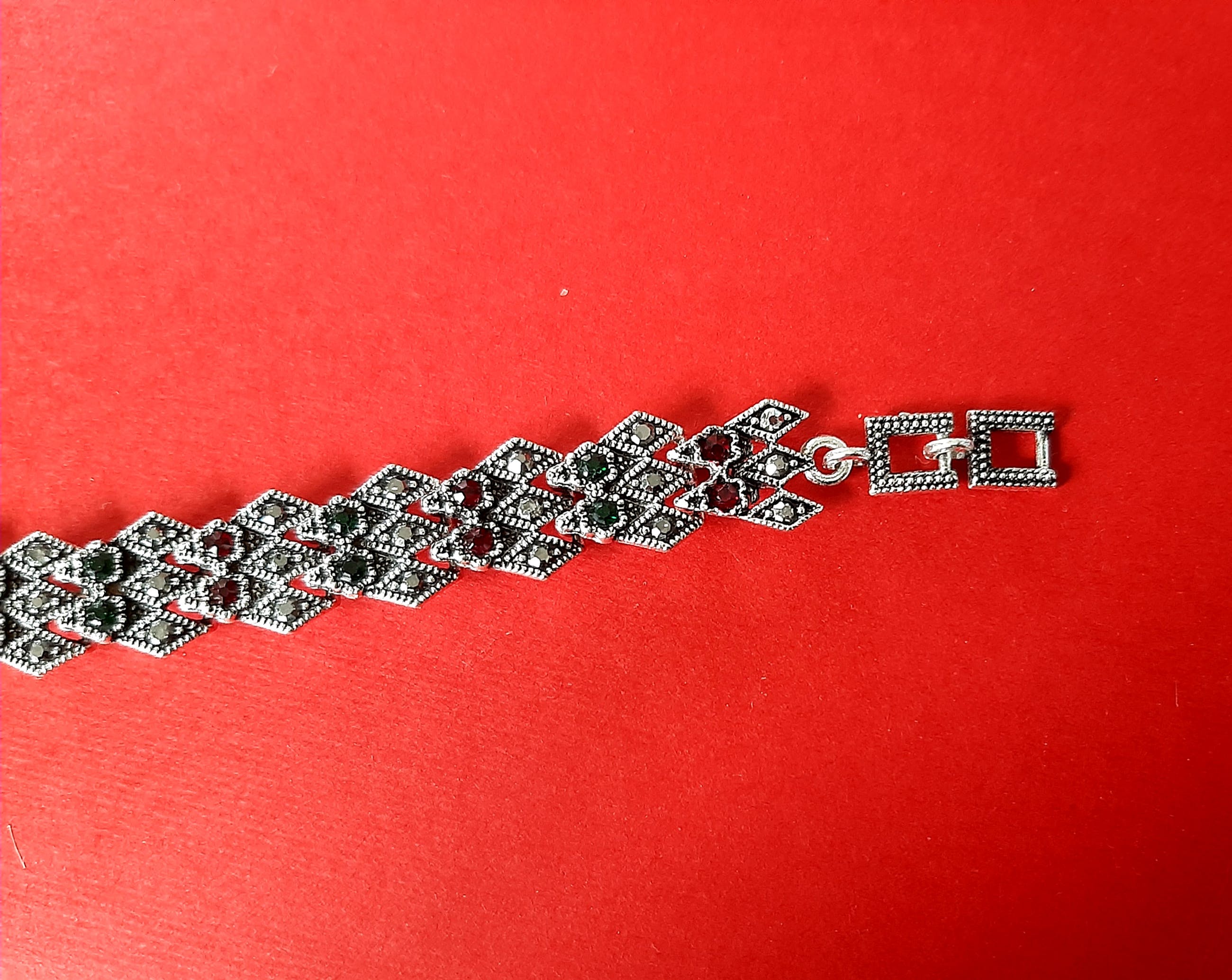 Robijnen, smaragden, diamanten - imitatie.Een kopie van een soortgelijke kostbare armband ter waarde van 60 duizend euro Prachtig armband 23 cm lang, 1 cm breed. De schakels van de armband lijken op de kop van een uil - een symbool van wijsheid en een lang leven
