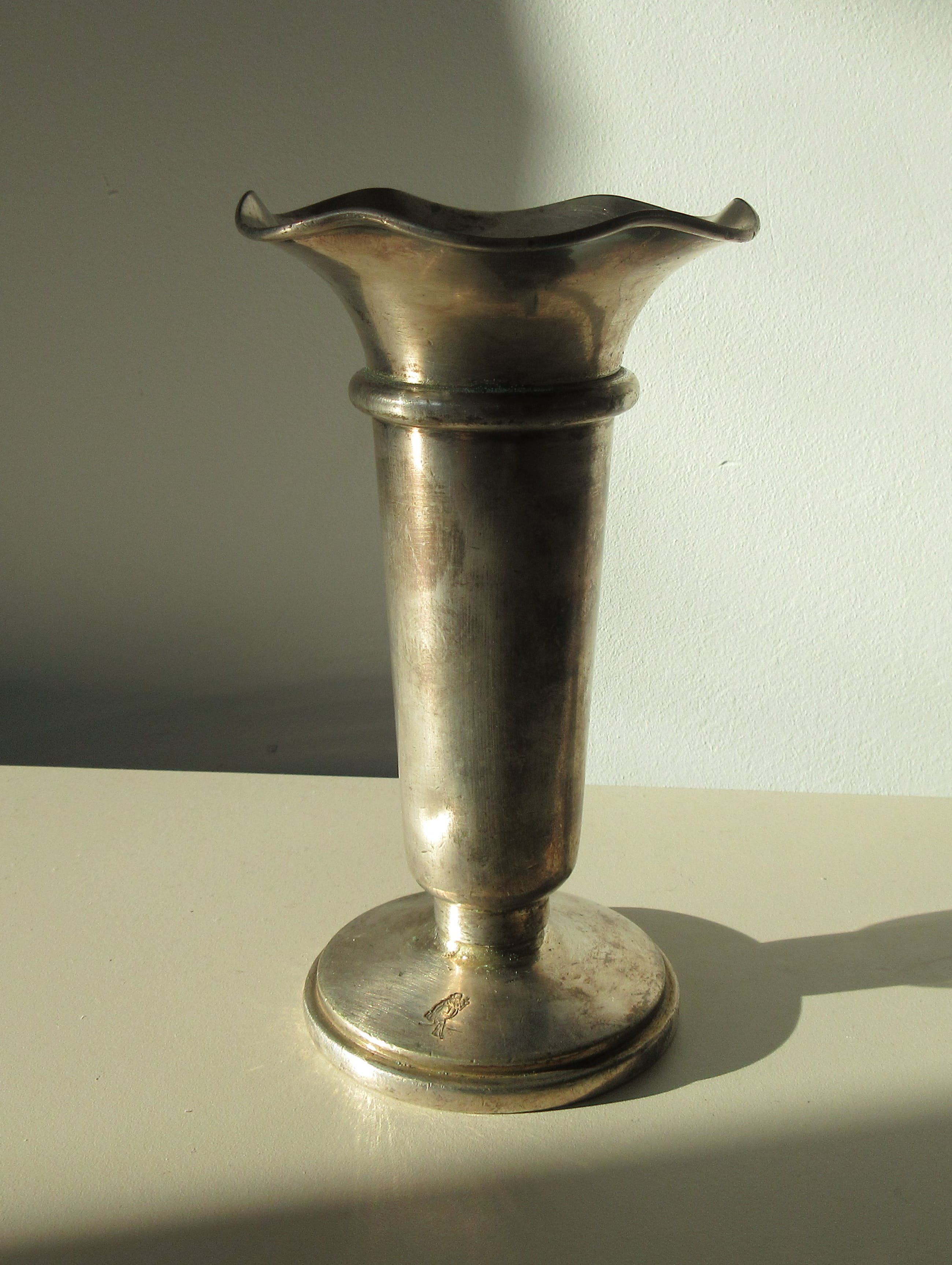 Art deco verzilverd Anjervaasje - Hollandia Plate Hilversum. in goede gebruikte conditie, gemerkt aan de achterzijde en op de voet aan de voorkant staat een figuur ingedrukt.