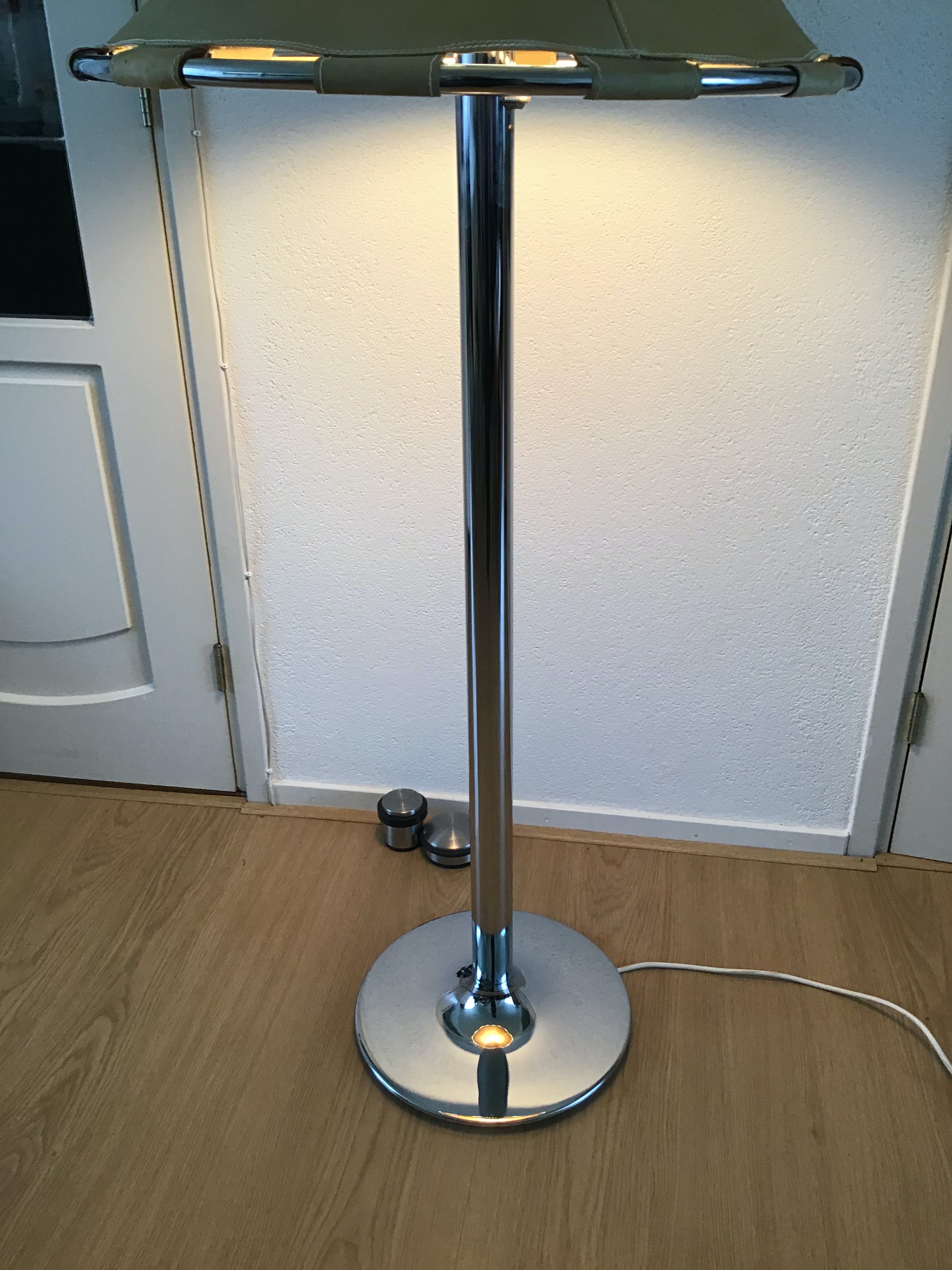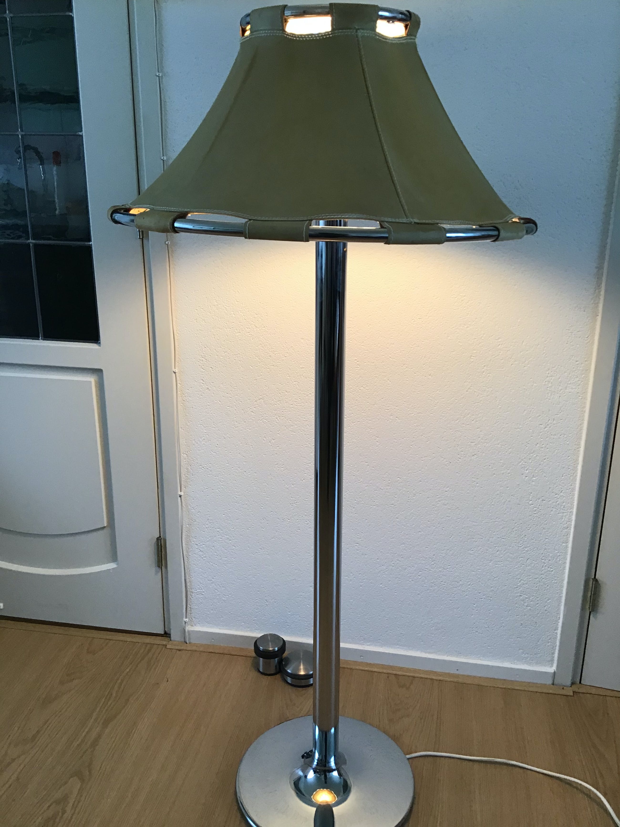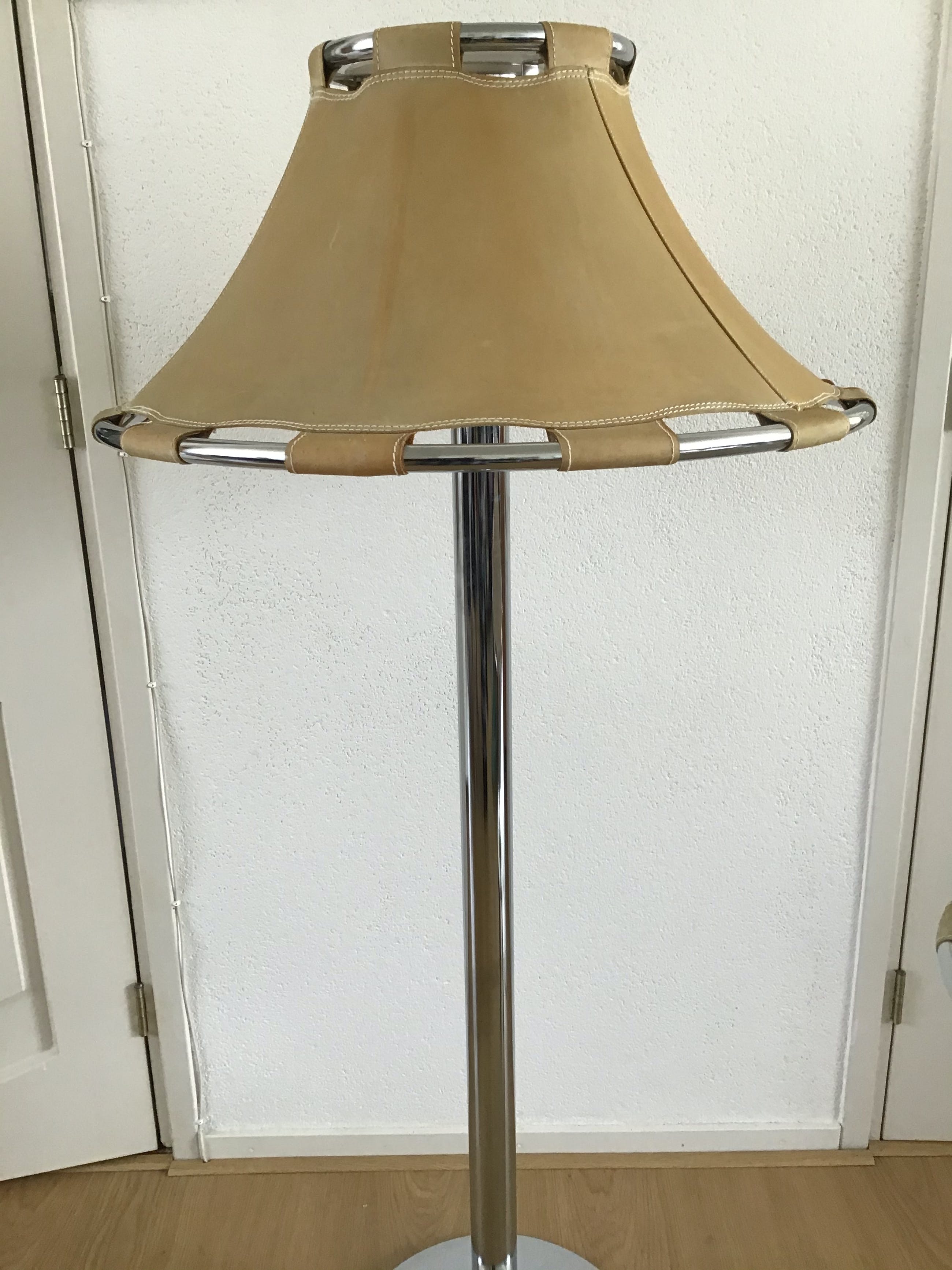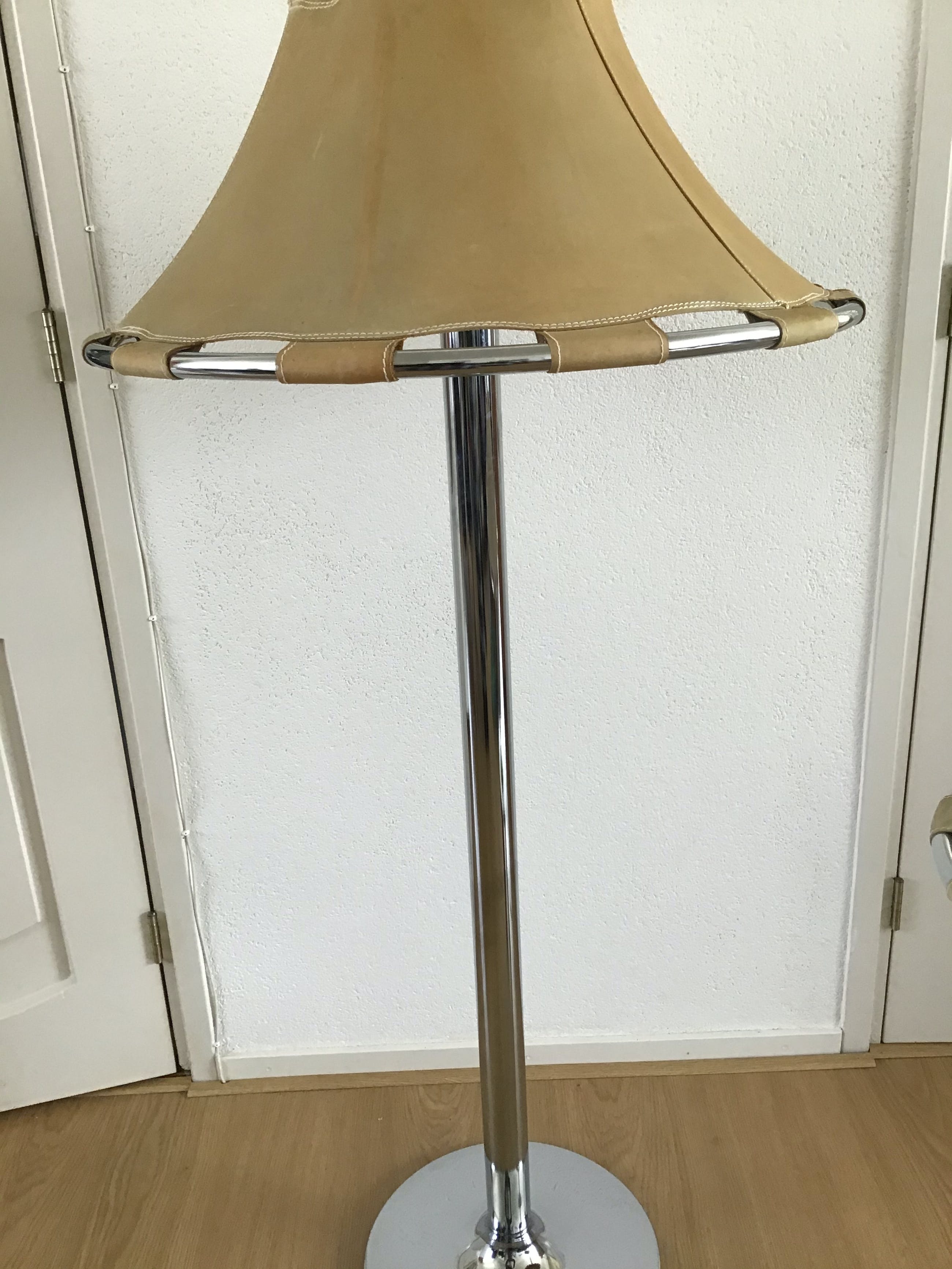 Mooie,design vloerlamp met de orgineel kalfslerenkap en verchroomde voet De lamp is in zeer goede staat alleen de kap is verkleurd. Chroom en kap zijn onbeschadigd. Met orginele gloeilamp met 3 sterktes ,60/100/160 W