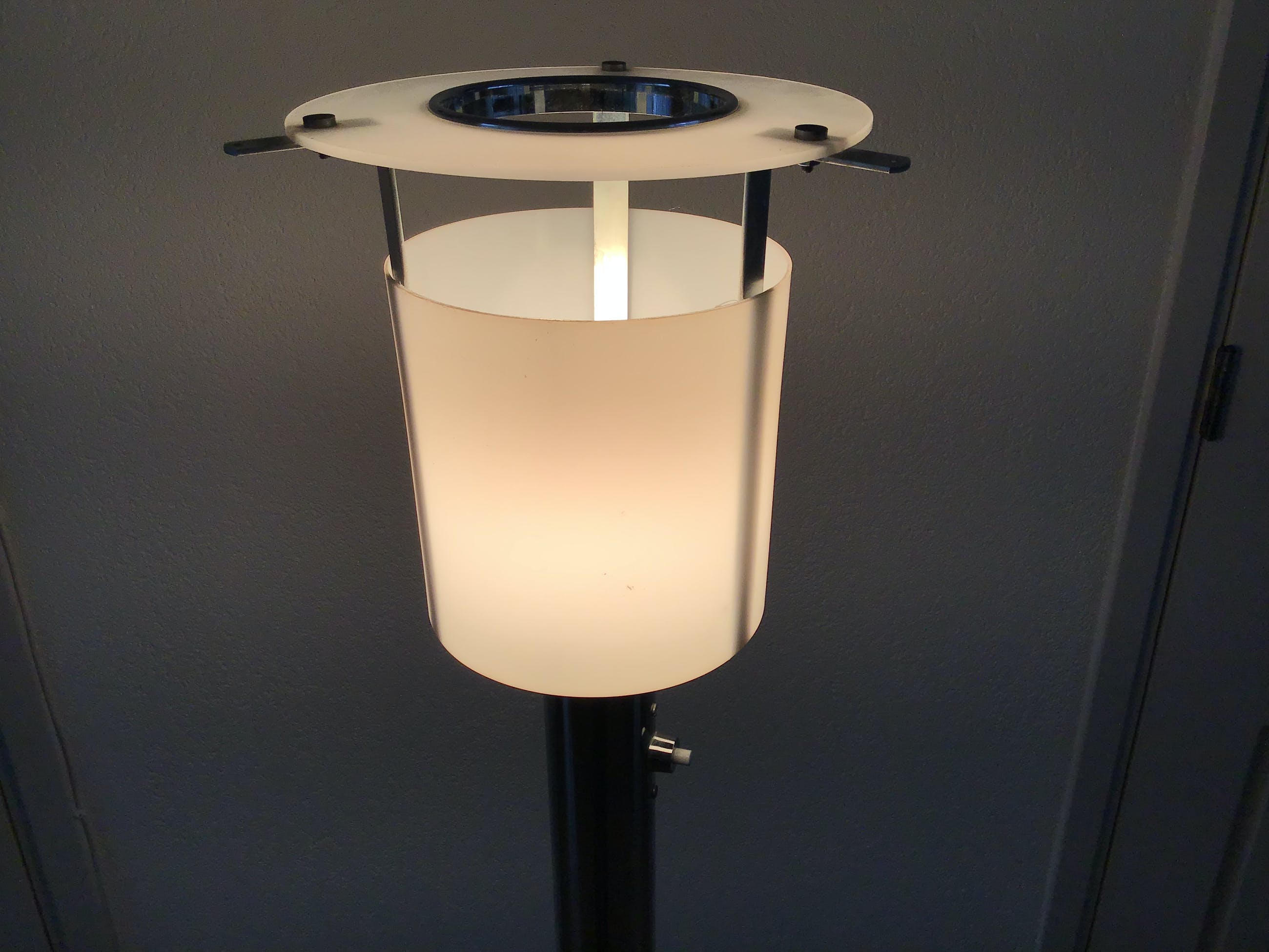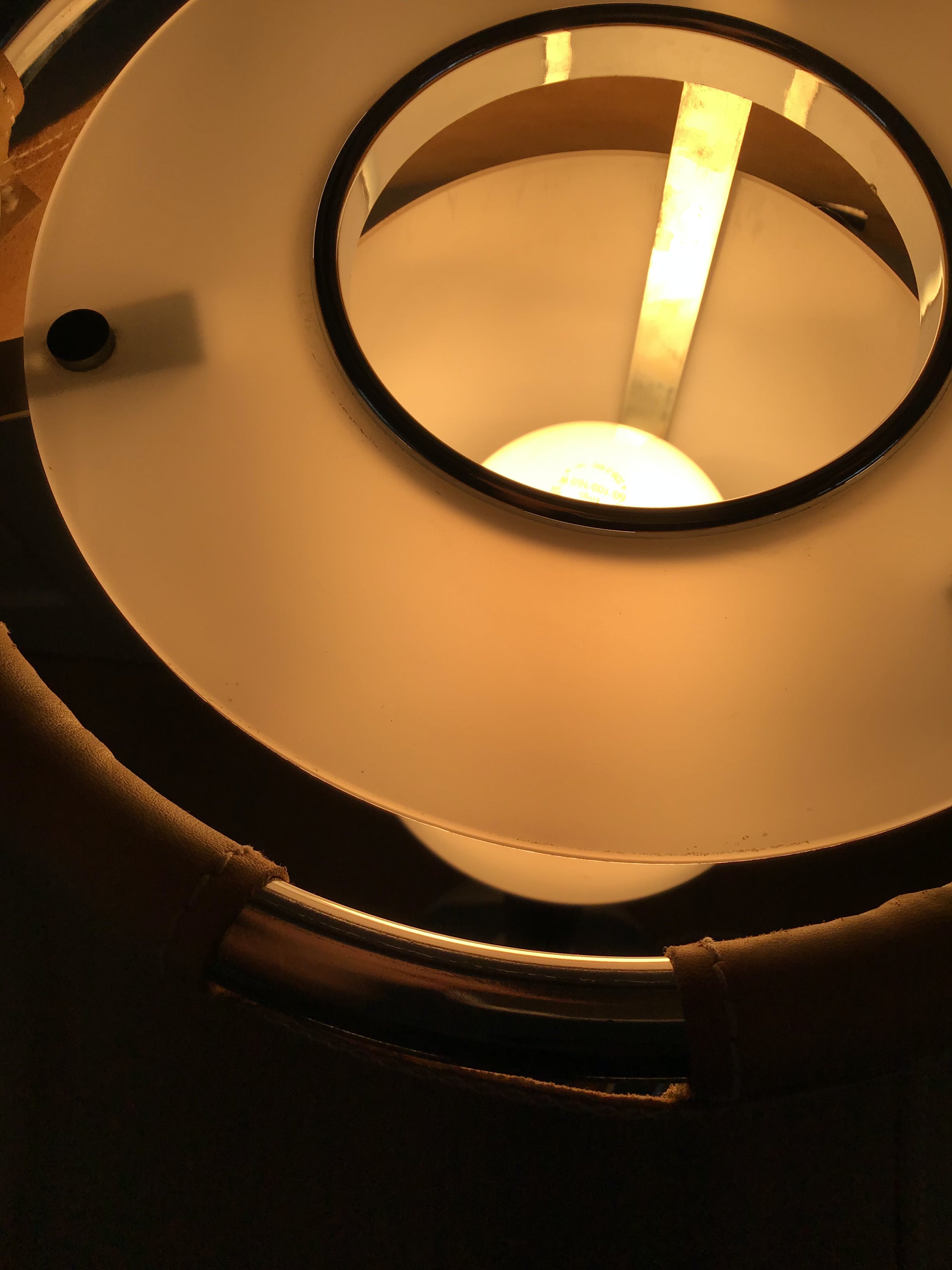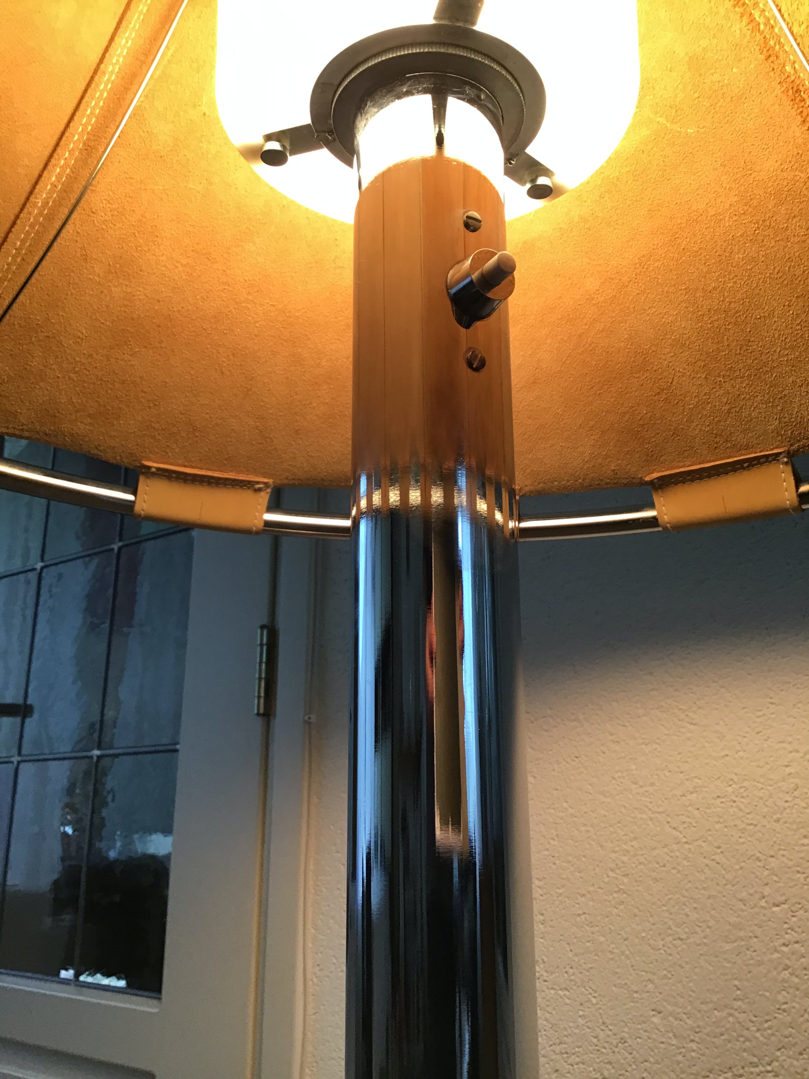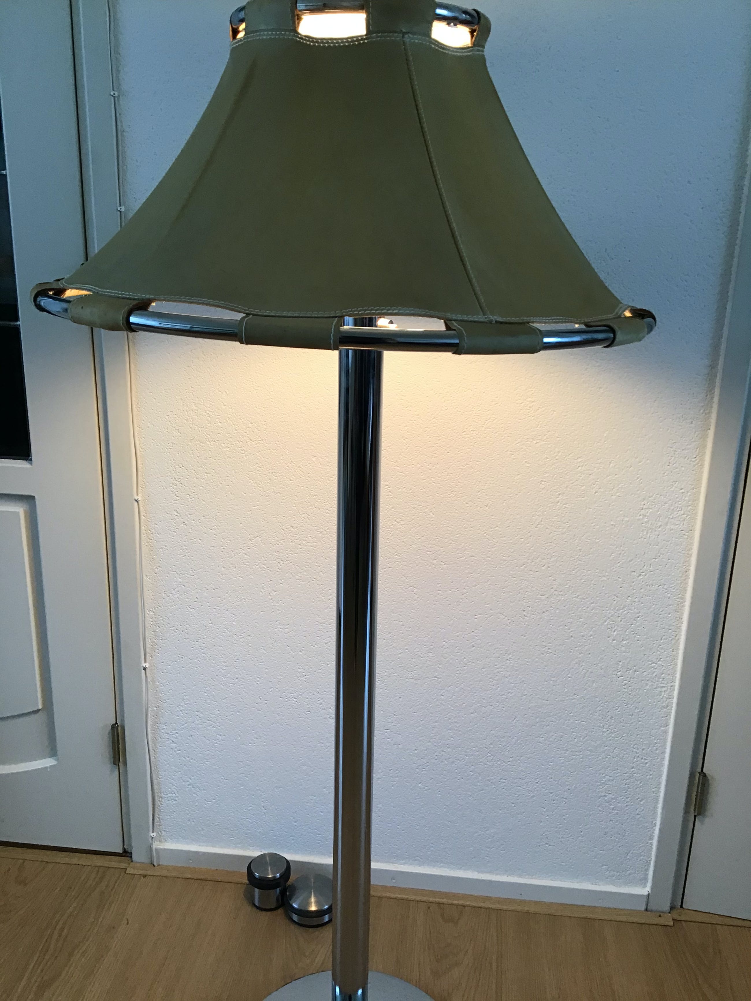 Mooie,design vloerlamp met de orgineel kalfslerenkap en verchroomde voet De lamp is in zeer goede staat alleen de kap is verkleurd. Chroom en kap zijn onbeschadigd. Met orginele gloeilamp met 3 sterktes ,60/100/160 W