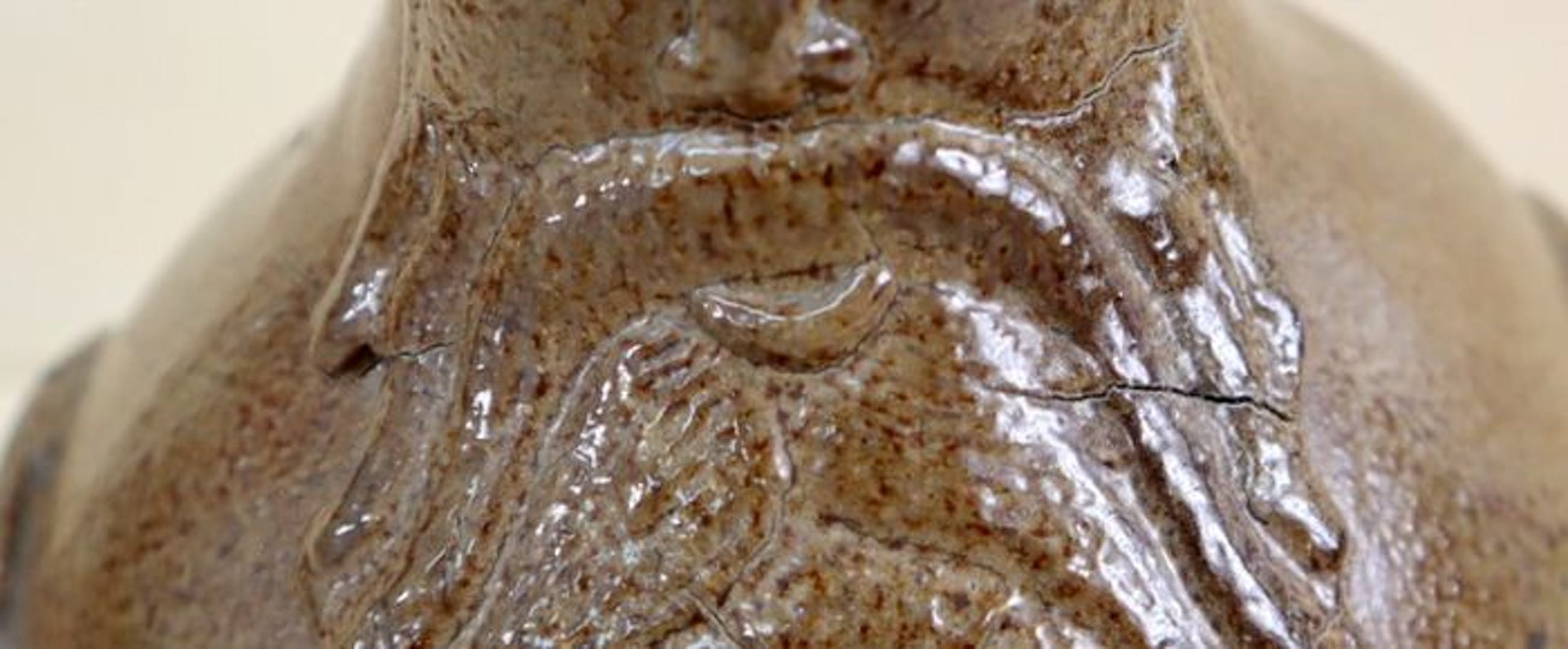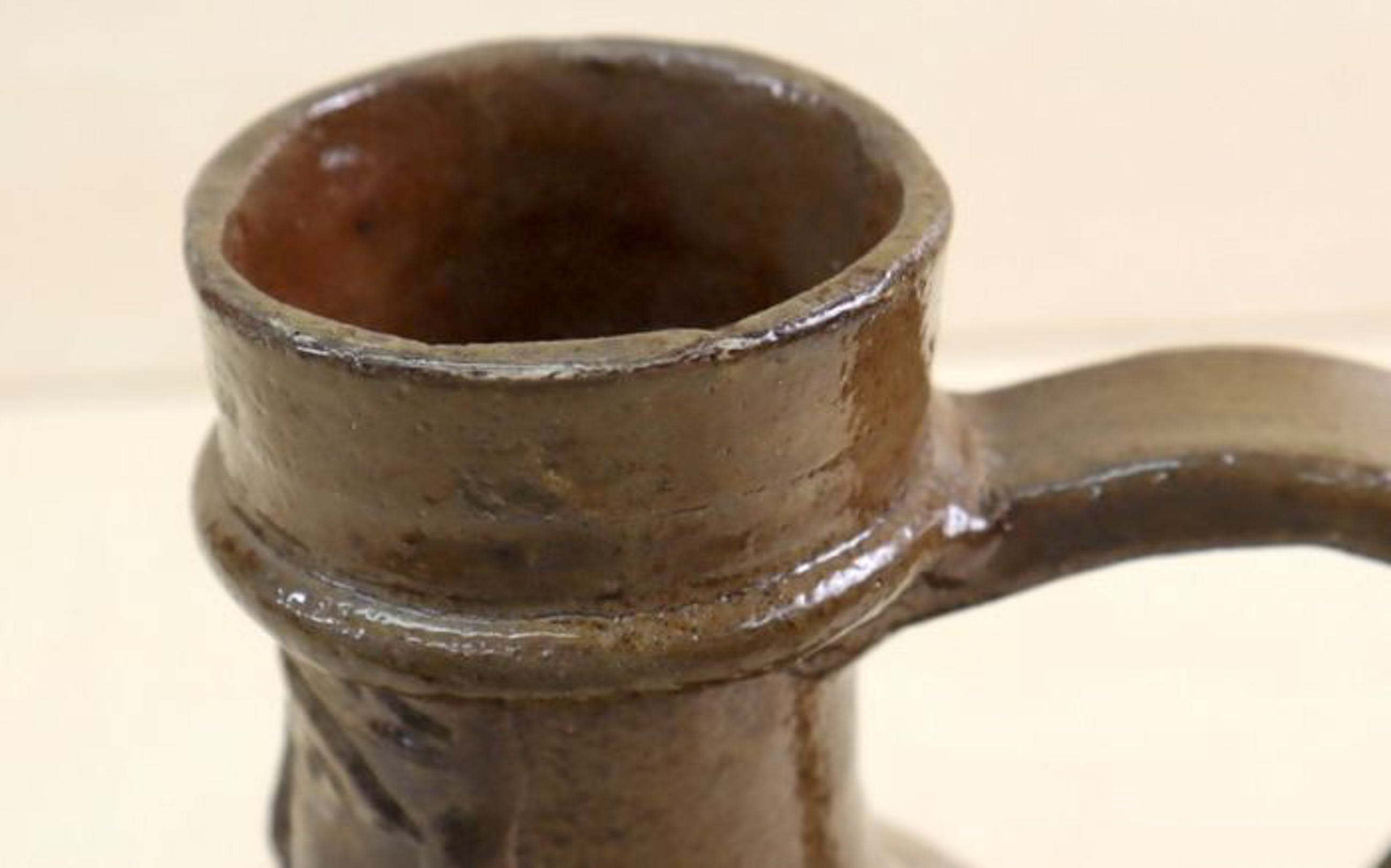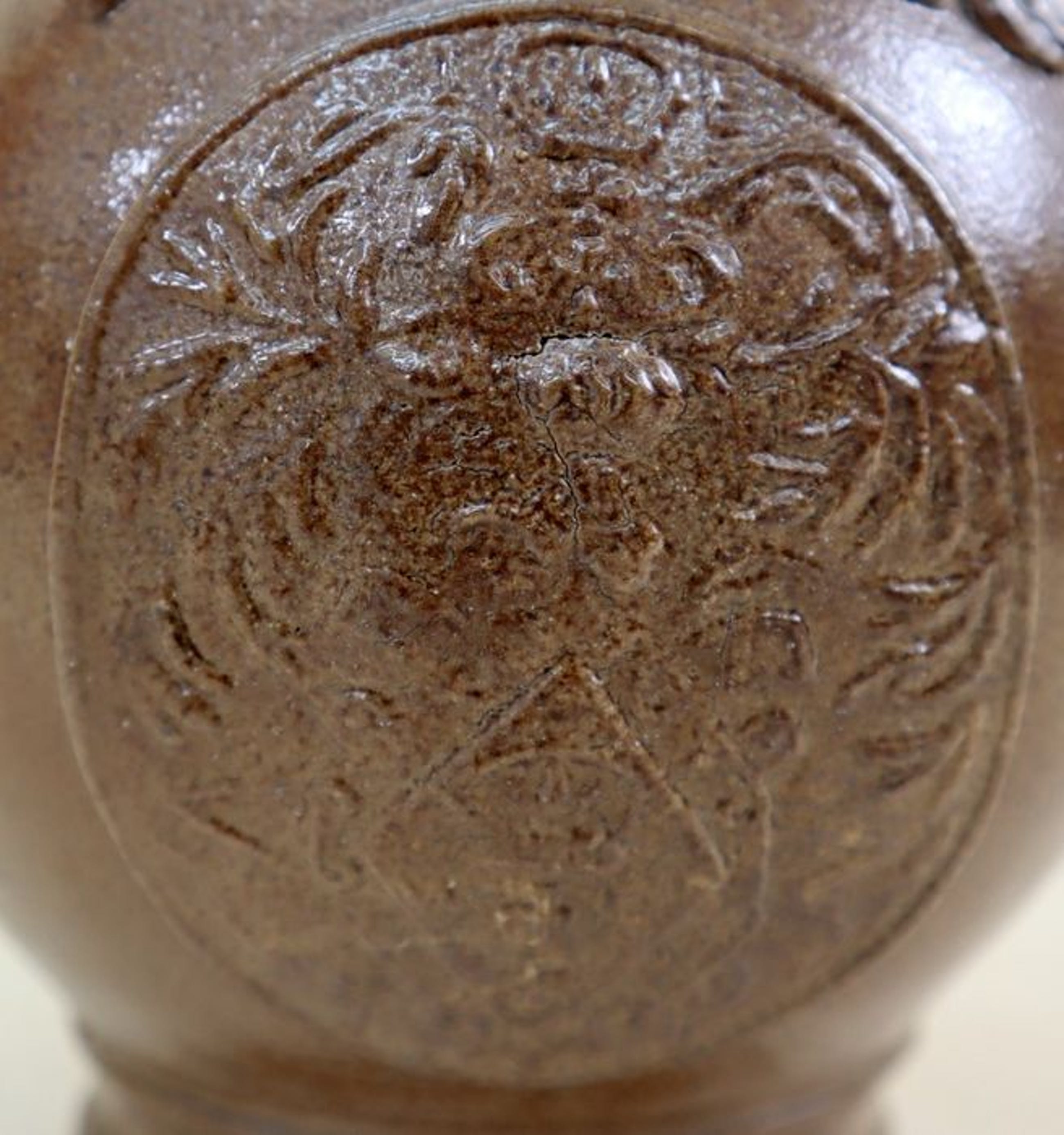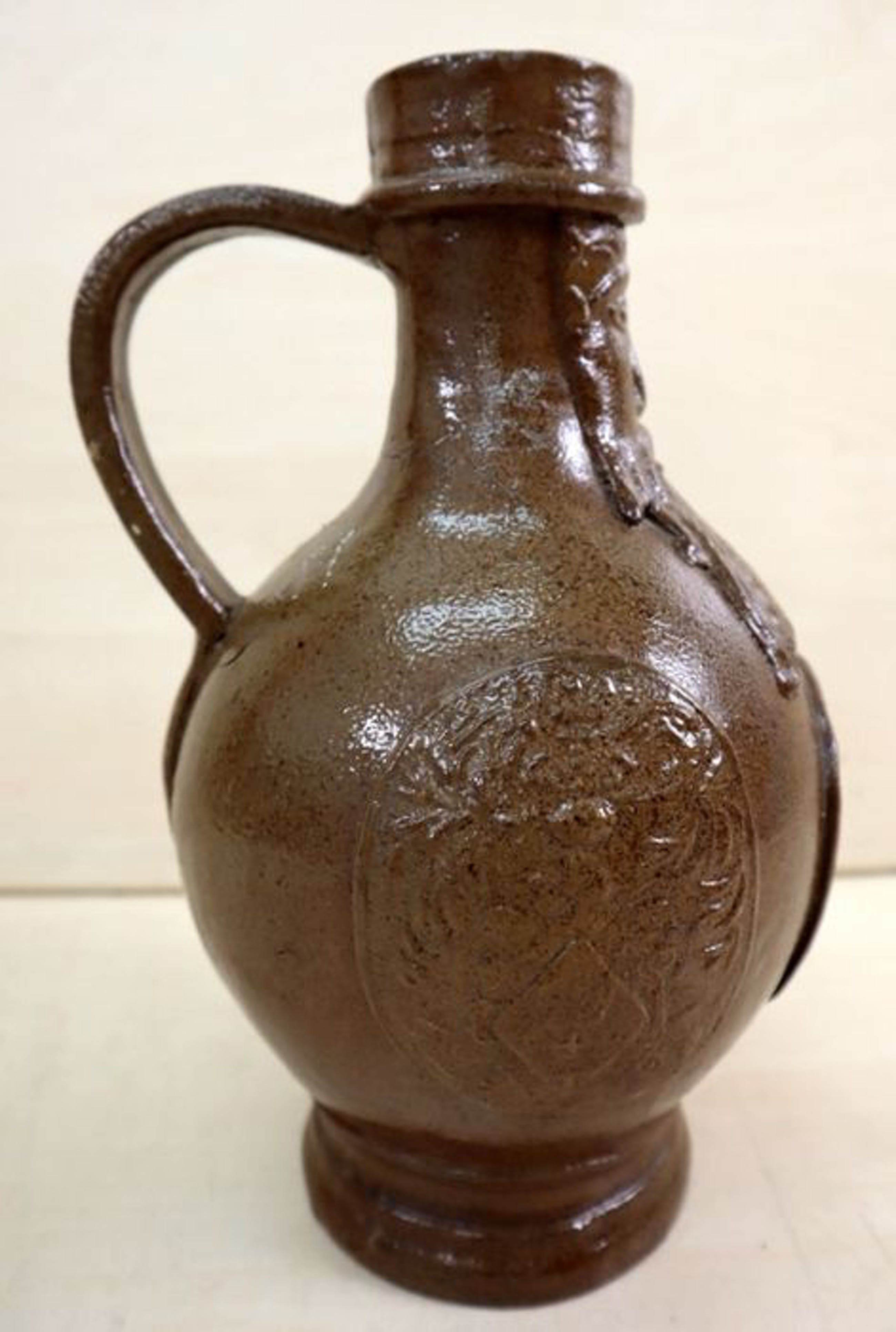 De baardmankruik met buikstempelS, is gemaakt in het Rijnland-gebied rond Keulen van niet water doorlatend gesinterd aardewerk zg. 'steengoed'. De buitenkant van de kruik is voorzien van zoutglazuur. De conditie is gaaf met een kleine haarscheur door het baardman embleem (zie foto). De kruik wordt goed verpakt en aangetekend verzonden.