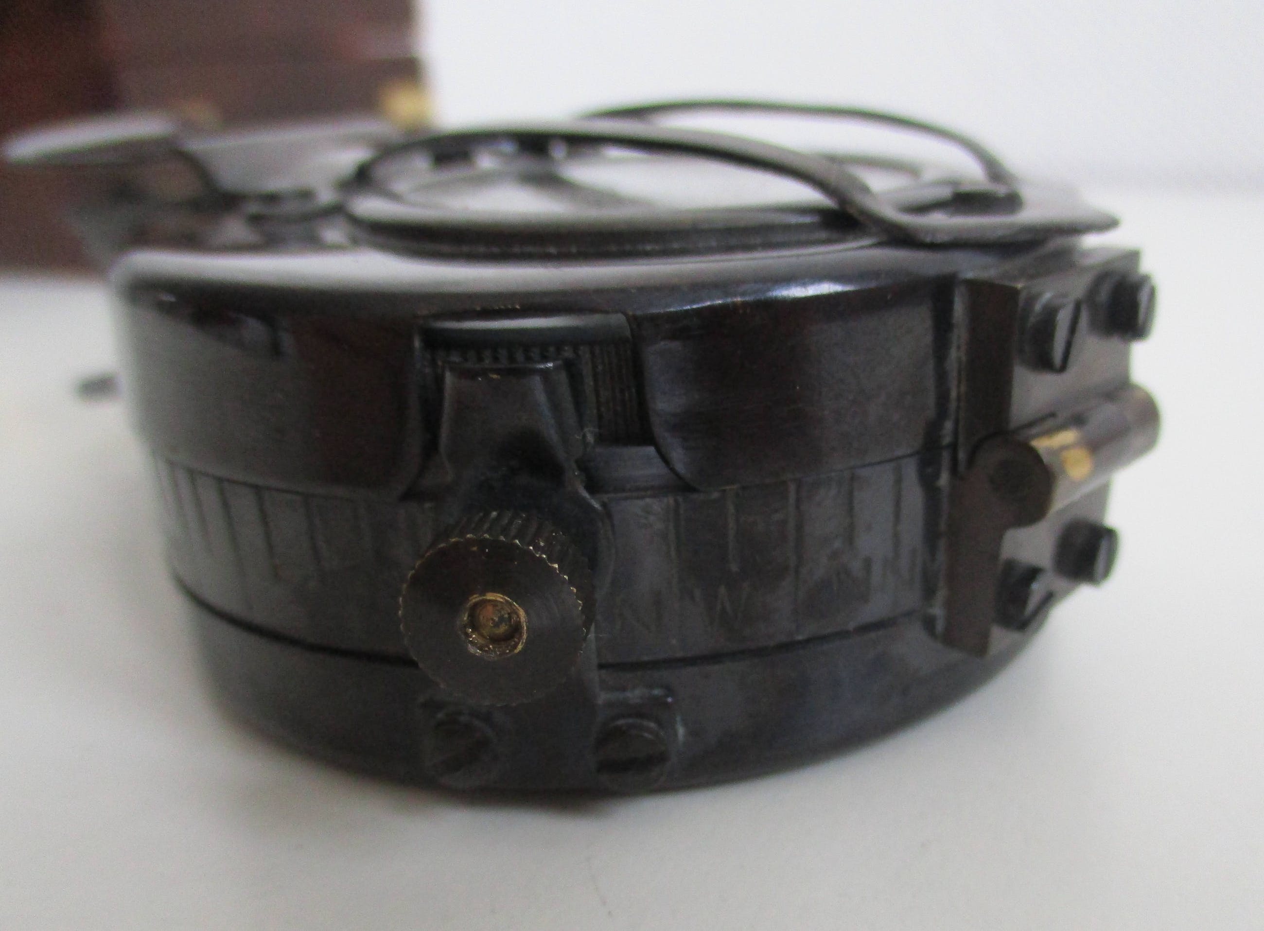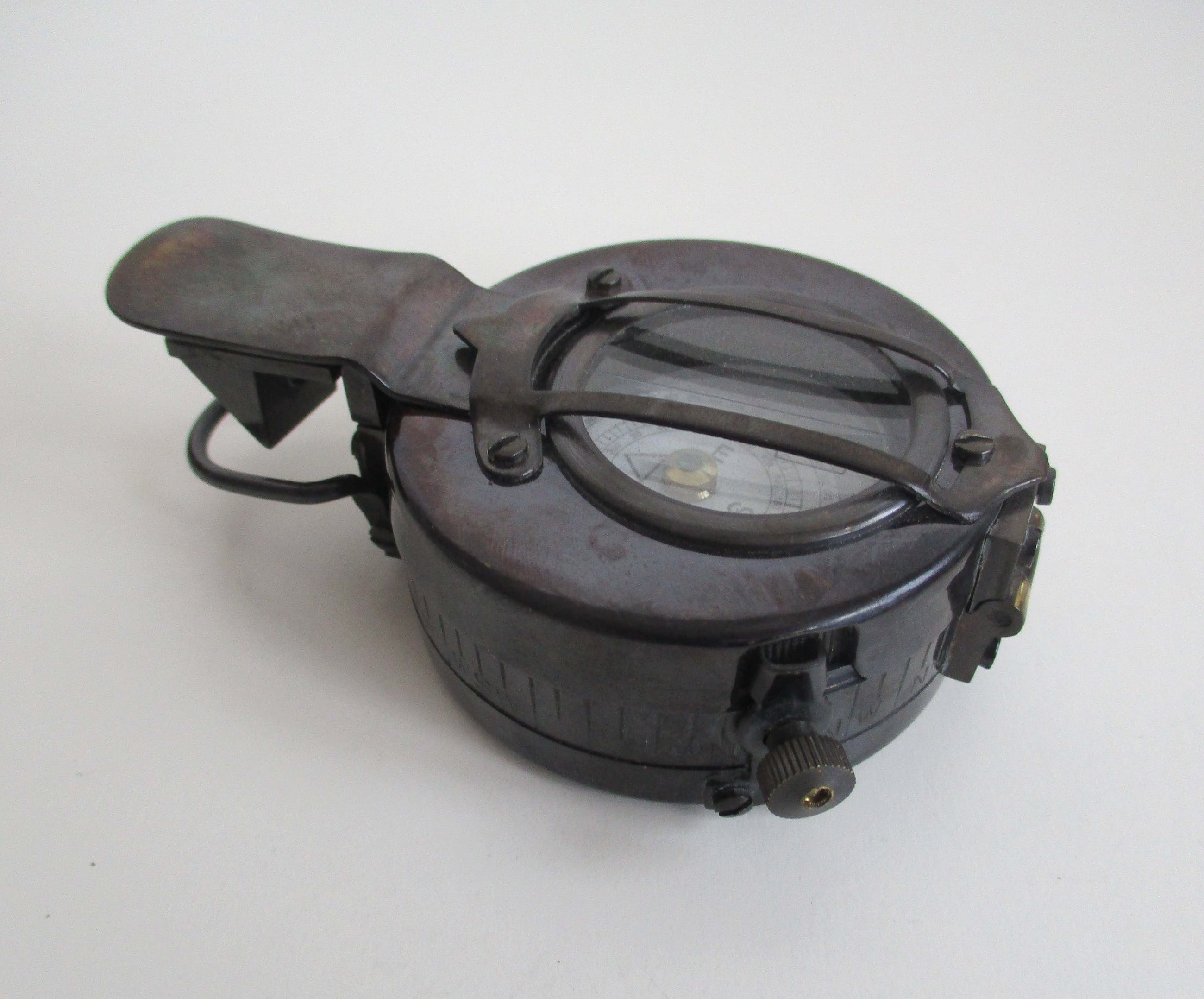 British Army kompas in werkende staat. Zwart gelakt metaal. Ongemerkt. De streepjes van het kompas zijn aan de zijkant geëtst, en het kompas heeft een uitneembare glazen ring, bedrukt met cijfers.