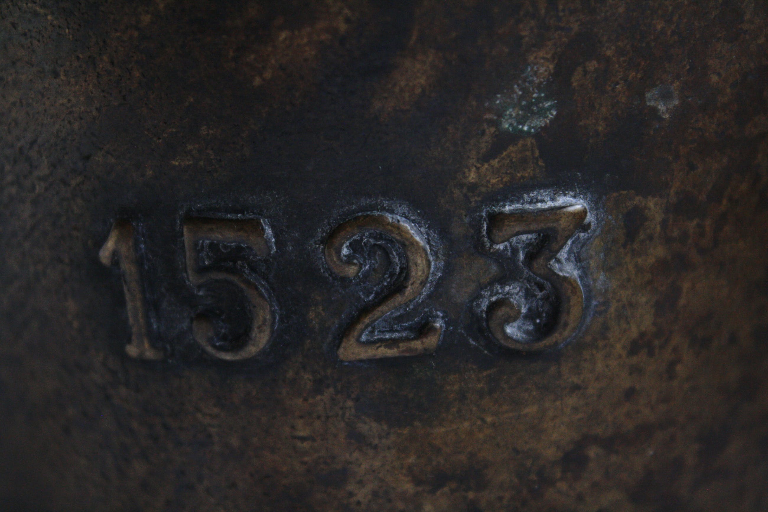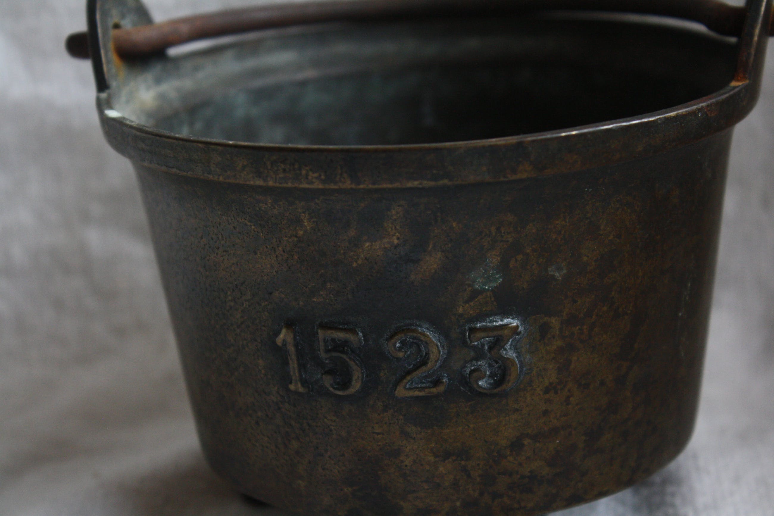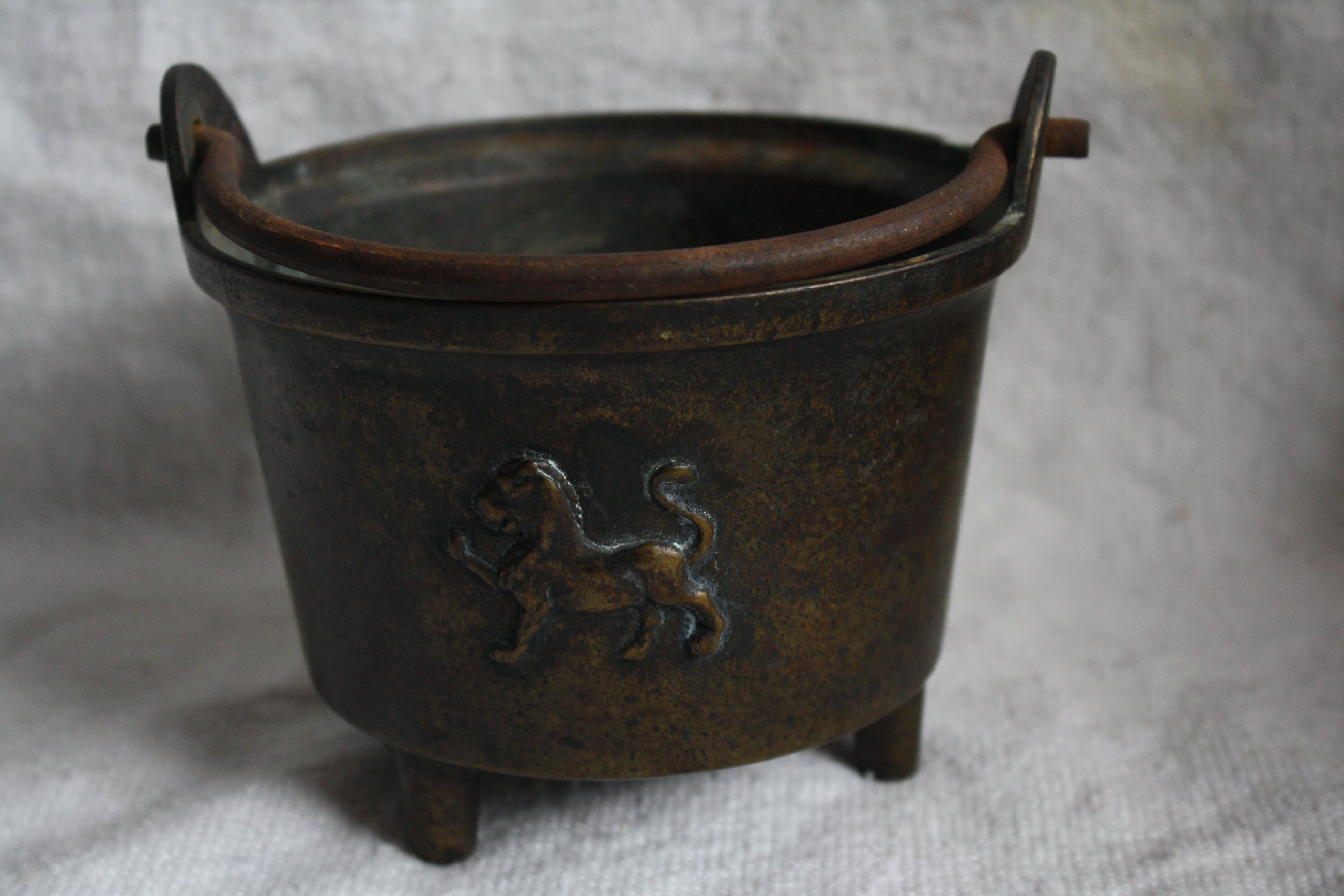 Zeer Zeldzame Nederlandse Bronzen Cauldron.(1523) met Gietijzeren Hengsel. Verkeerd in Perfecte Staat,en is voorzien van Jaartal en Leeuw. Dit Kavel is van Museum Kwaliteit en voor zover ik weet niet meer verkrijgbaar. Een Must voor elke Liefhebber. Caulderon komt uit mijn Priveverzameling. Afmeting Hoog 12cm en Breed 14cm Gewicht is ruim 1200 Gram. Kijk goed naar de fotos waar U alle Detials kunt waarnemen. Wordt zeer goed verpakt en Aangetekend opgestuurd met post.nl met trake en trace.