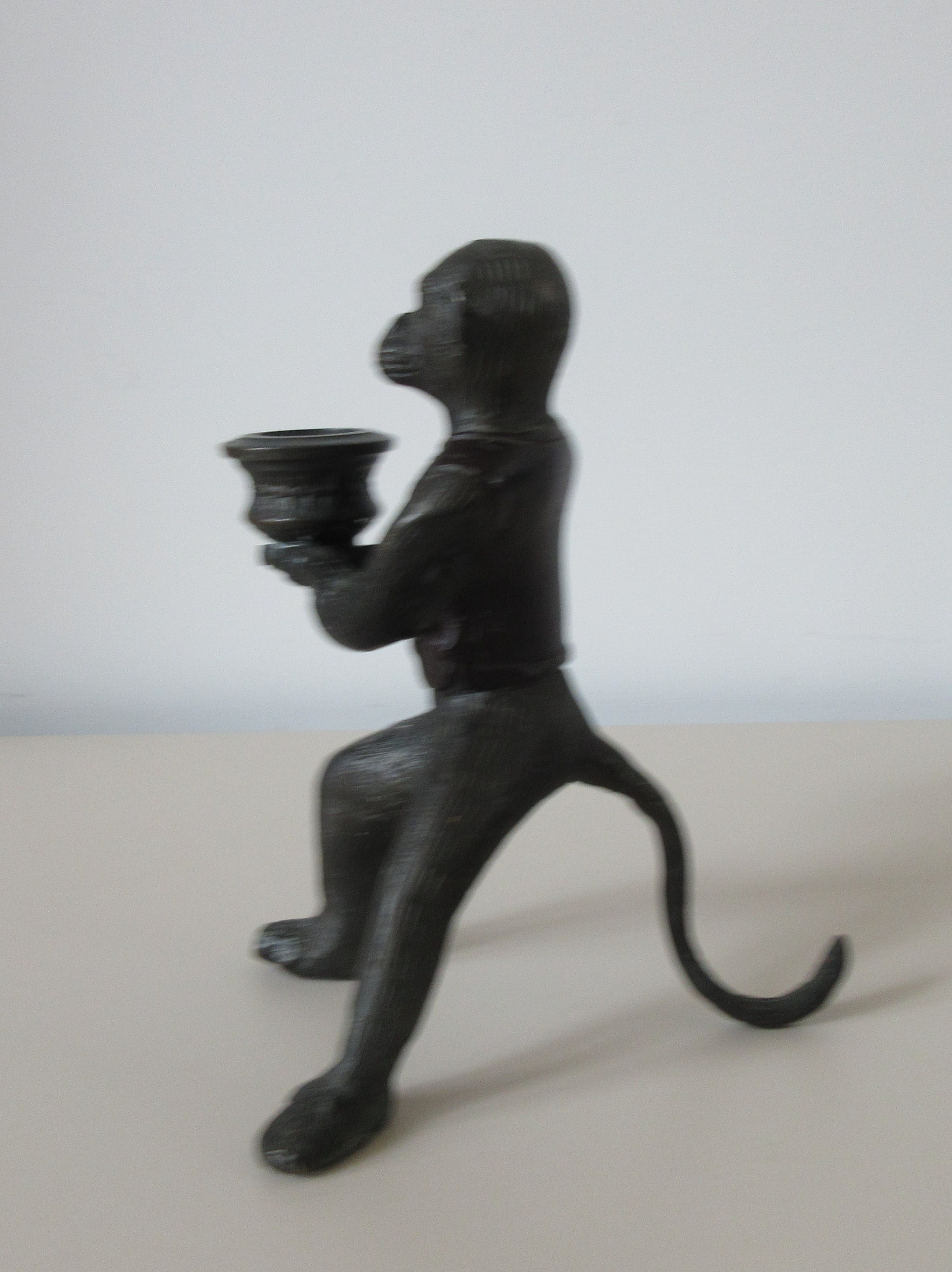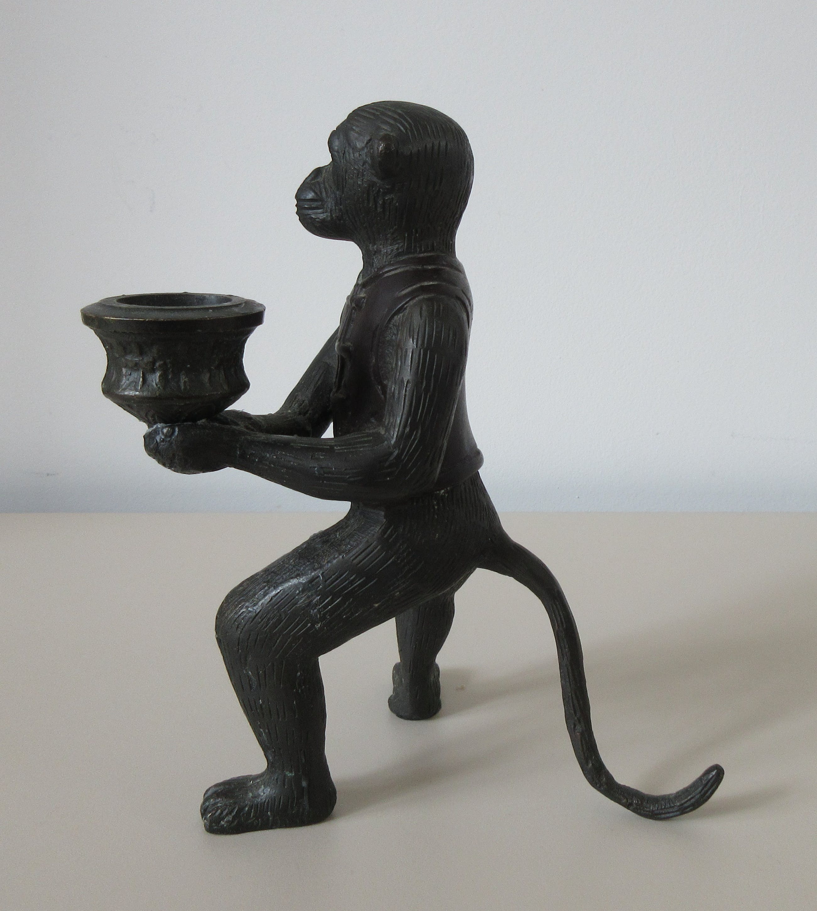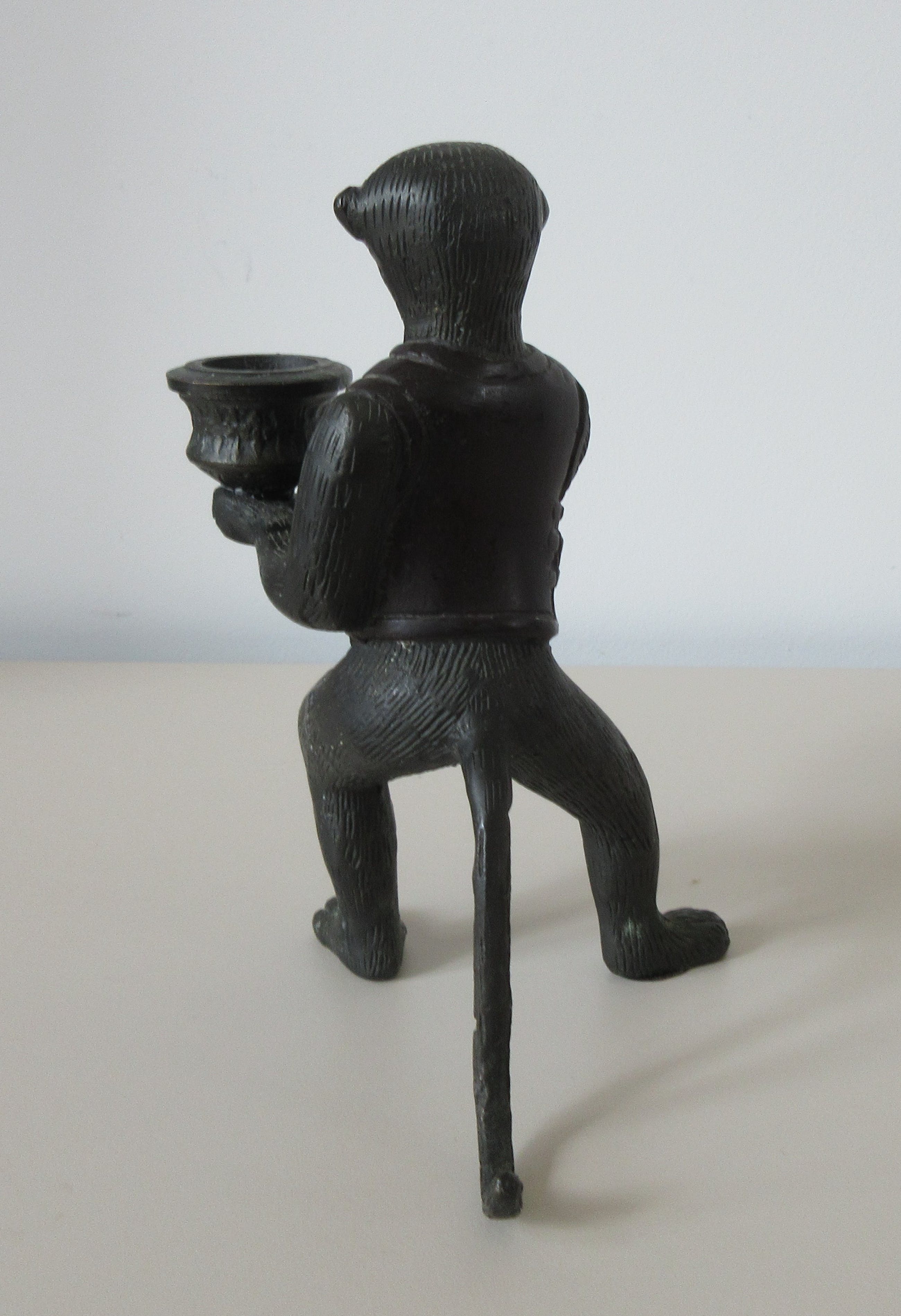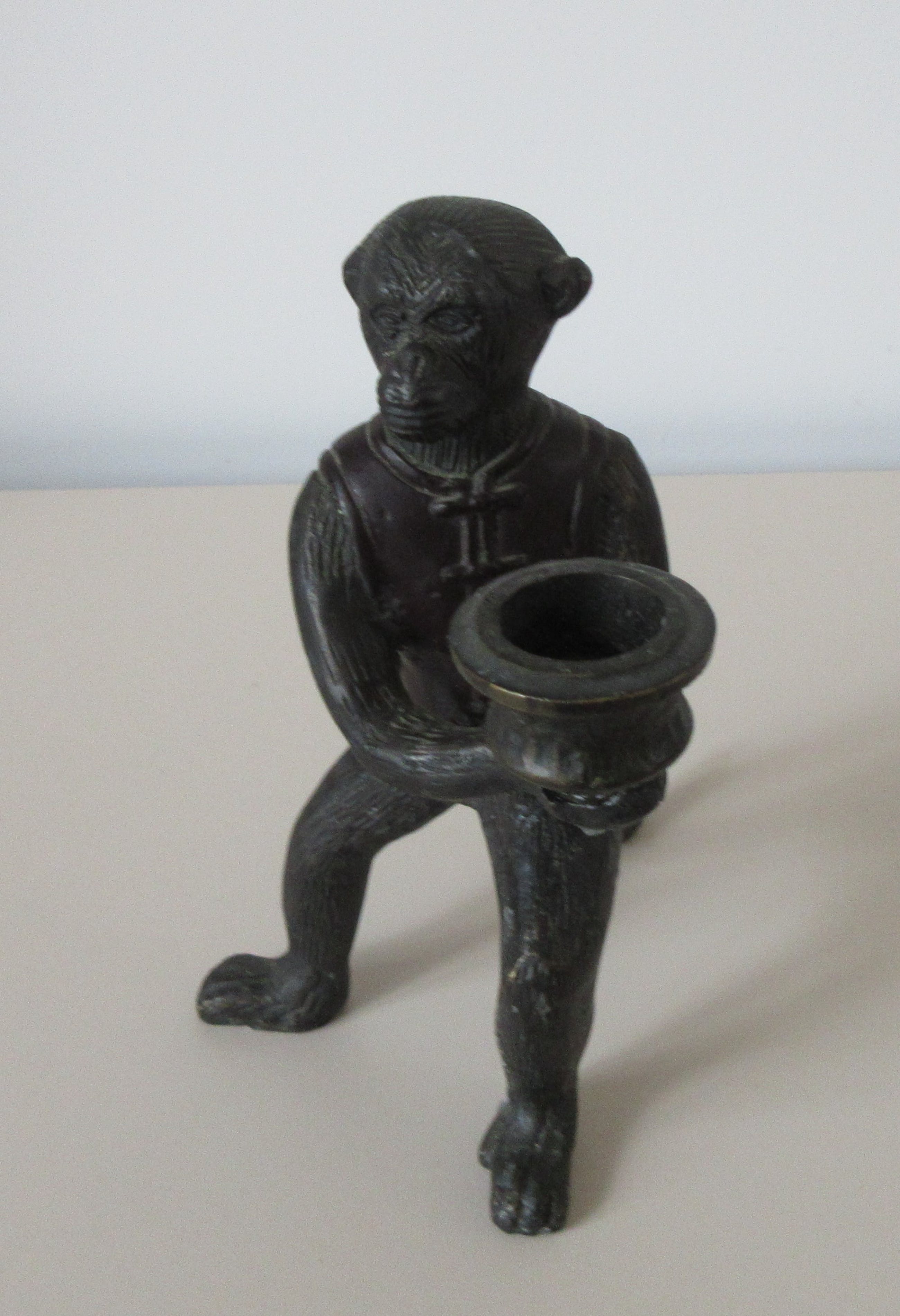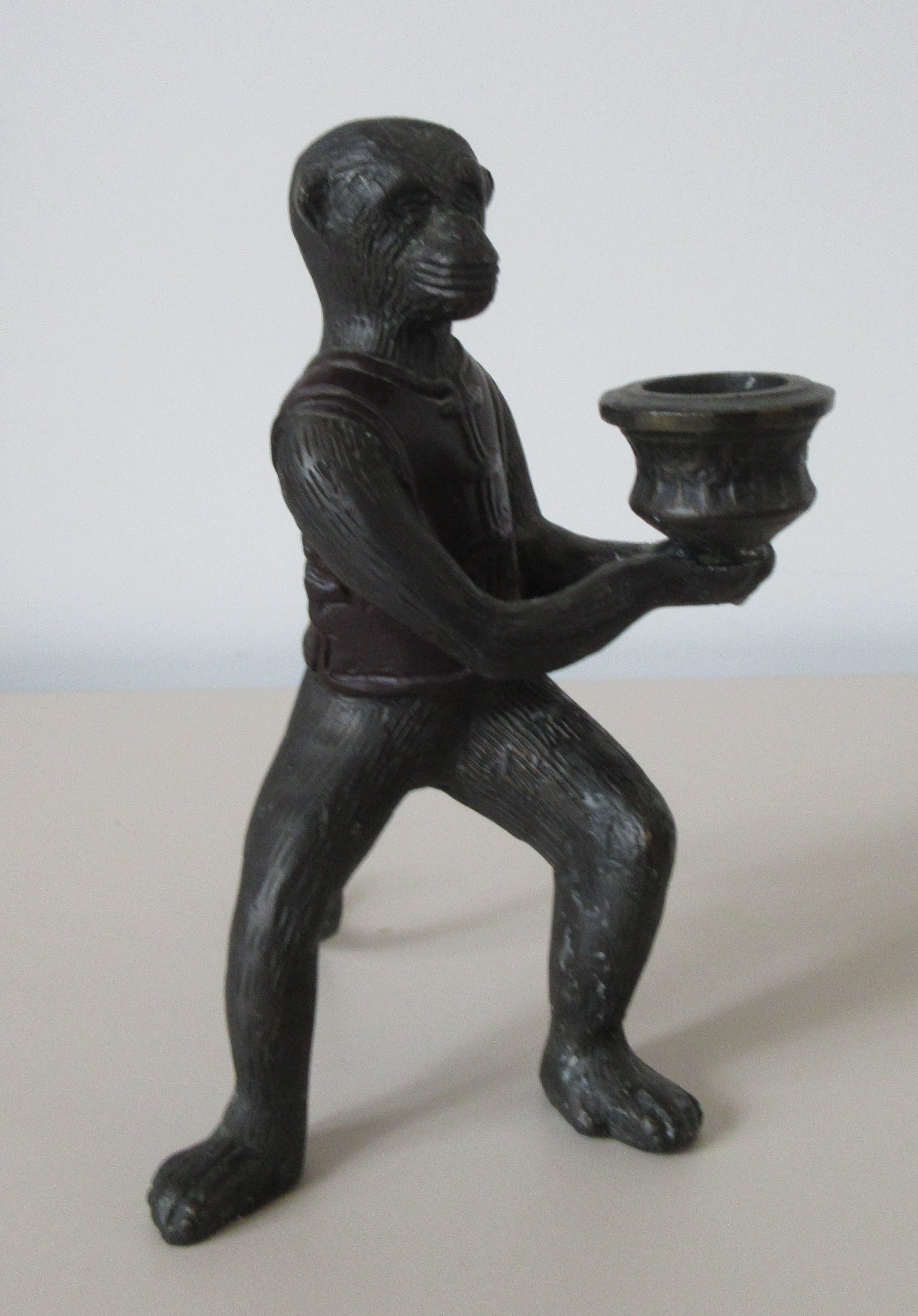 Bronzen gepolychromeerde beelden - apen met een kandelaars - Midden 20e eeuw. Zeer decoratief, echte blikvangers. Fraaie bronzen beelden. Aap draagt een kandelaar, steunt op 2 poten en zijn lange staart. Het is echt brons, gepolychromeerd. De beelden zijn heel goed bewaard en in uitstekende staat. De beelden zijn 18 centimeter hoog en wegen +/- 1,5 kg bij elkaar.
