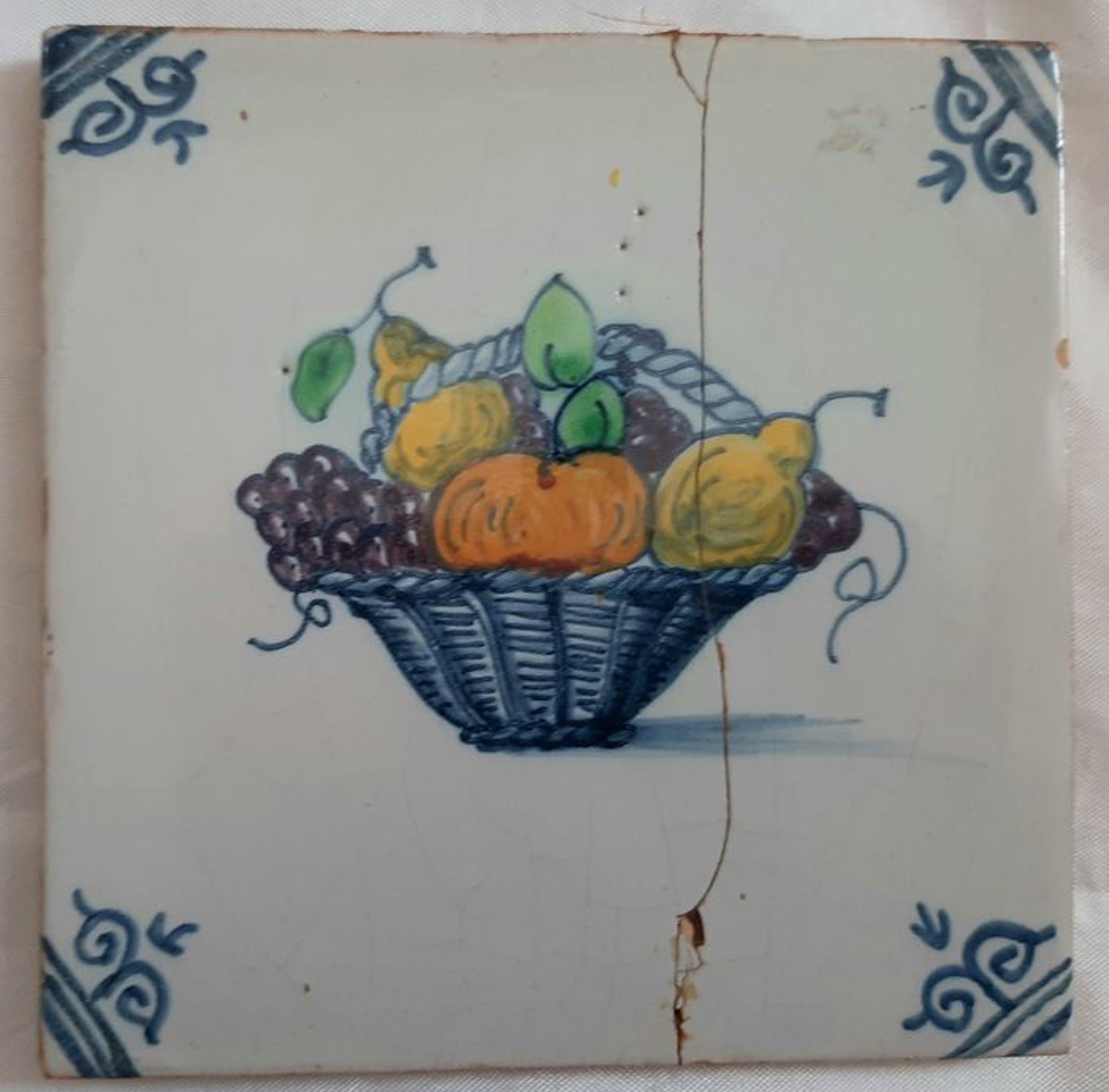 3.Antiek,handgeschilderd met kleur (fruit] 18e eeuw, 13x13 cm,gemerkt met monogram.
