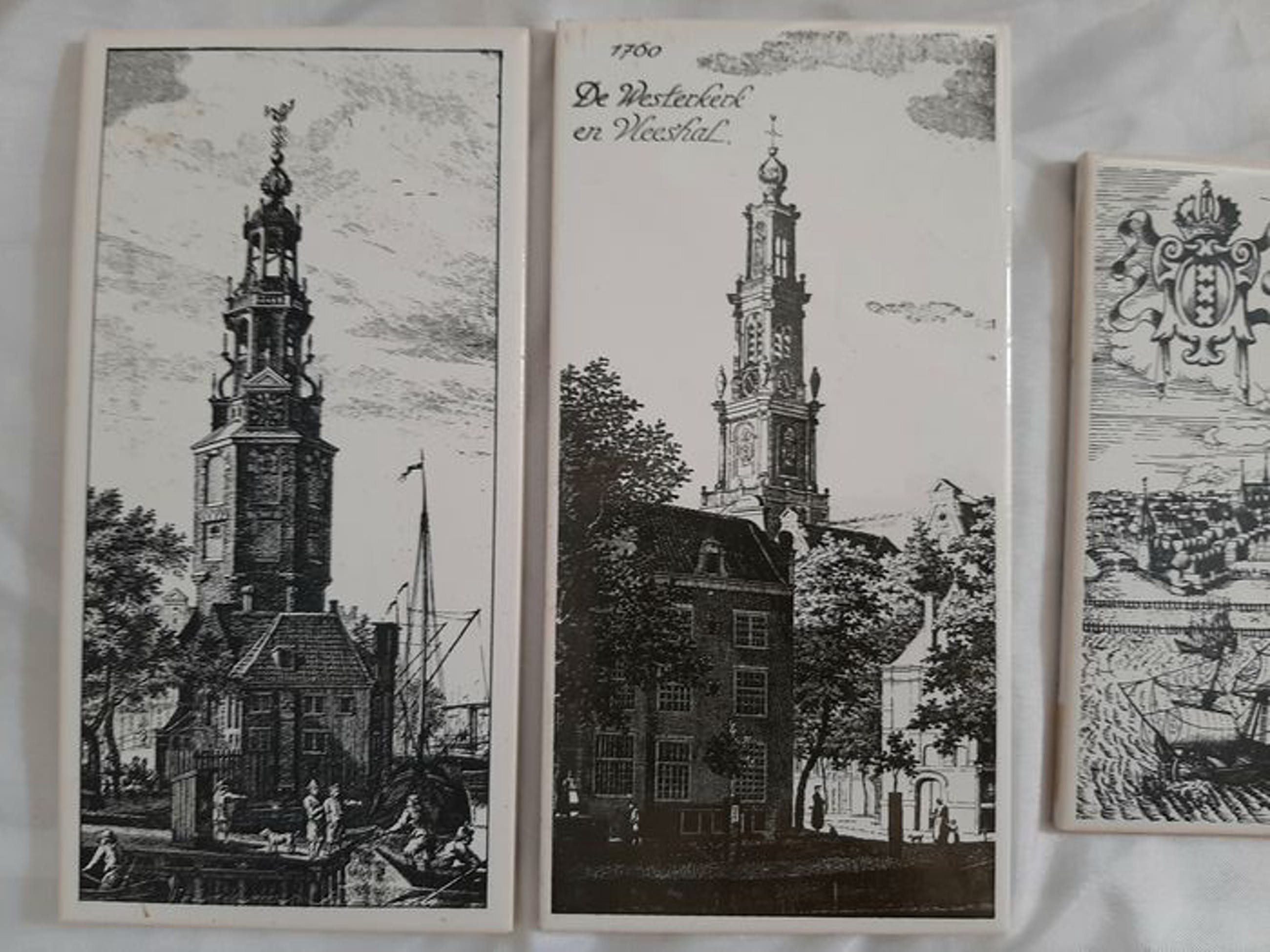 1. 4 x Keramische tegels zwart-wit print van kerken in Amsterdam, 20e eeuw