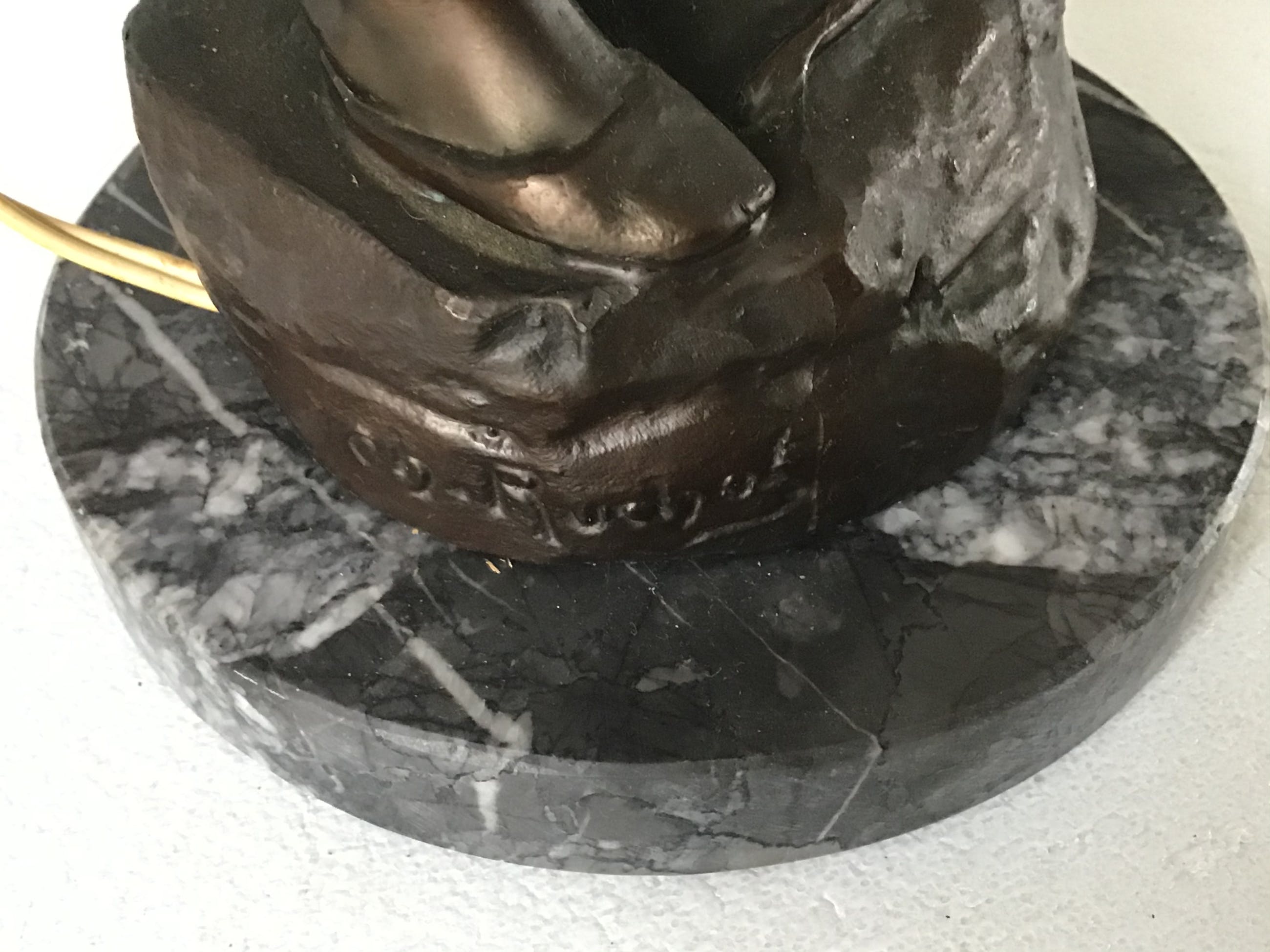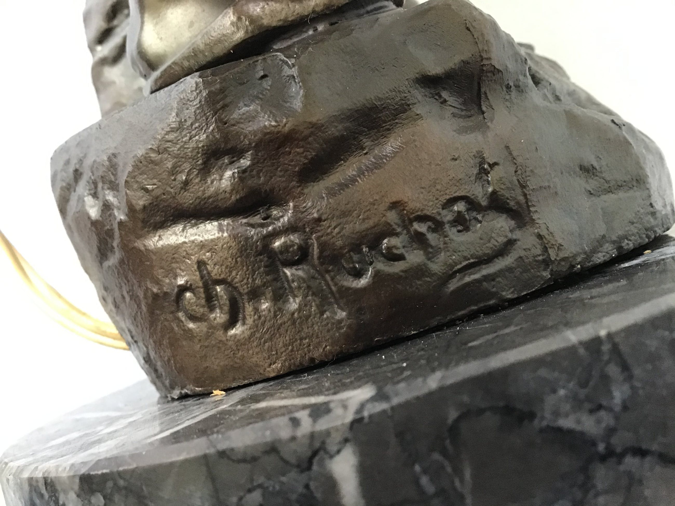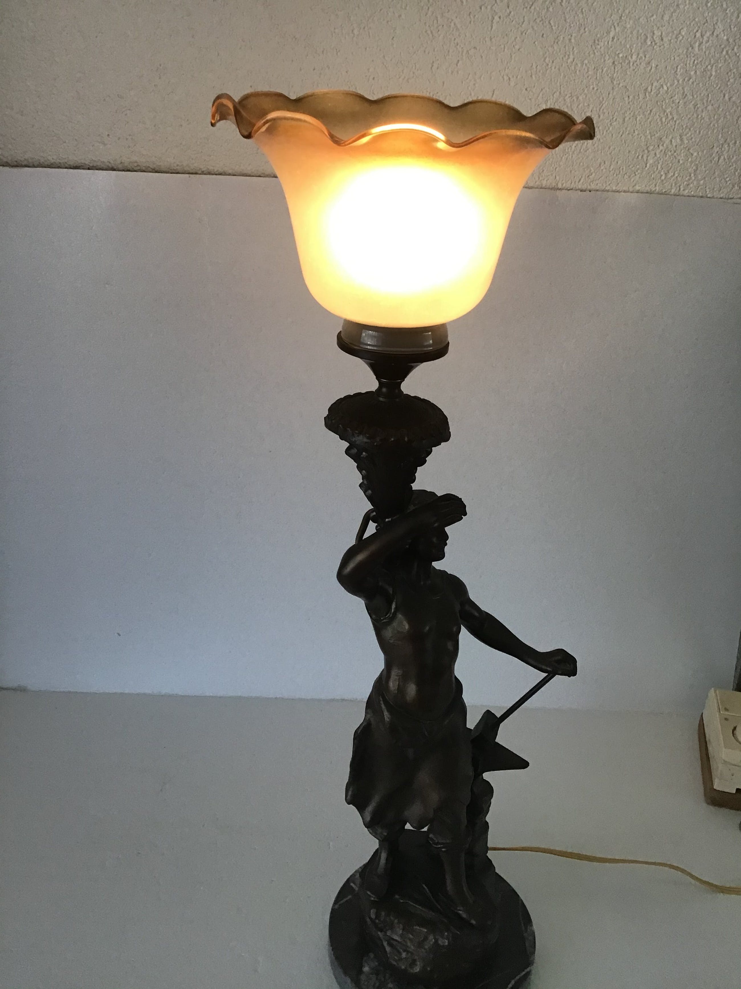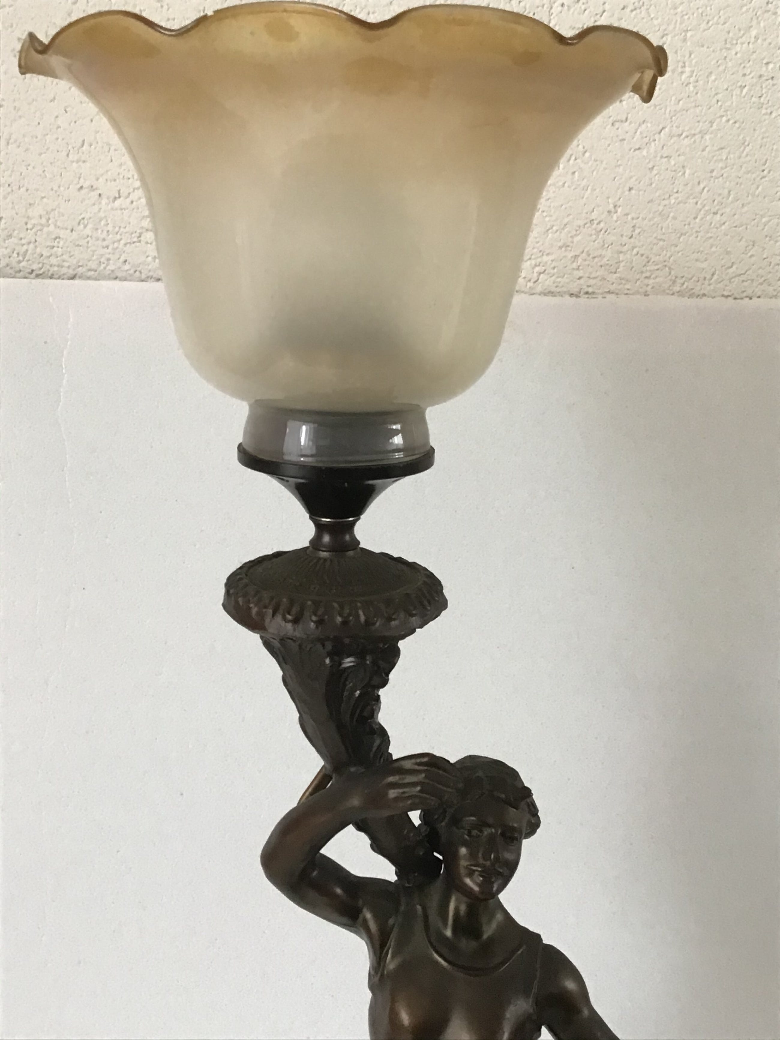 Mooie lamp van Charles Ruchot 1880-1925 Het beeld op marmeren sokkel is in goede conditie. Materiaal Zamak-legering. Hoogte beeld zonder kapje 46.5 cm.