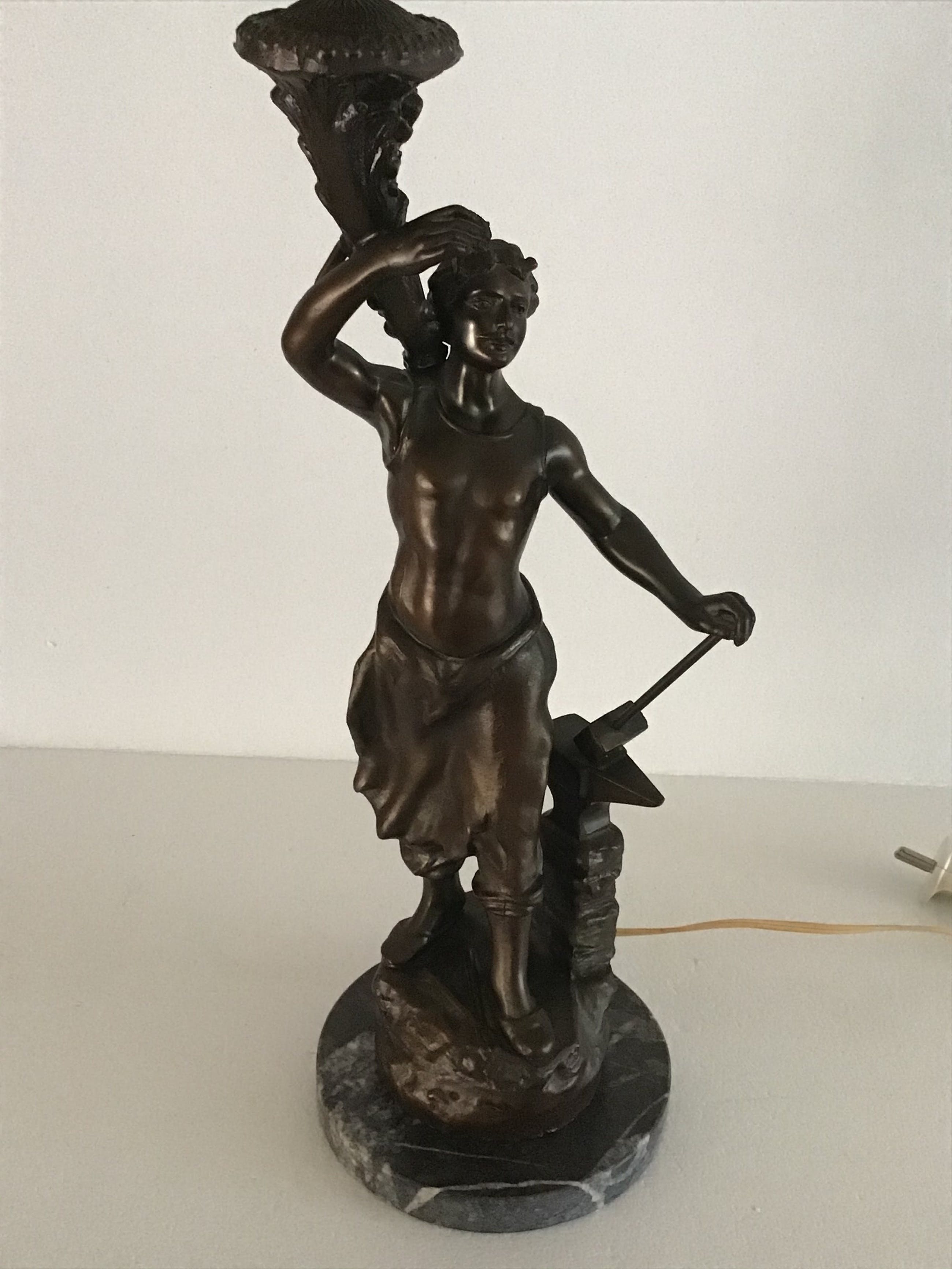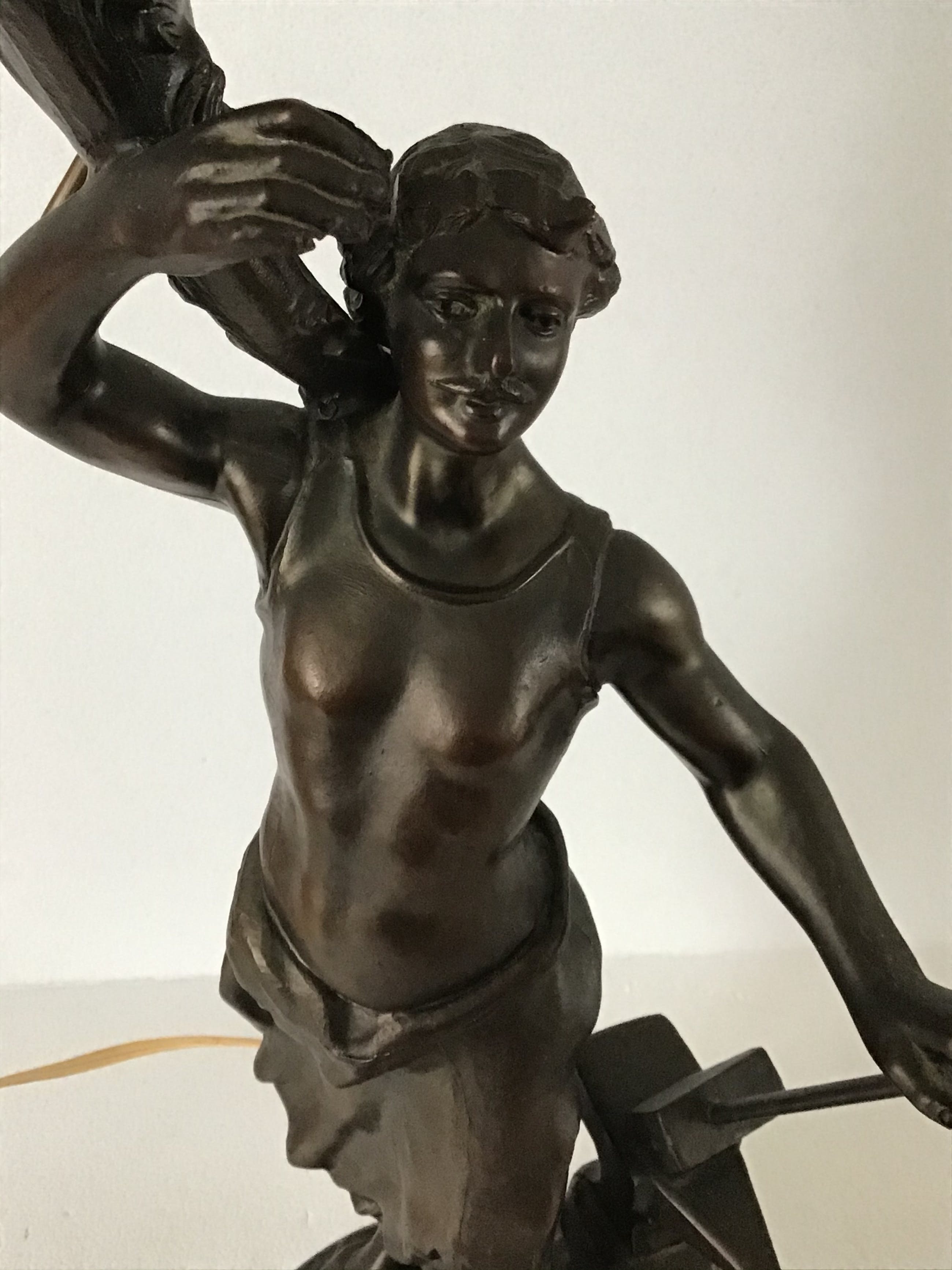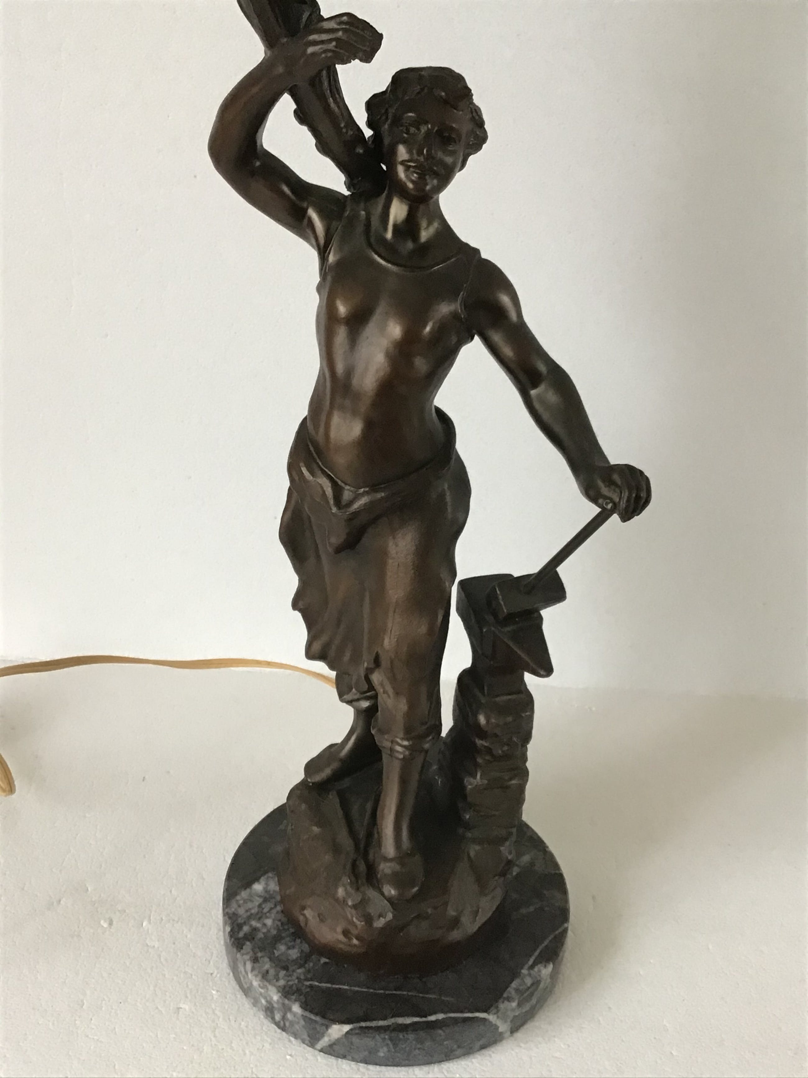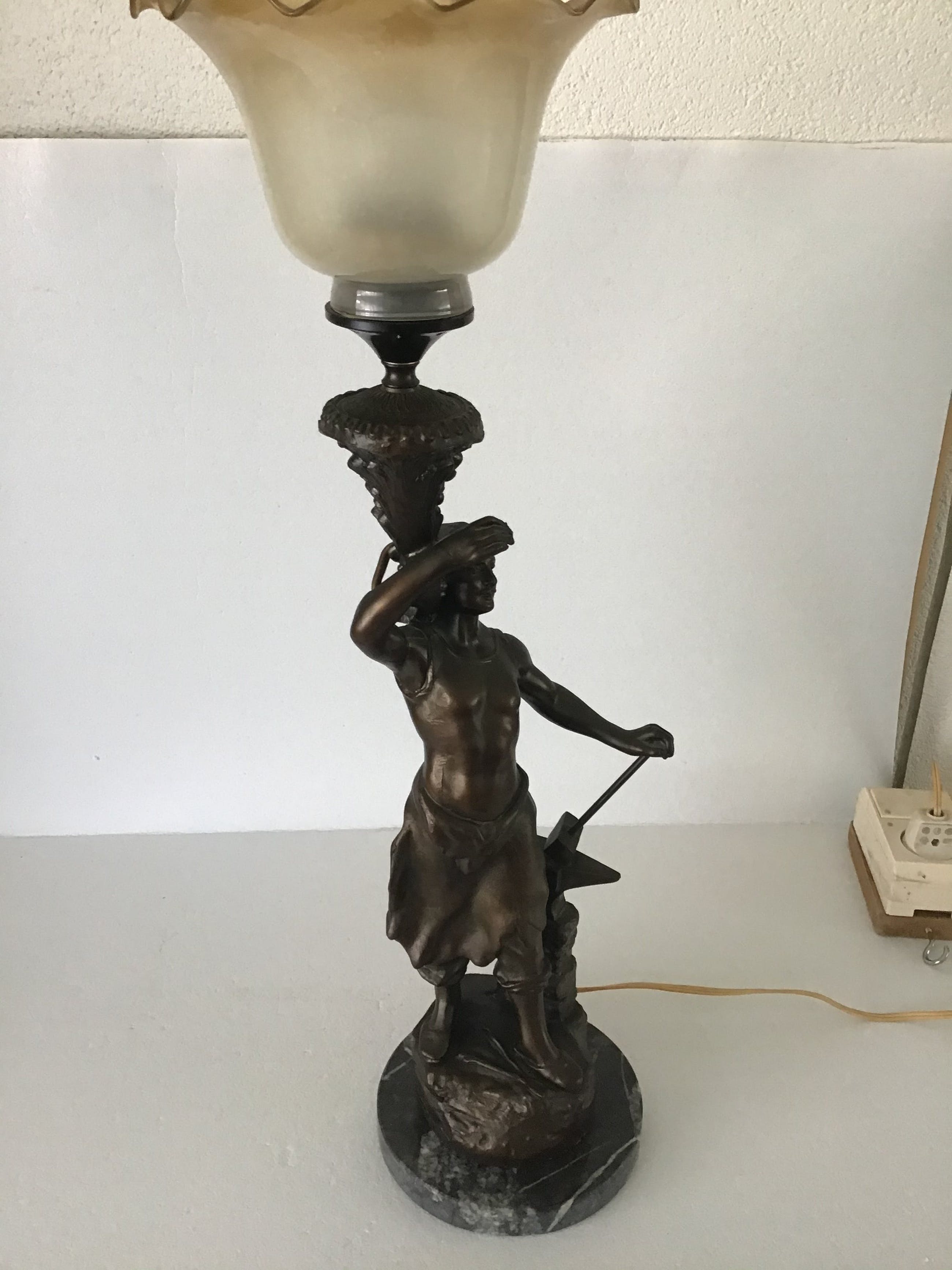 Mooie lamp van Charles Ruchot 1880-1925 Het beeld op marmeren sokkel is in goede conditie. Materiaal Zamak-legering. Hoogte beeld zonder kapje 46.5 cm.