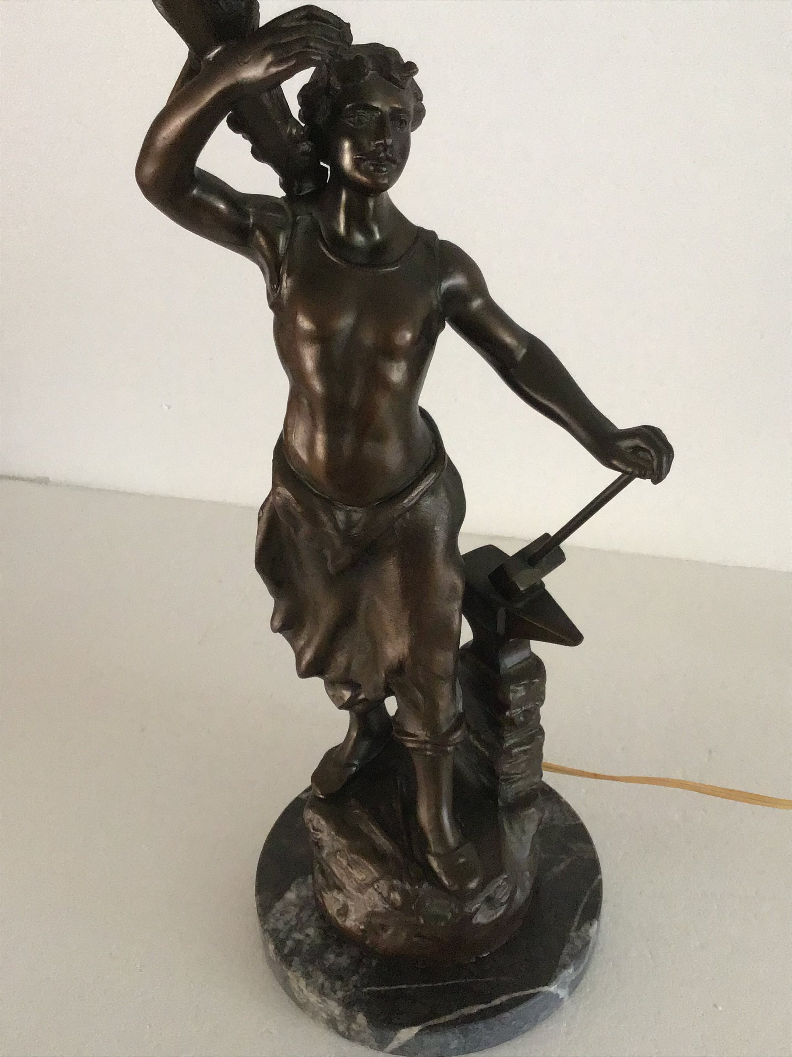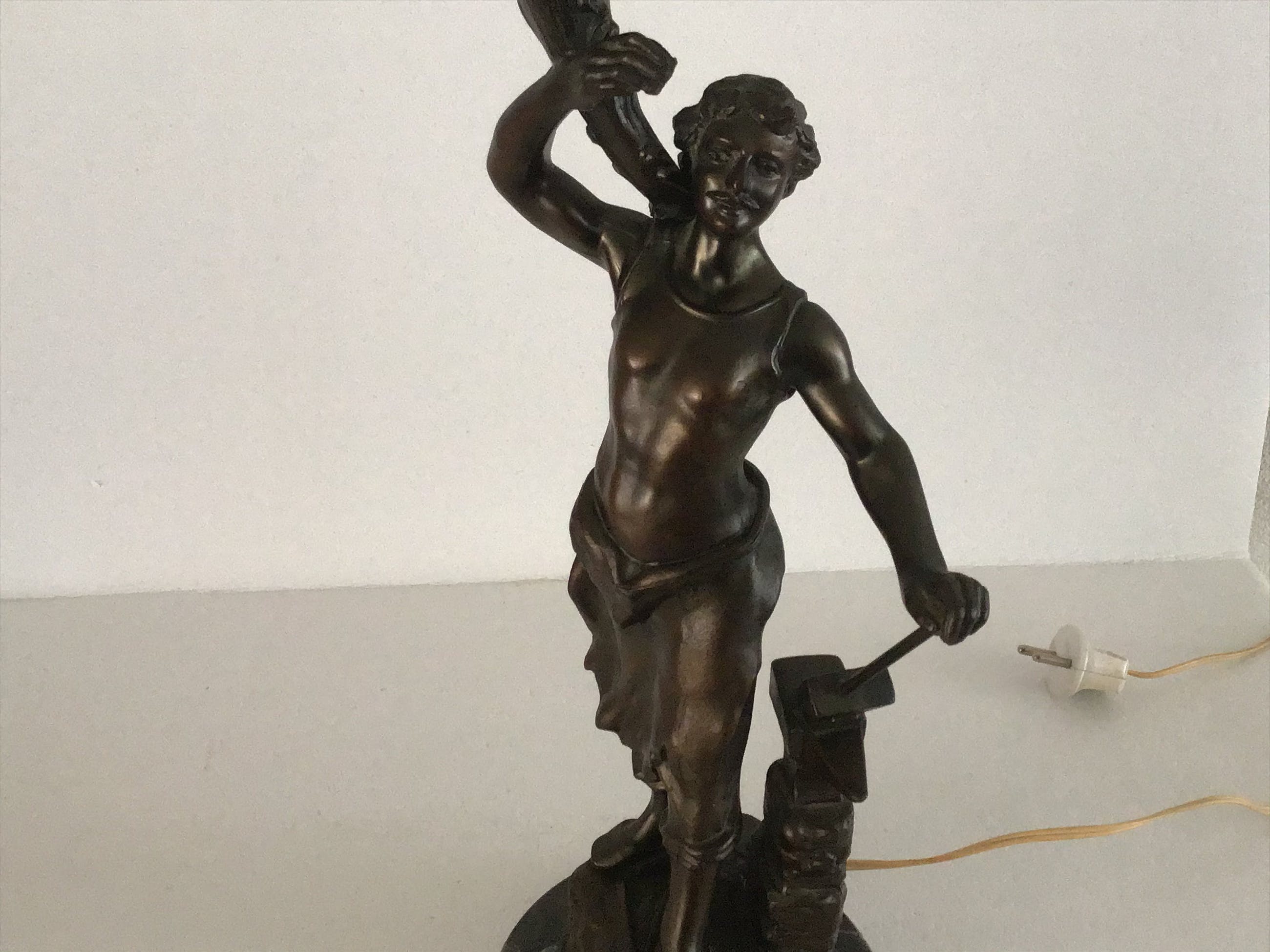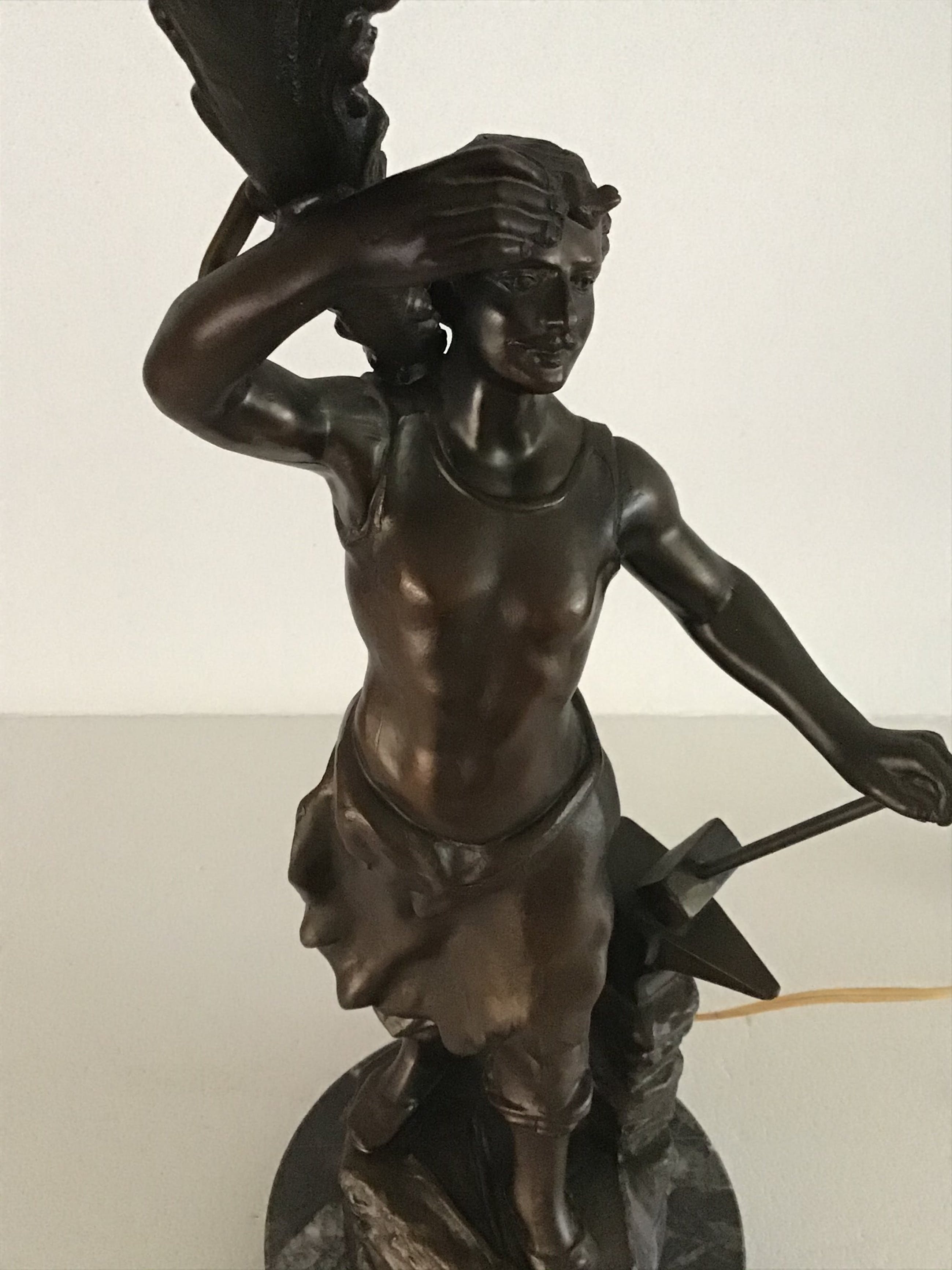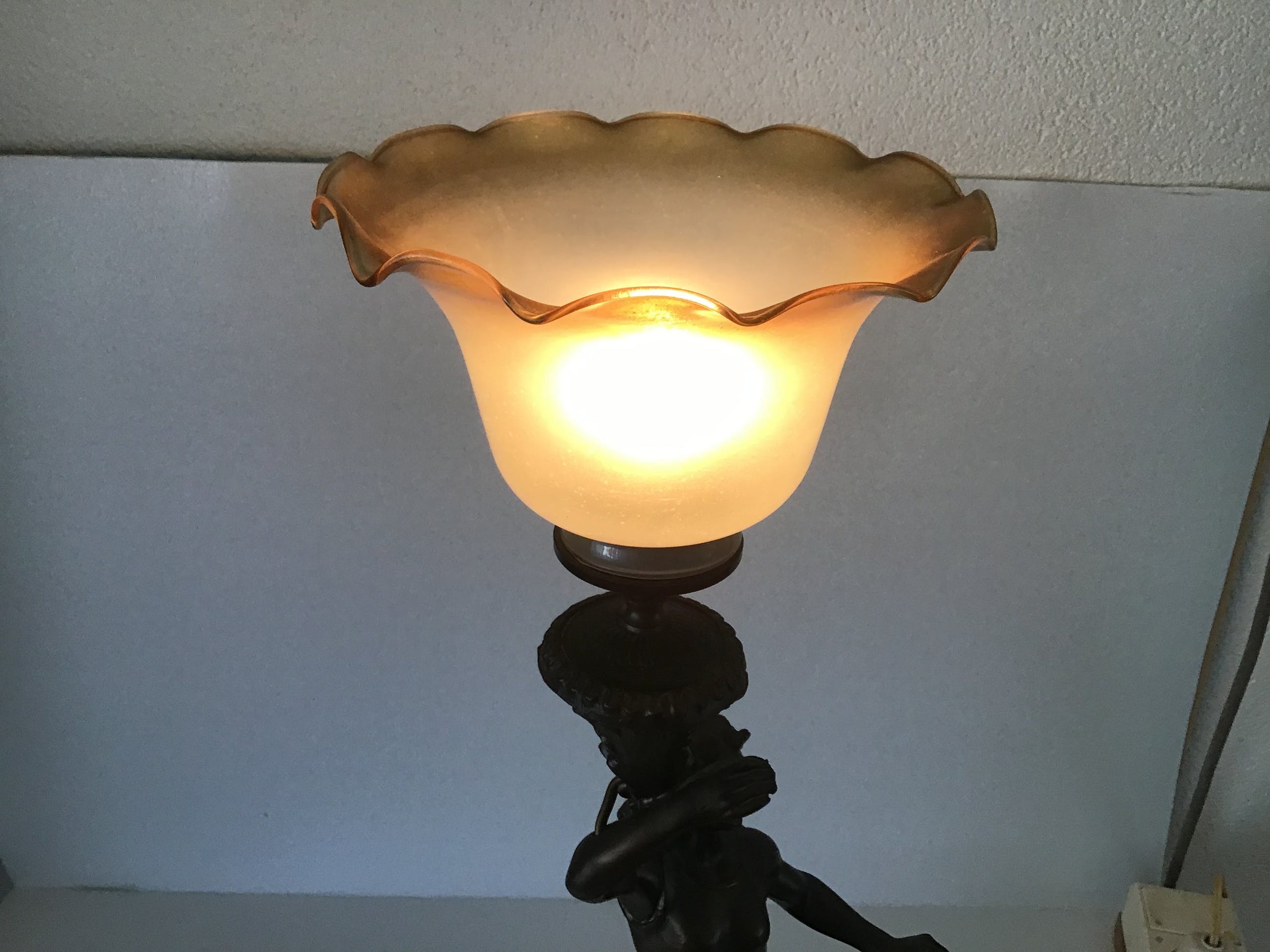 Mooie lamp van Charles Ruchot 1880-1925 Het beeld op marmeren sokkel is in goede conditie. Materiaal Zamak-legering. Hoogte beeld zonder kapje 46.5 cm.