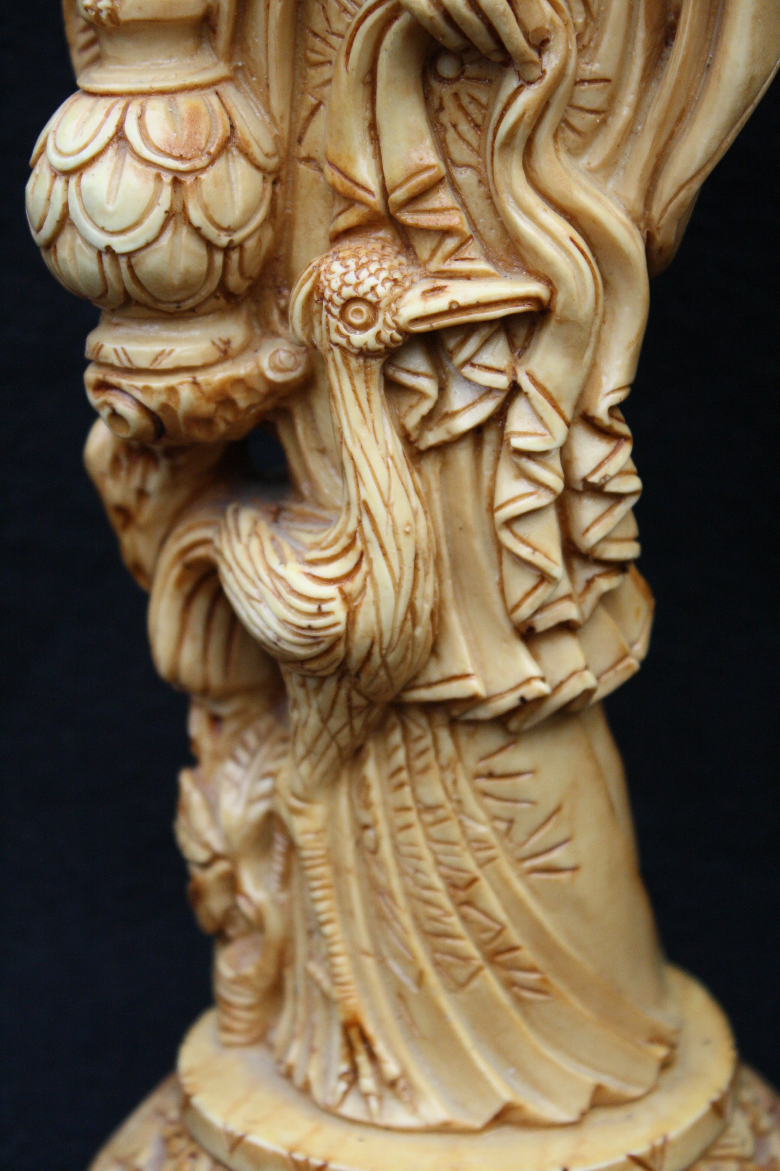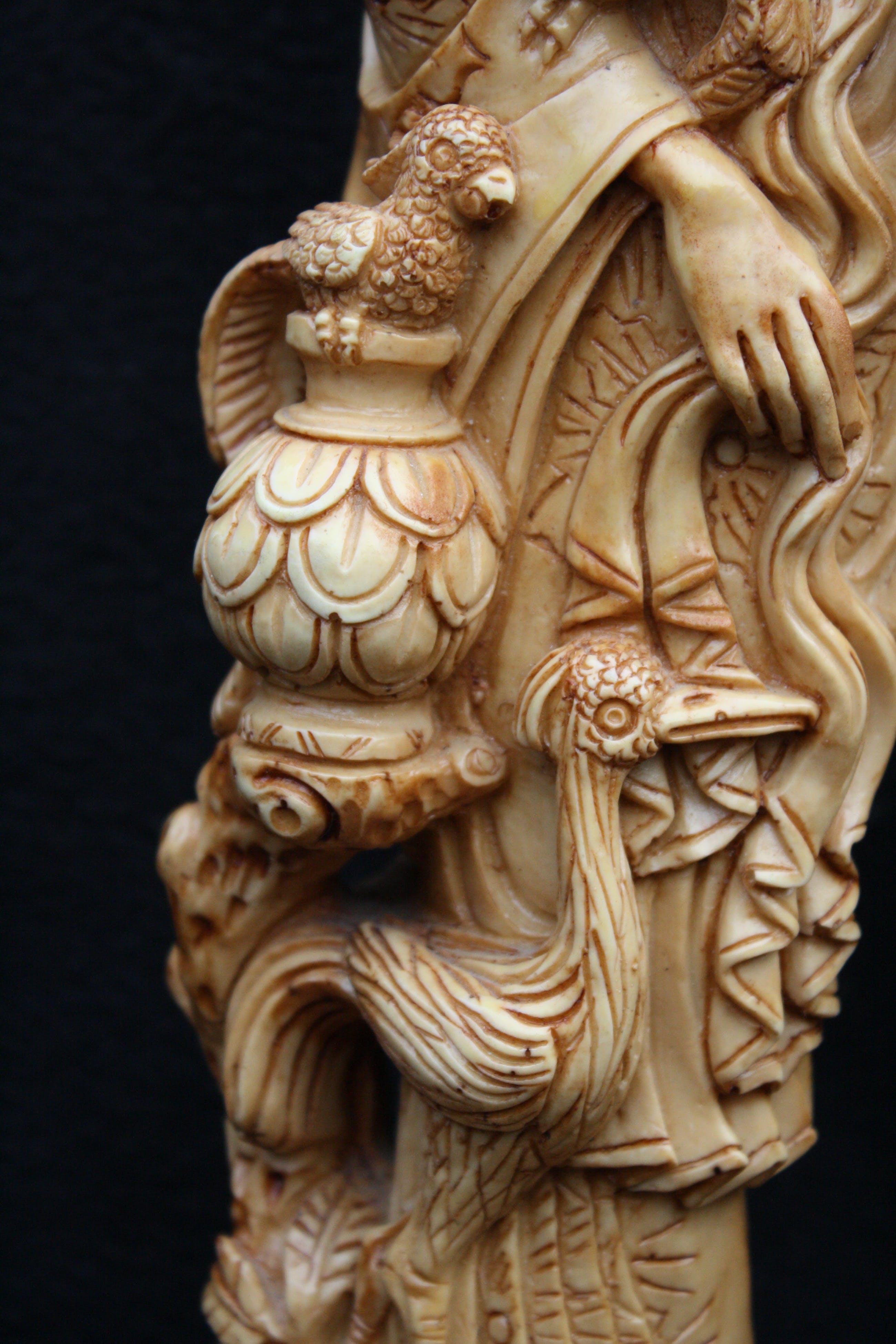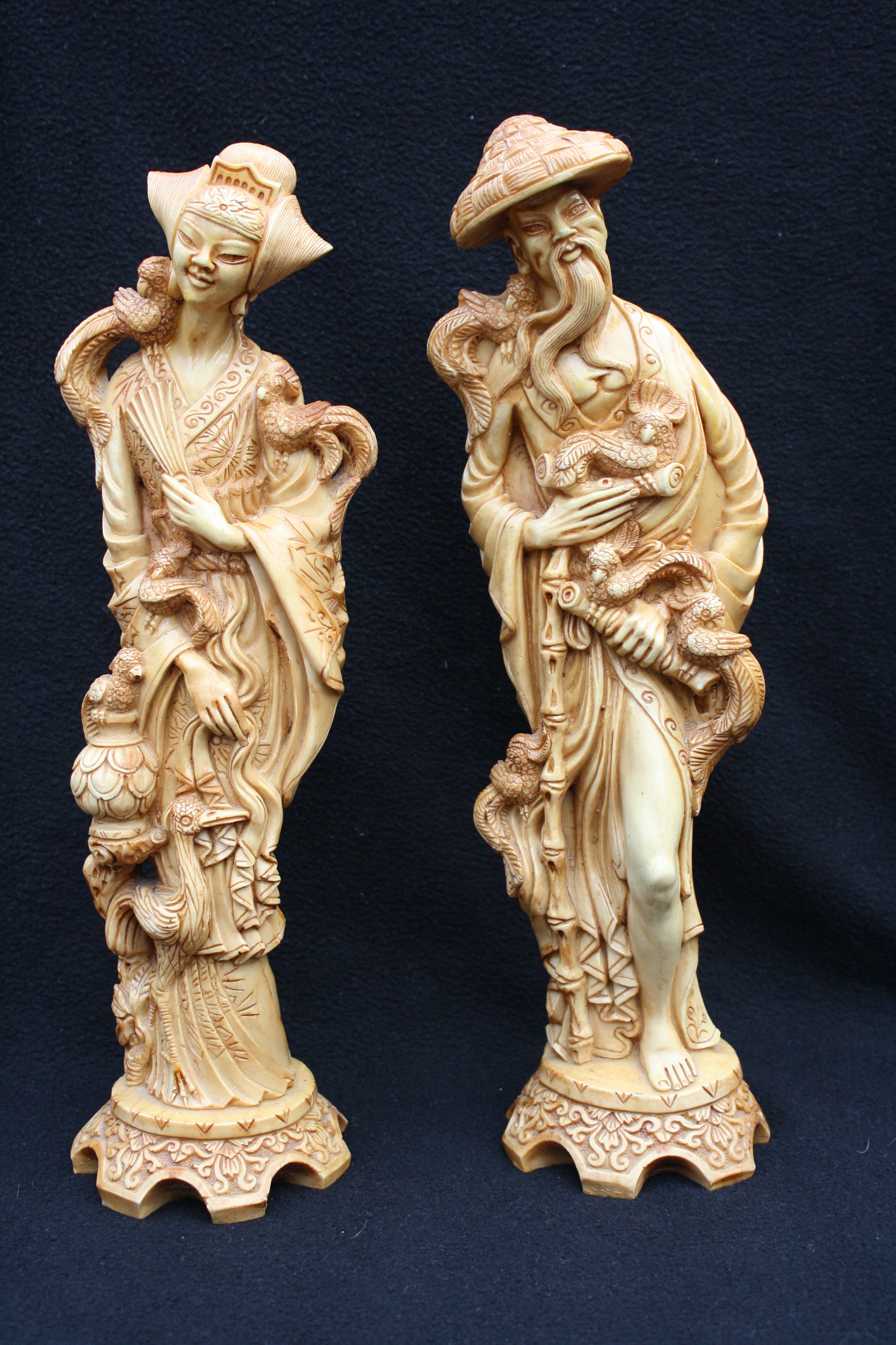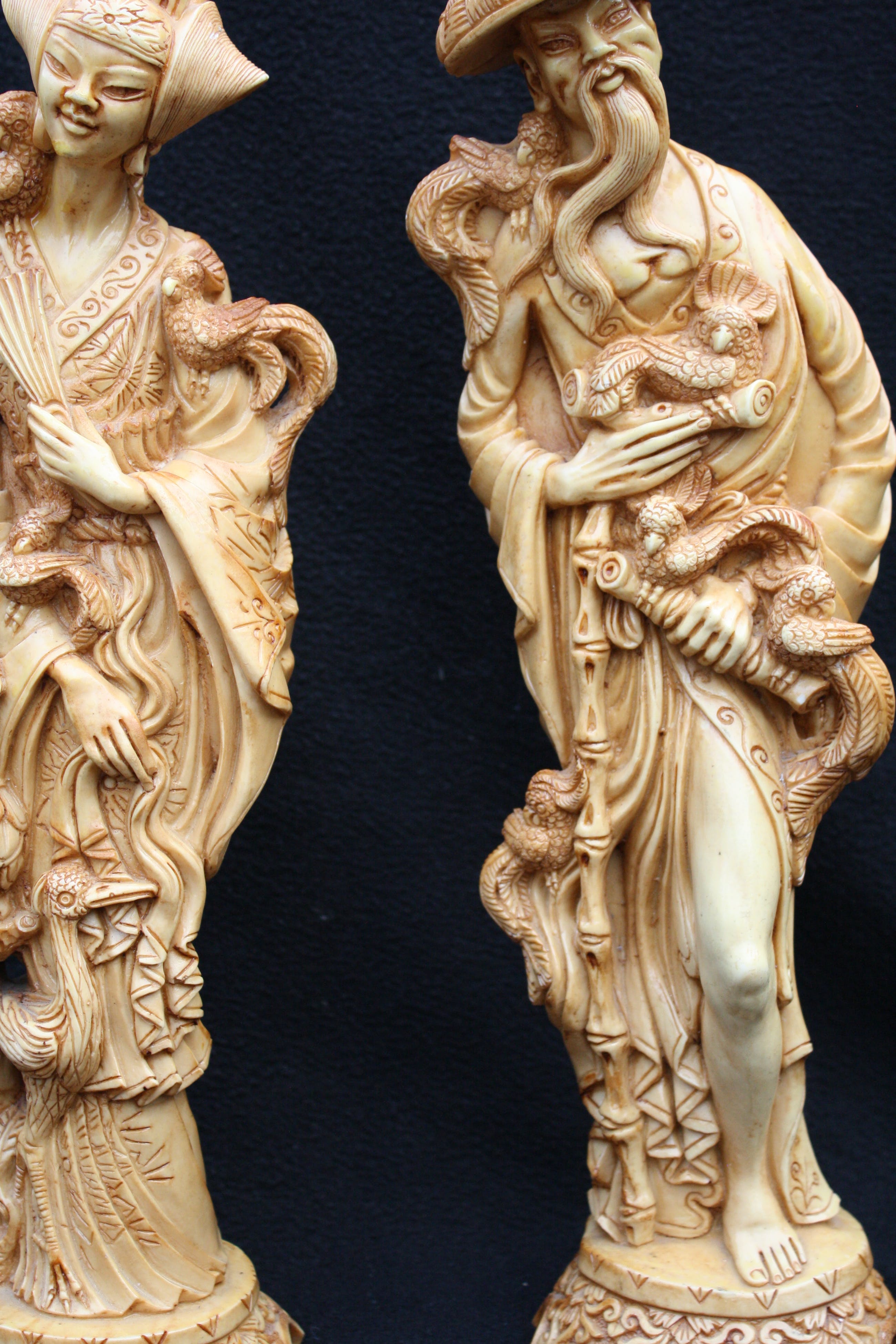 Twee Uitermate Grote mooie met de hand Gesneden Chinese Beelden gemaakt van Resin (Combinatie van gemalen marmer en hars) voelt aan als Steen. Beelden zijn aan de achterkant voorzien van een monogram. Graag de foto's bekijken, deze vormen een groot onderdeel van de omschrijving. Beelden verkeren in perfecte staat. Afmeting Hoog 40cm en Breed 12cm. Het gewicht is in totaal 3400 Gram. Wordt zeer goed verpakt en opgestuurd met post.nl met trake en trace.