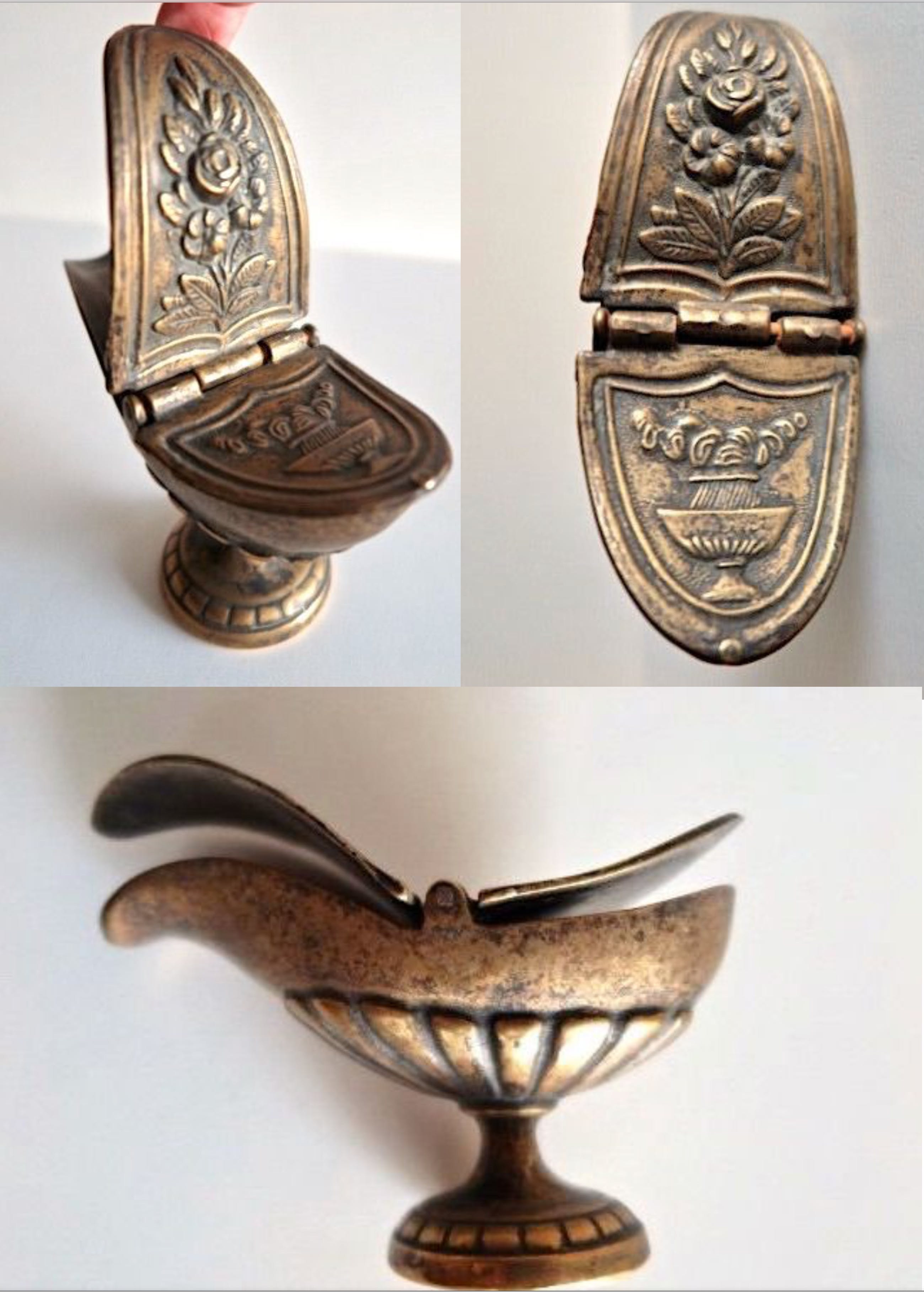 8) Wijwaterbakje met 2 dekseltjes op voet - brons - midden 20e eeuw - 14x8x6cm - zware kwaliteit - 380g - fijn bewerkt in relief - floraal decor - fraaie doorleefde staat