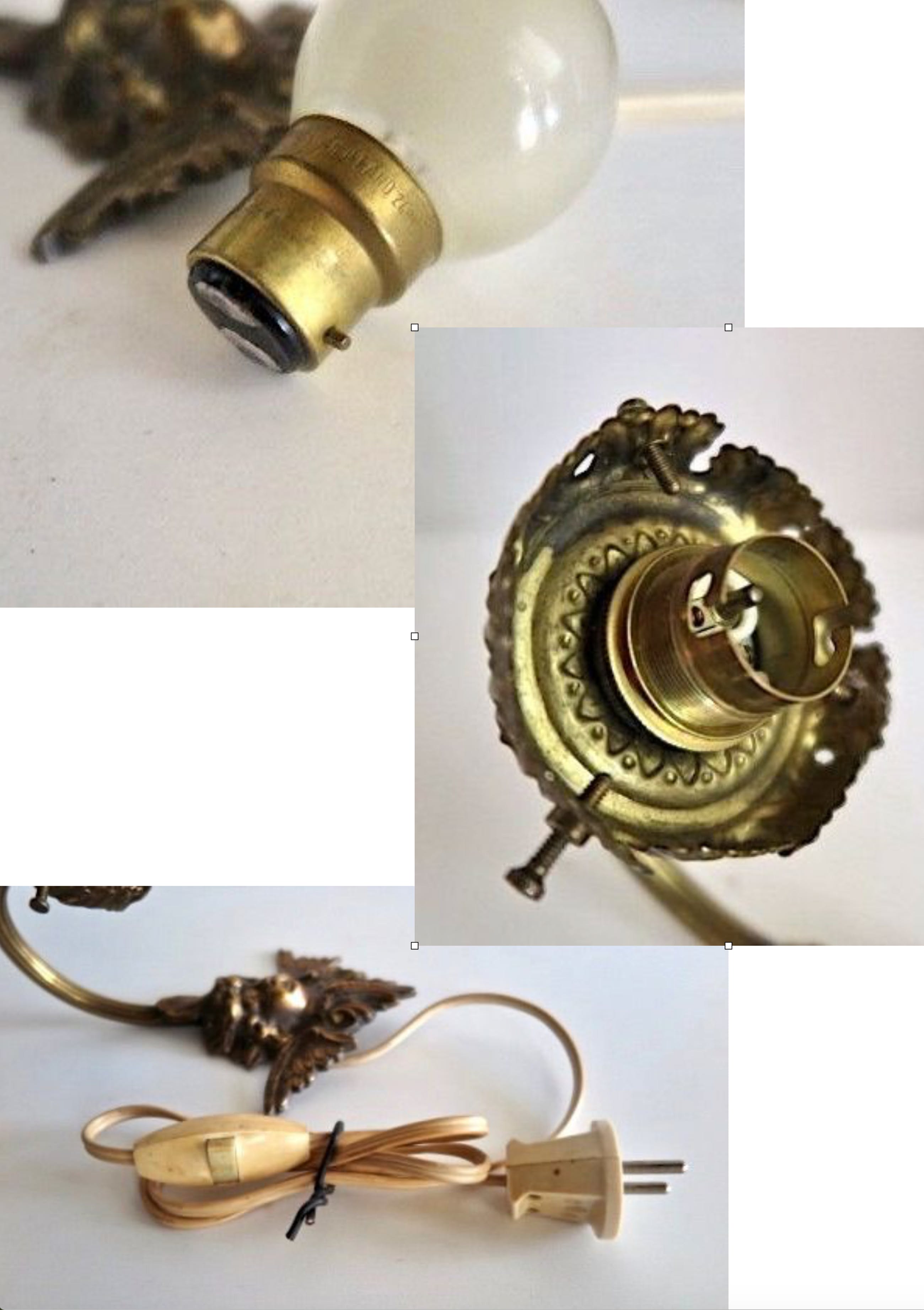 7) Antiek bronzen Engelenlampje - 19e/20e eeuw - 16x12x12cm - wandlamp - glazen kapje ontbreekt (diameter benodigd 4,5-6cm) - traditioneel systeem voor gloeilamp met koperen bajonet fitting (verkrijgbaar in de handel) - meegeleverd werkende Splendor bajonet bollamp - compleet met de originele koperen aandraaischroefjes - in fraaie doorleefde staat