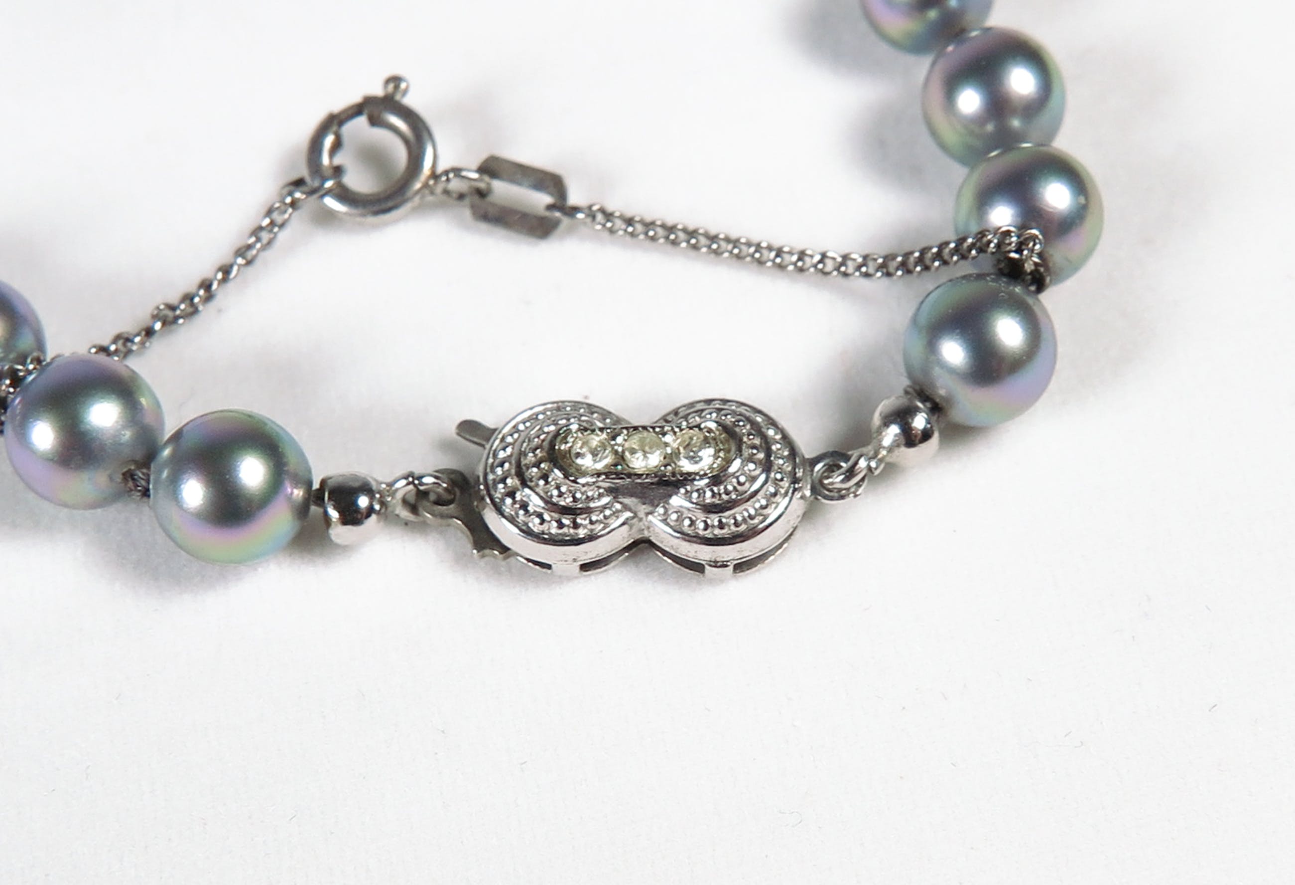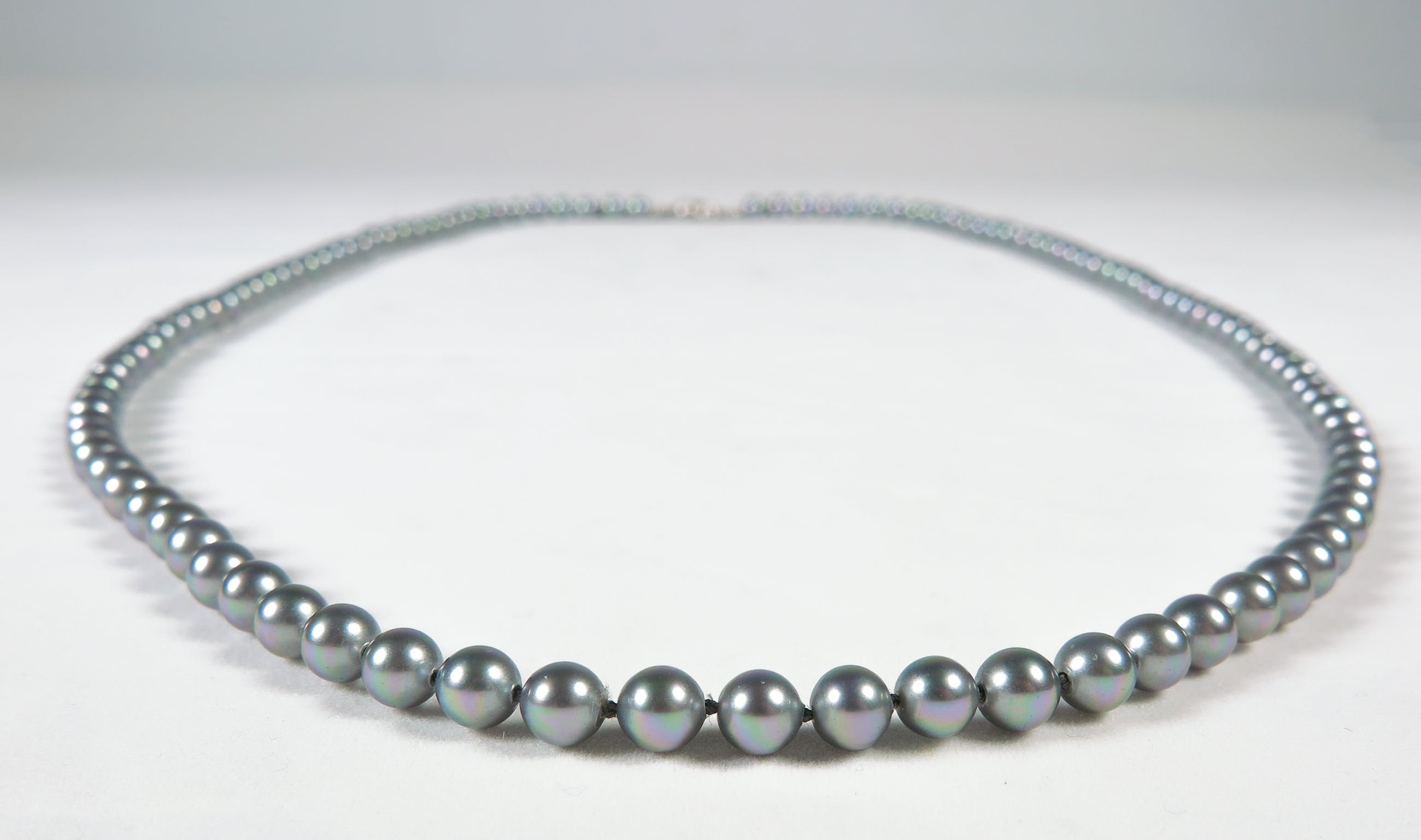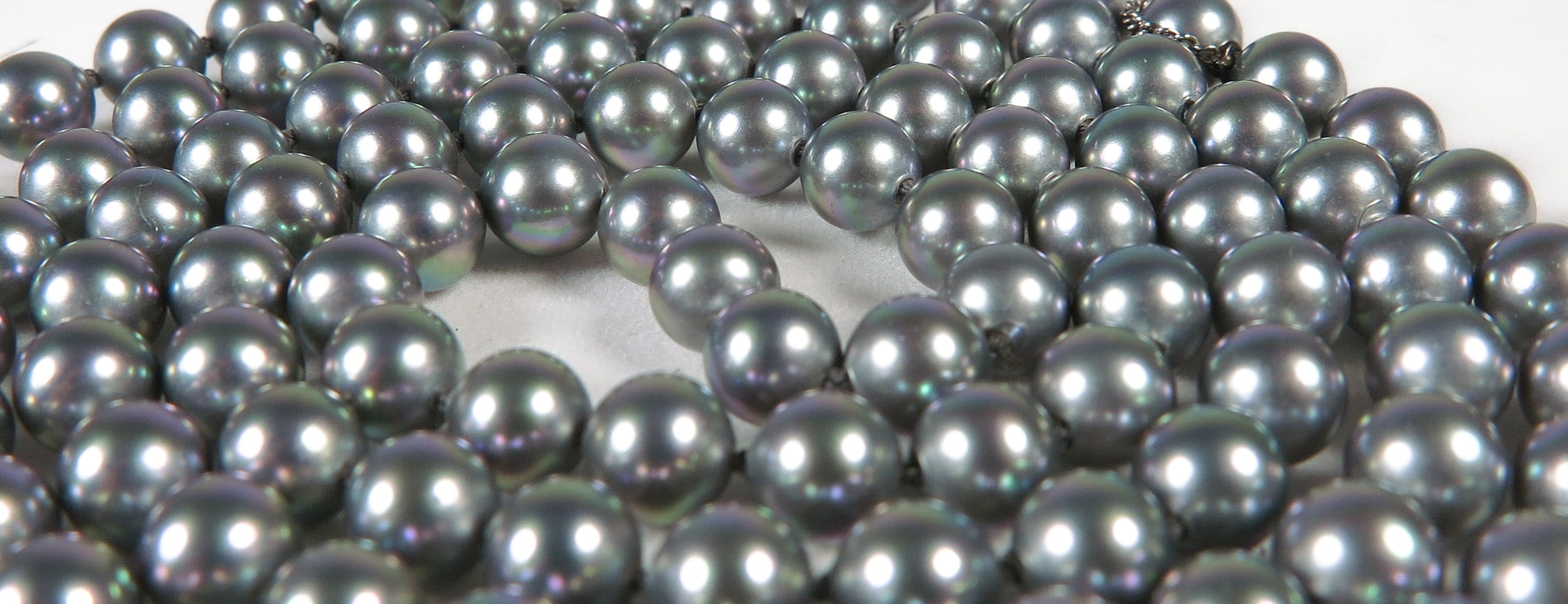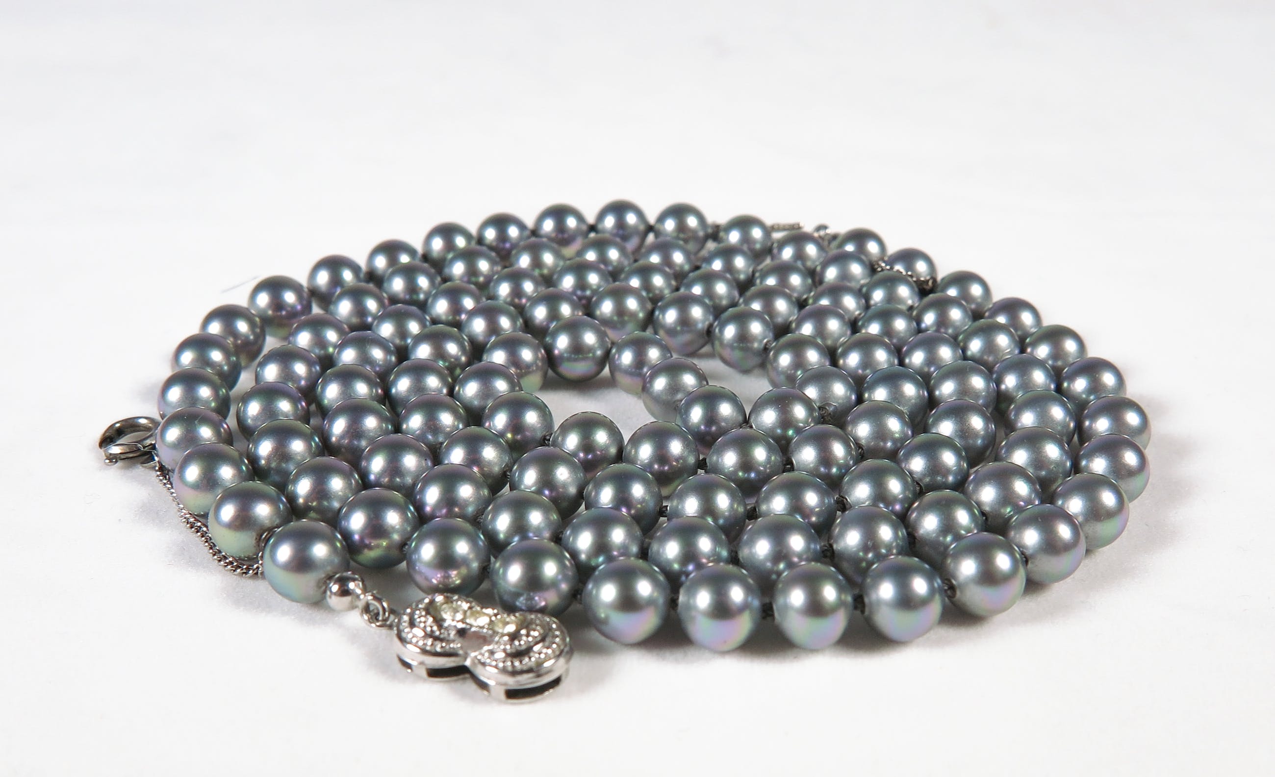 Collier van Majorica (synthetische) parels met een 2e gehalte zilveren (gemerkt 835) slot. Het collier heeft een lengte van 79 cm (het slot niet meegerekend).