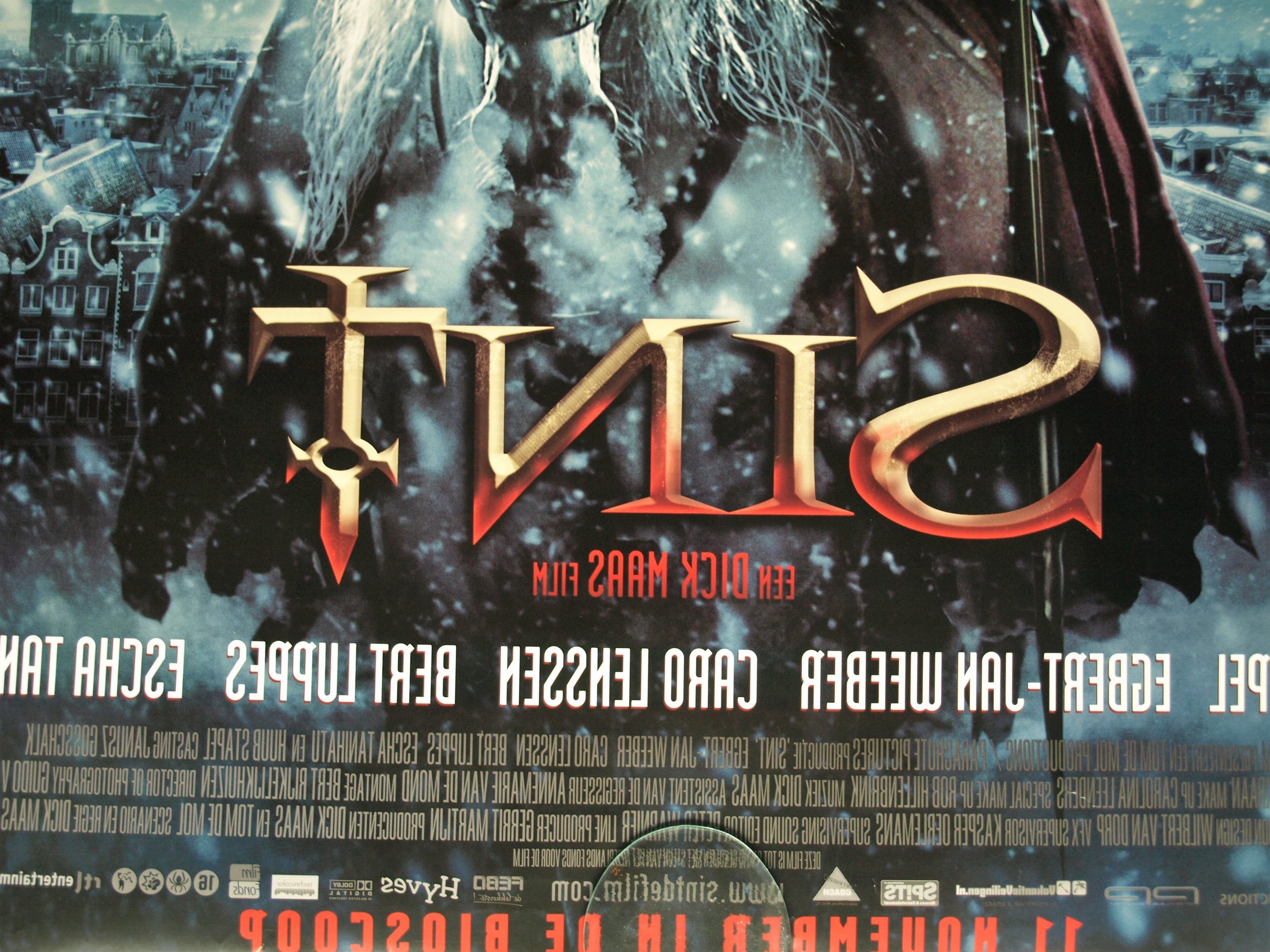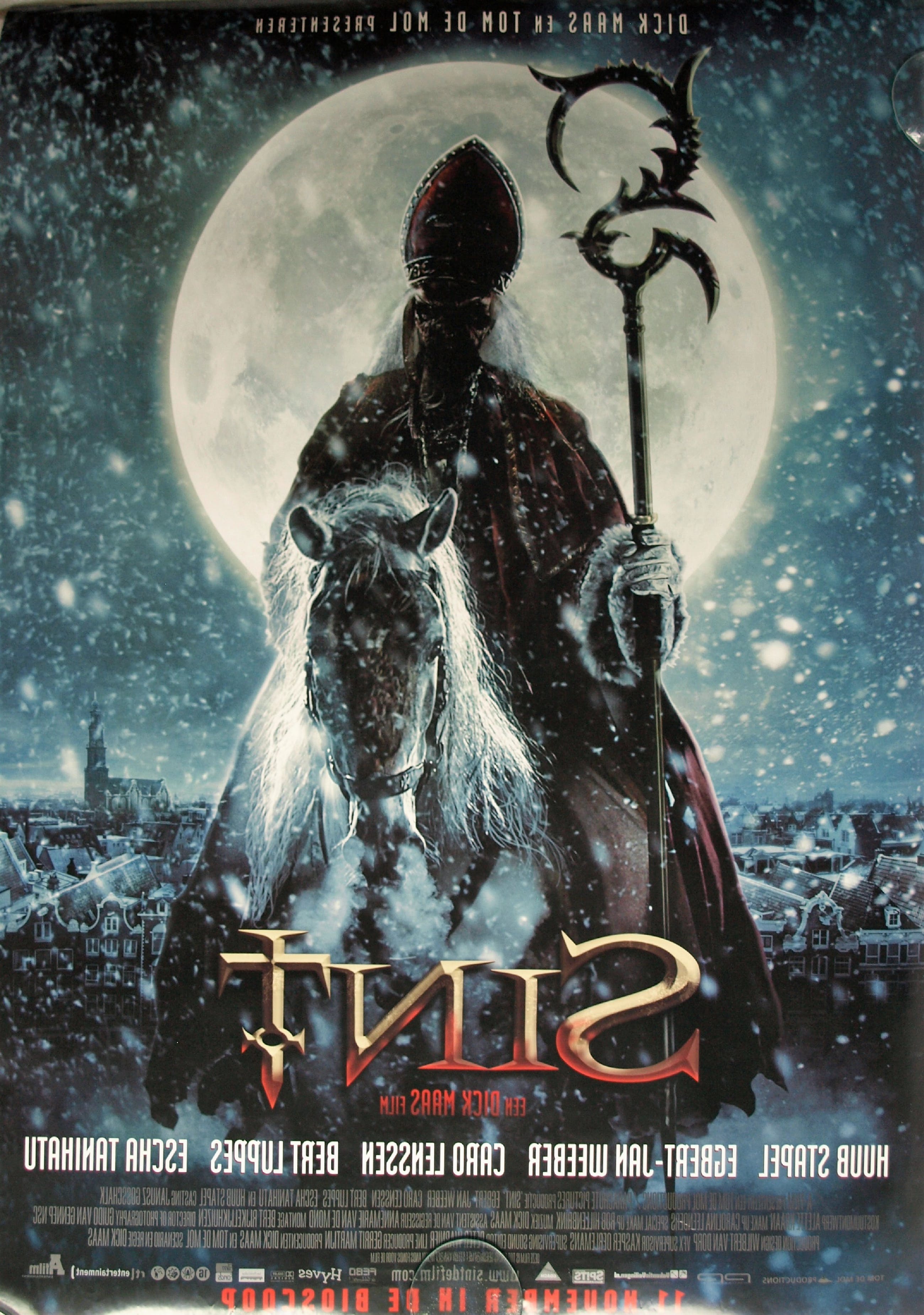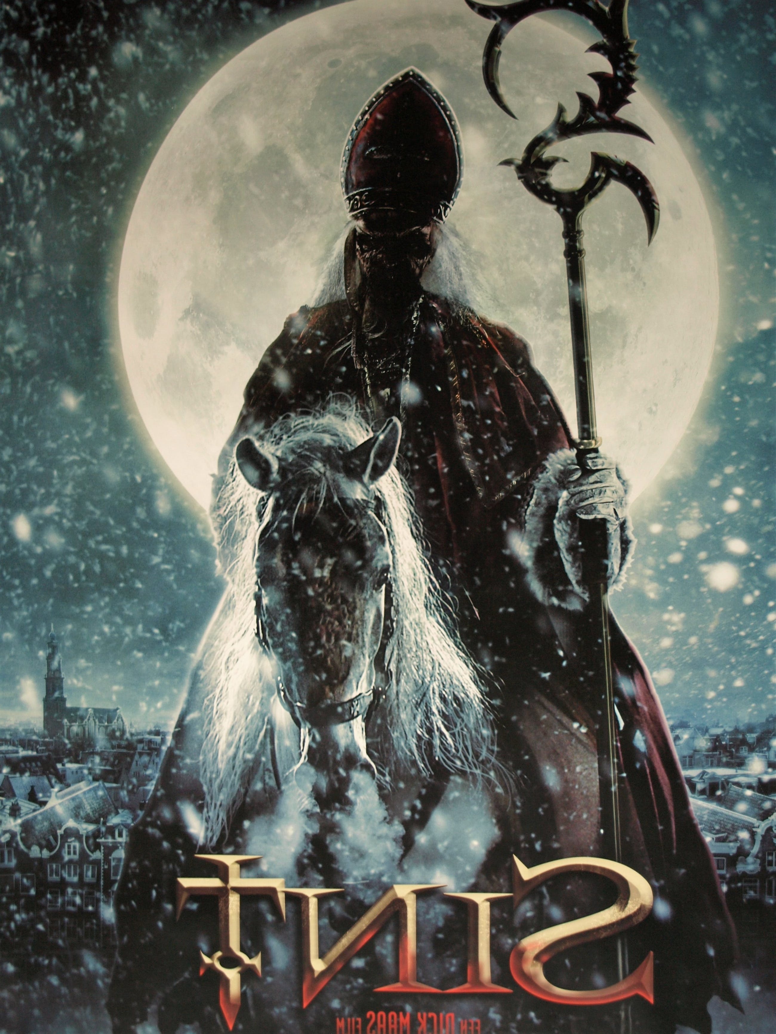 Een dubbelzijdig filmaffiche van de horrorfilm van Dick Maas “Sint” uit 2010, met in de hoofdrol Huub Stapel als St. Niklas, de in ongenade gevallen bisschop uit de 15e eeuw, die met een bende rovers plunderend en moordend door de straten trok.