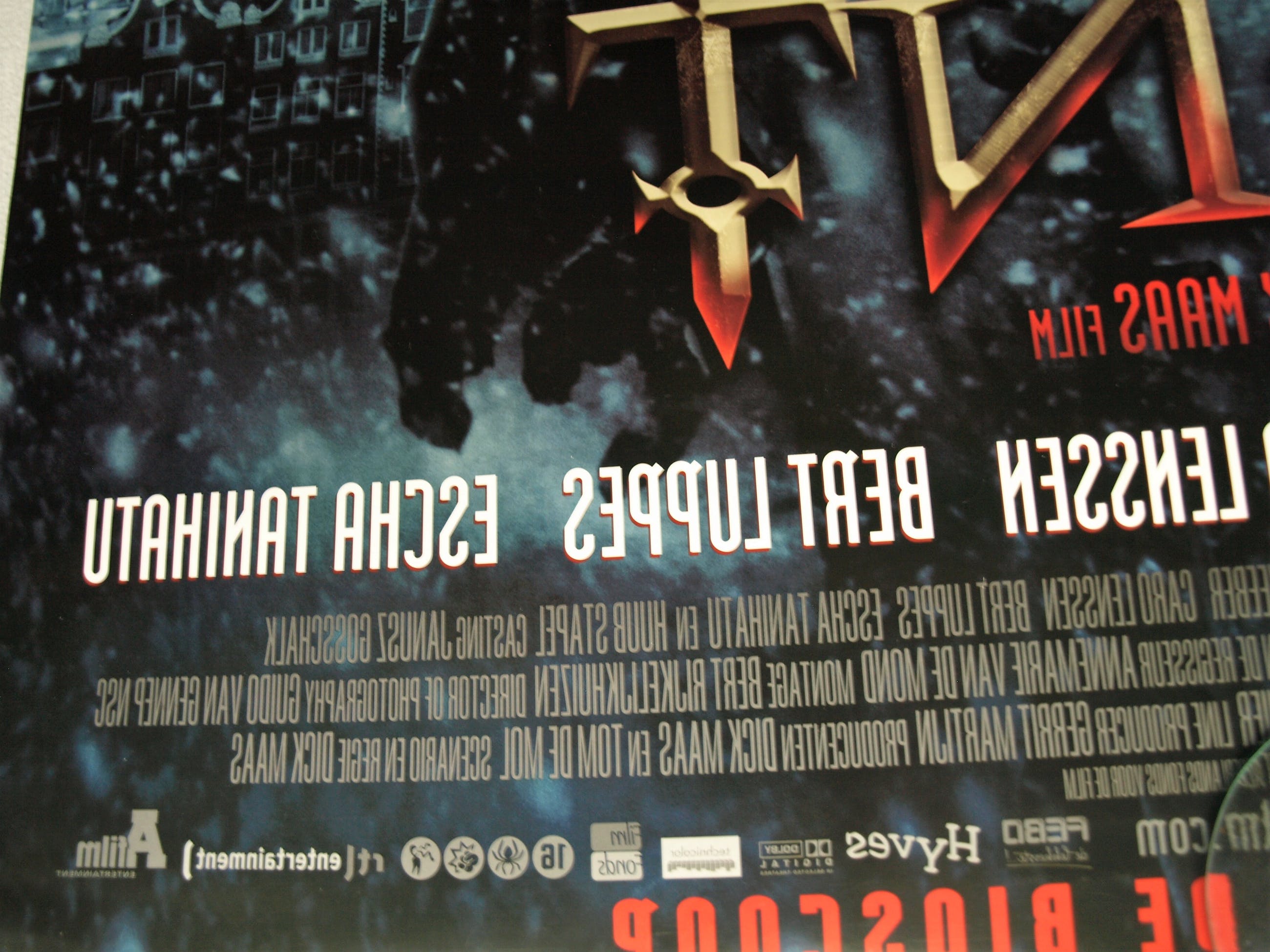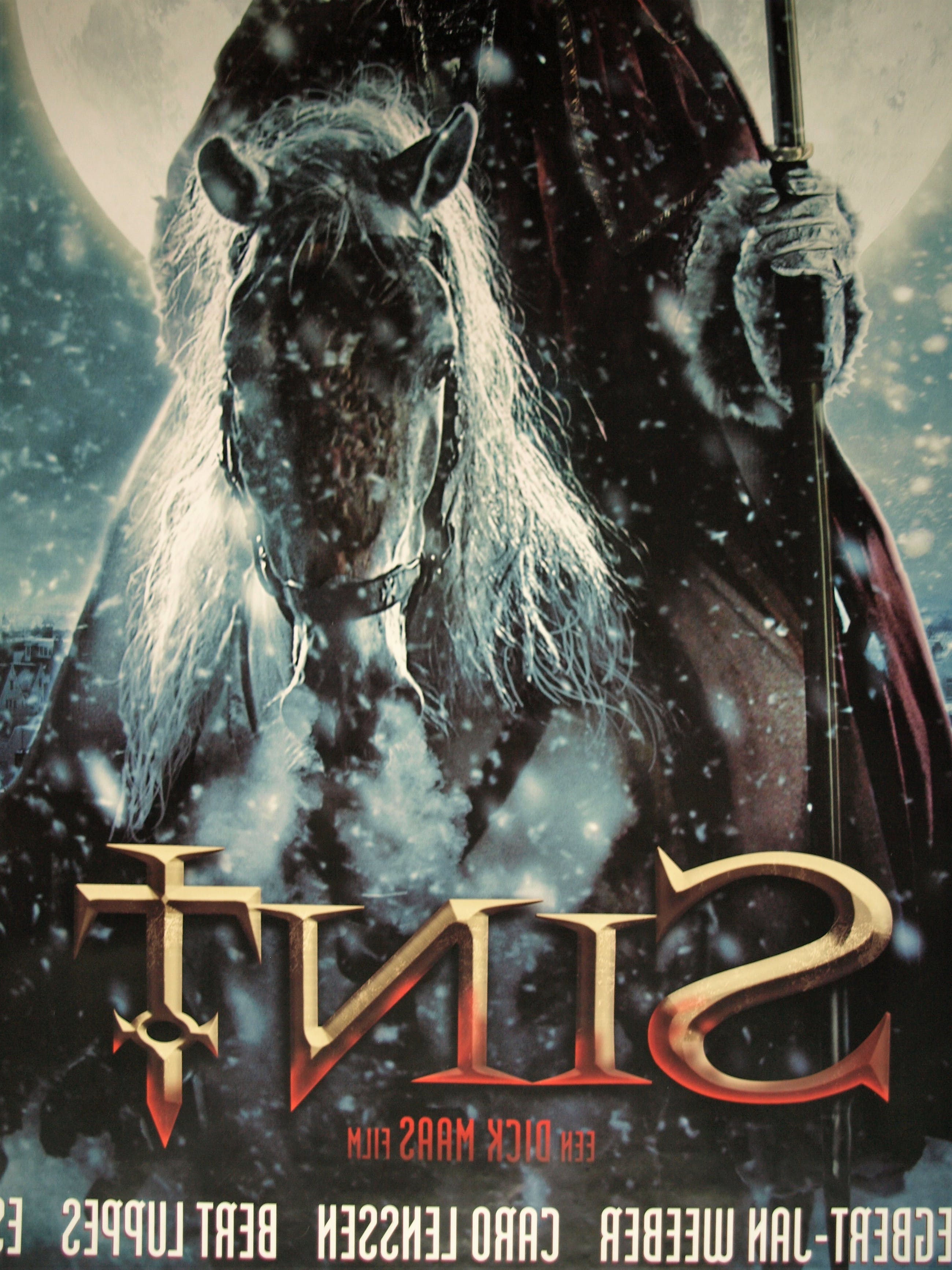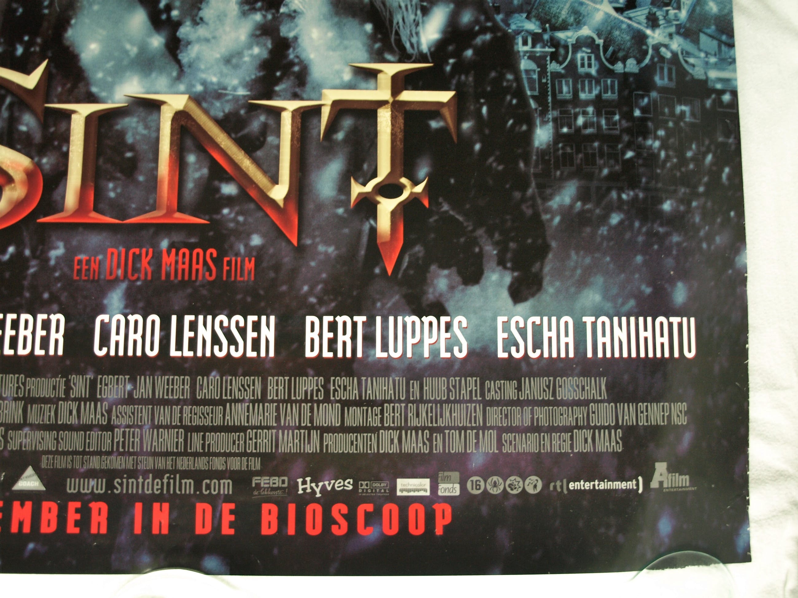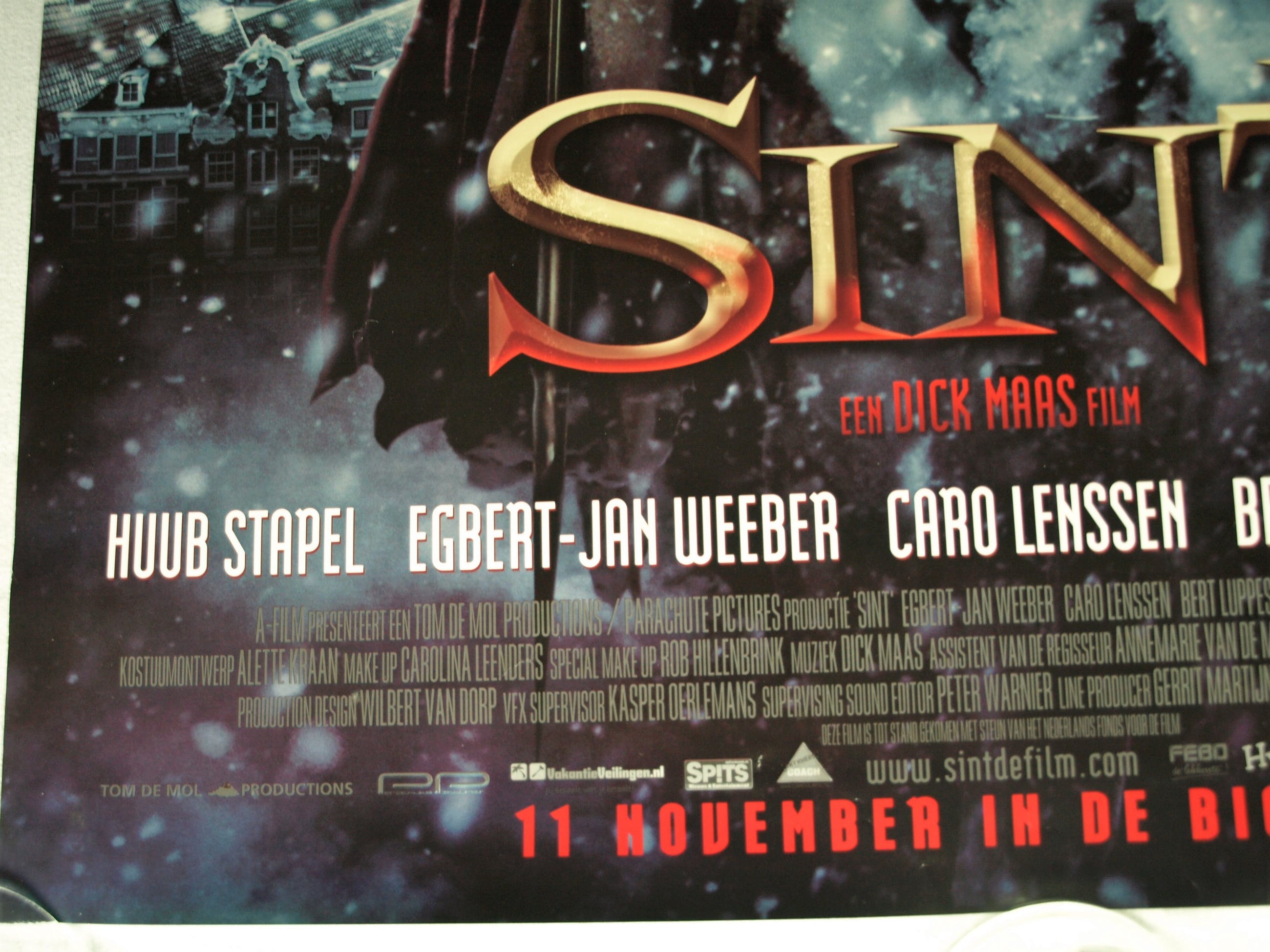 Een dubbelzijdig filmaffiche van de horrorfilm van Dick Maas “Sint” uit 2010, met in de hoofdrol Huub Stapel als St. Niklas, de in ongenade gevallen bisschop uit de 15e eeuw, die met een bende rovers plunderend en moordend door de straten trok.