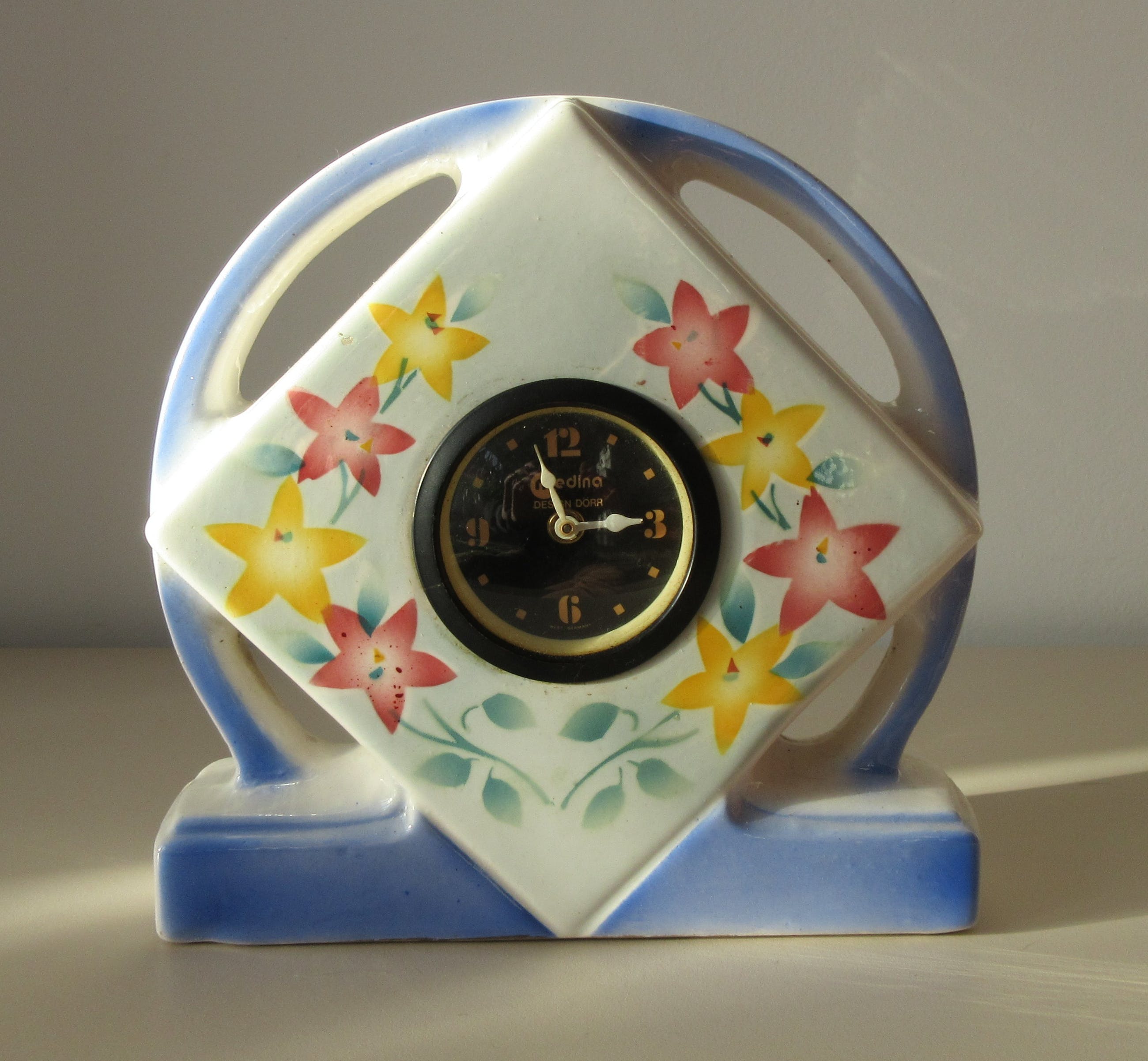 Leuk Art Deco aardewerken mantelklokje van Faience de Wasmuel uit Belgie met kleurrijke bloemdecoratie. Het uurwerkje werkt nog en is in prima conditie. Aan de onderzijde gemerkt, het merk is alleen wel wat versleten en vaag. Aan de achterzijde staat het modelnummer van het stuk aardewerk.