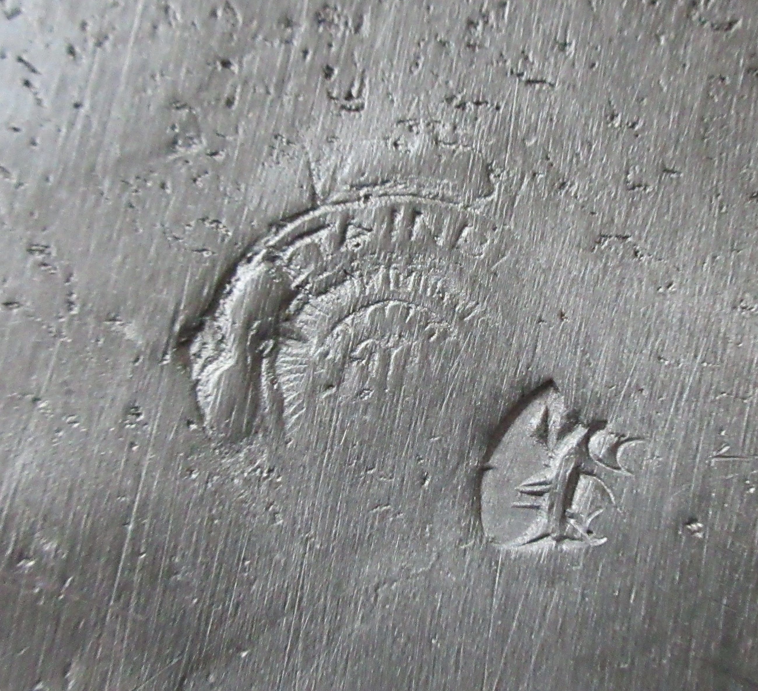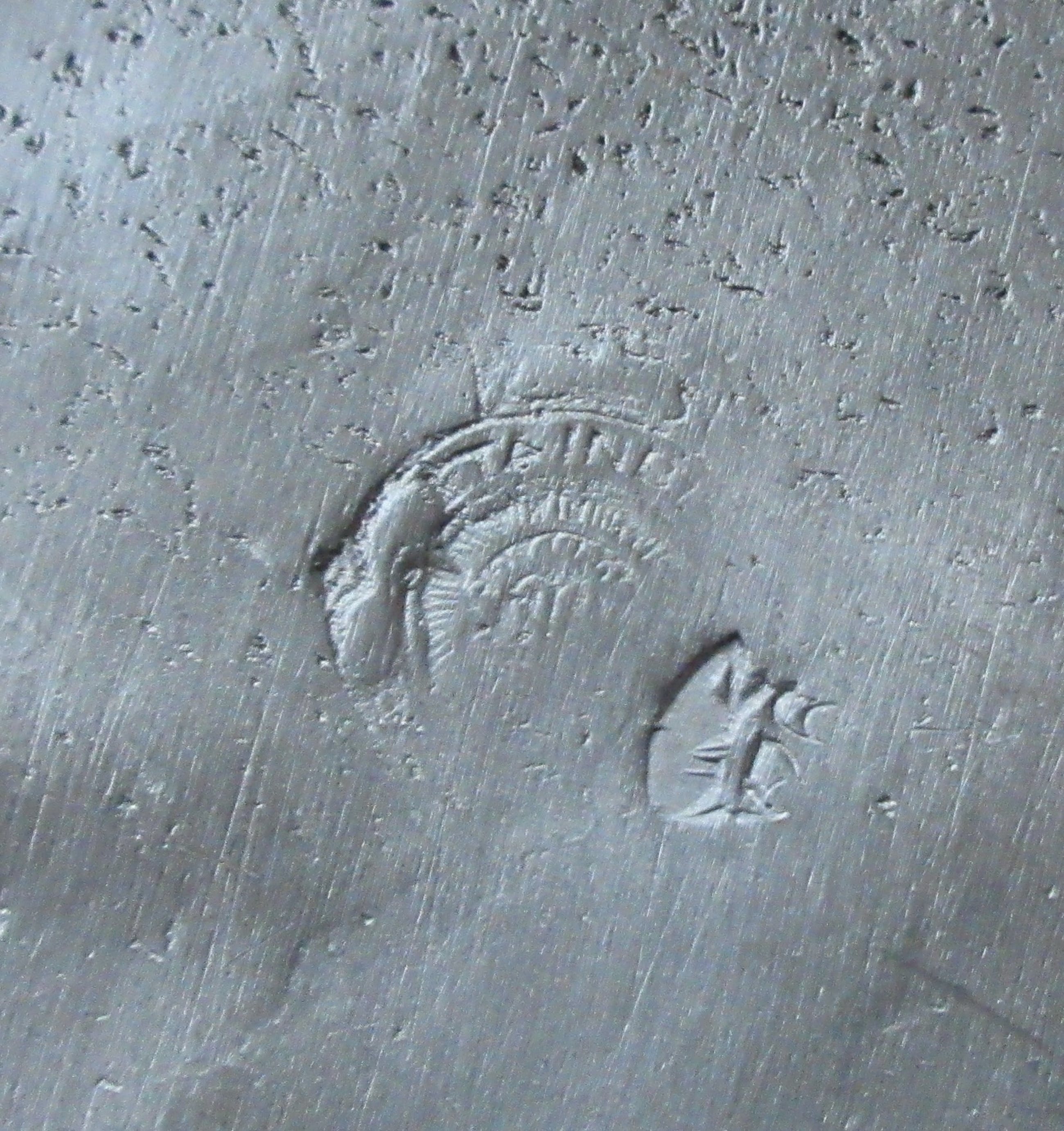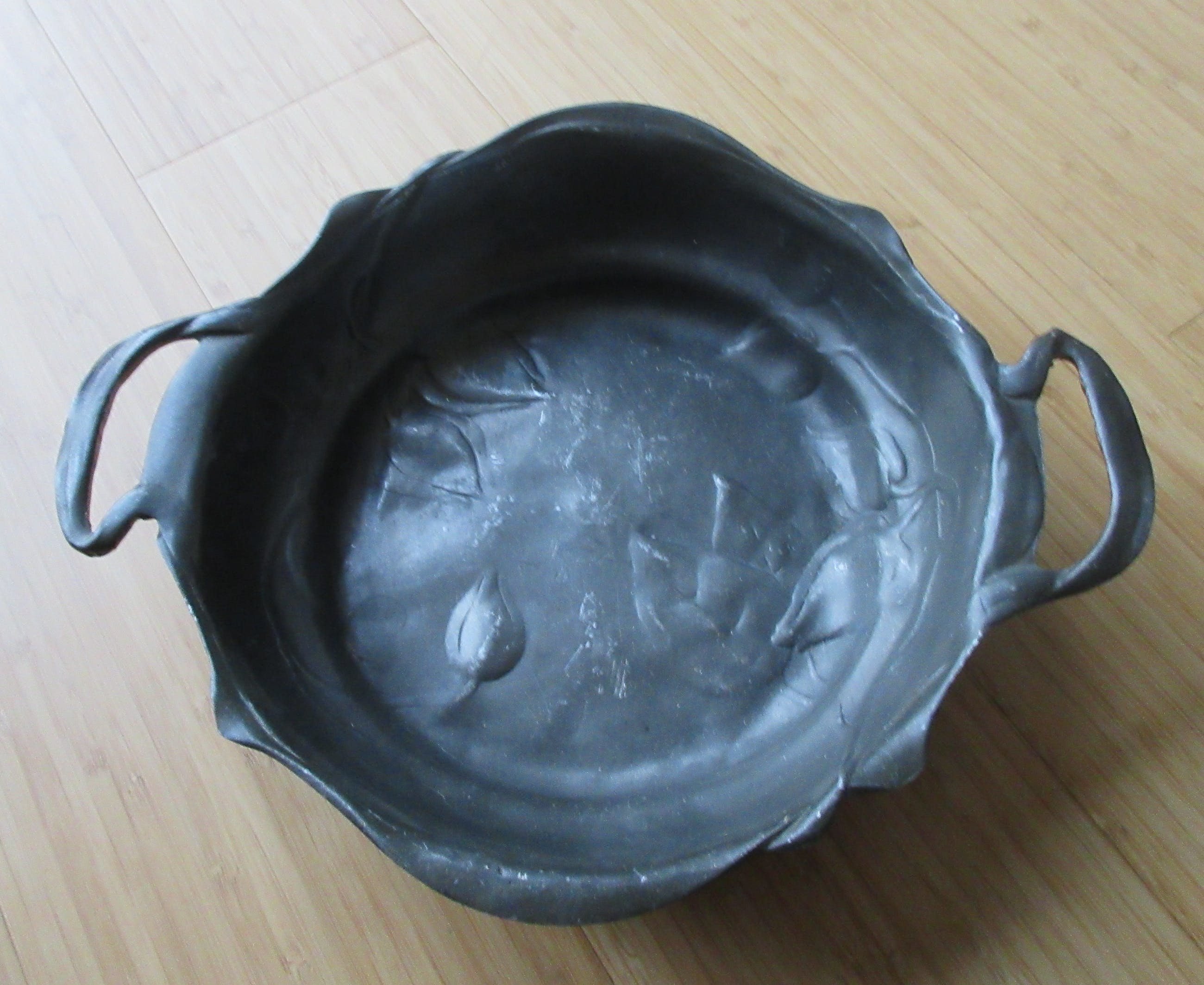 Franse Art nouveau tinnen hengselschaal. In goede gebruikte conditie en voorzien van ingedrukt merken aan de achterzijde.