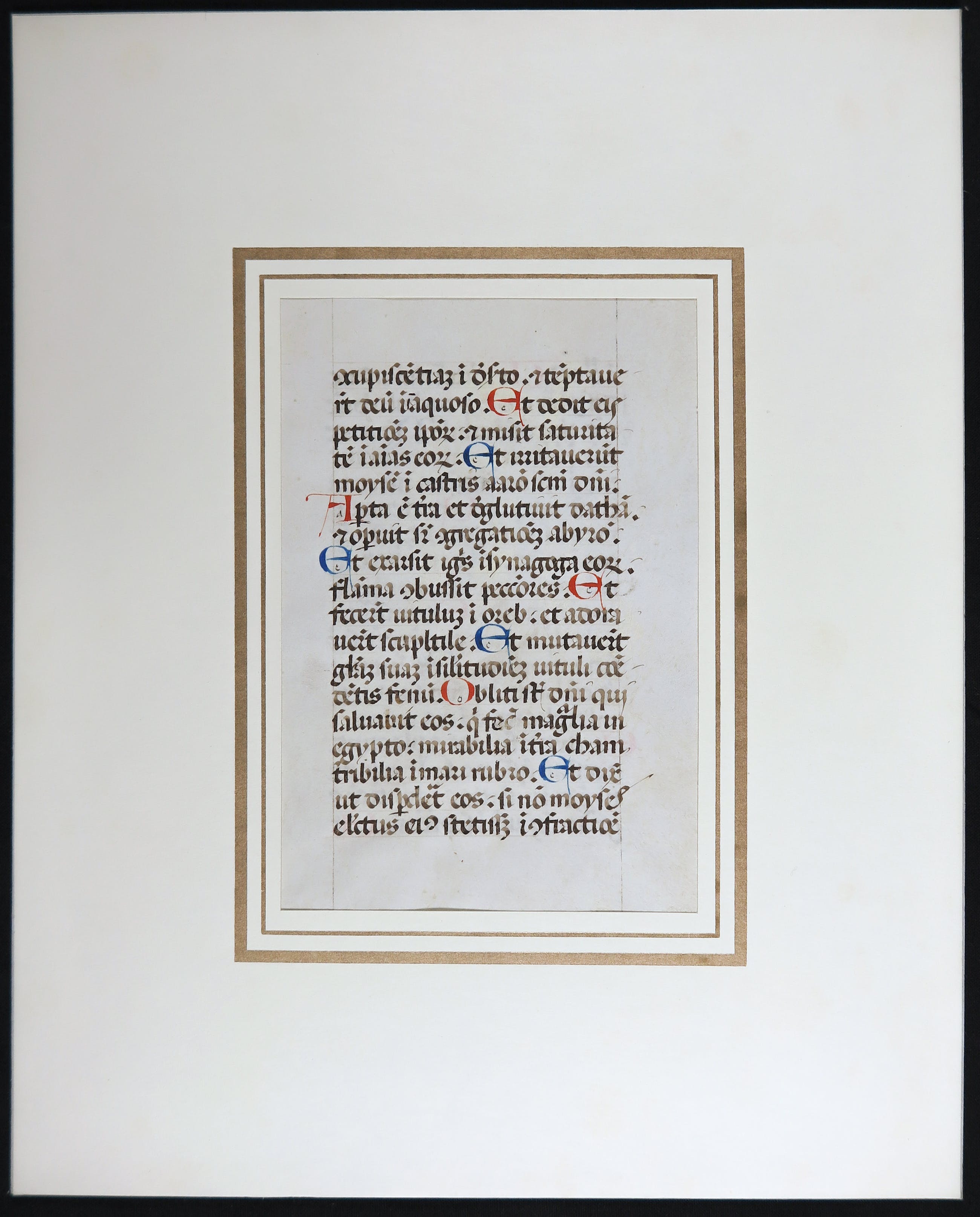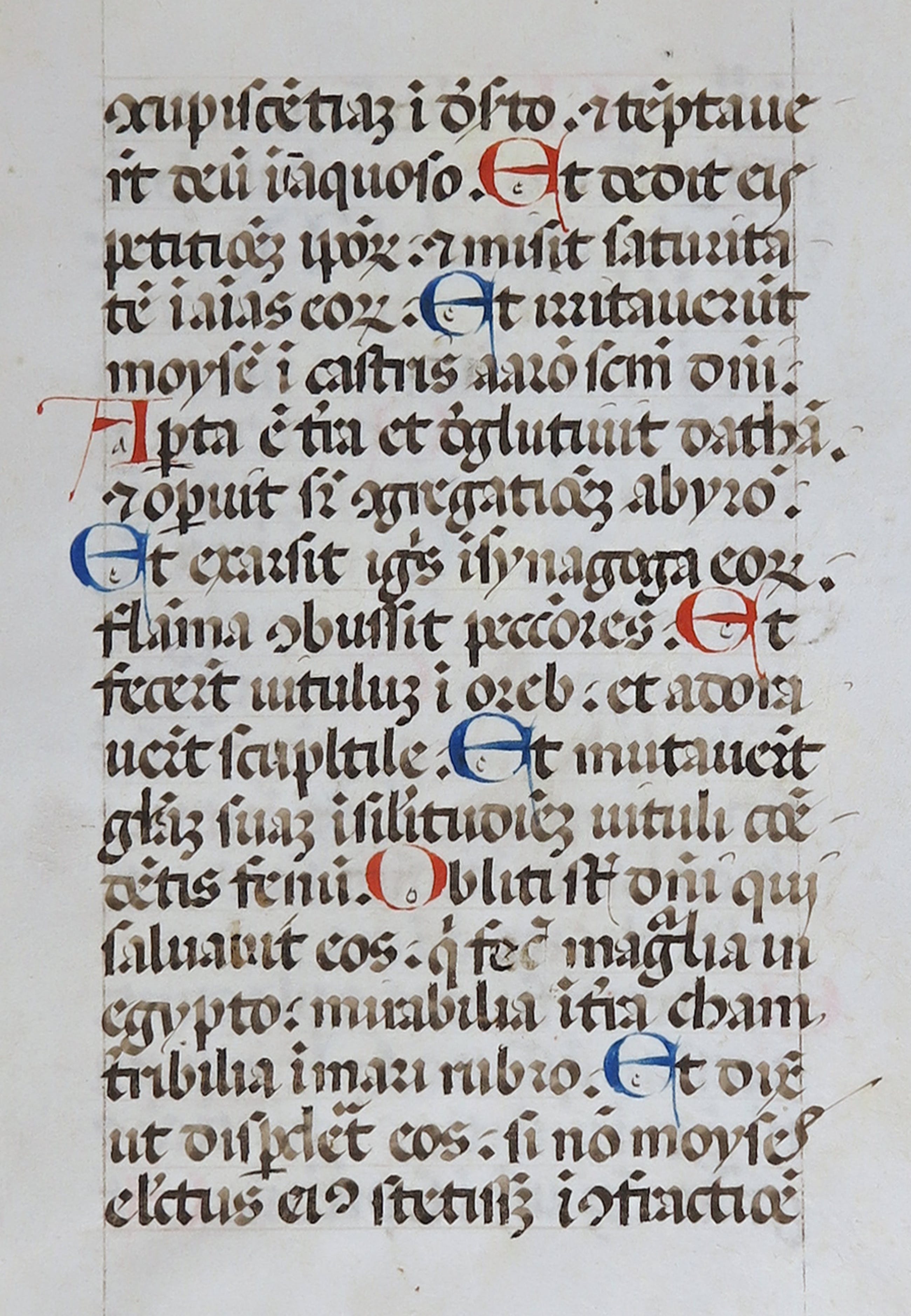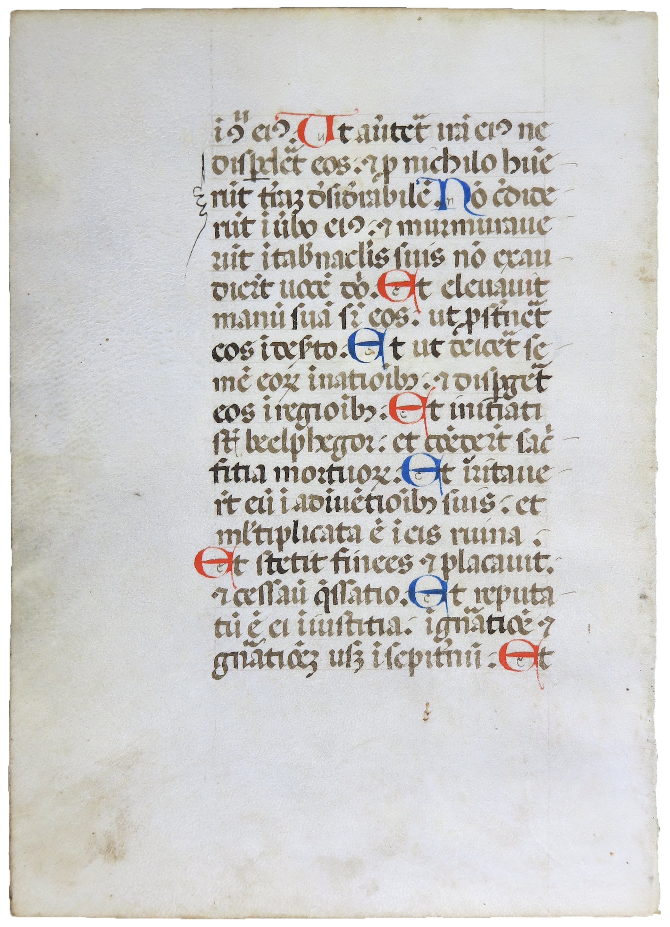 Vroeg perkament met geminiaturiseerde hoofdletters in rood en blauw, dubbelzijdig. Deze prachtig verluchte pagina op perkament is mooi versierd met initialen in rode en blauwe tinten. Dit is een bladfragment uit een getijdenboek van rond 1450. Tekst in latijn