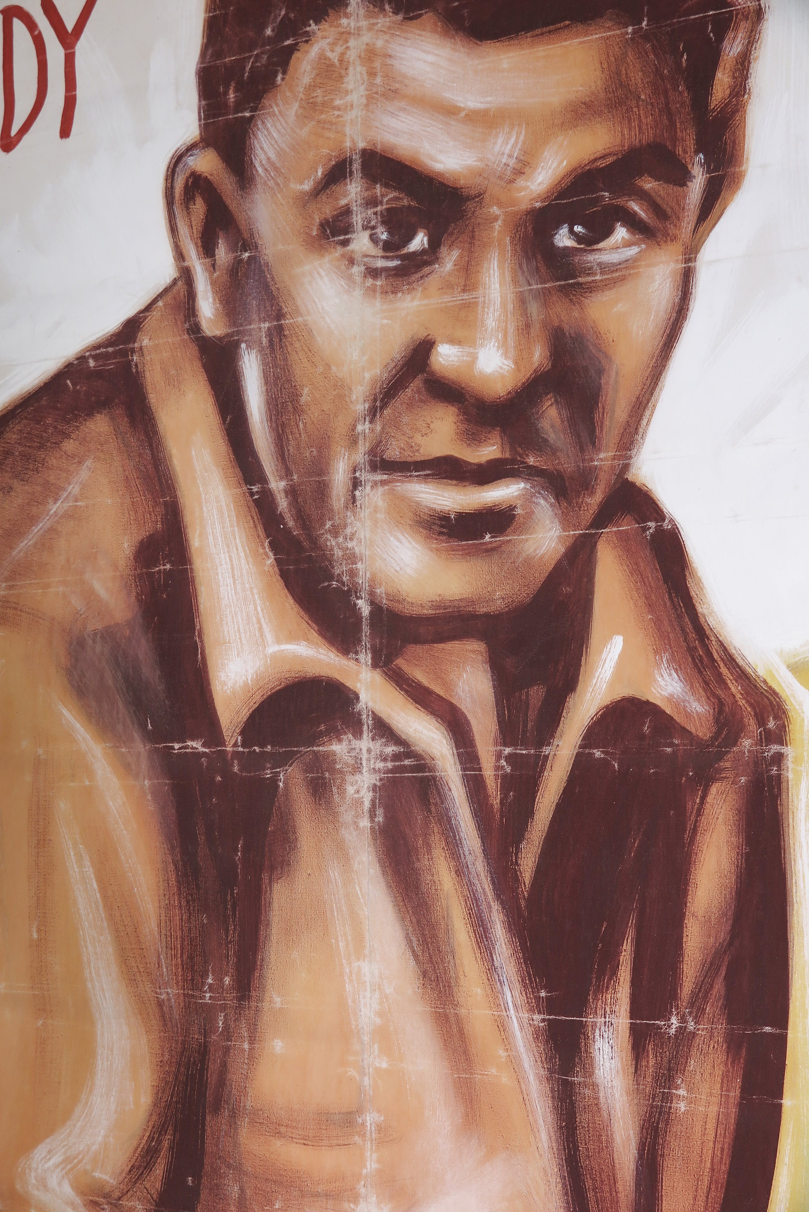 Zeer grote reclame/filmposter, geschilderd op doek. Het betreft een affiche van de film 'Moordenaars moeten ook sterven', welke in 1960 in Nederlandse bioscopen werd vertoond.
