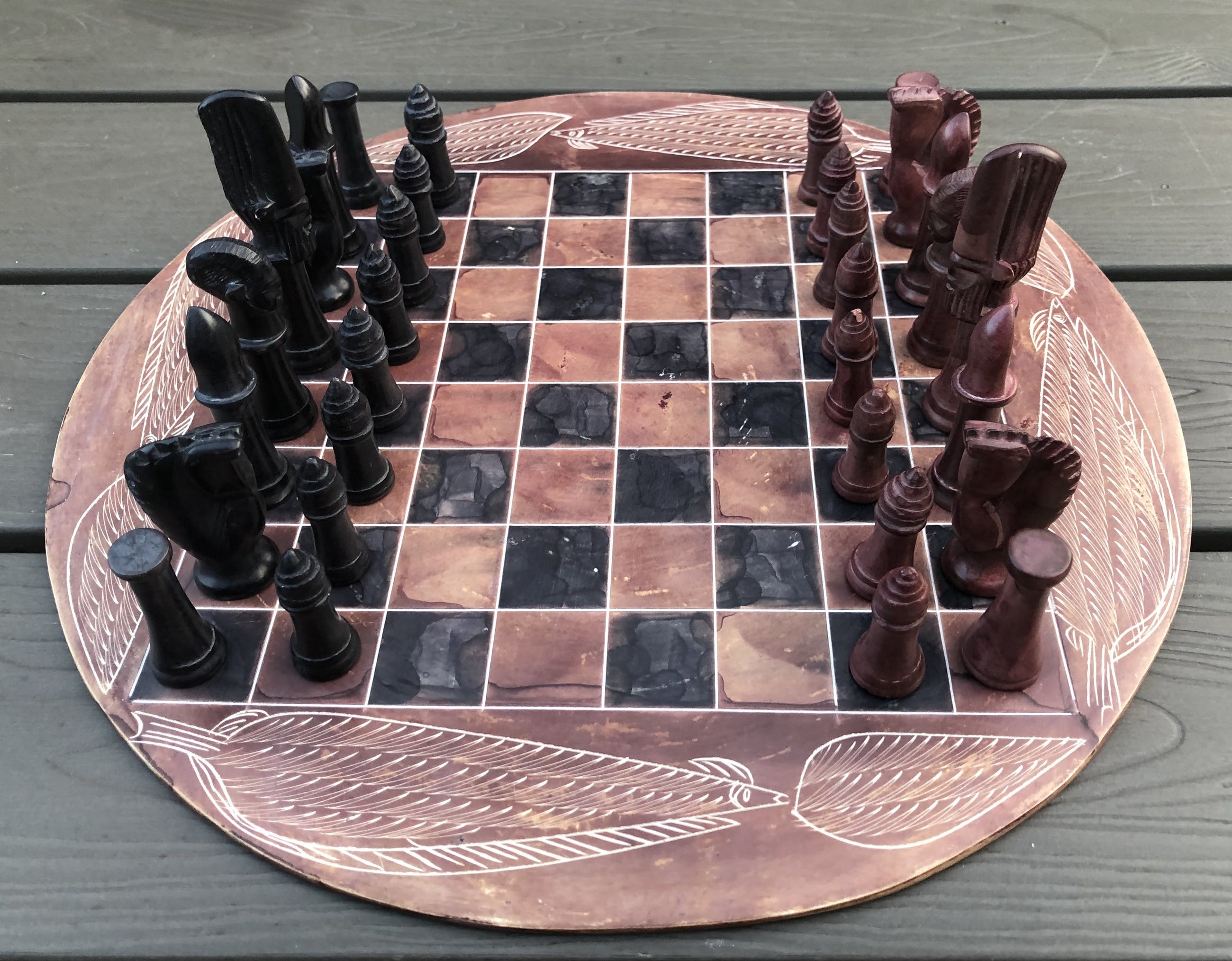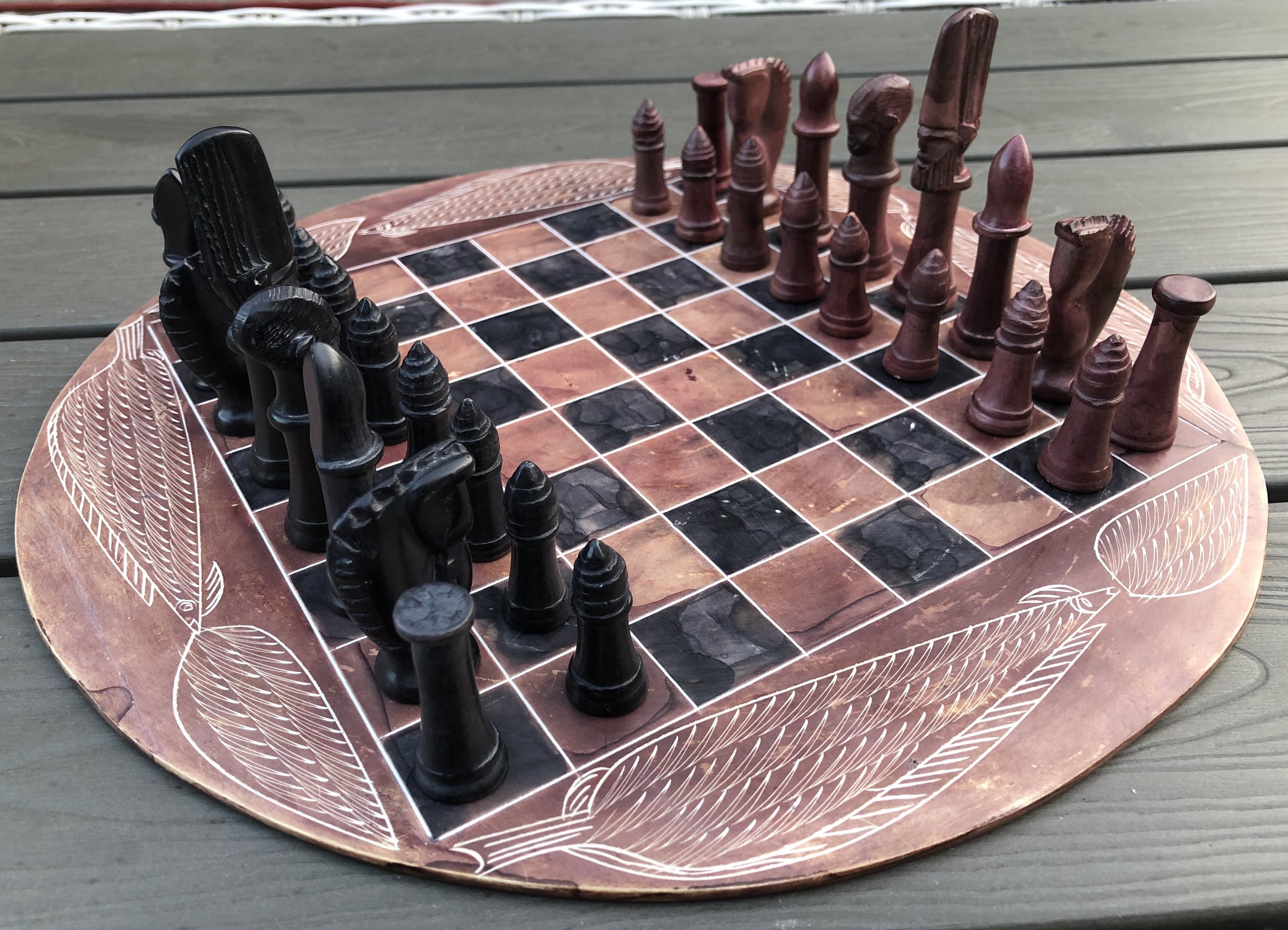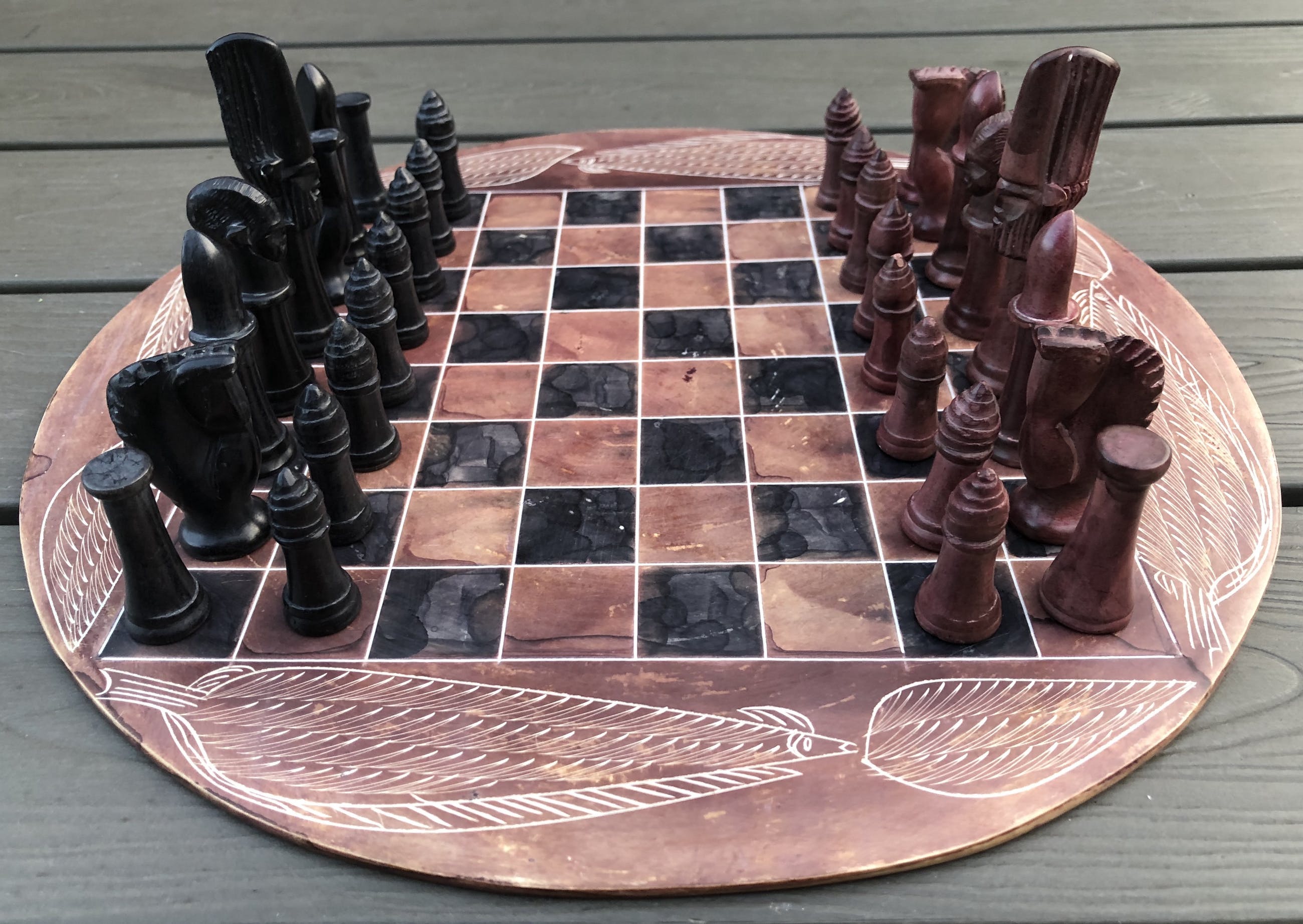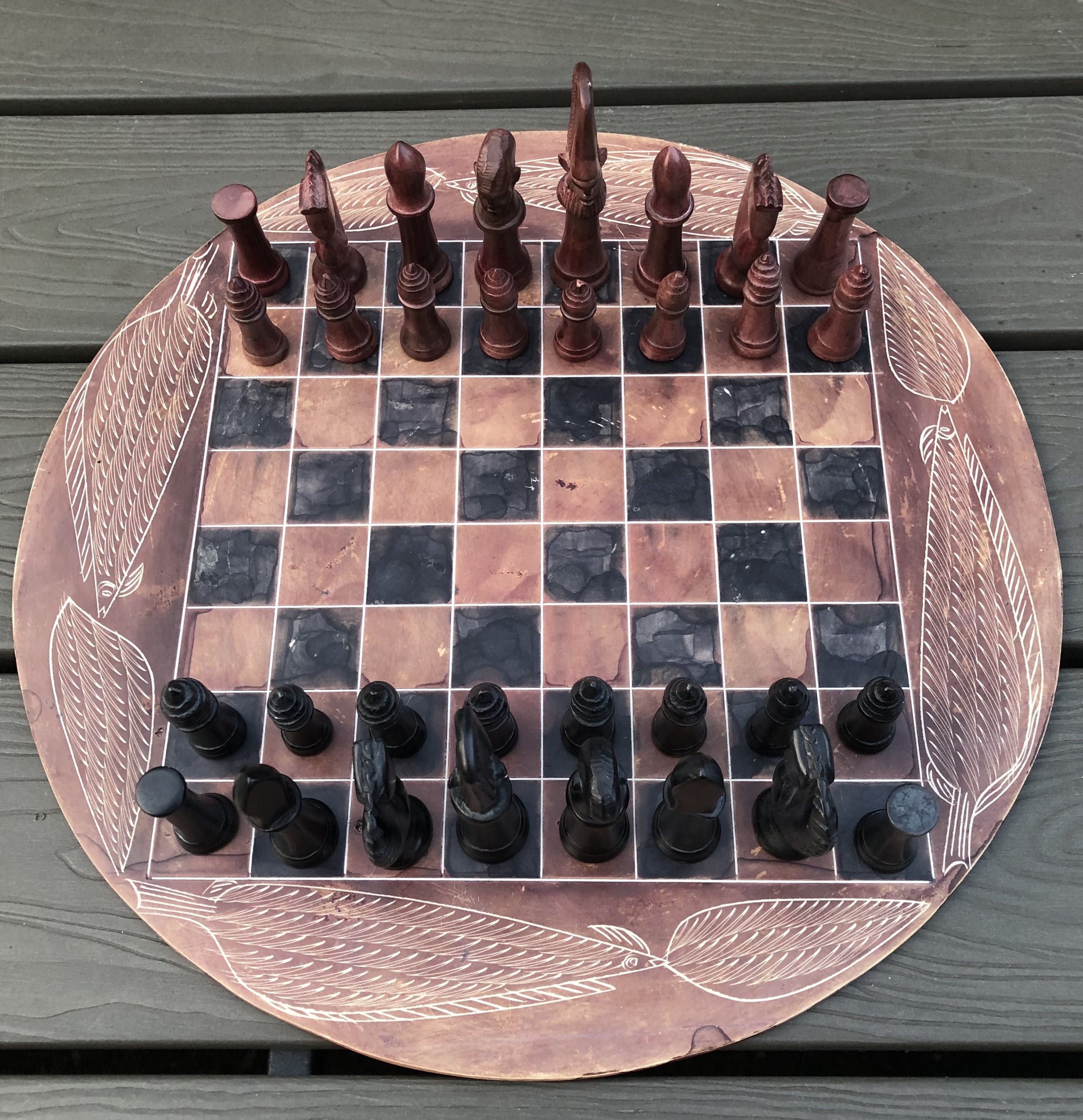 Rond speelbord van natuursteen en daardoor grillig motief, met ingeslepen afbeeldingen van bladeren. Mooie zwarte en roodbruine kleuren. Bijzondere stukken voor toren, loper, paard, koning en koningin. Geen enkele pion is gelijk. Hier en daar een minuscuul chipje. Zie foto's voor de exacte staat.