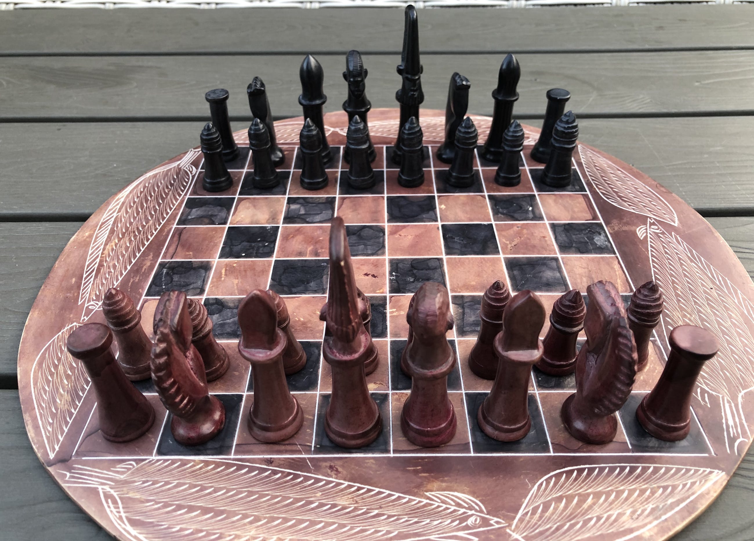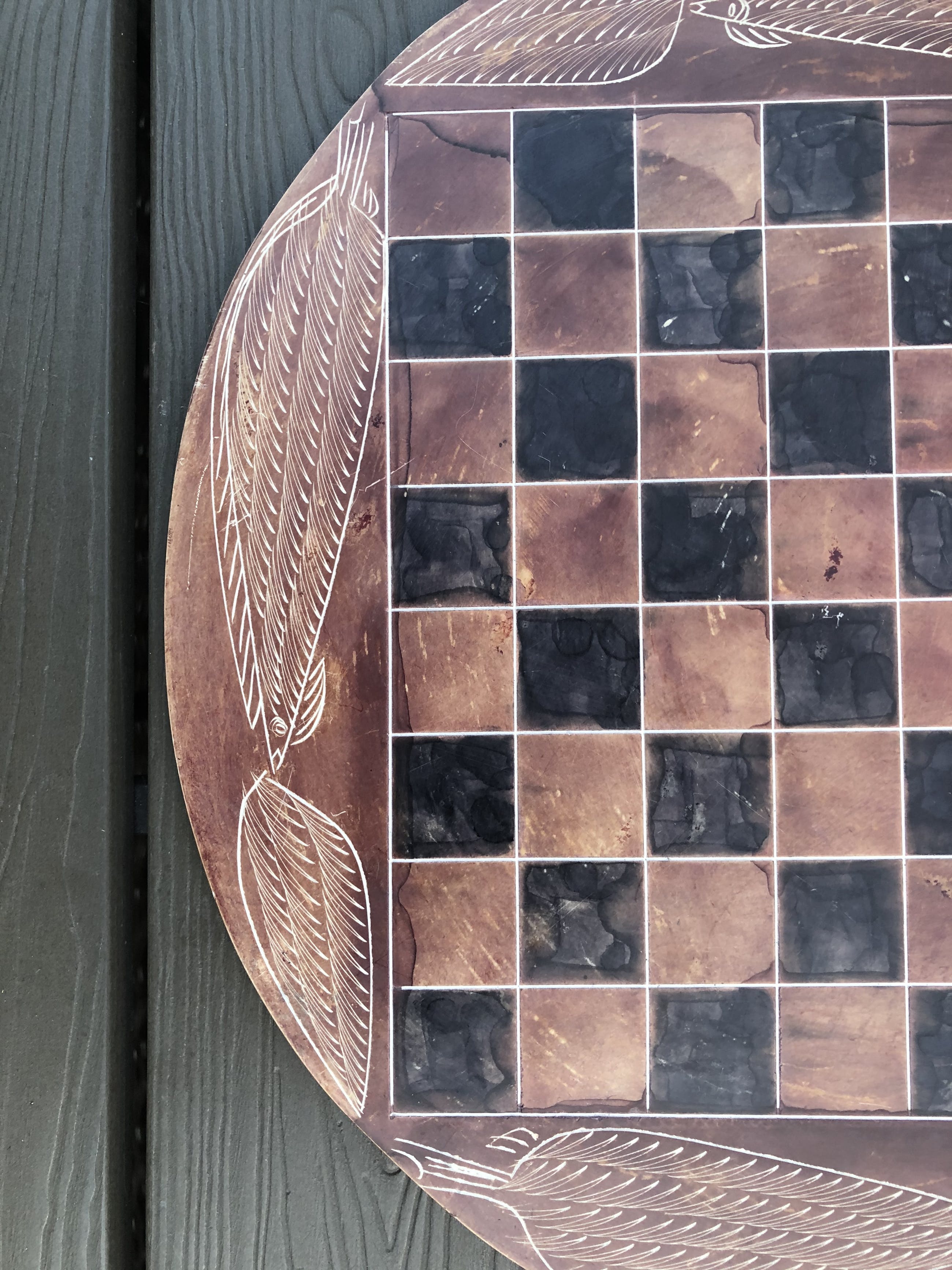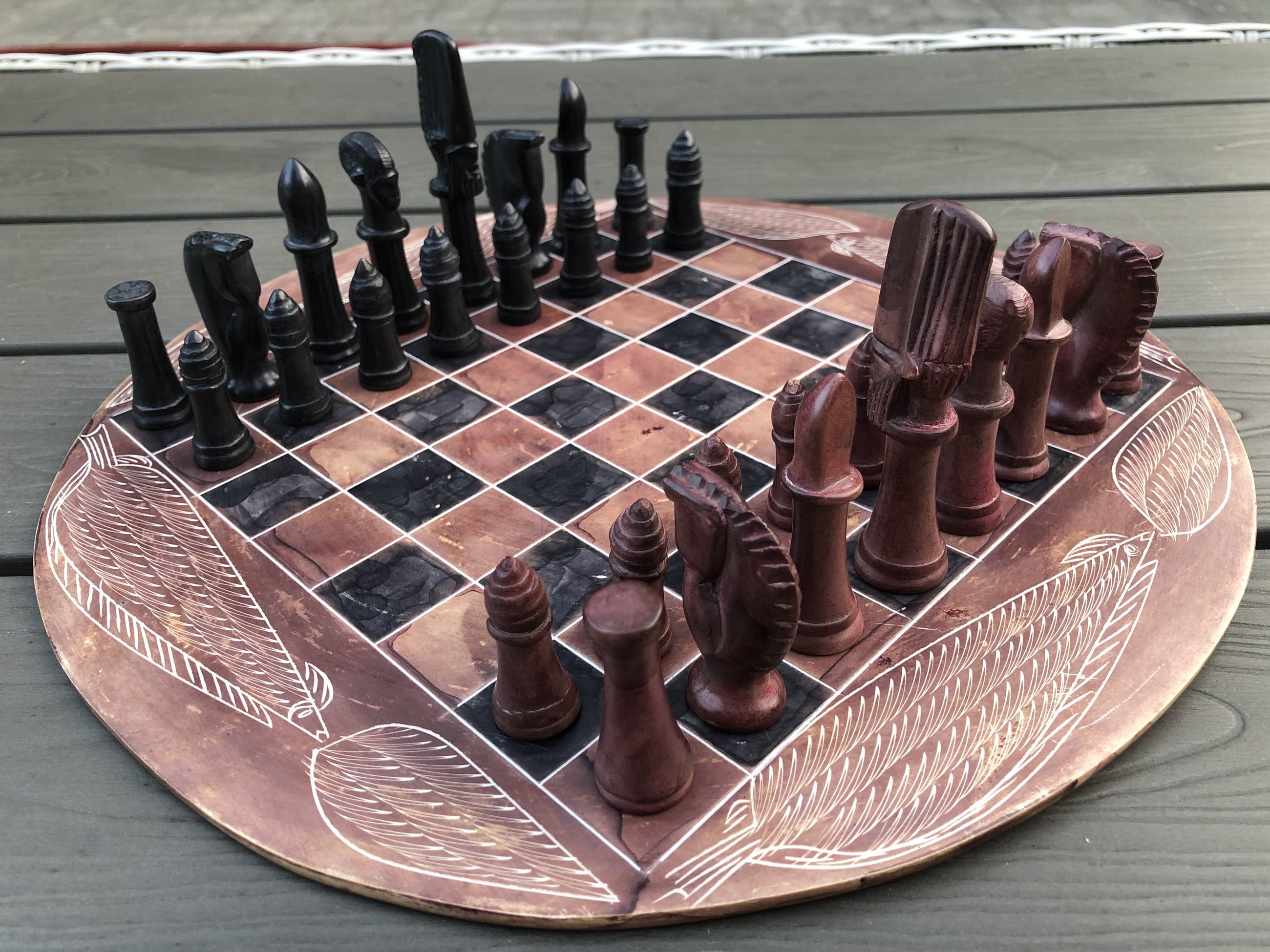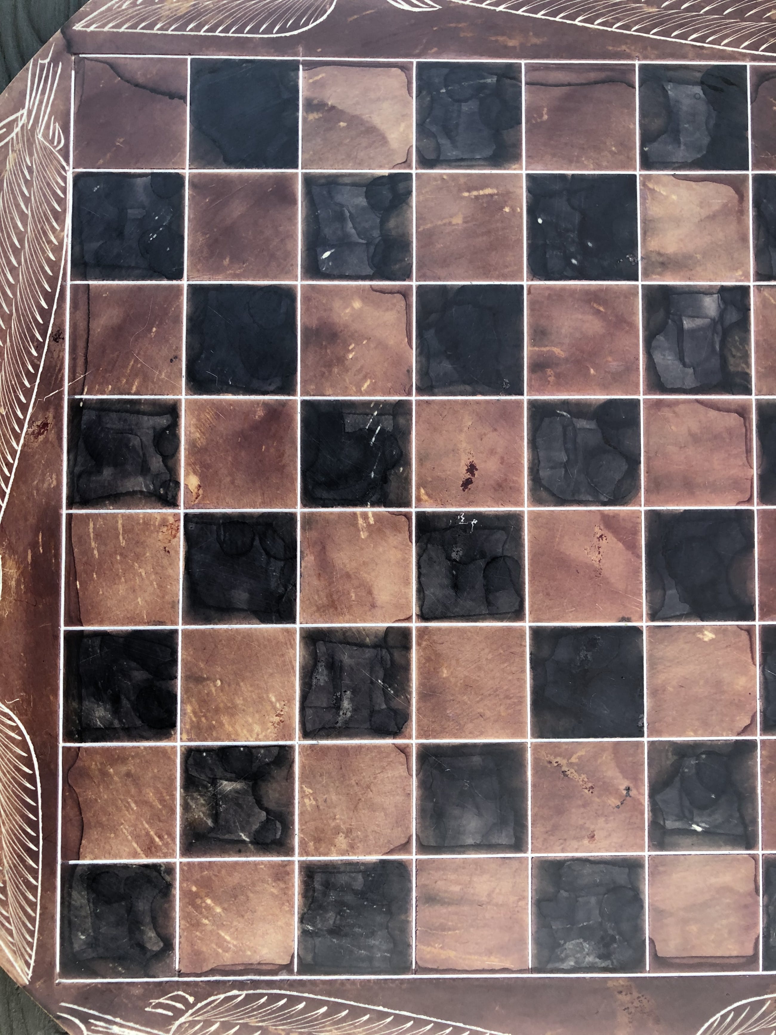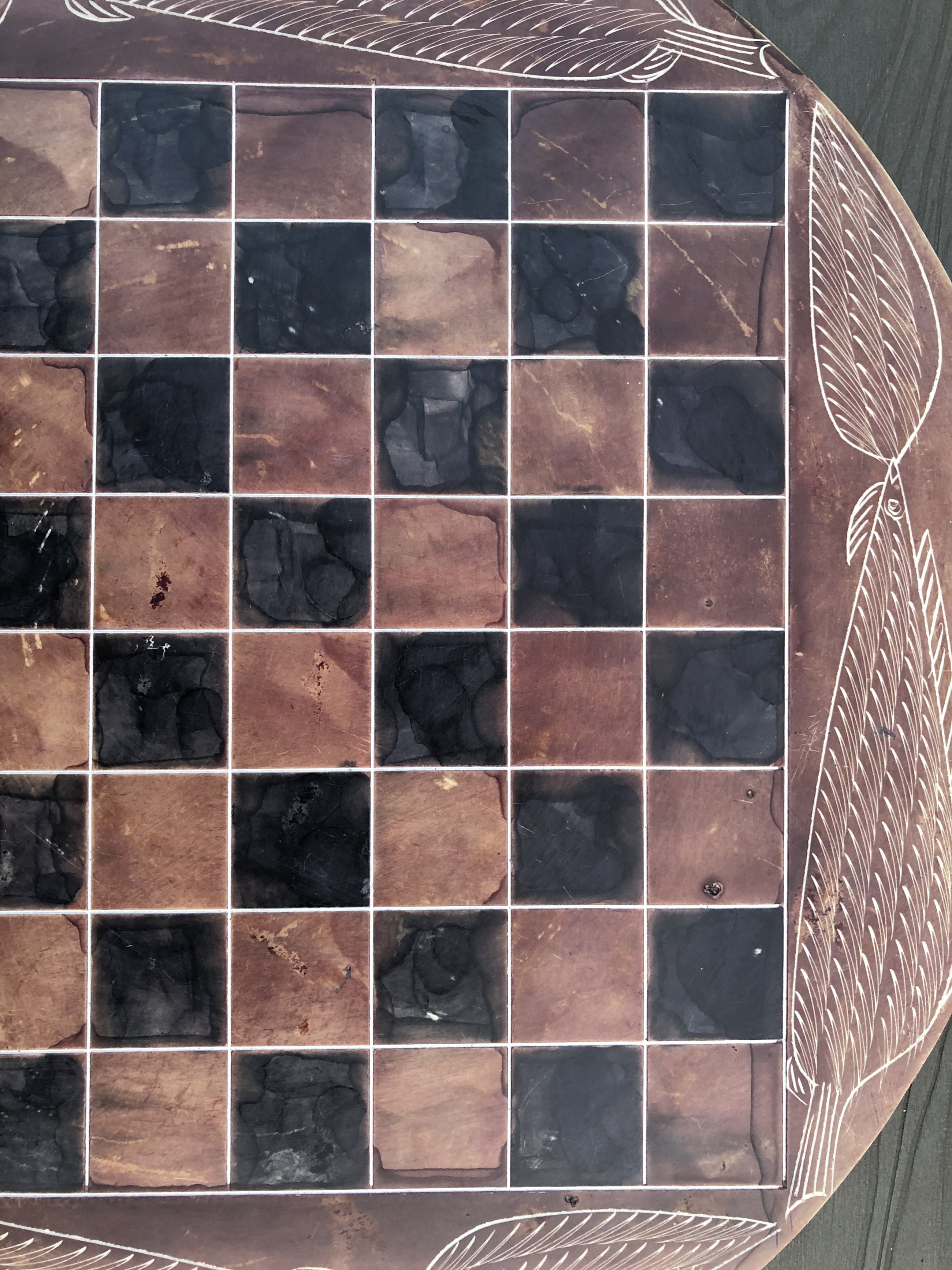 Rond speelbord van natuursteen en daardoor grillig motief, met ingeslepen afbeeldingen van bladeren. Mooie zwarte en roodbruine kleuren. Bijzondere stukken voor toren, loper, paard, koning en koningin. Geen enkele pion is gelijk. Hier en daar een minuscuul chipje. Zie foto's voor de exacte staat.