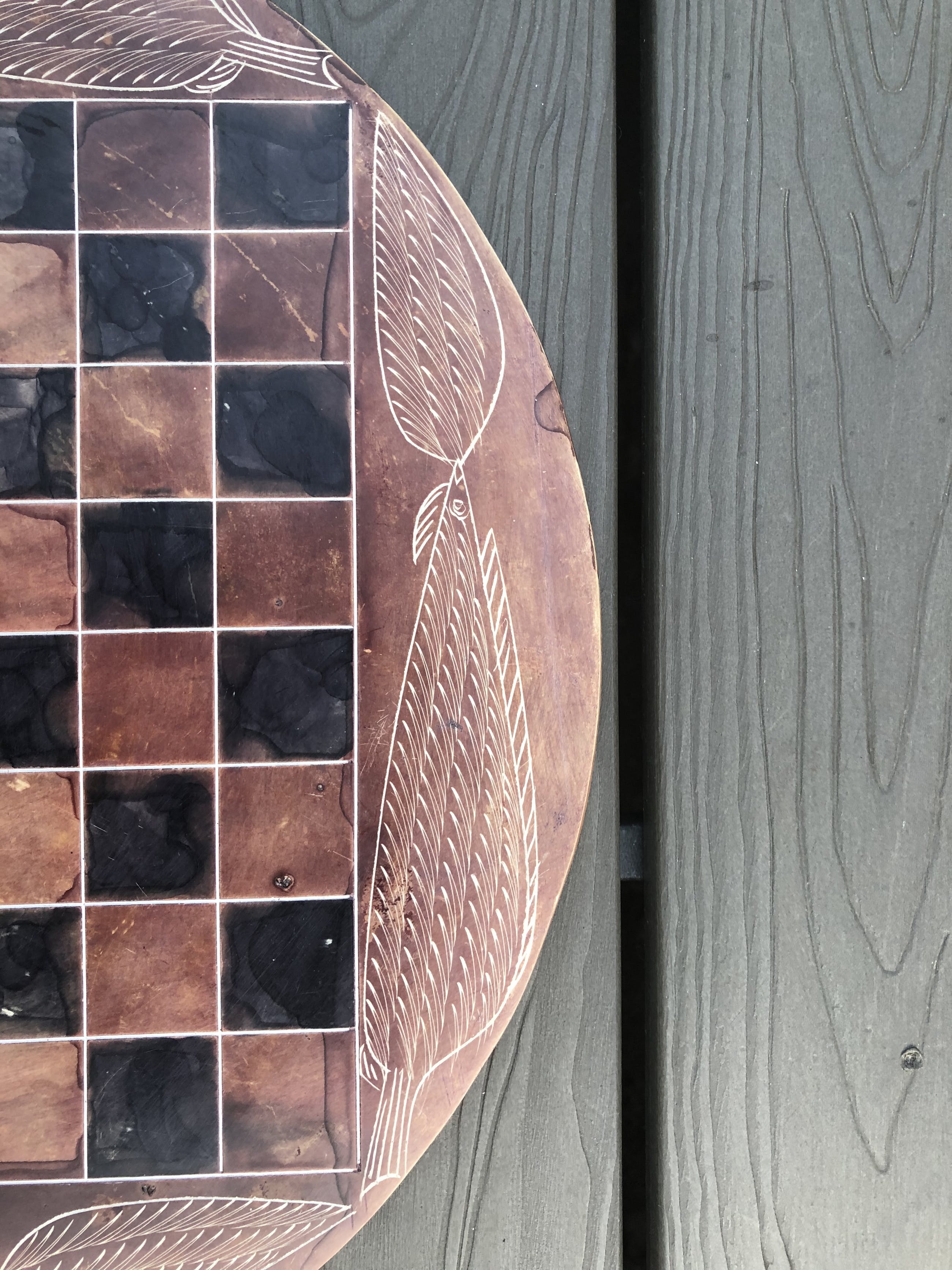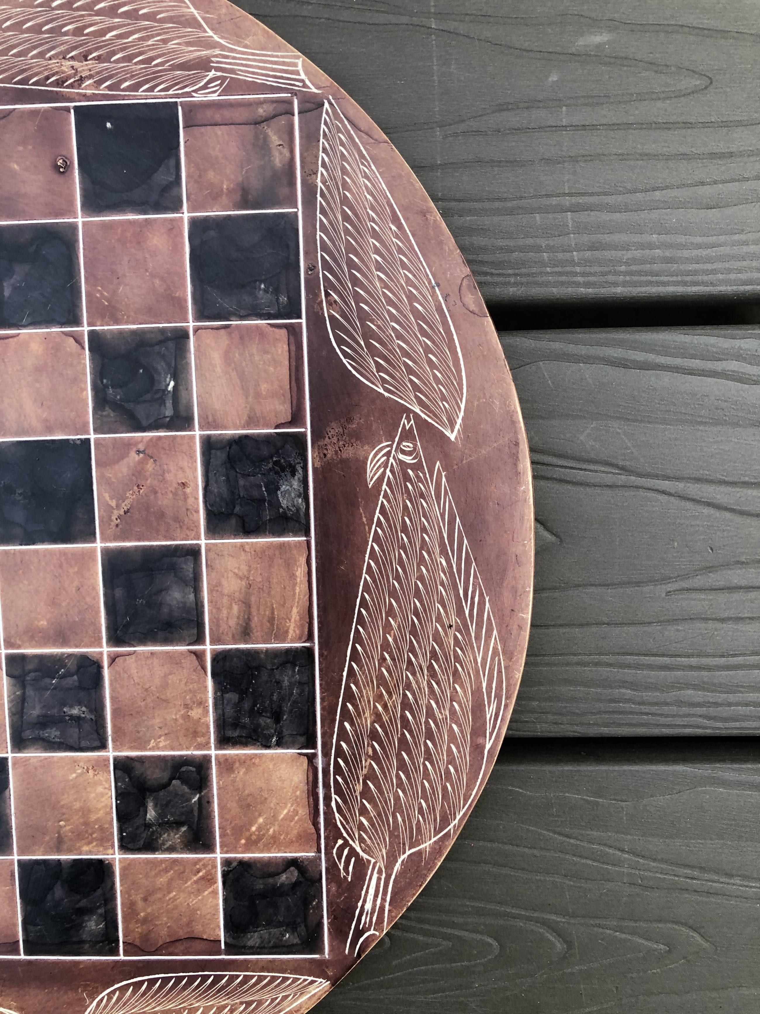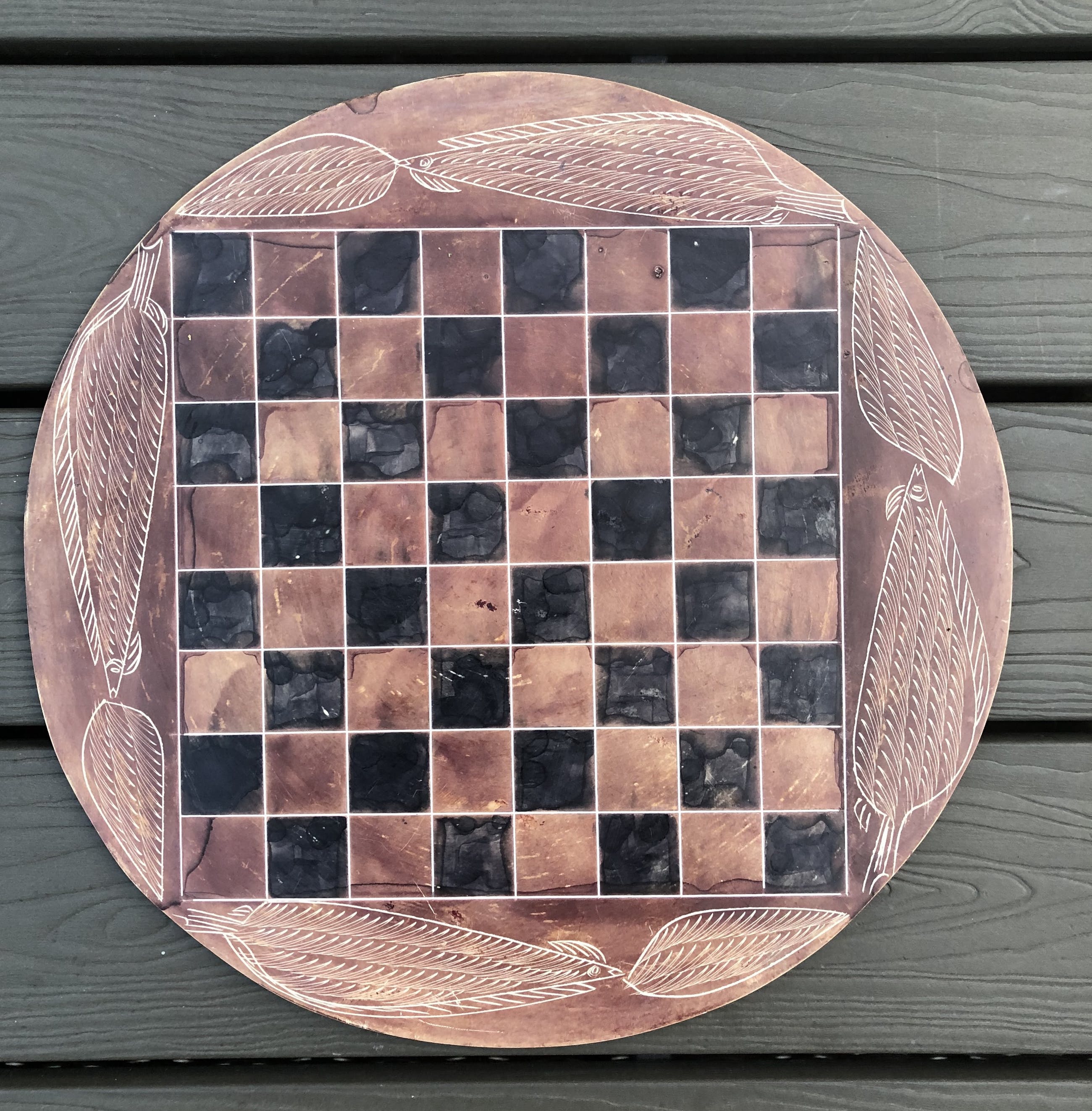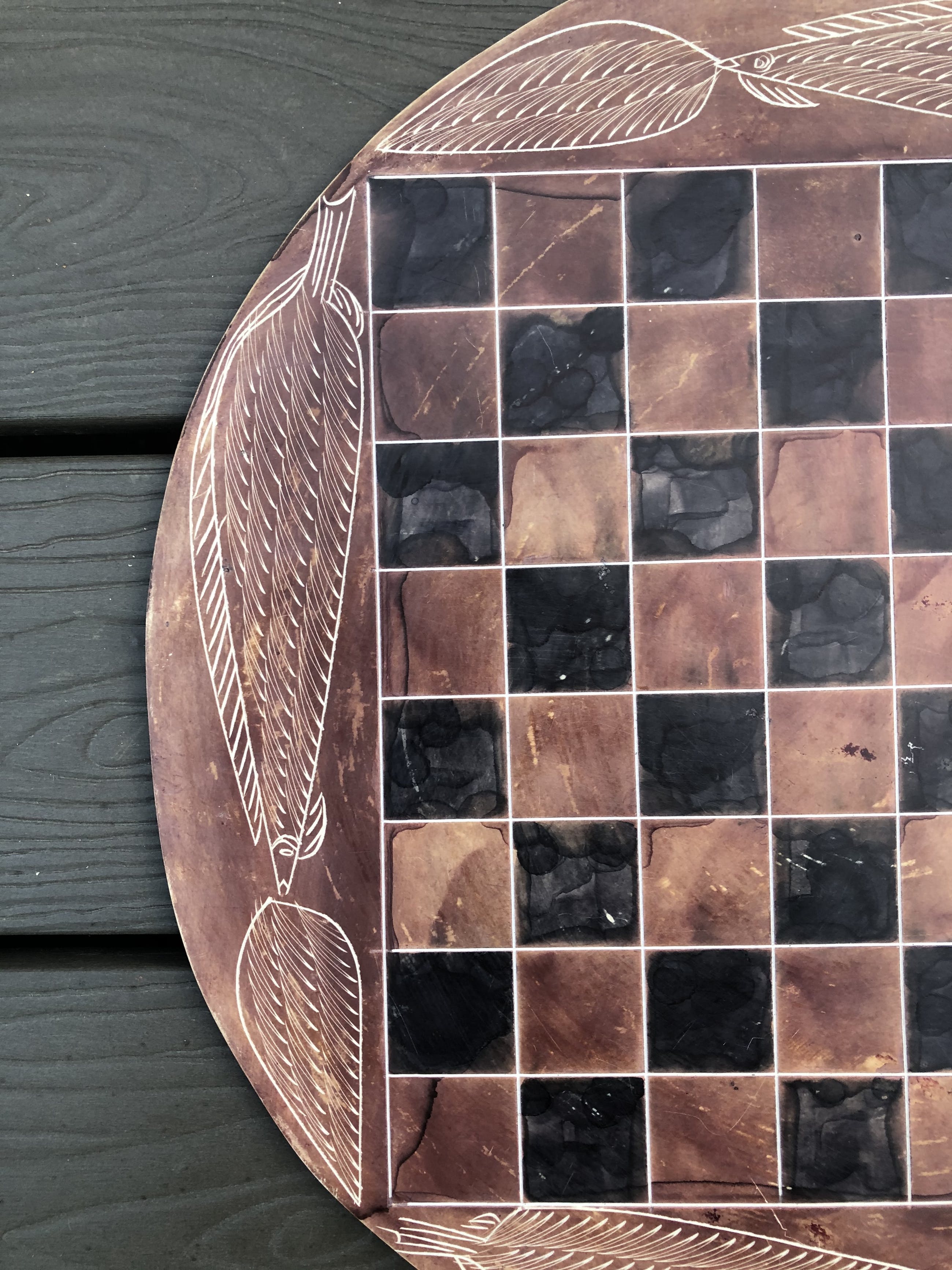 Rond speelbord van natuursteen en daardoor grillig motief, met ingeslepen afbeeldingen van bladeren. Mooie zwarte en roodbruine kleuren. Bijzondere stukken voor toren, loper, paard, koning en koningin. Geen enkele pion is gelijk. Hier en daar een minuscuul chipje. Zie foto's voor de exacte staat.