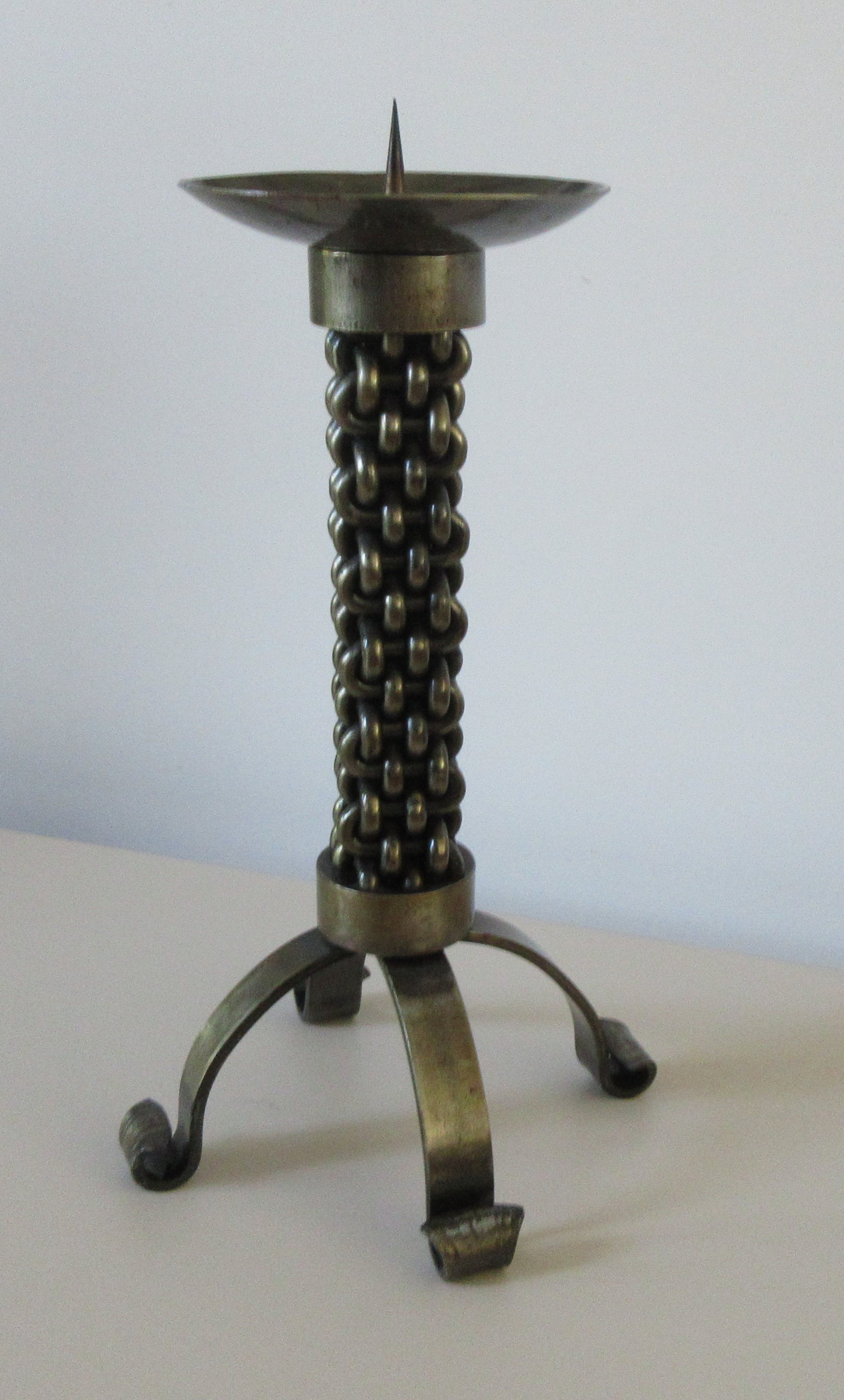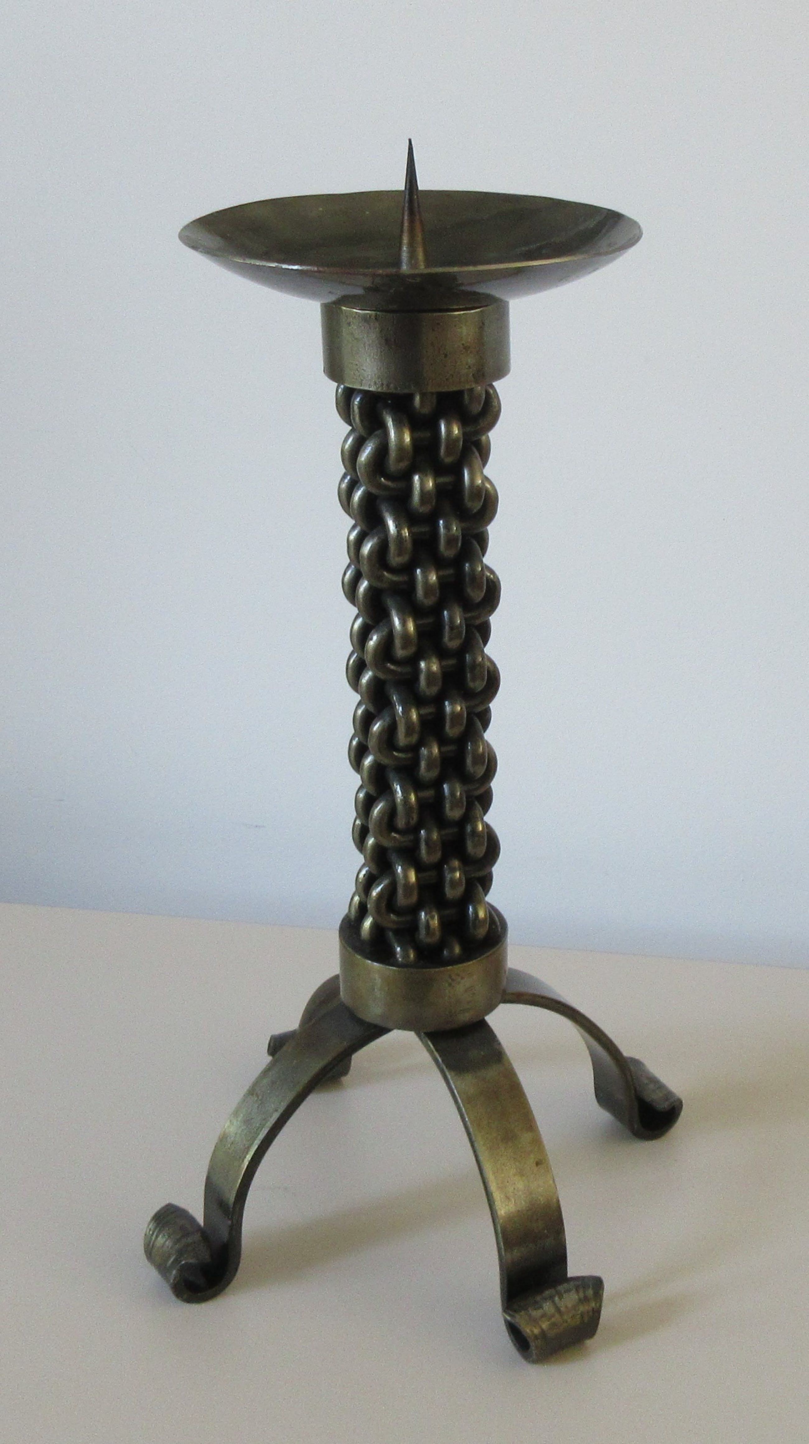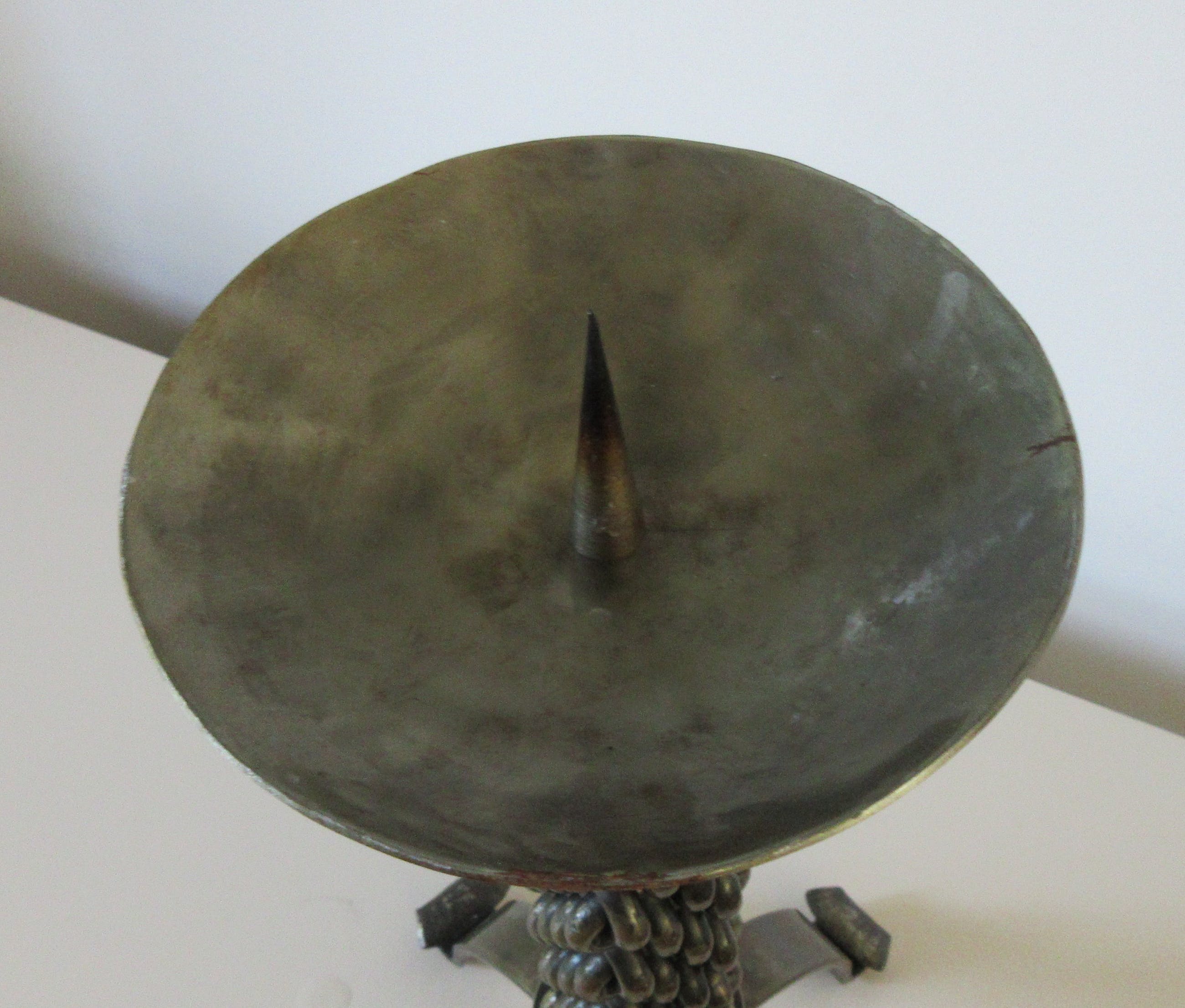 Handgemaakte metalen Brutalistische puntkandelaar waarvan het middenstuk gevlochten metalen kettingen zijn. In zeer geode gebruikte conditie, alleen het deel waar de kaars op wordt gezet heeft wat gebruikskrasjes en een klein roestplekje. Niet gemerkt of gesigneerd, maar in Nederland vervaardigd.